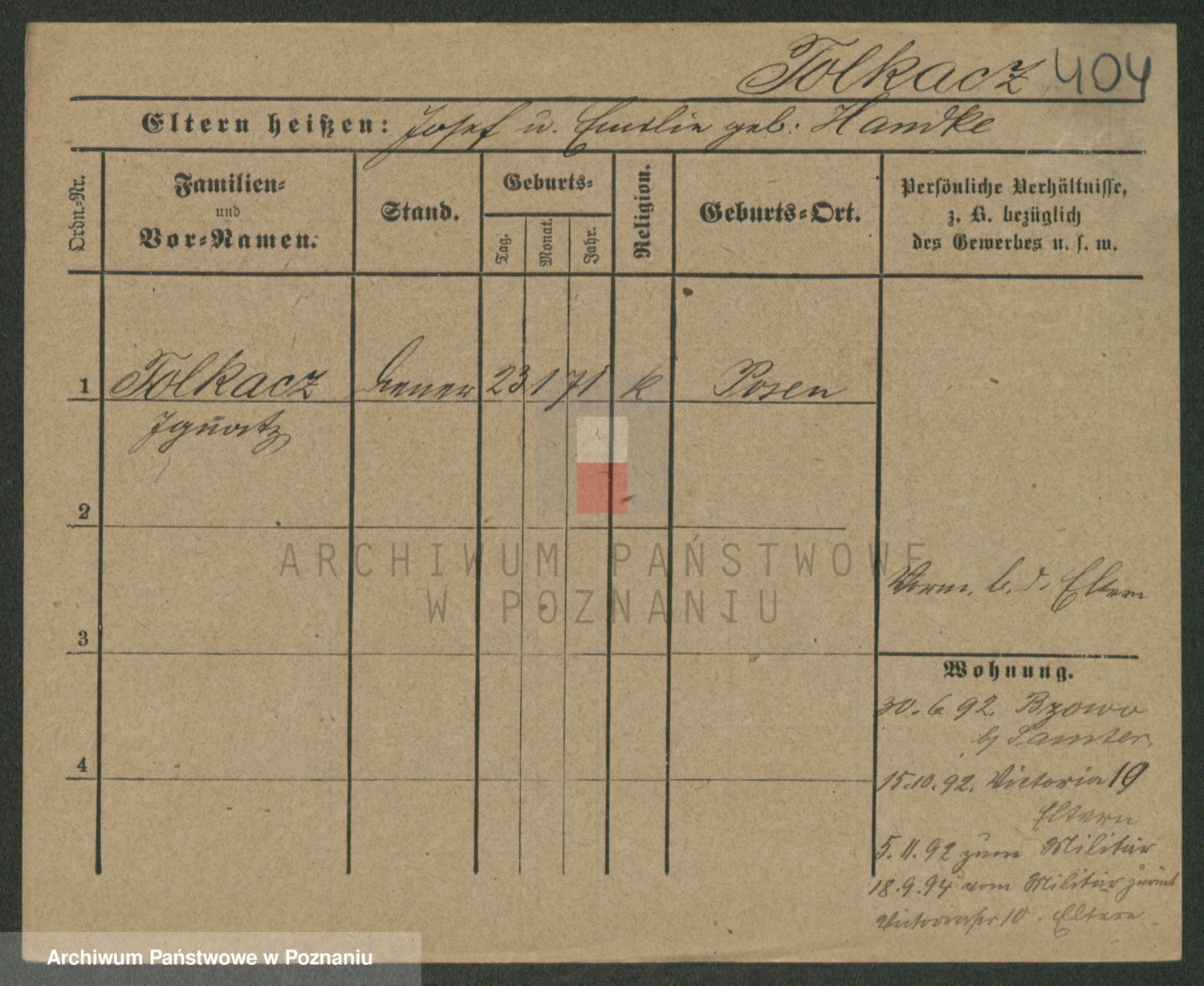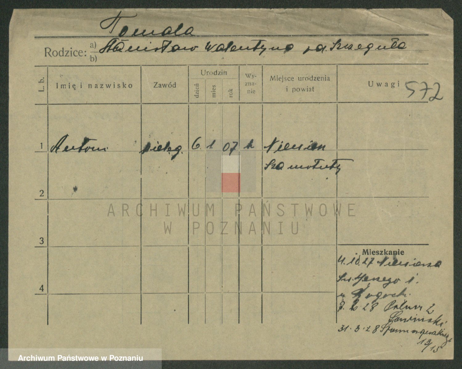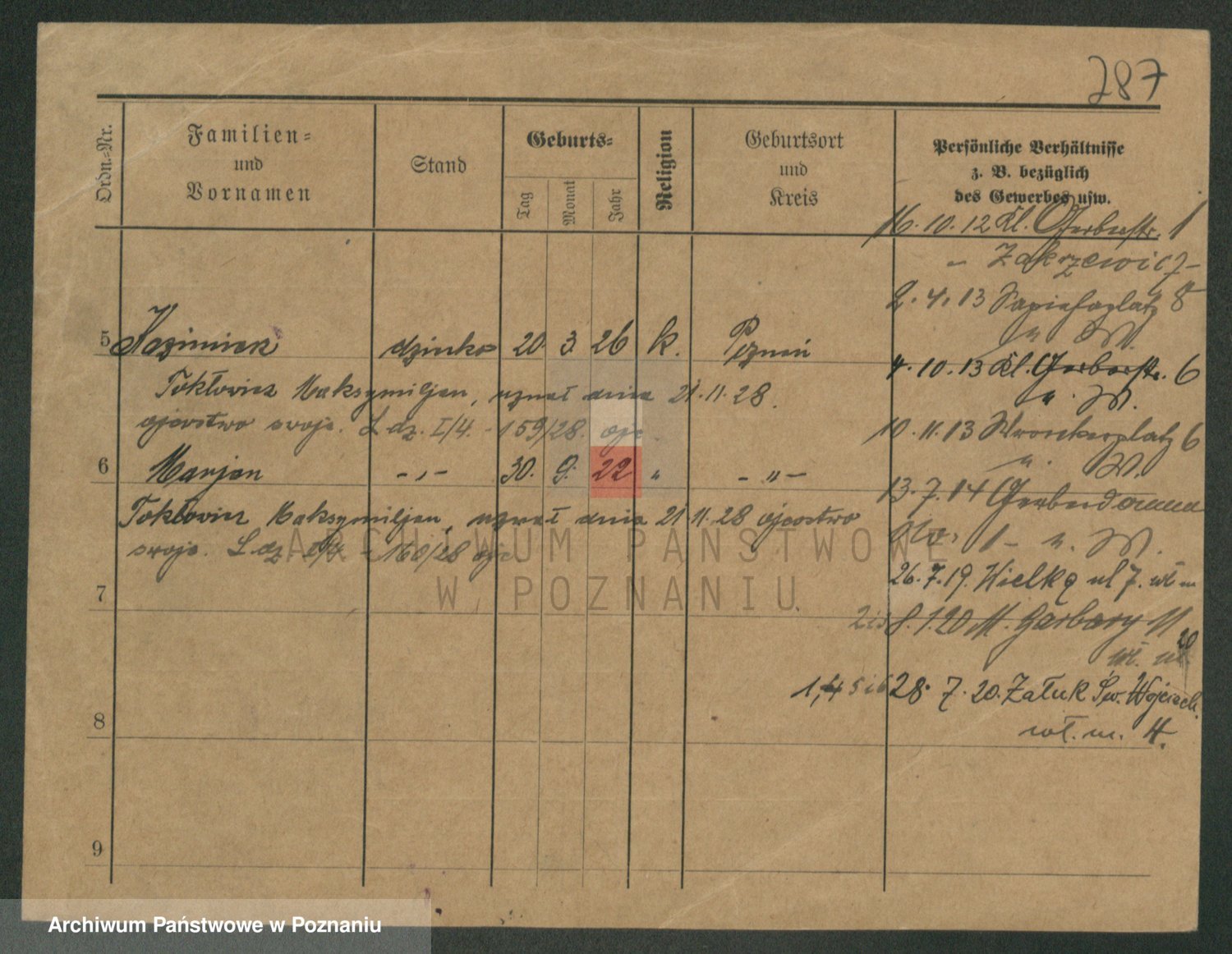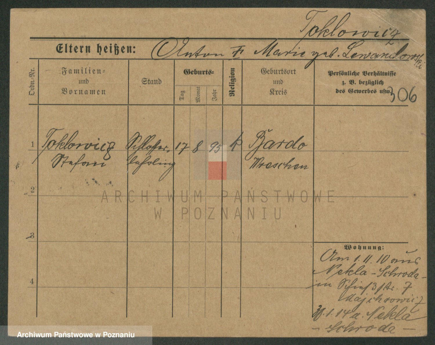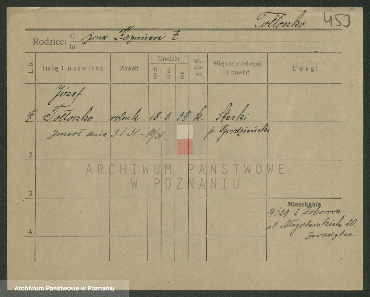 Podgląd karty osobowej dostępny jest po kliknięciu na nazwisko lub ikonkę karty. Można dokonywać powiększenia (ikony na górze) lub przechodzić między kolejnymi skanami (strzałki po bokach).