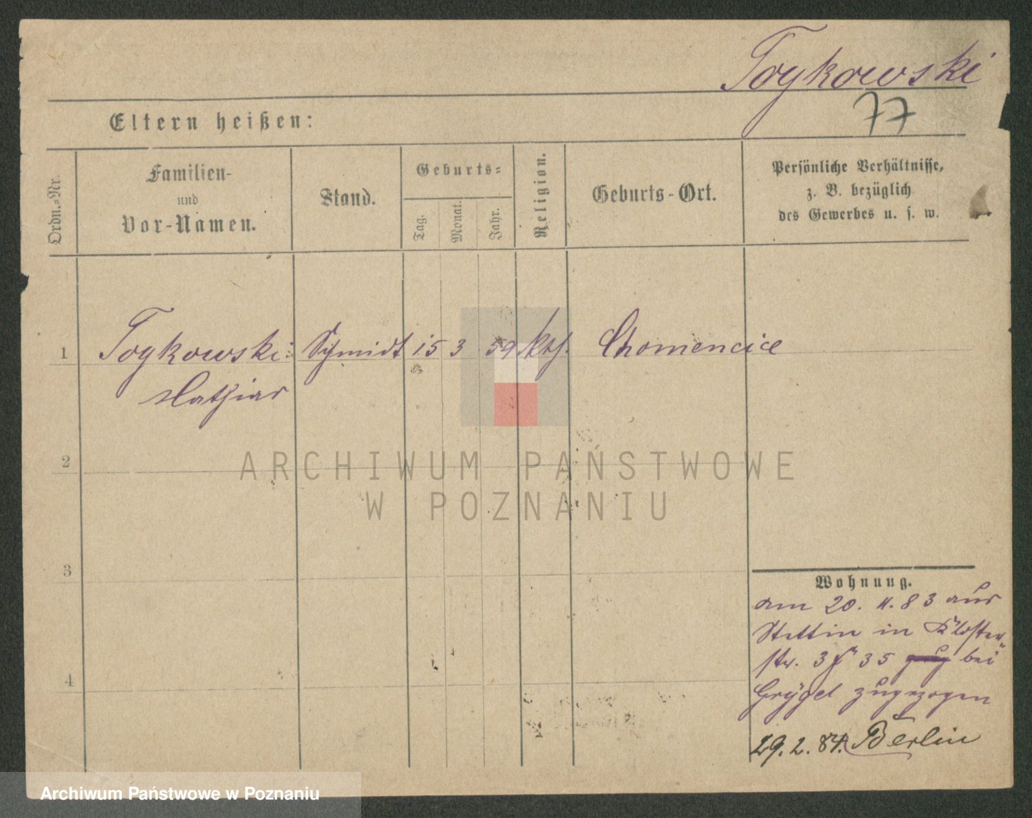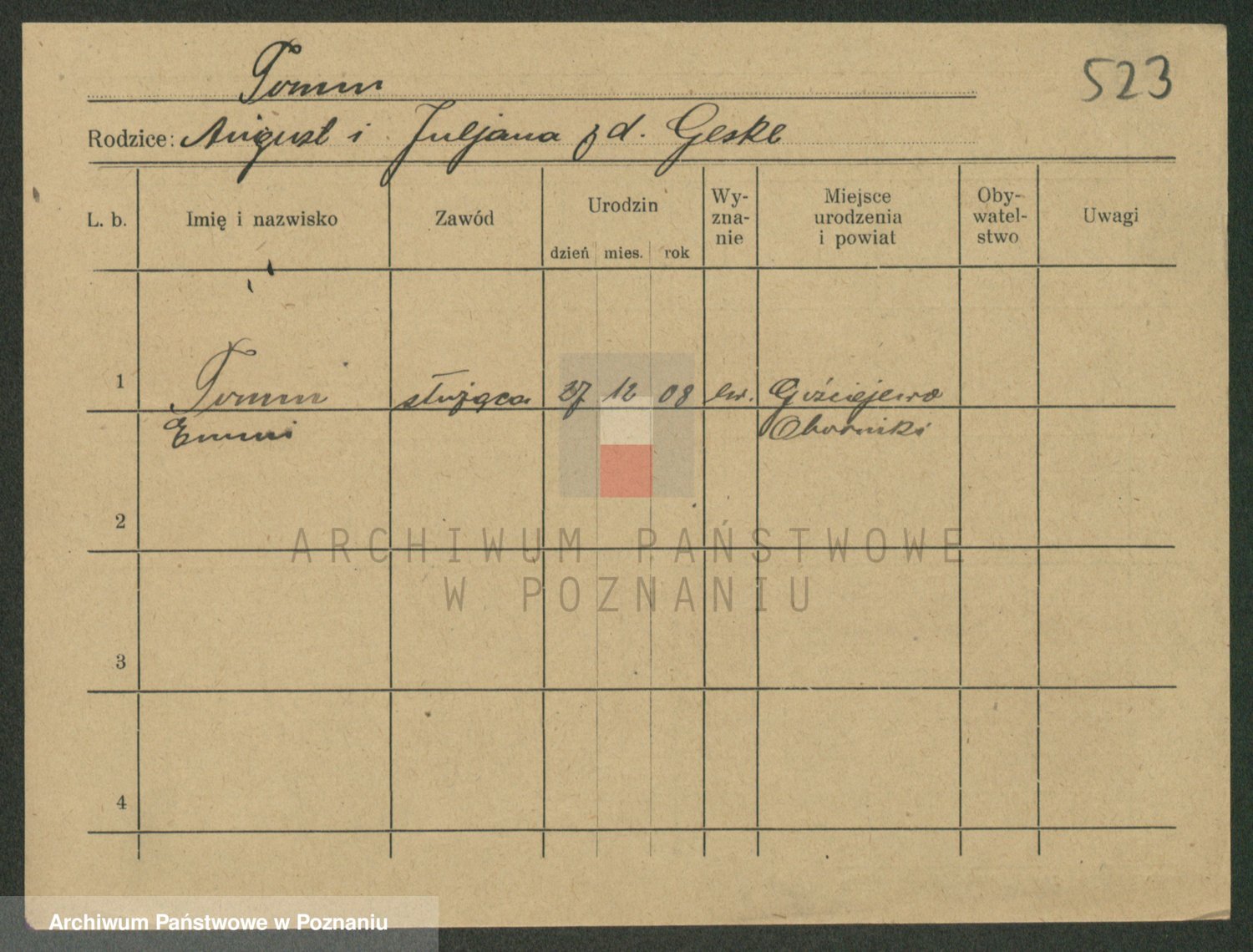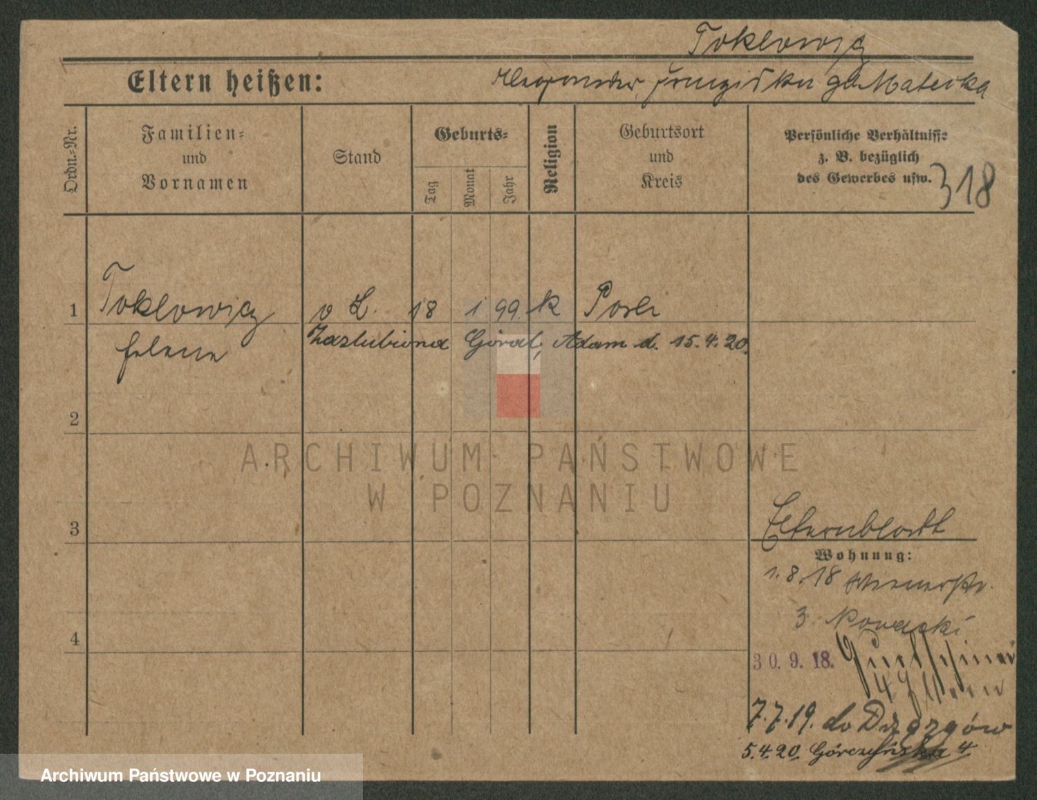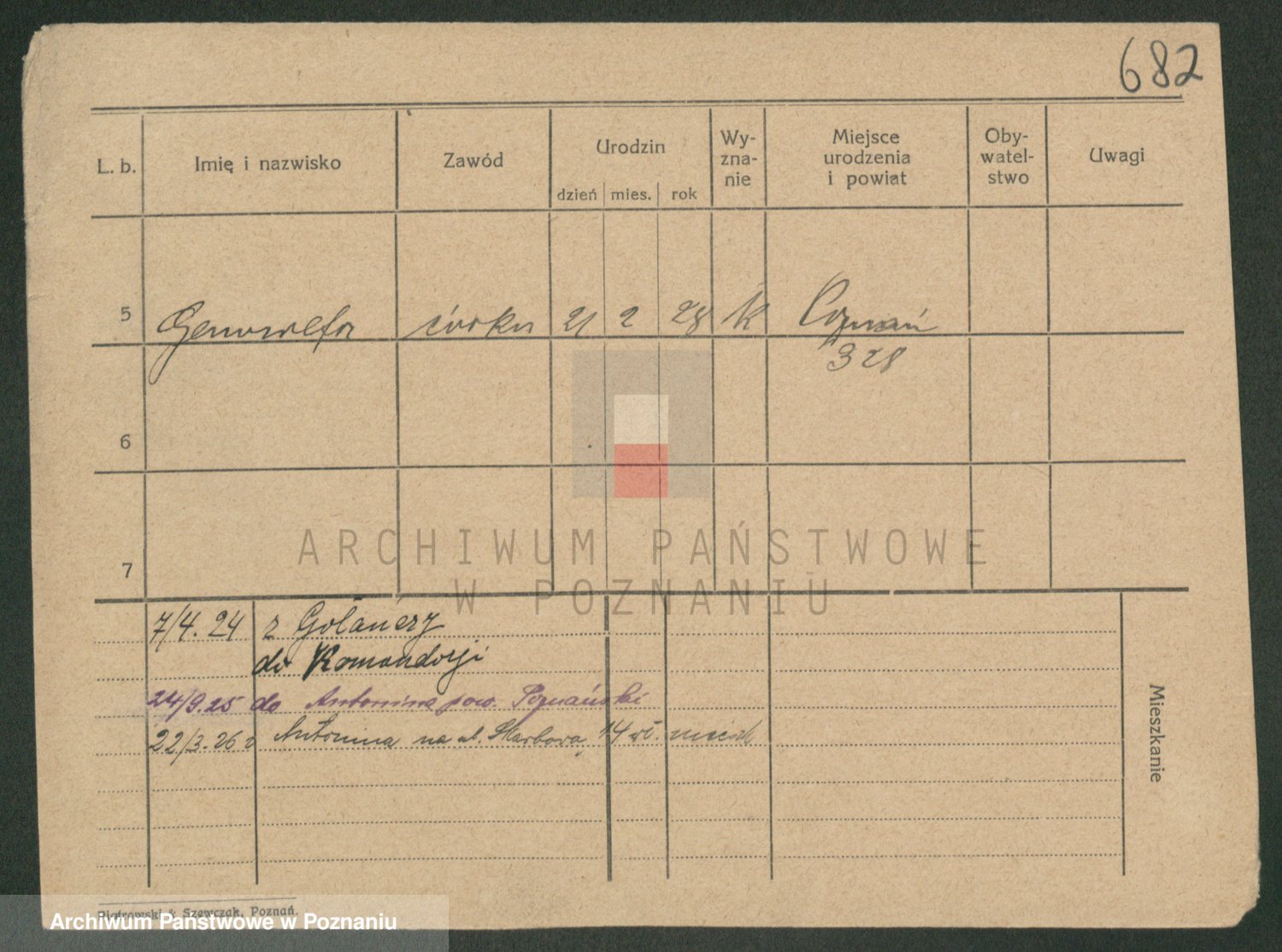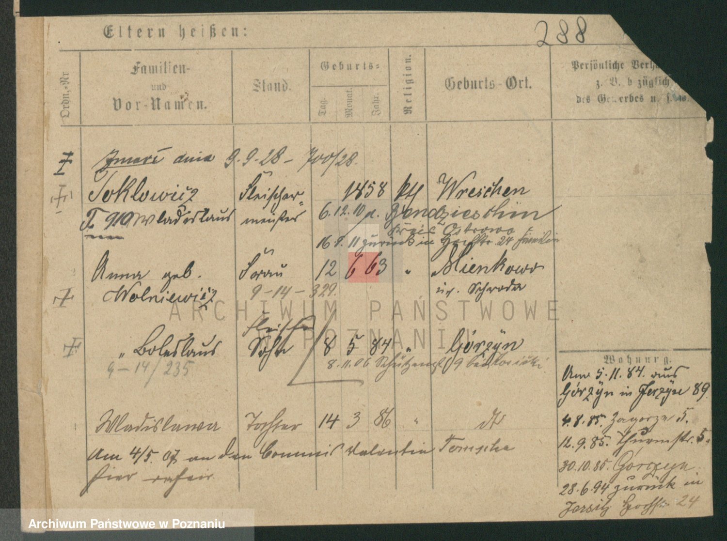 Podgląd karty osobowej dostępny jest po kliknięciu na nazwisko lub ikonkę karty. Można dokonywać powiększenia (ikony na górze) lub przechodzić między kolejnymi skanami (strzałki po bokach).