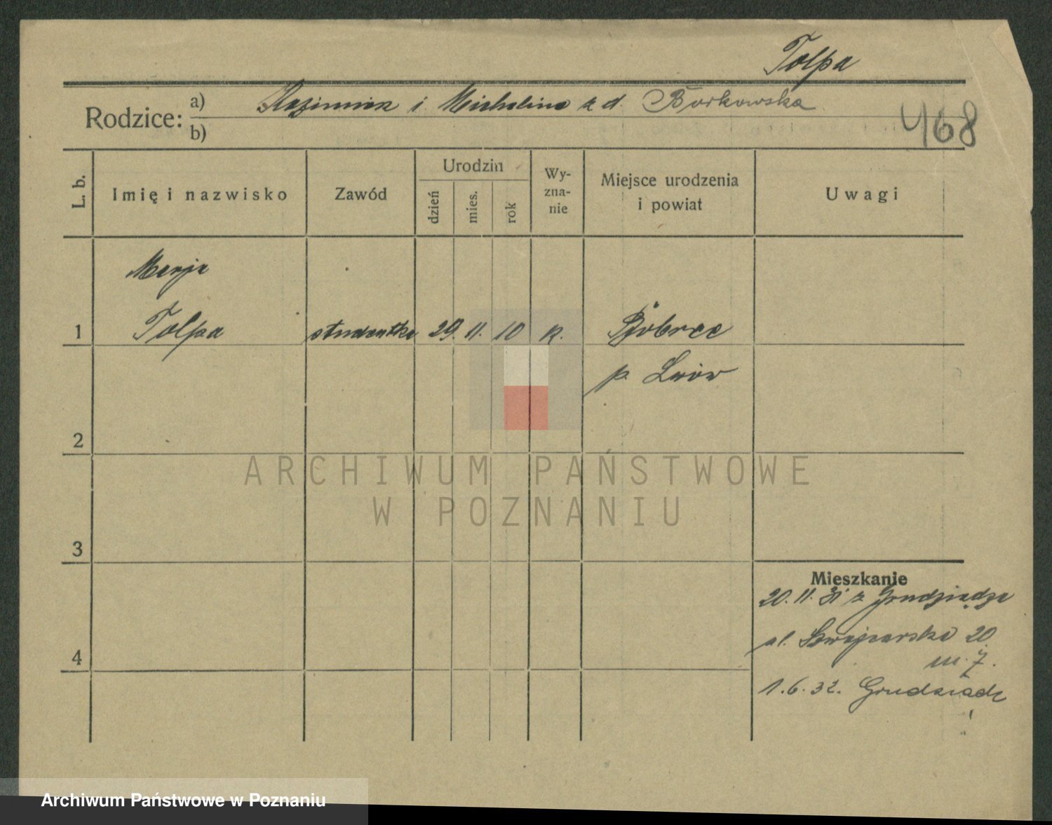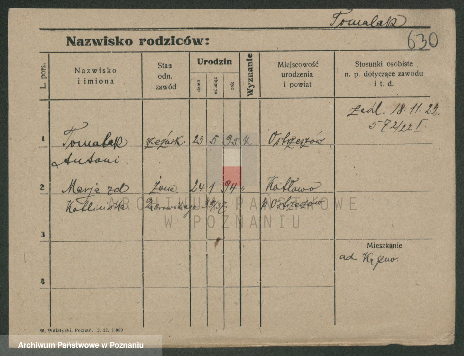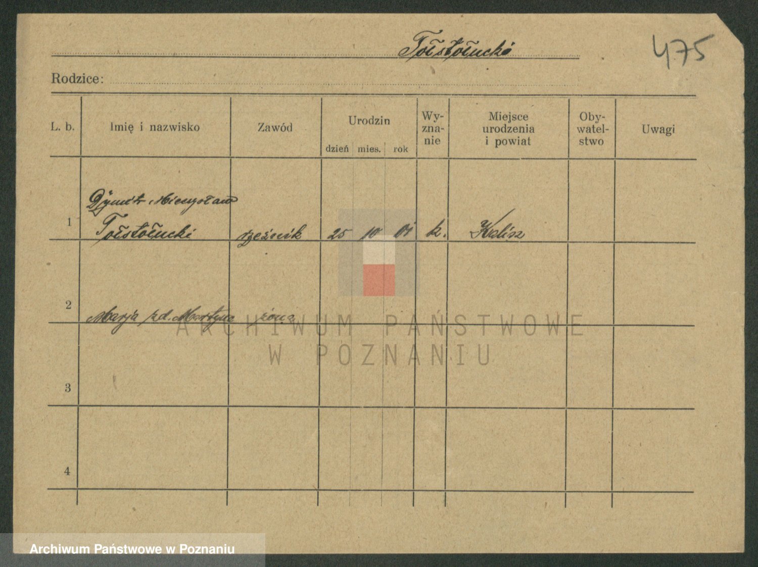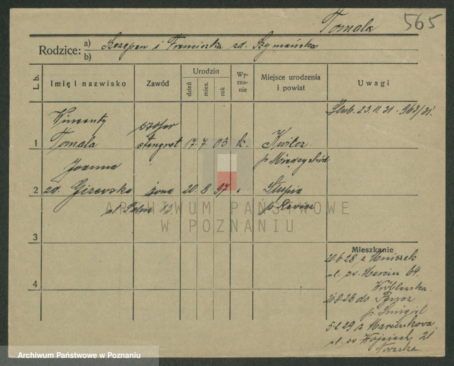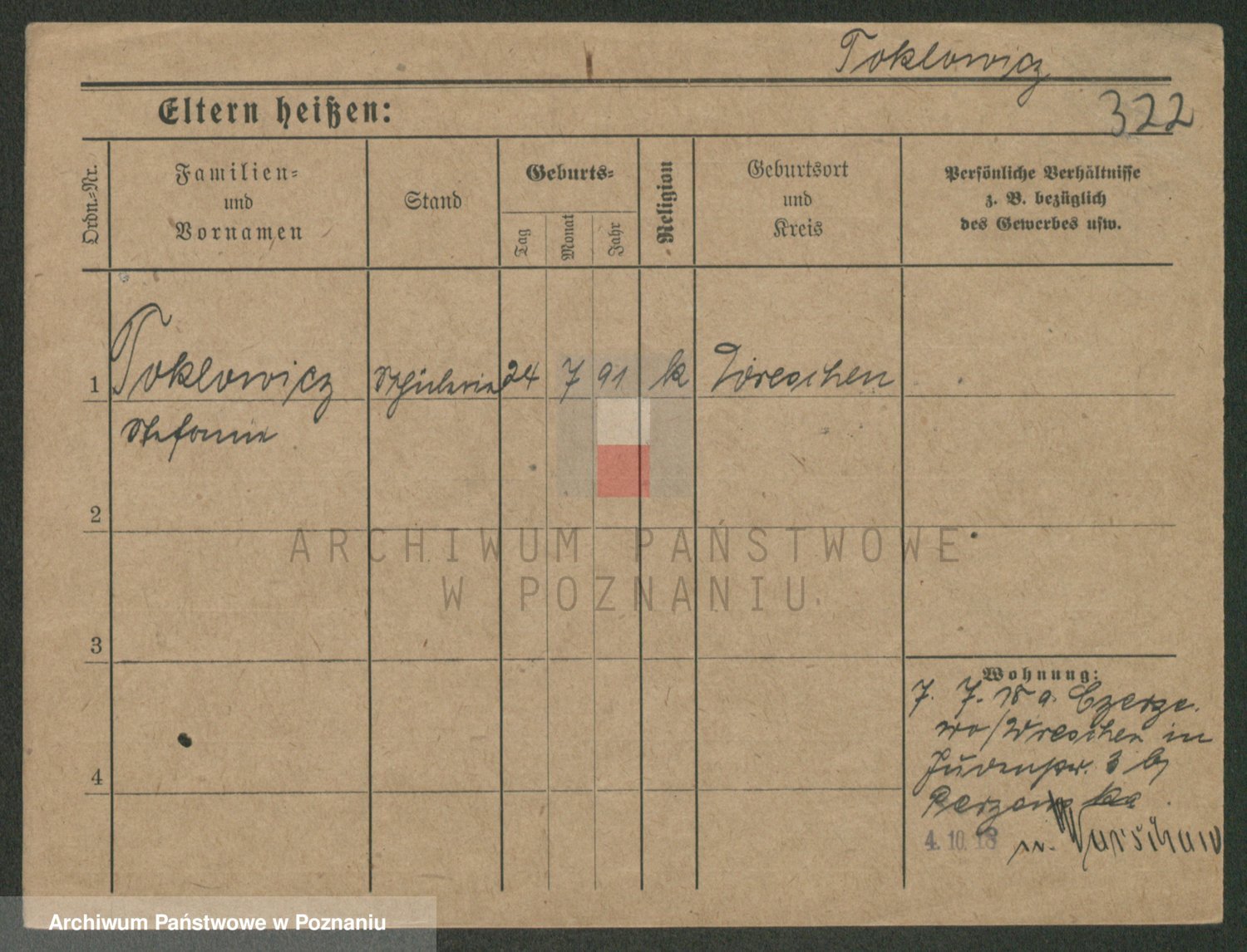 Podgląd karty osobowej dostępny jest po kliknięciu na nazwisko lub ikonkę karty. Można dokonywać powiększenia (ikony na górze) lub przechodzić między kolejnymi skanami (strzałki po bokach).