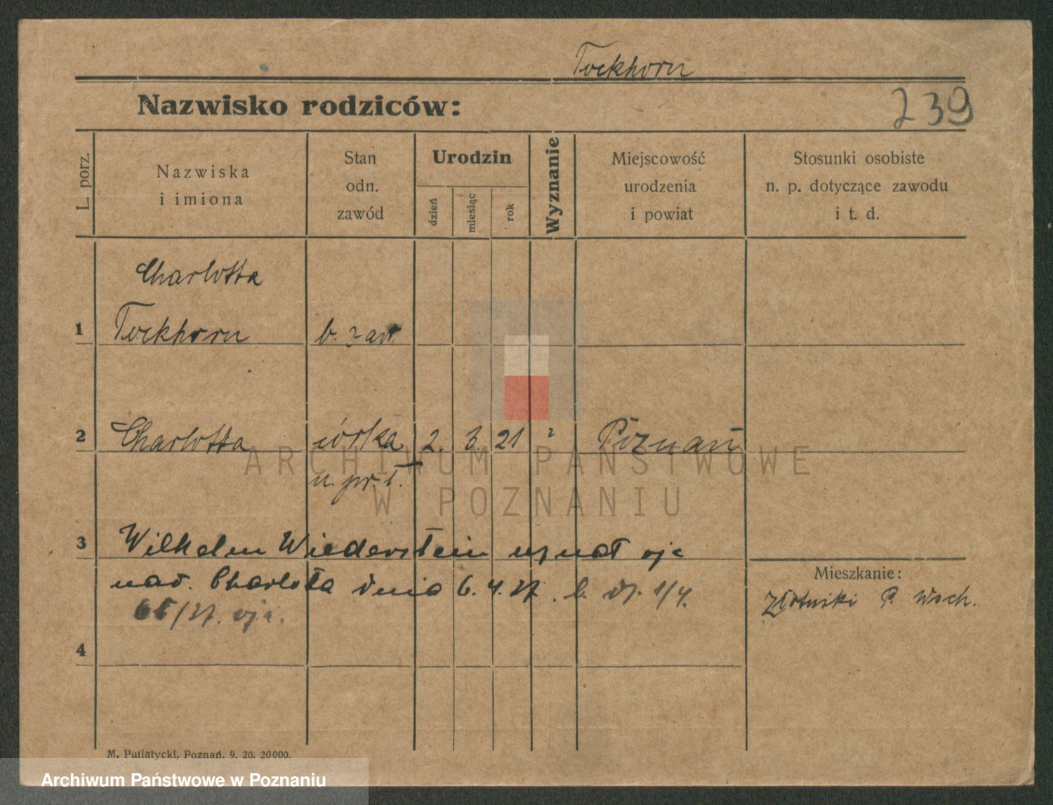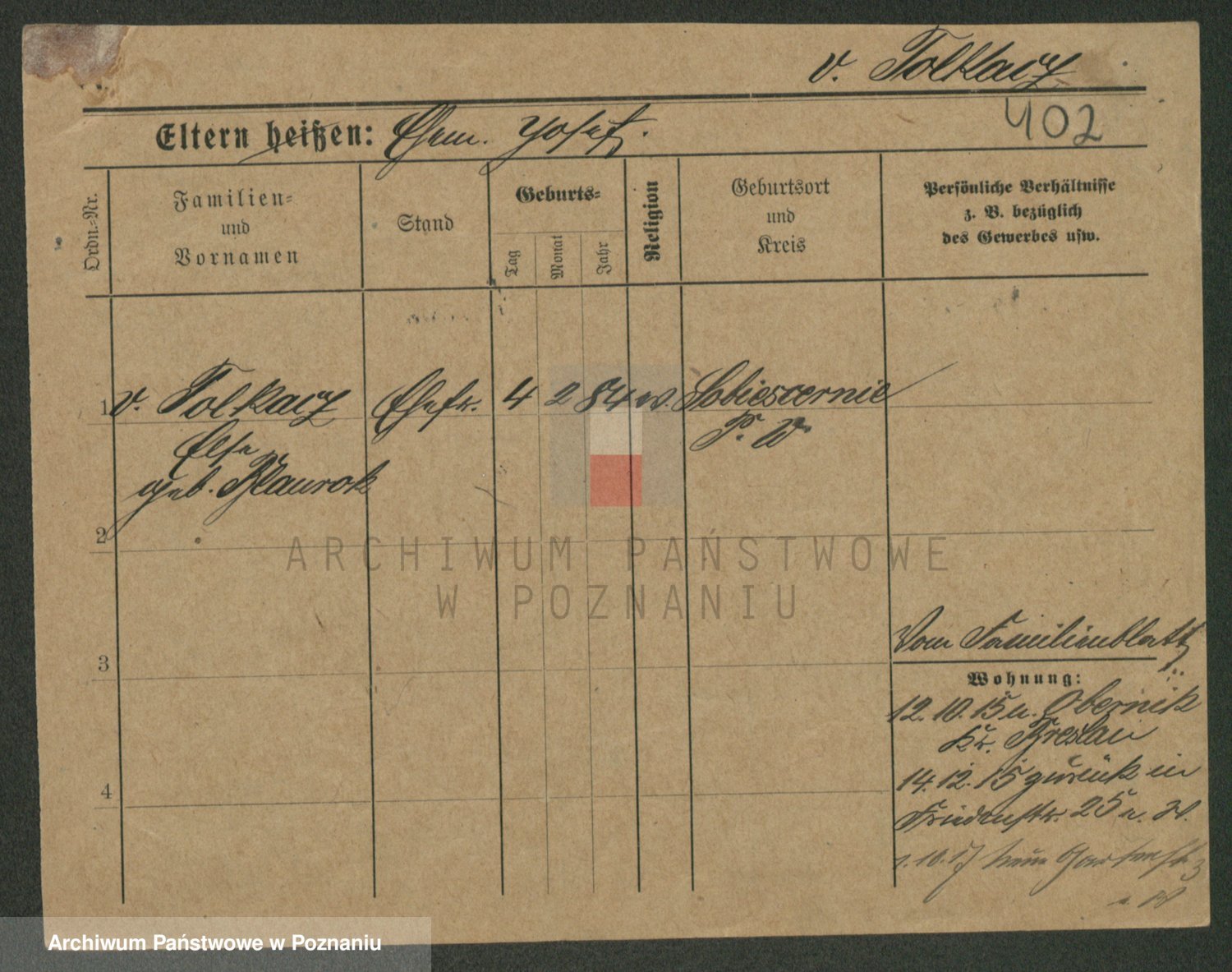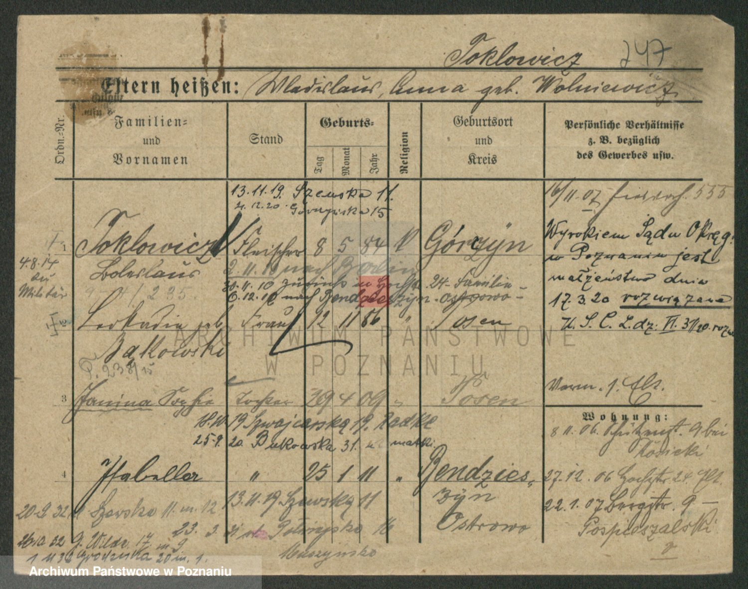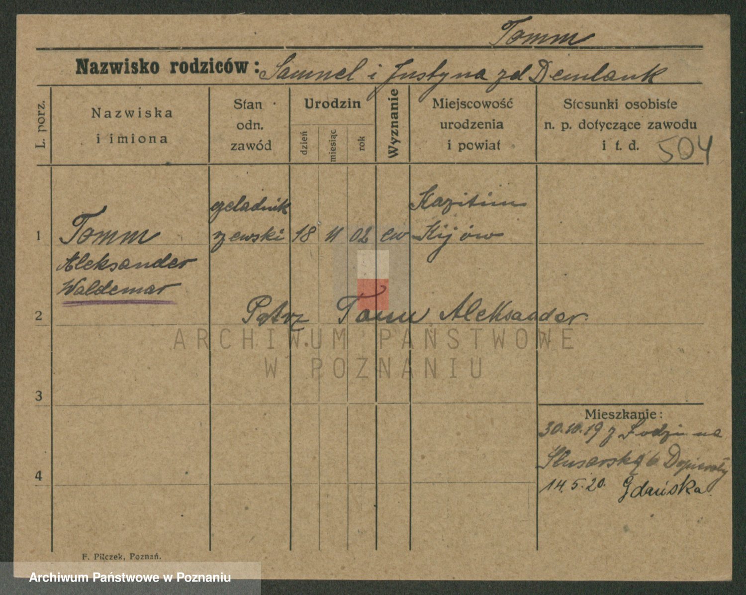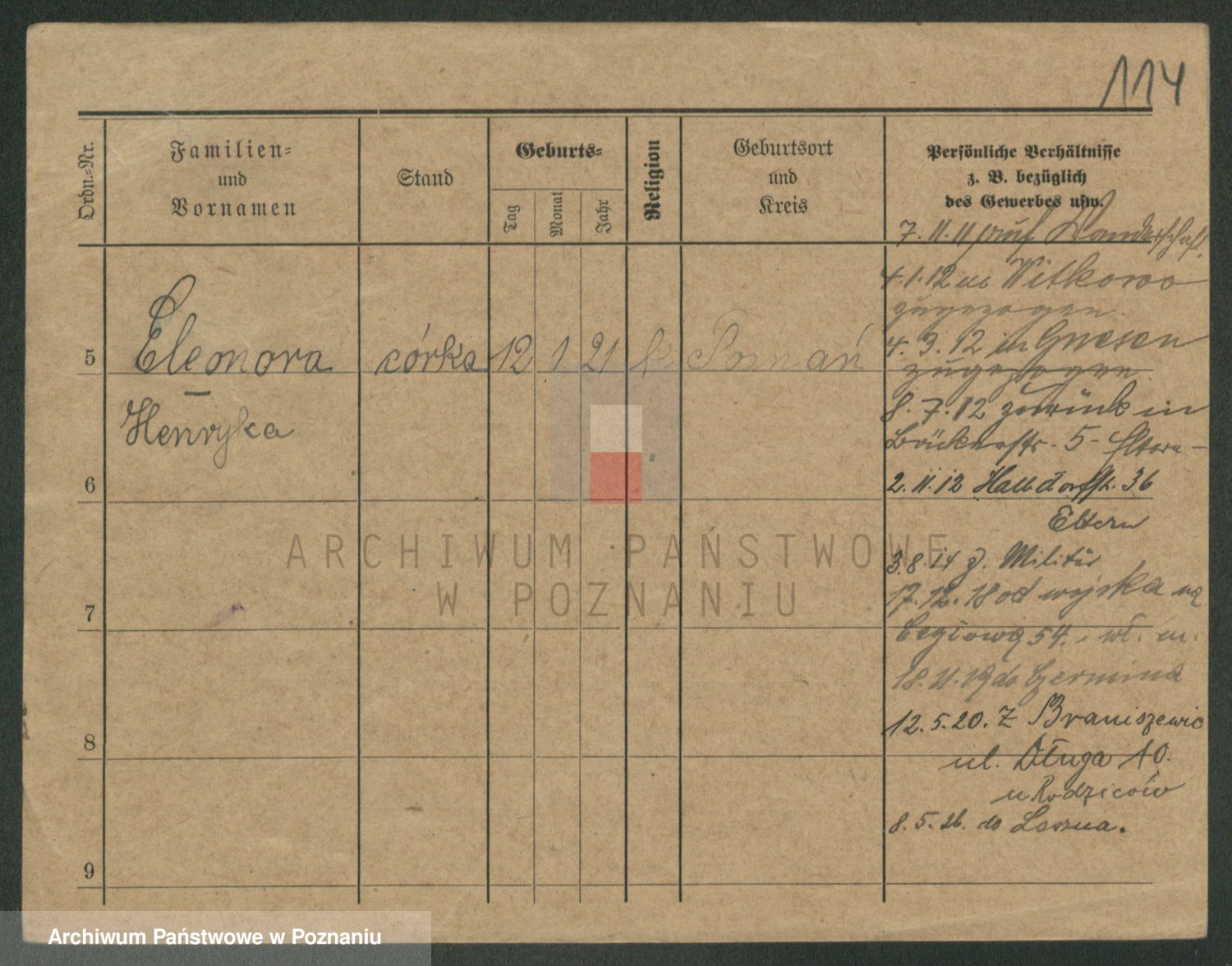 Podgląd karty osobowej dostępny jest po kliknięciu na nazwisko lub ikonkę karty. Można dokonywać powiększenia (ikony na górze) lub przechodzić między kolejnymi skanami (strzałki po bokach).