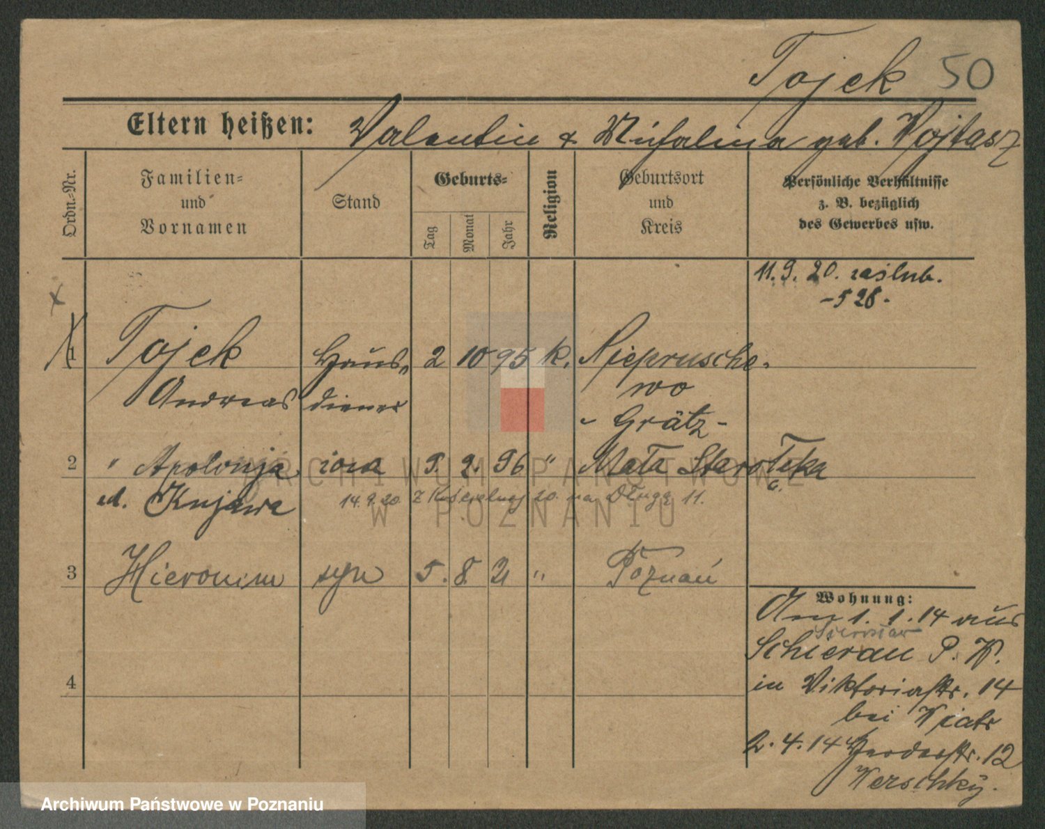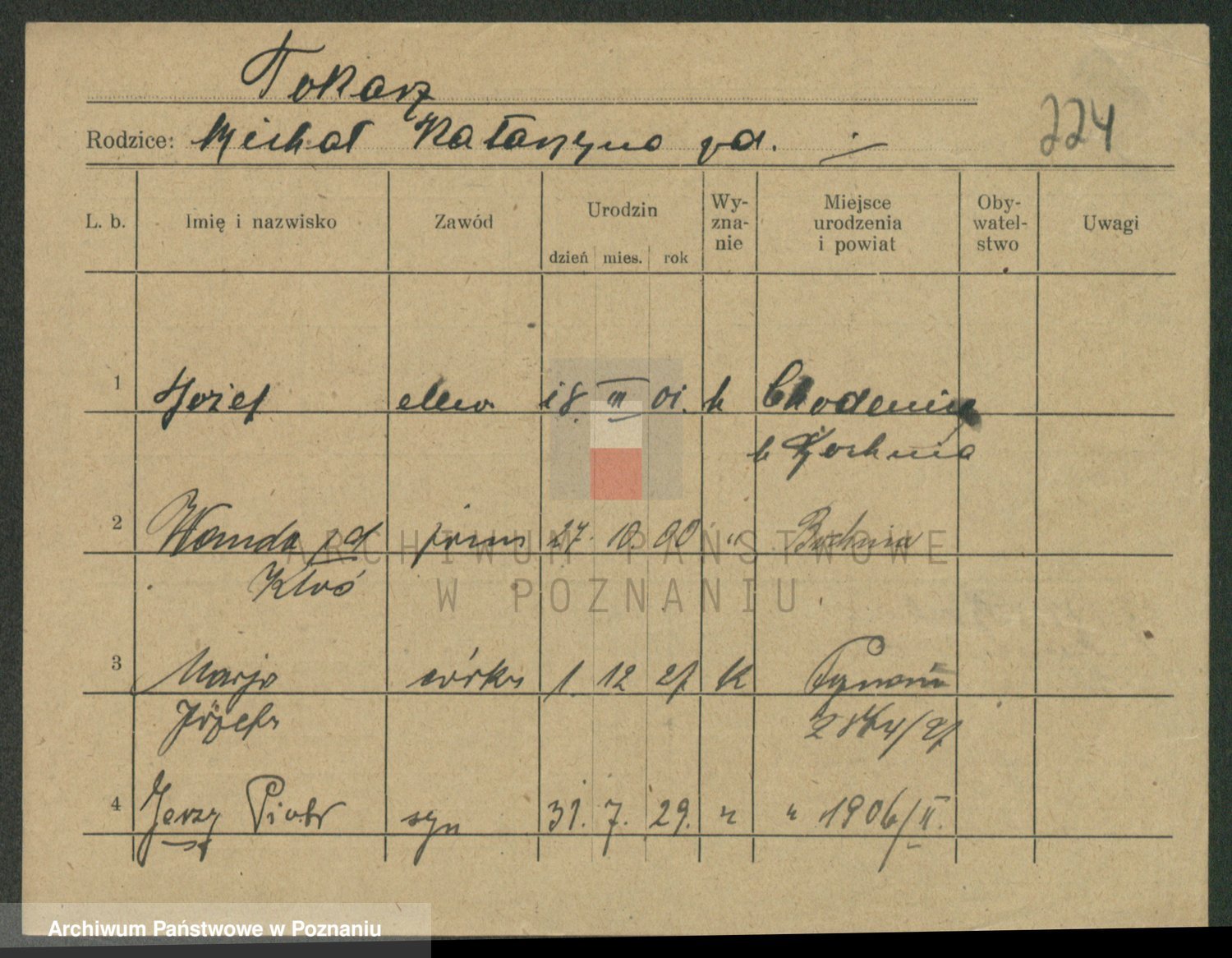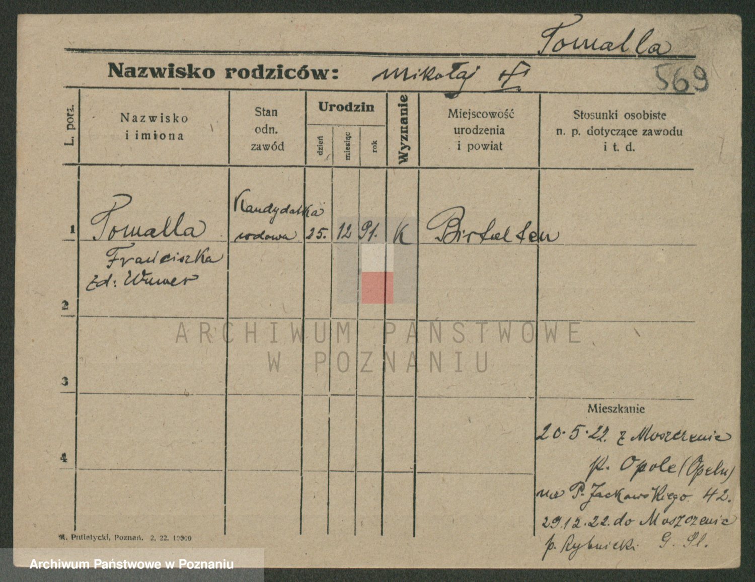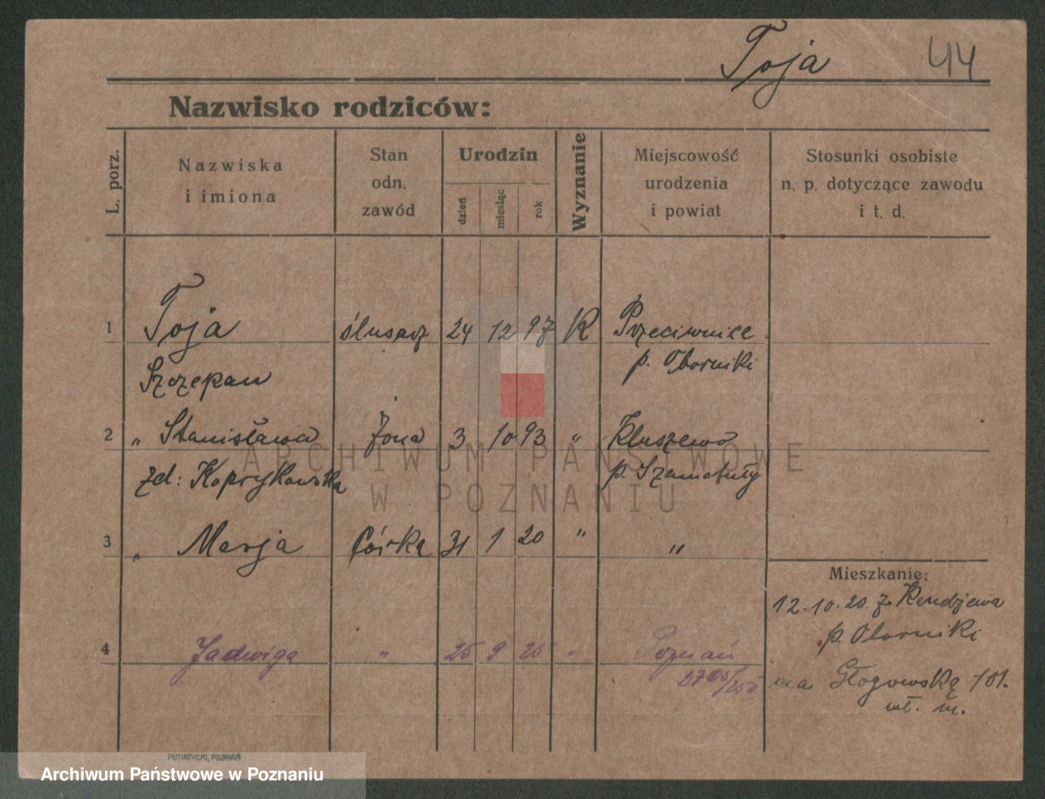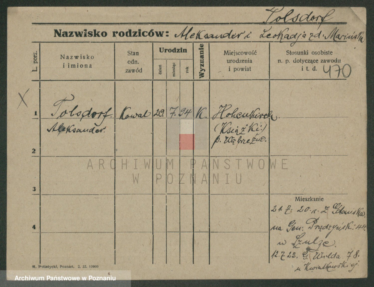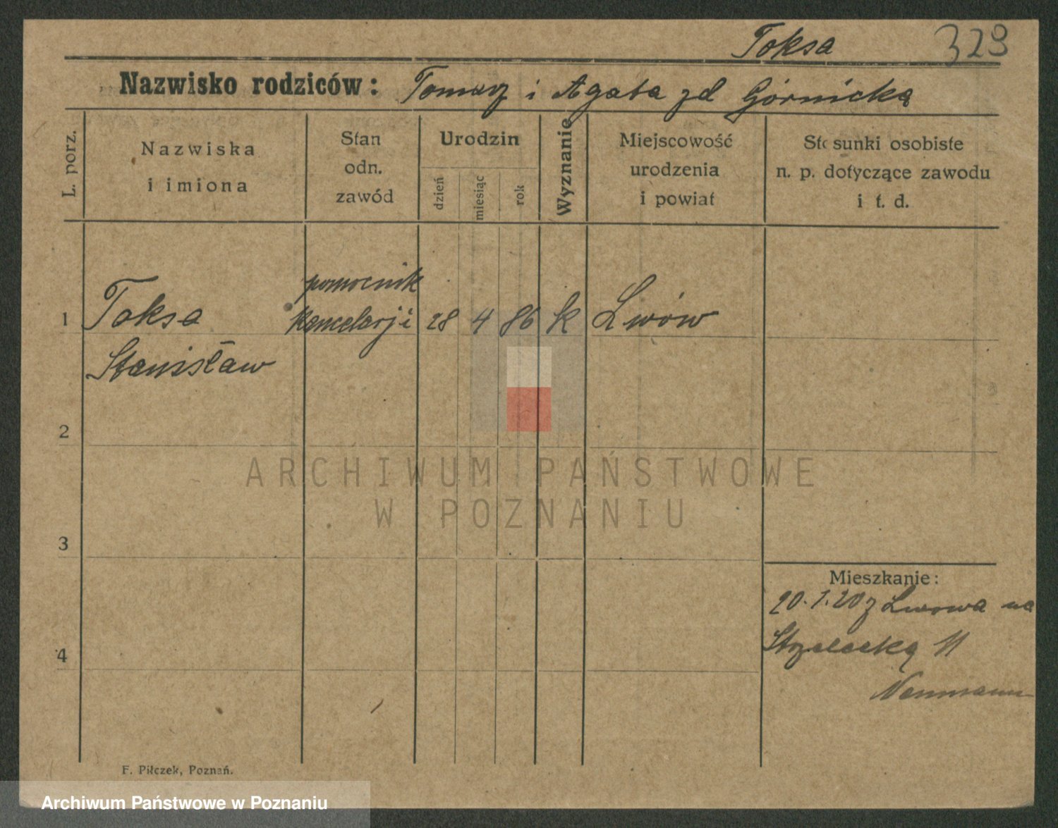 Podgląd karty osobowej dostępny jest po kliknięciu na nazwisko lub ikonkę karty. Można dokonywać powiększenia (ikony na górze) lub przechodzić między kolejnymi skanami (strzałki po bokach).