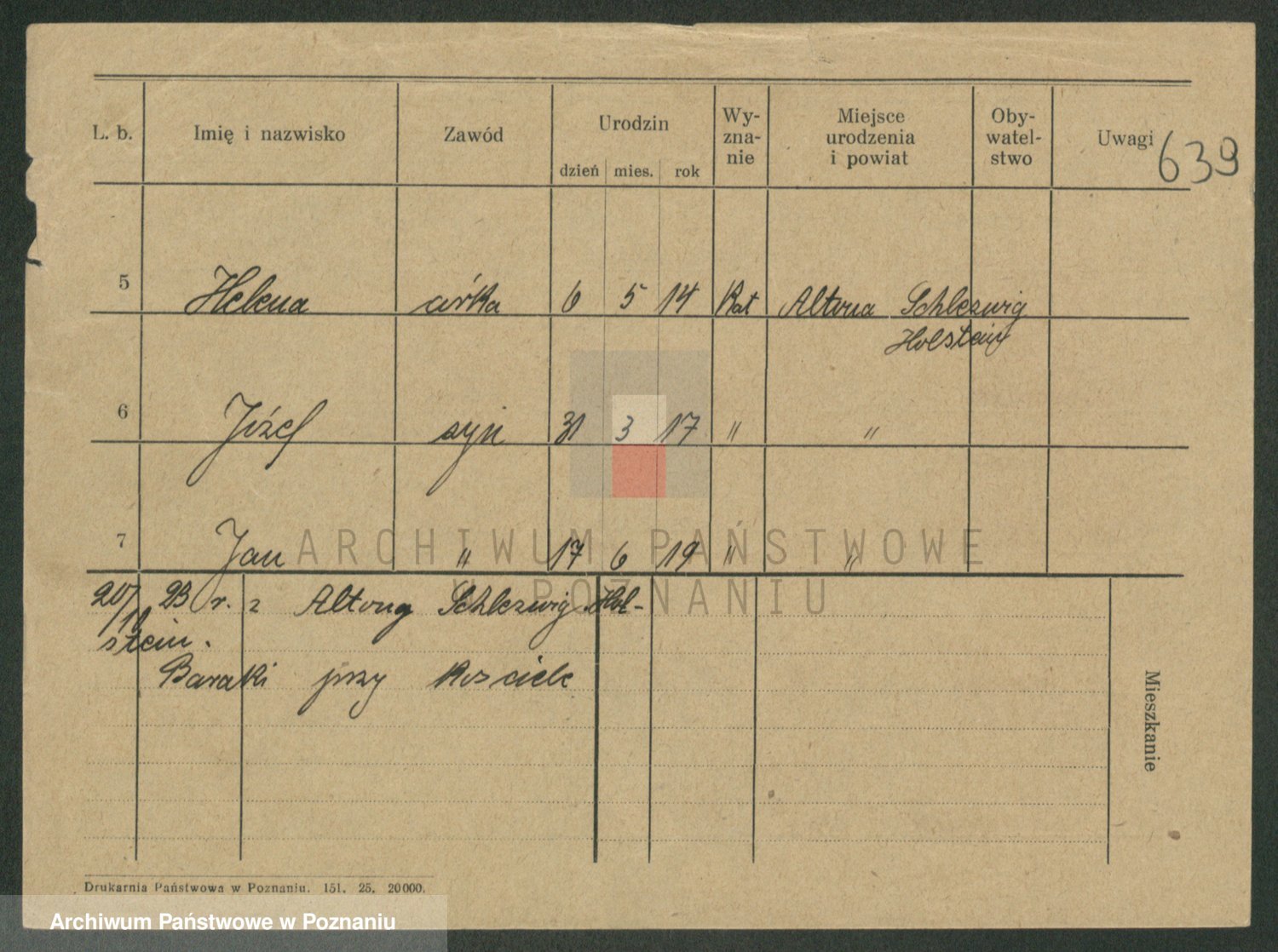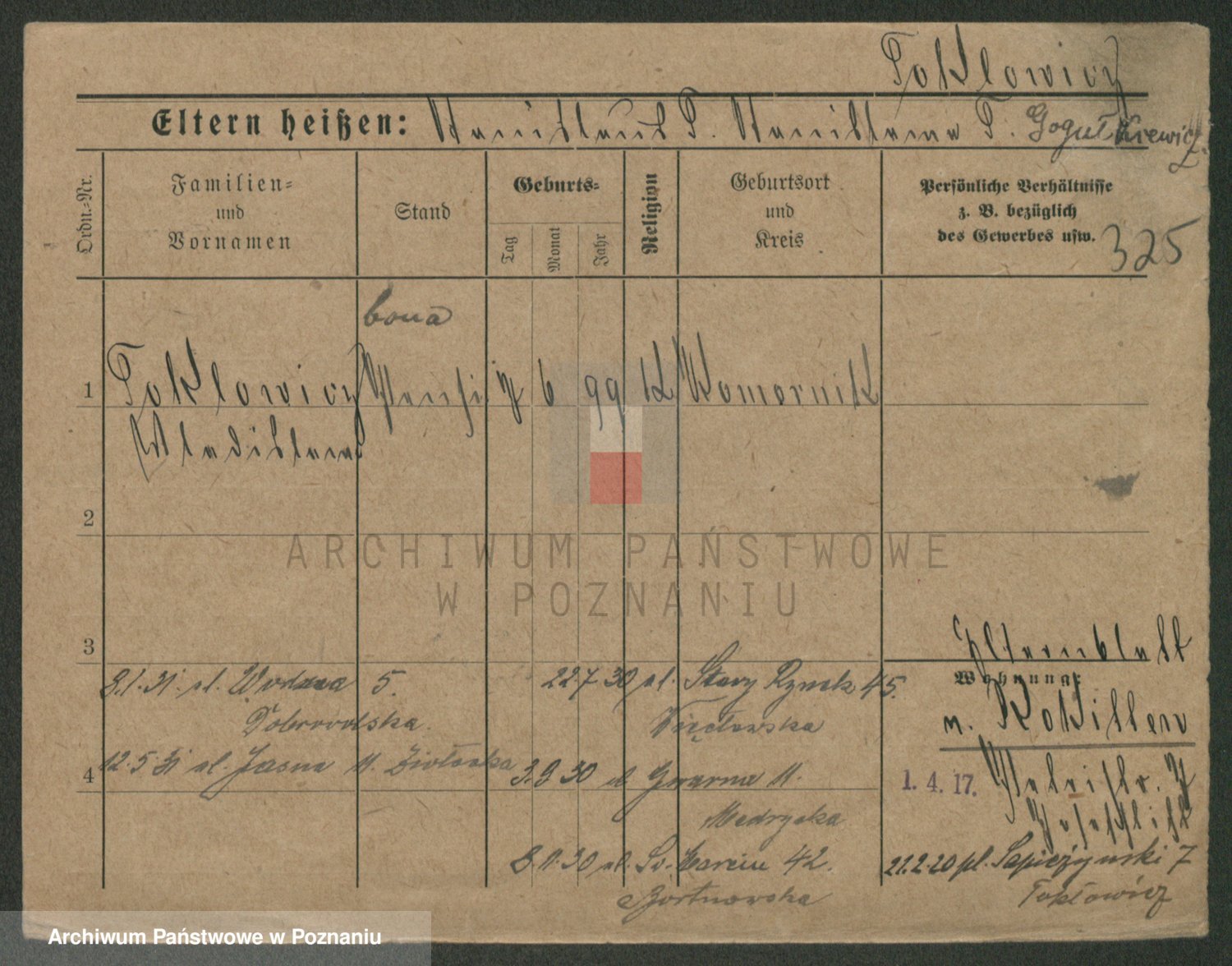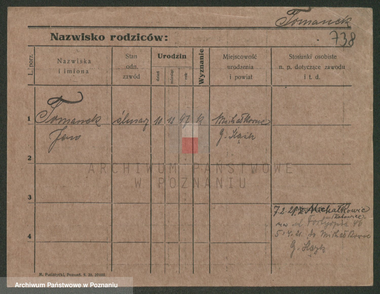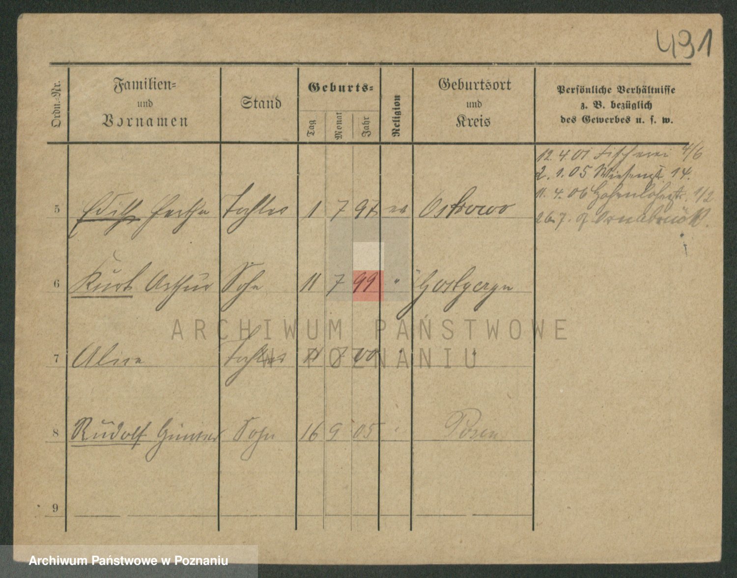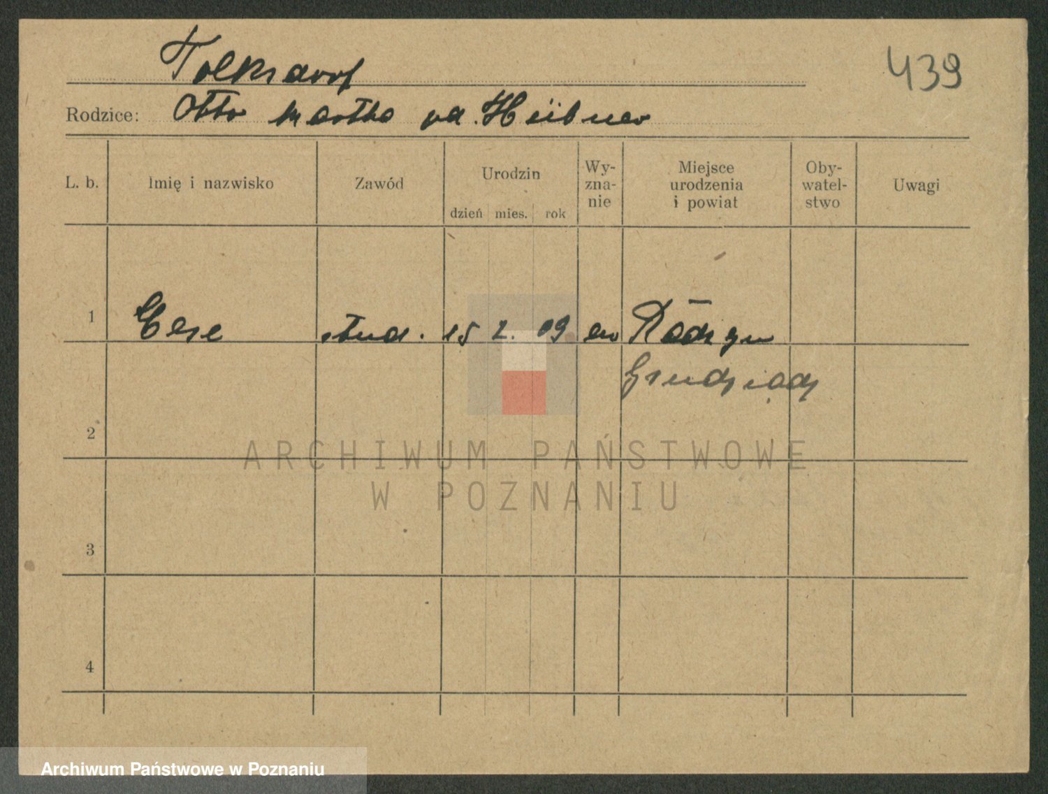 Podgląd karty osobowej dostępny jest po kliknięciu na nazwisko lub ikonkę karty. Można dokonywać powiększenia (ikony na górze) lub przechodzić między kolejnymi skanami (strzałki po bokach).