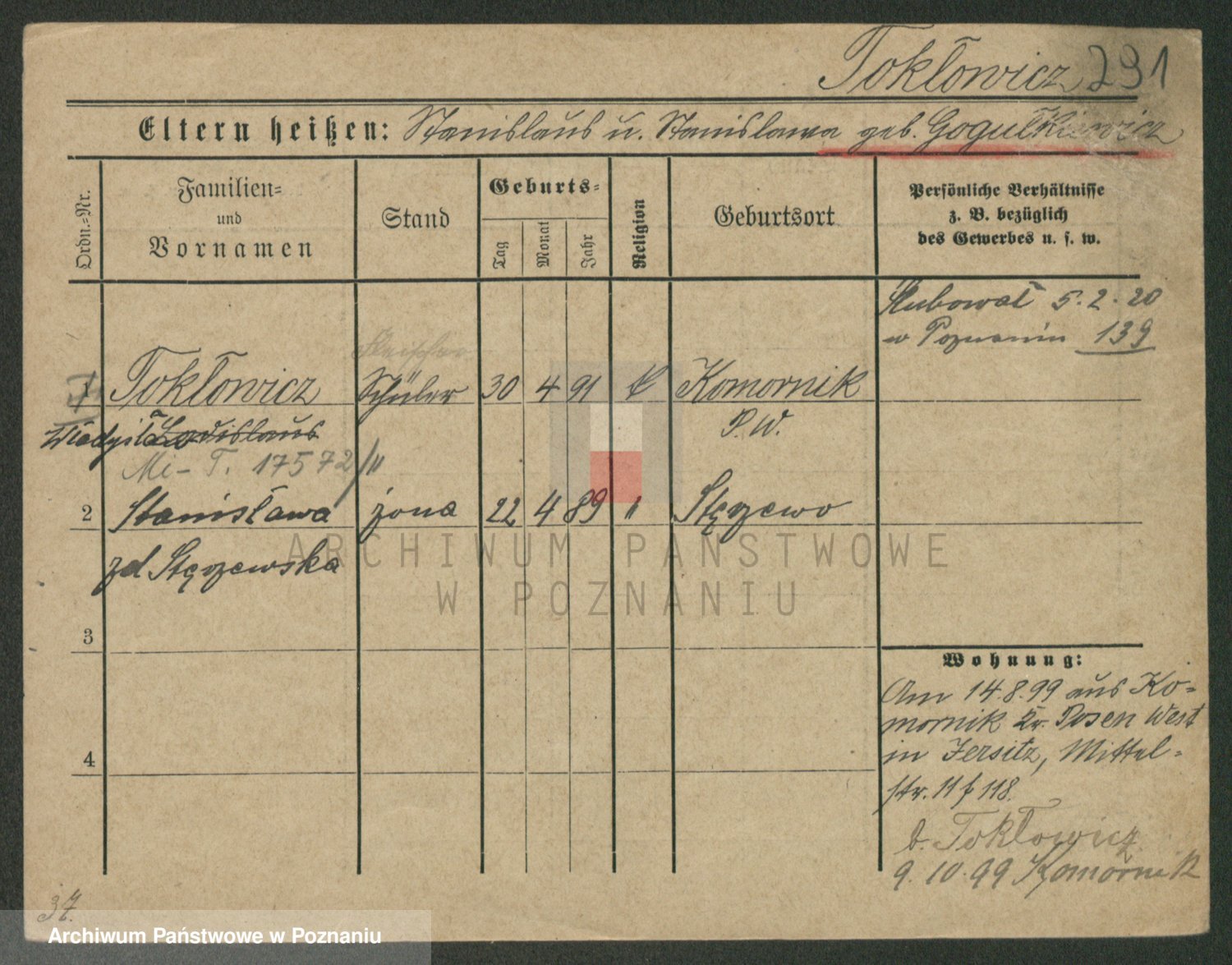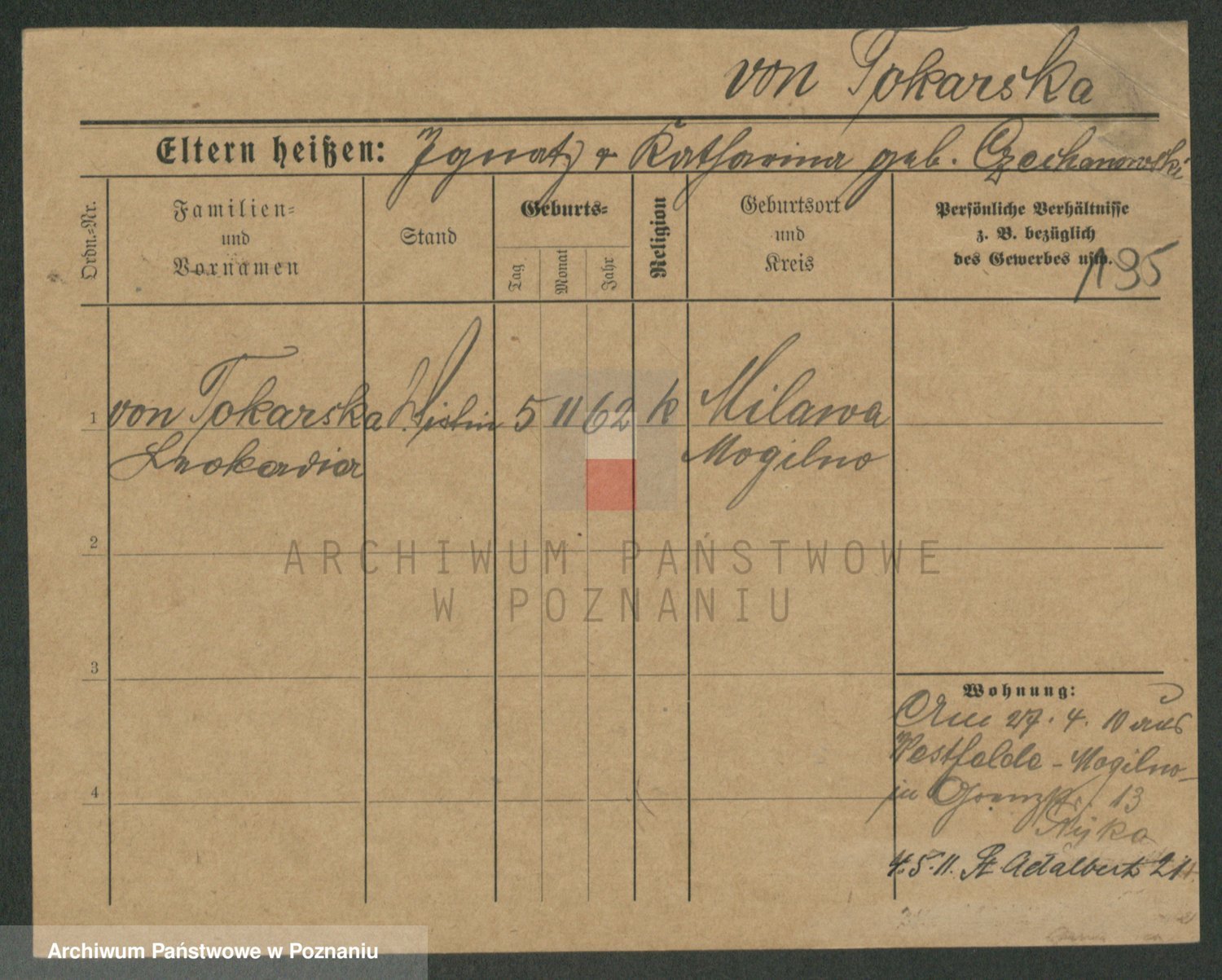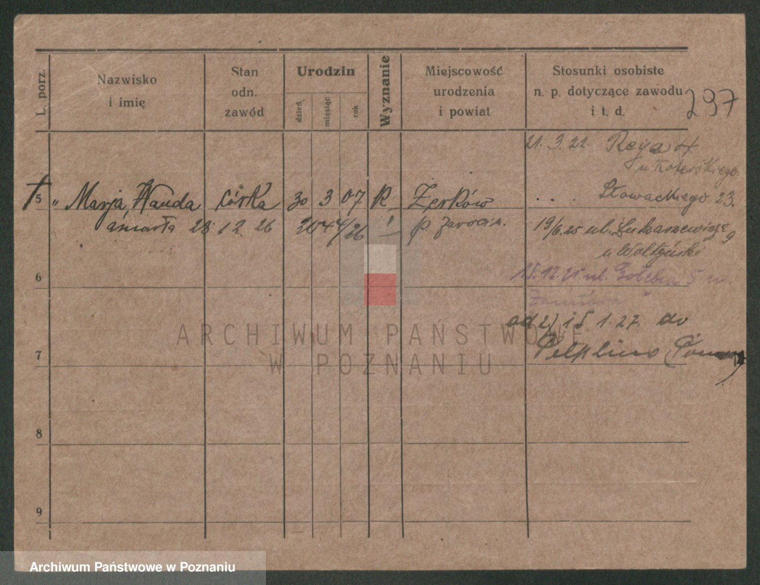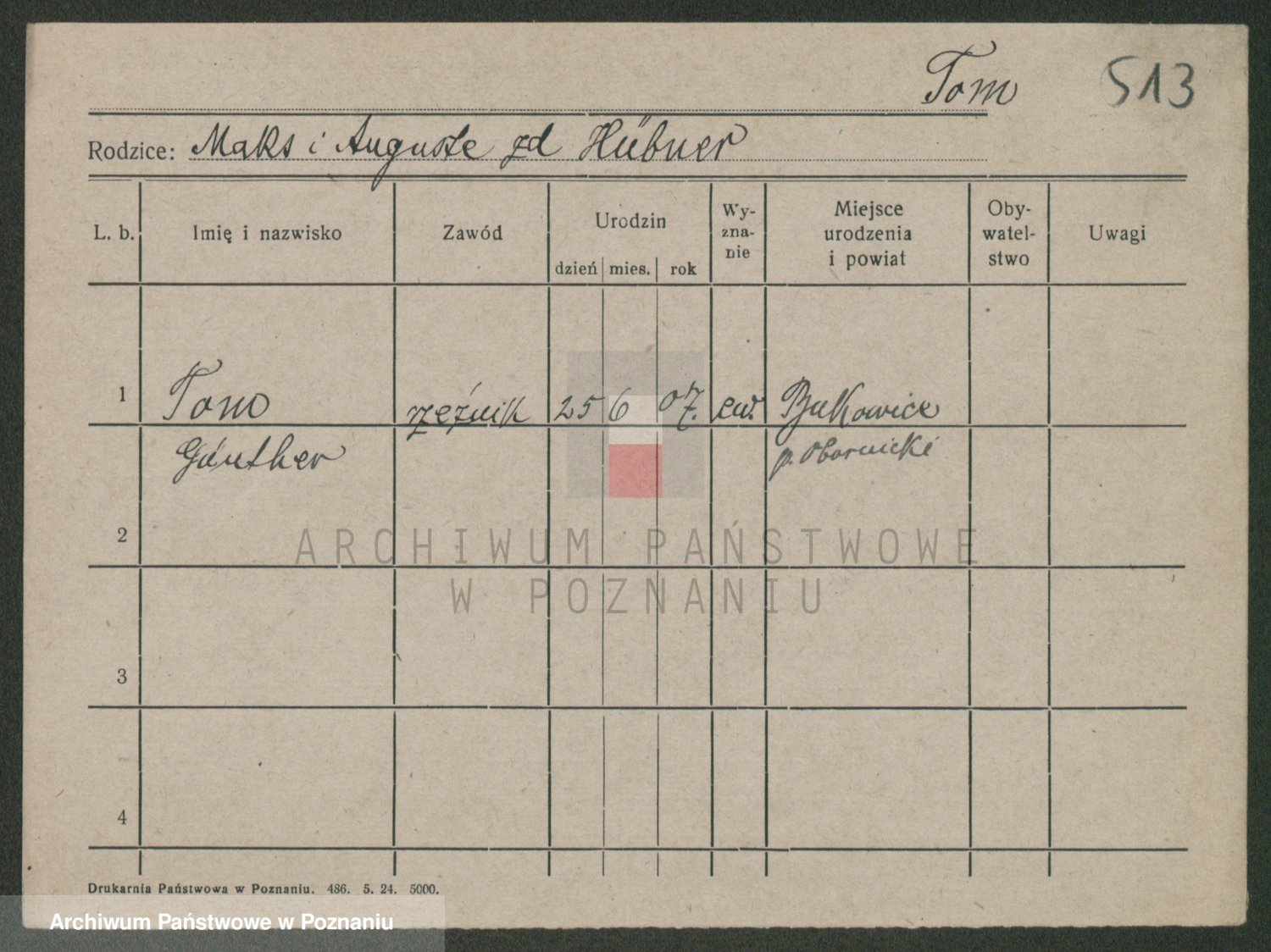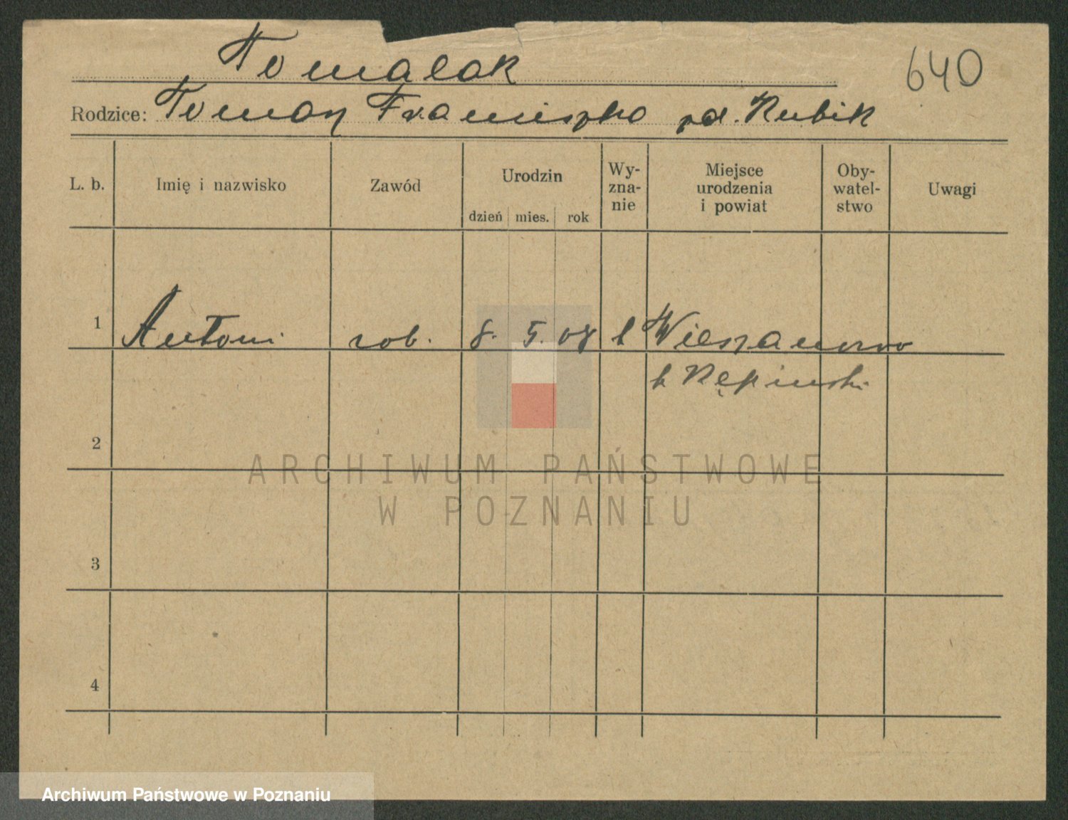 Podgląd karty osobowej dostępny jest po kliknięciu na nazwisko lub ikonkę karty. Można dokonywać powiększenia (ikony na górze) lub przechodzić między kolejnymi skanami (strzałki po bokach).