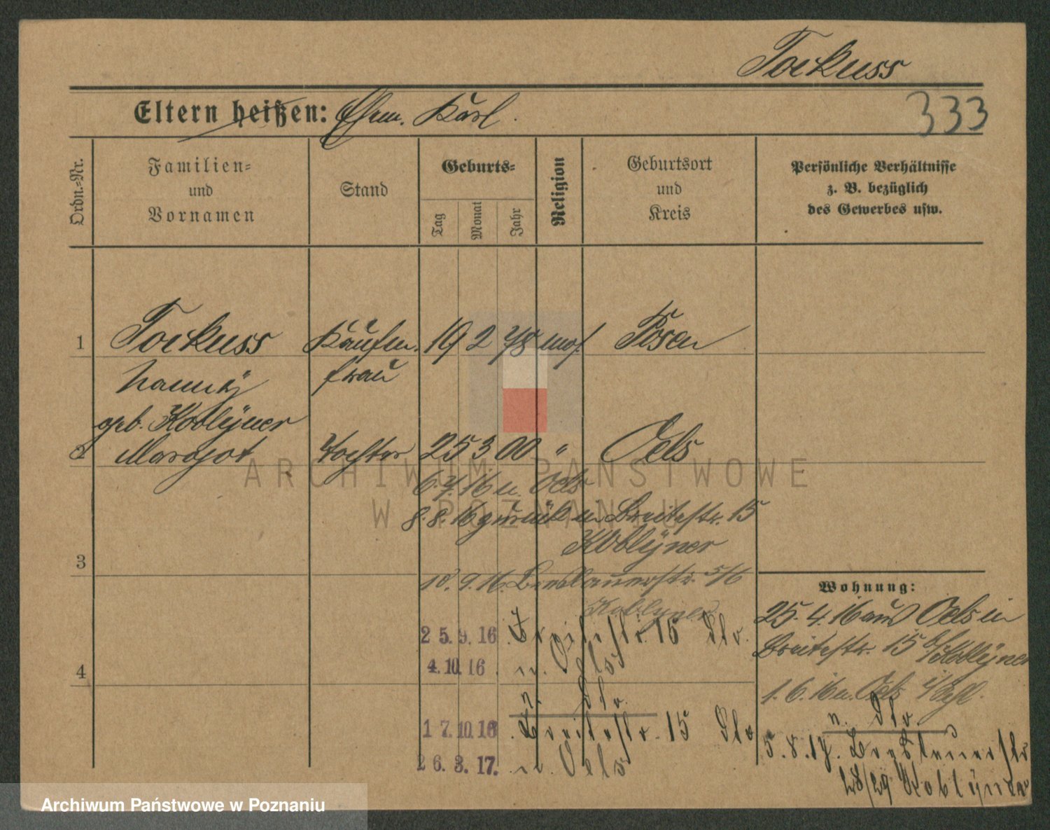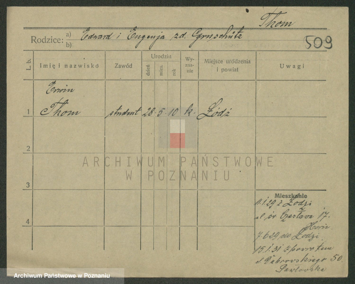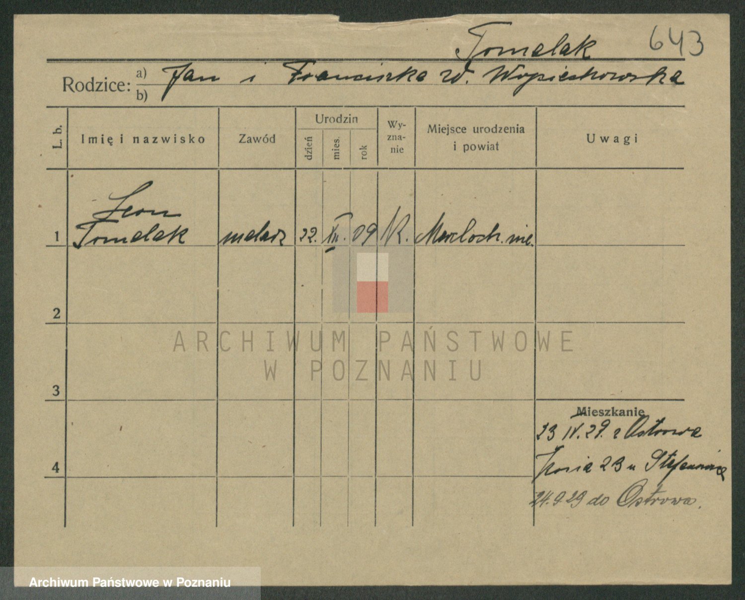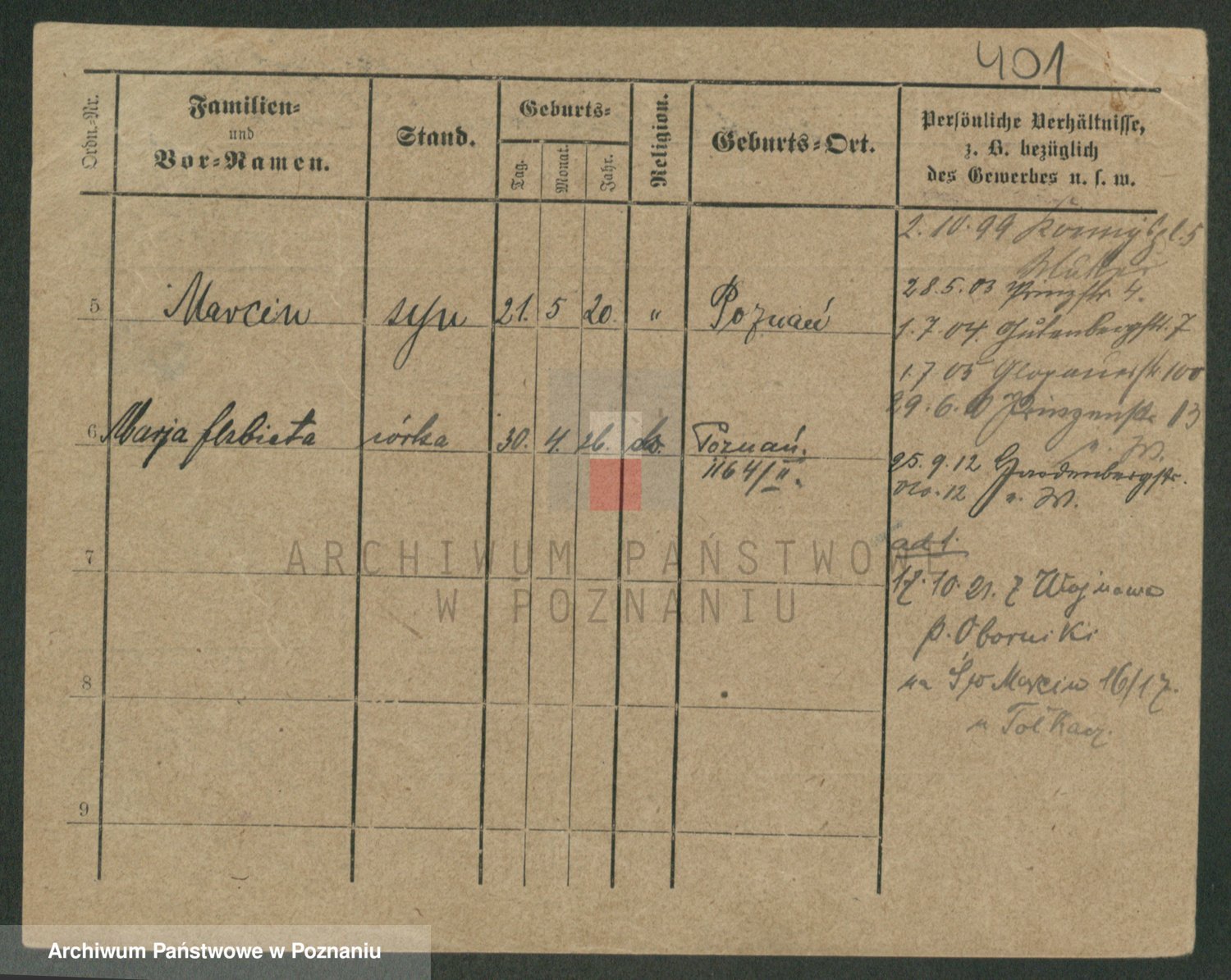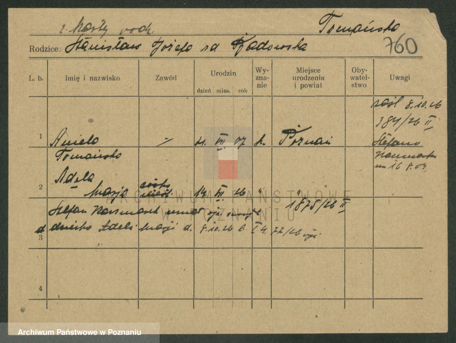 Podgląd karty osobowej dostępny jest po kliknięciu na nazwisko lub ikonkę karty. Można dokonywać powiększenia (ikony na górze) lub przechodzić między kolejnymi skanami (strzałki po bokach).