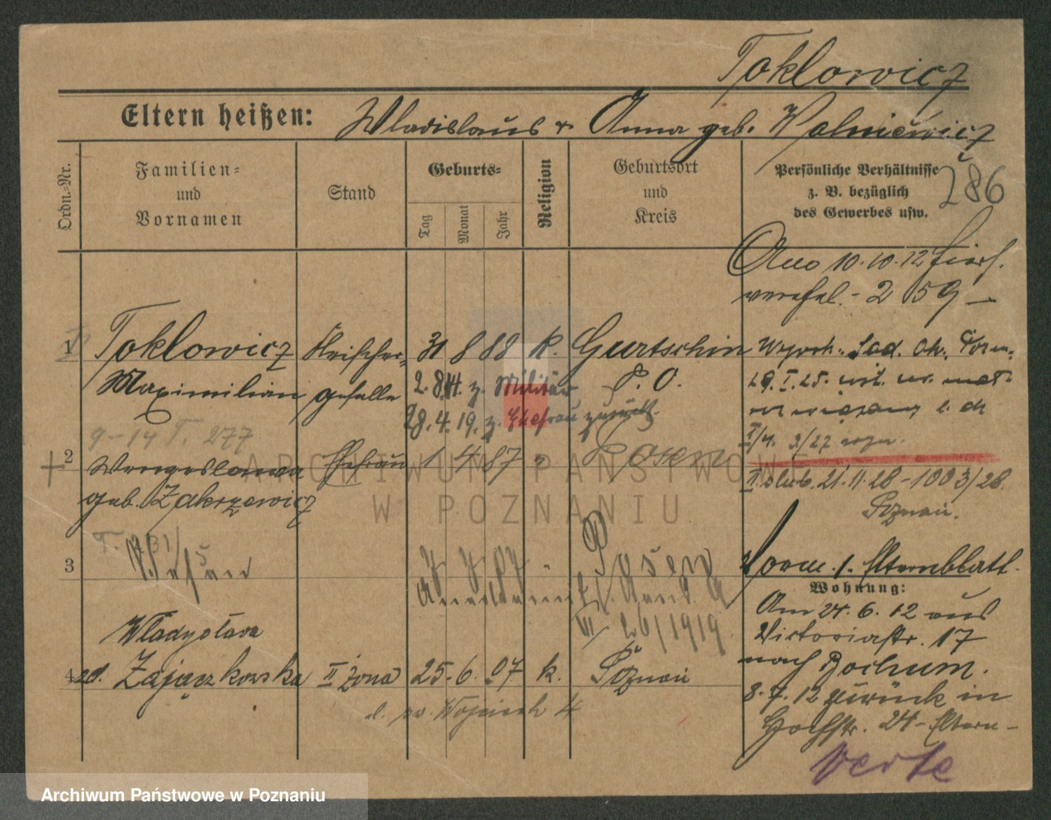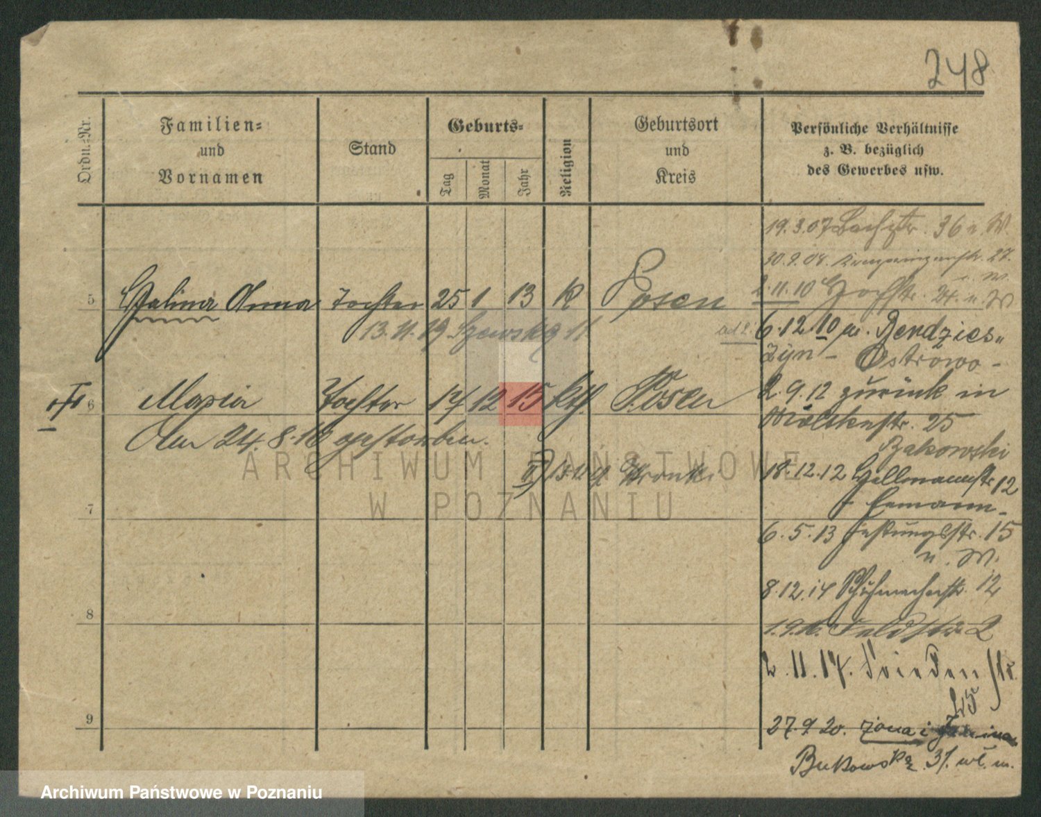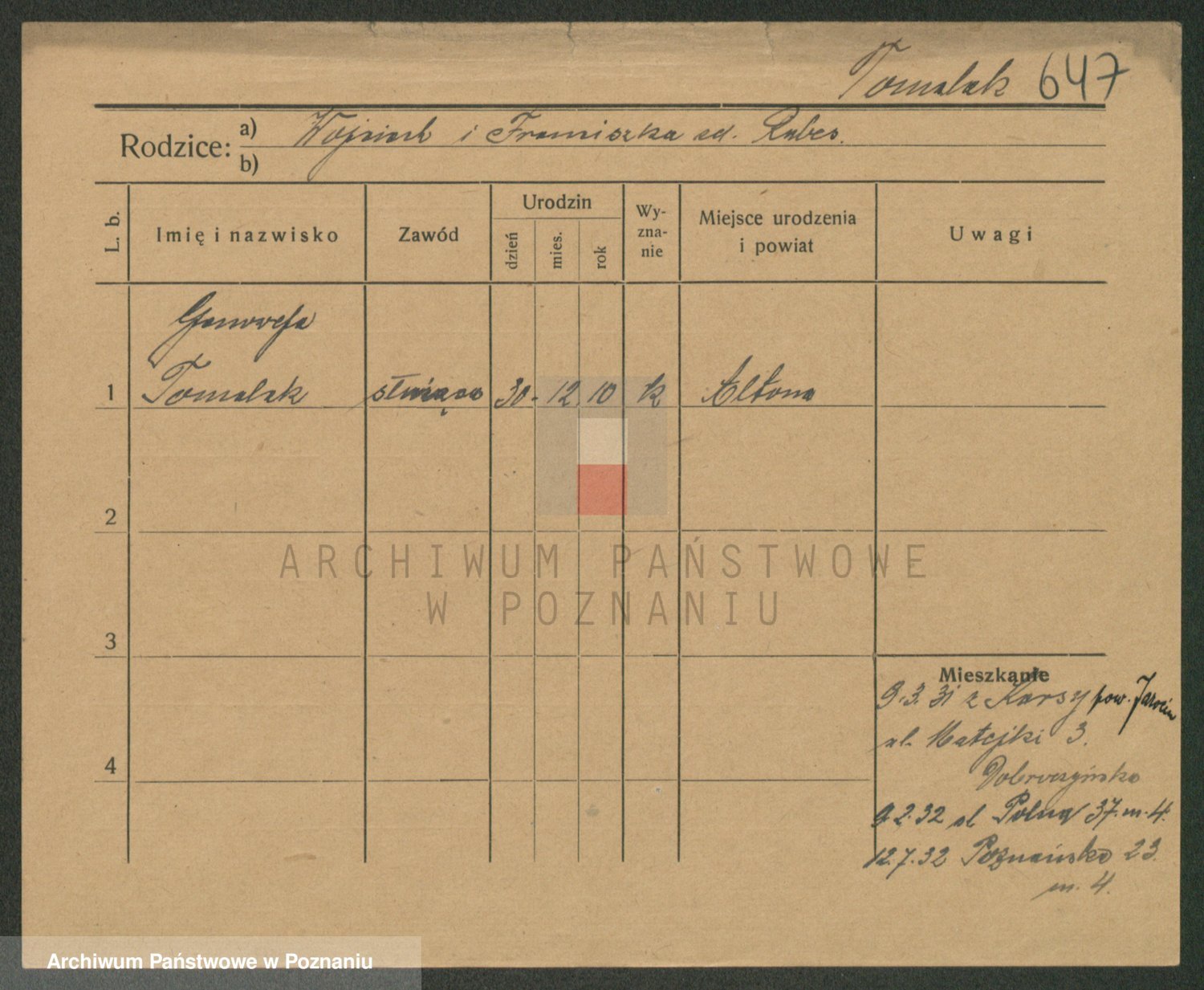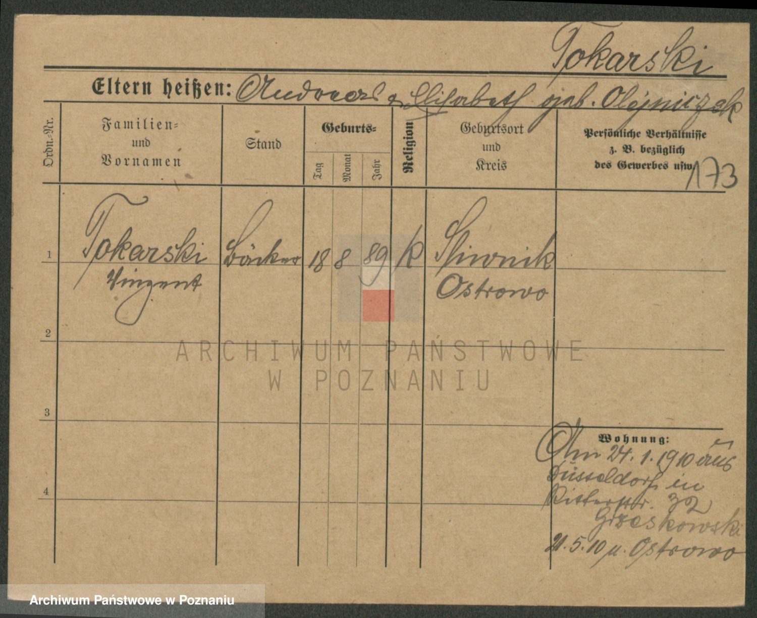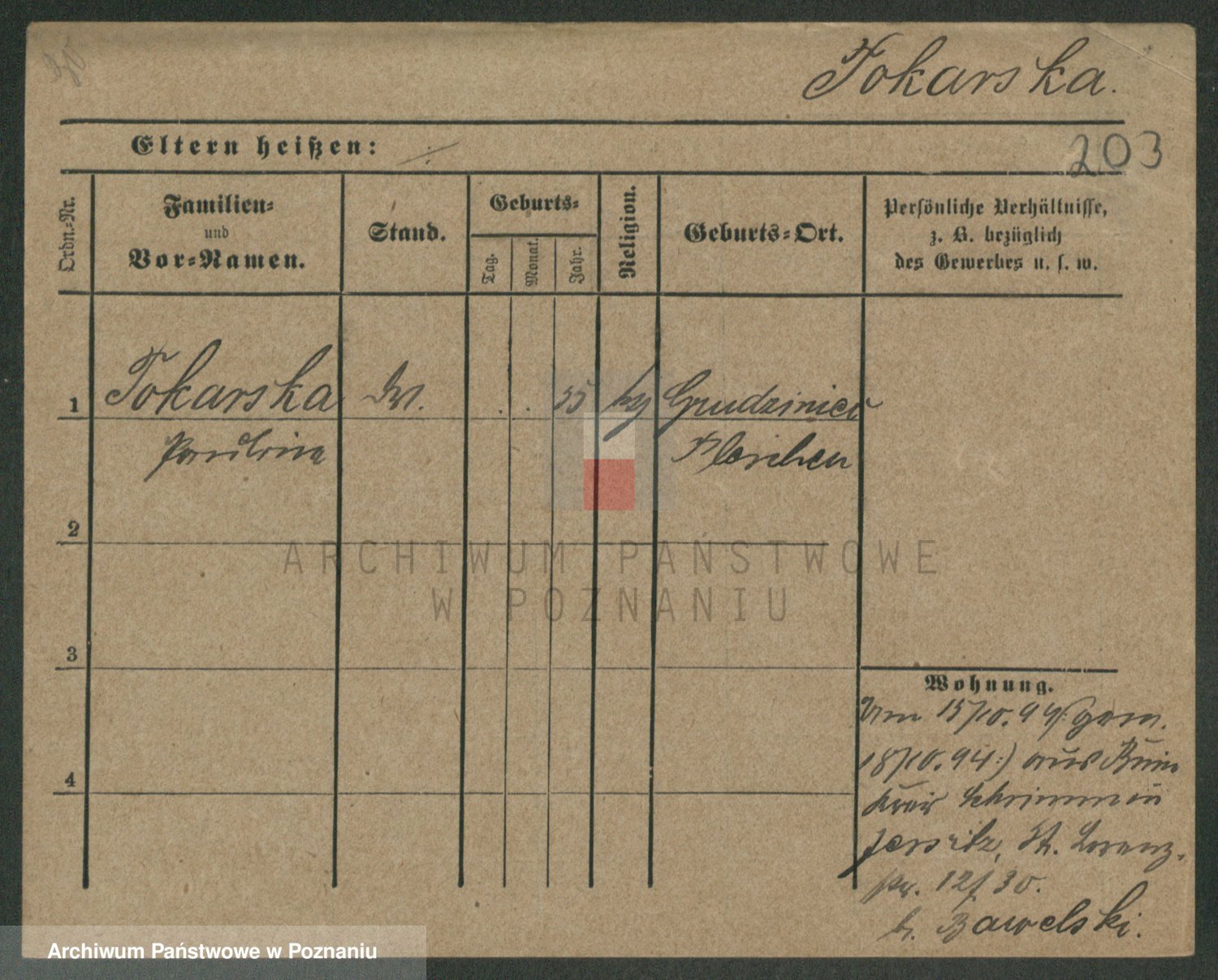 Podgląd karty osobowej dostępny jest po kliknięciu na nazwisko lub ikonkę karty. Można dokonywać powiększenia (ikony na górze) lub przechodzić między kolejnymi skanami (strzałki po bokach).