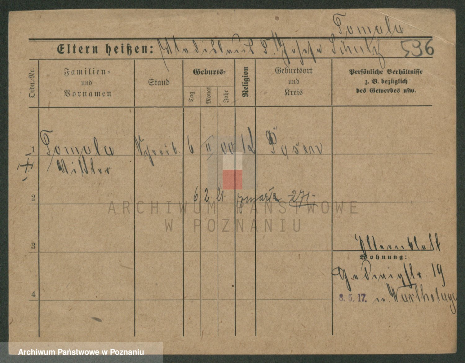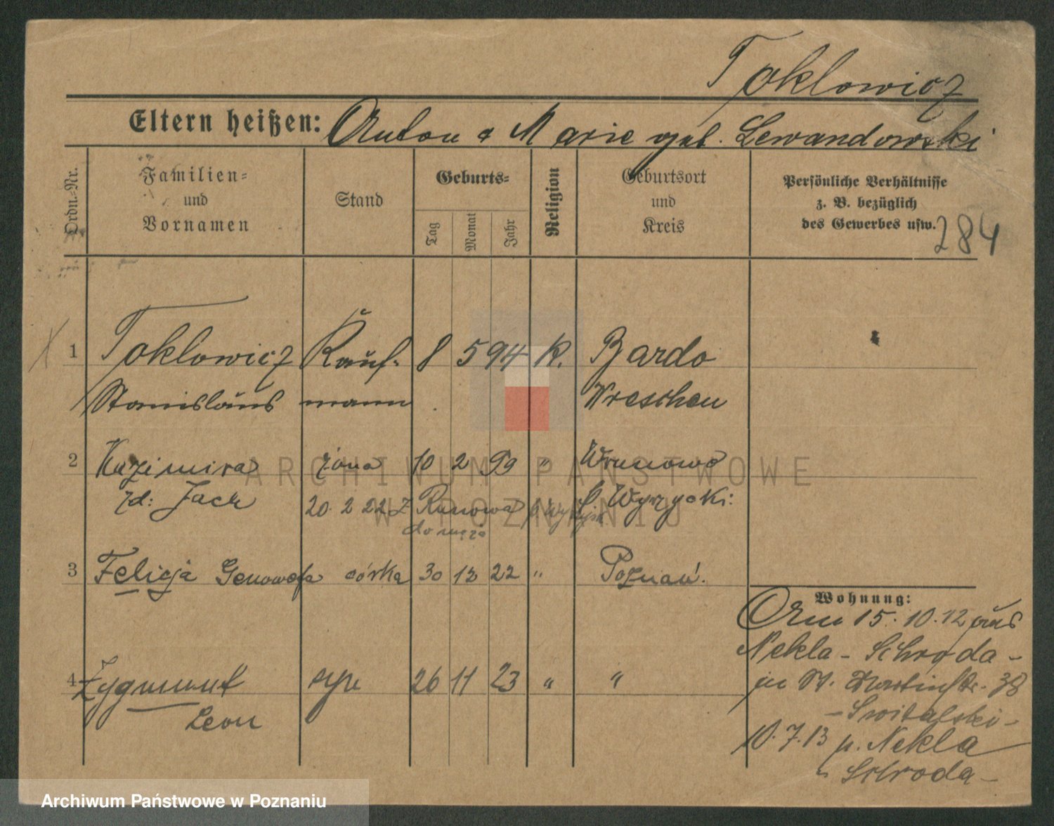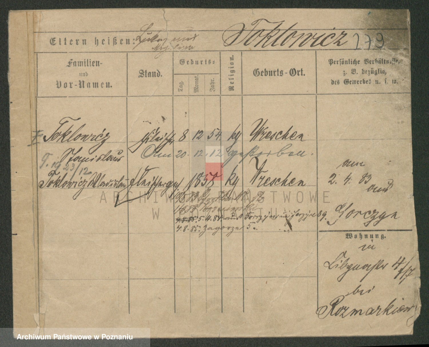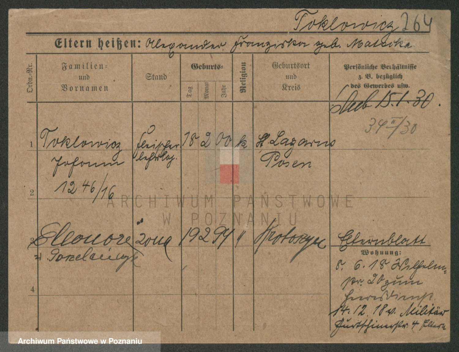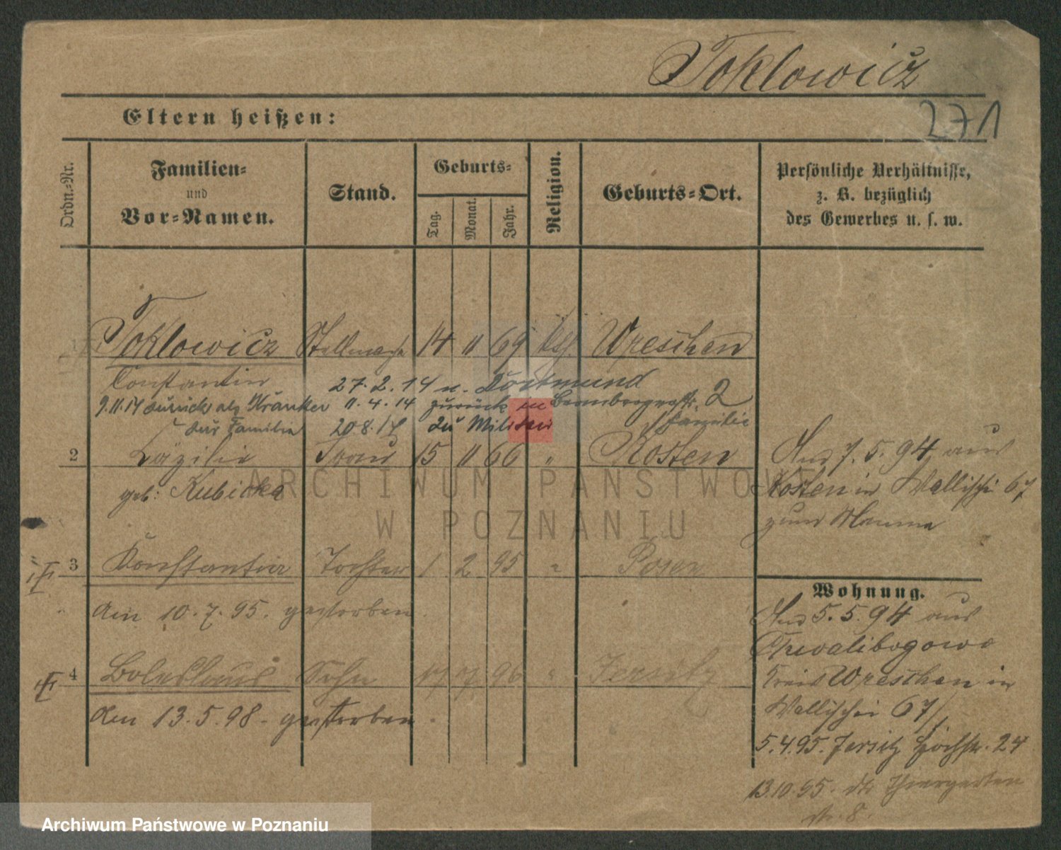 Podgląd karty osobowej dostępny jest po kliknięciu na nazwisko lub ikonkę karty. Można dokonywać powiększenia (ikony na górze) lub przechodzić między kolejnymi skanami (strzałki po bokach).