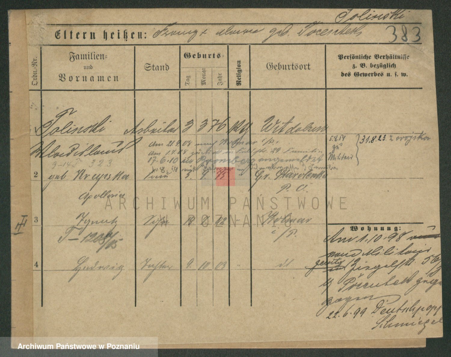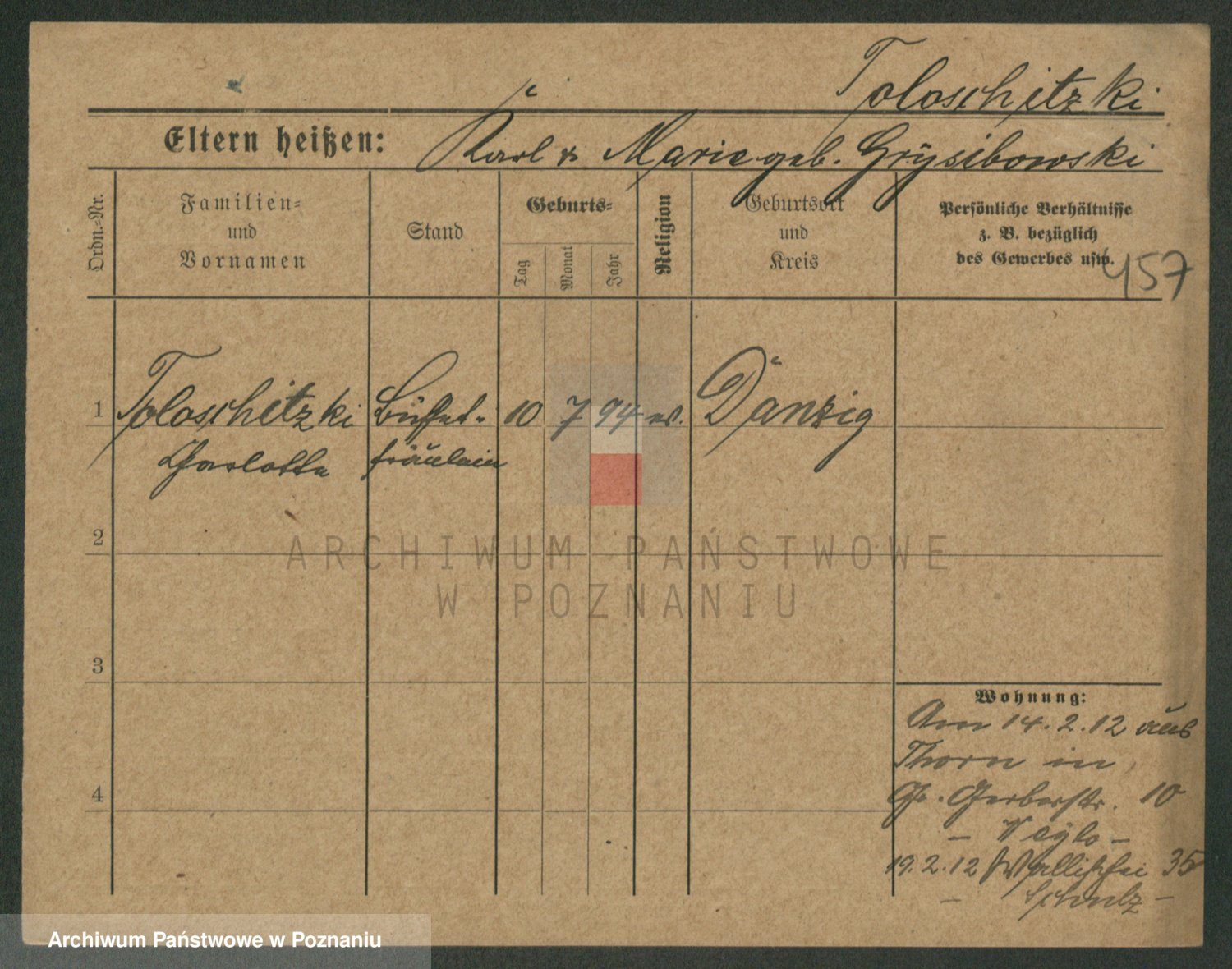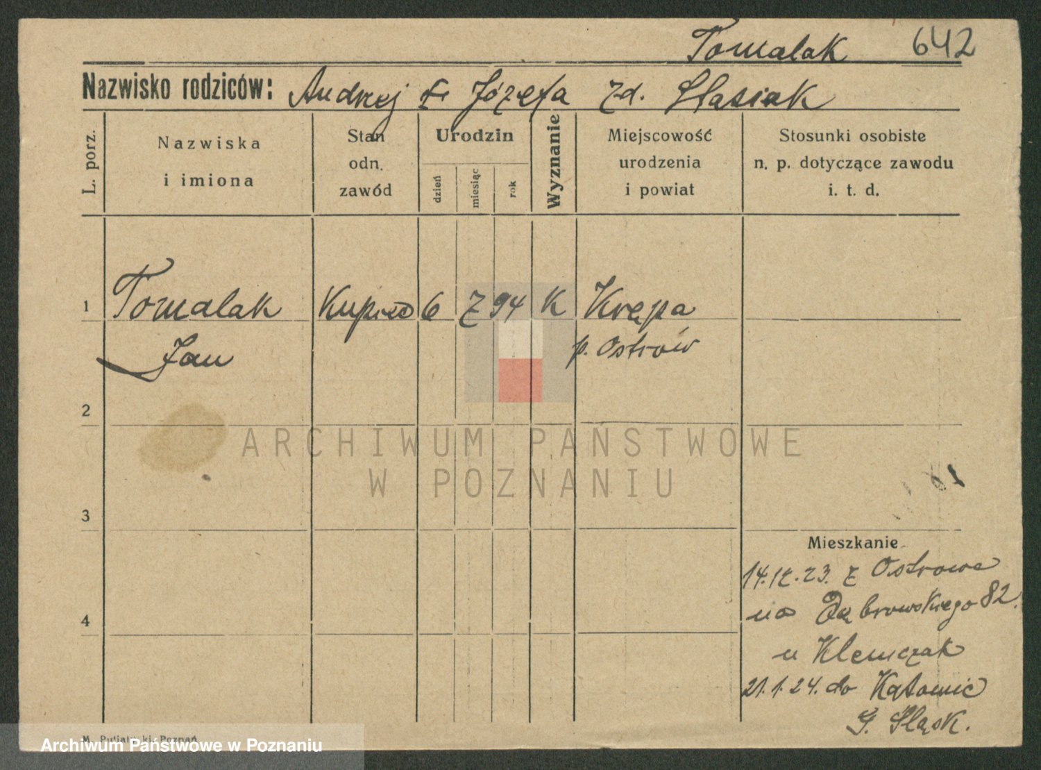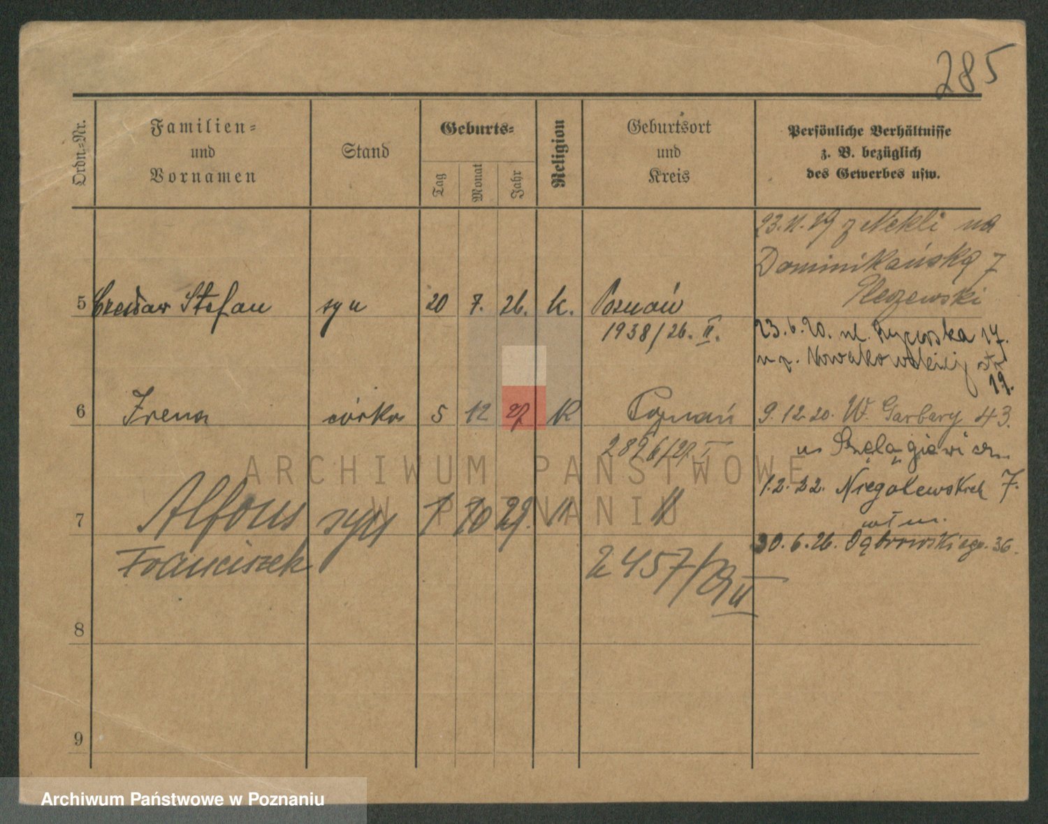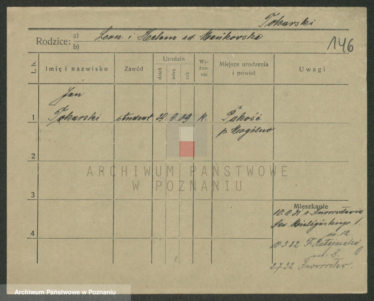 Podgląd karty osobowej dostępny jest po kliknięciu na nazwisko lub ikonkę karty. Można dokonywać powiększenia (ikony na górze) lub przechodzić między kolejnymi skanami (strzałki po bokach).