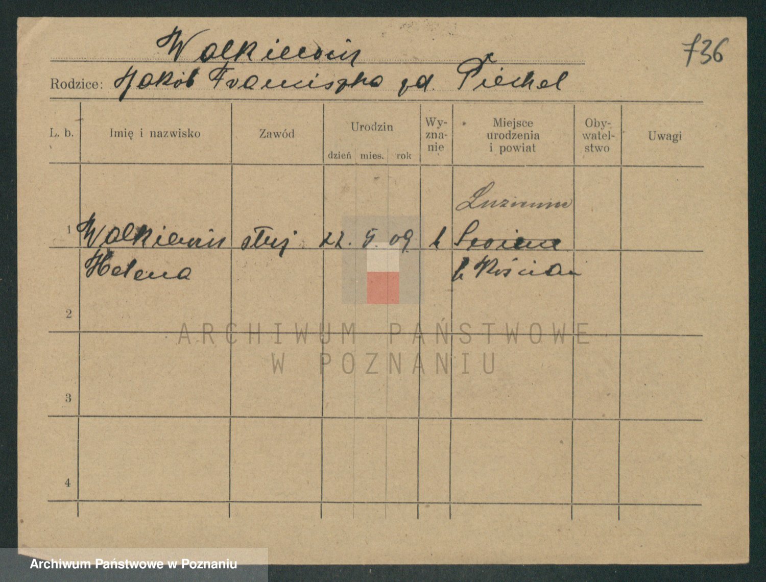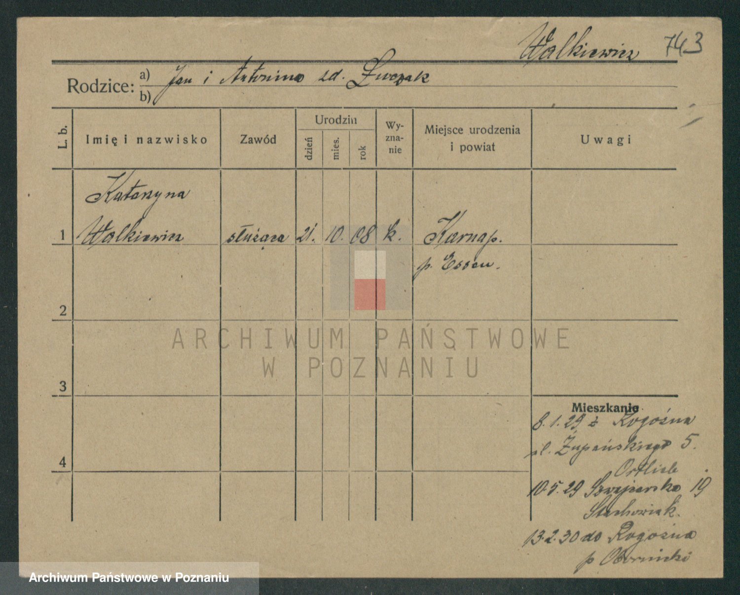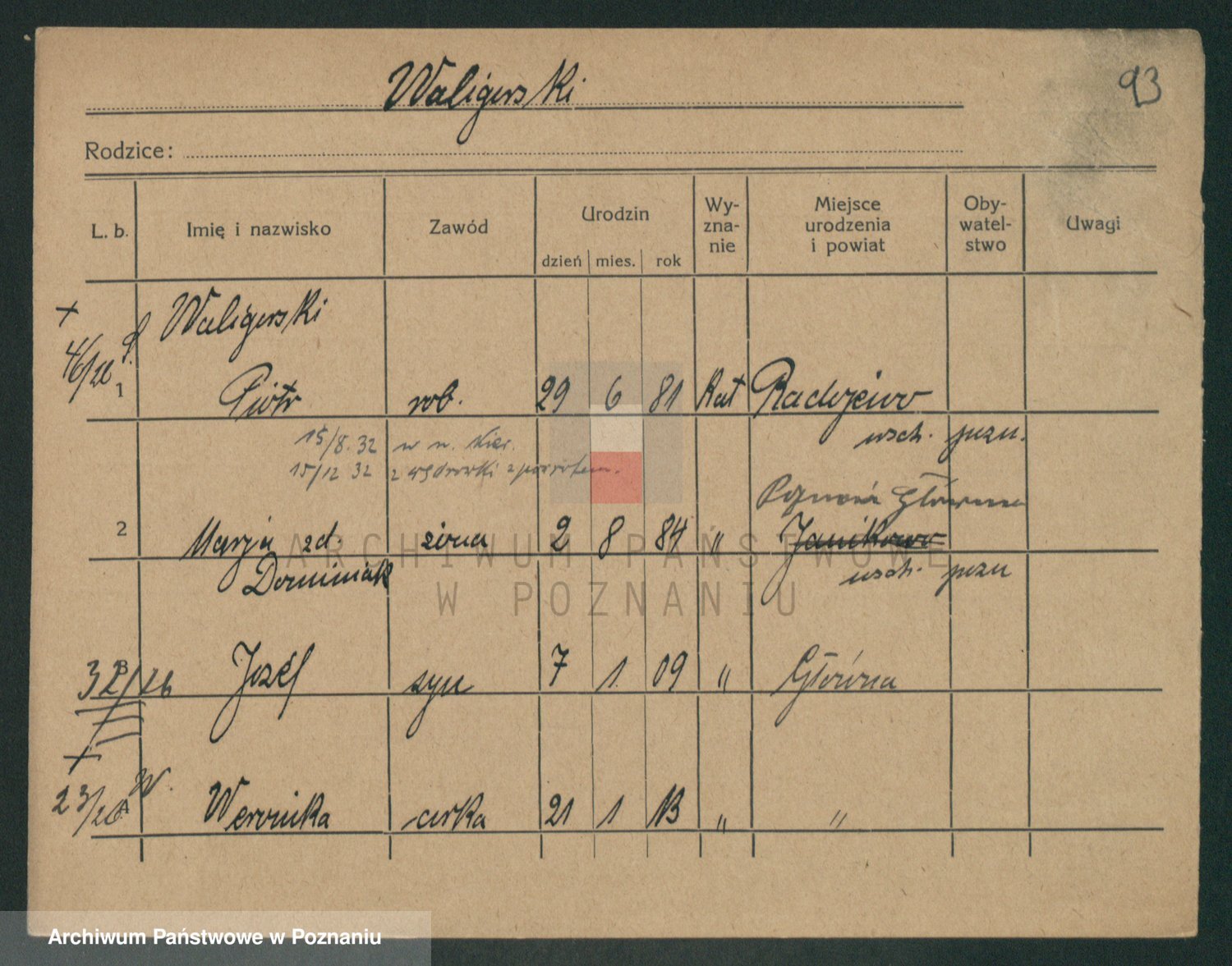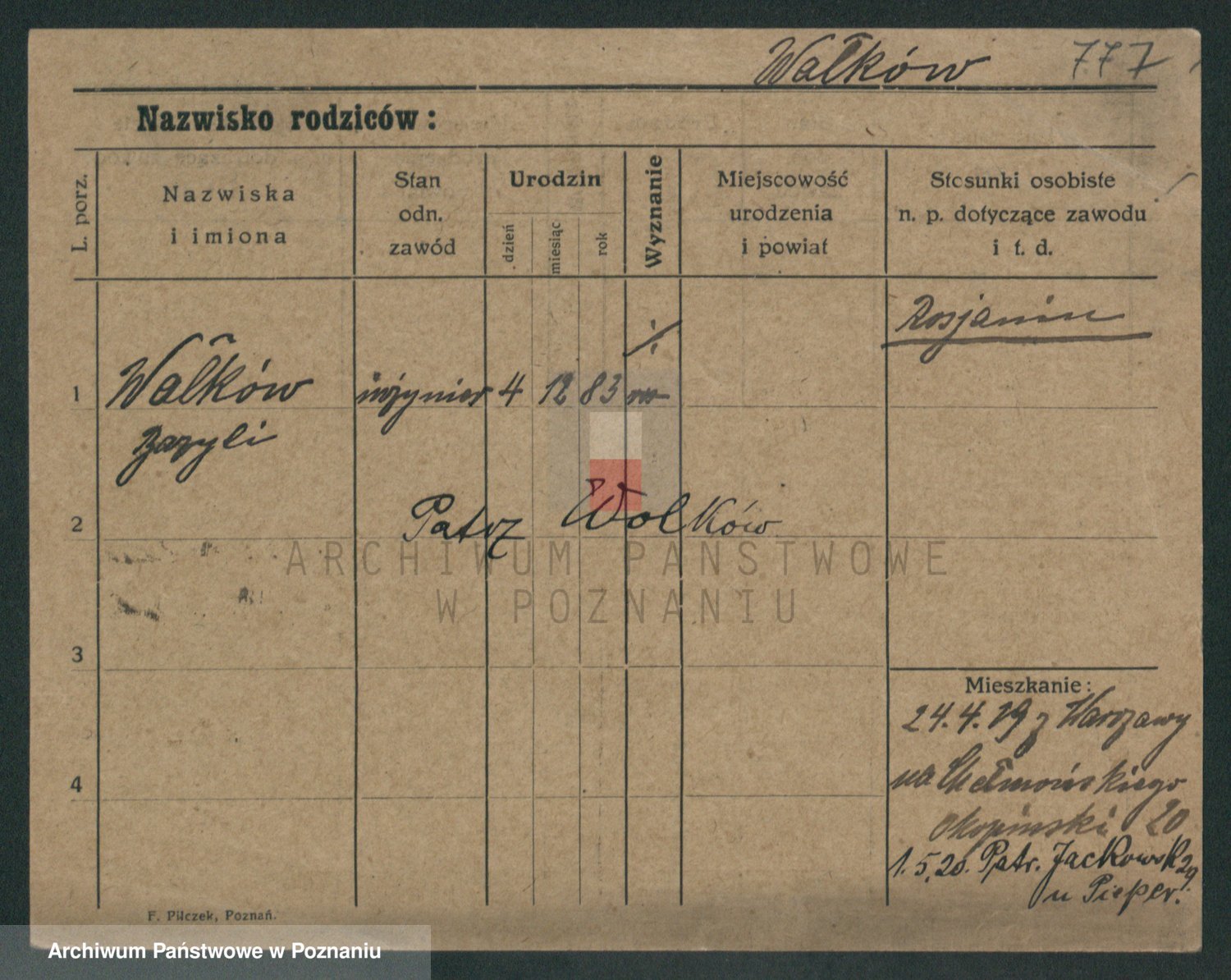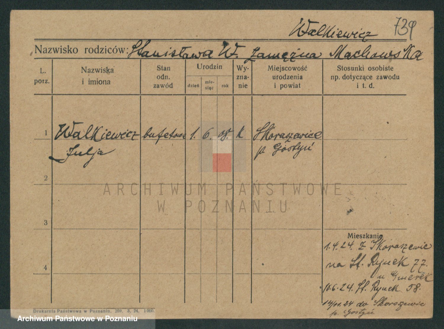 Podgląd karty osobowej dostępny jest po kliknięciu na nazwisko lub ikonkę karty. Można dokonywać powiększenia (ikony na górze) lub przechodzić między kolejnymi skanami (strzałki po bokach).