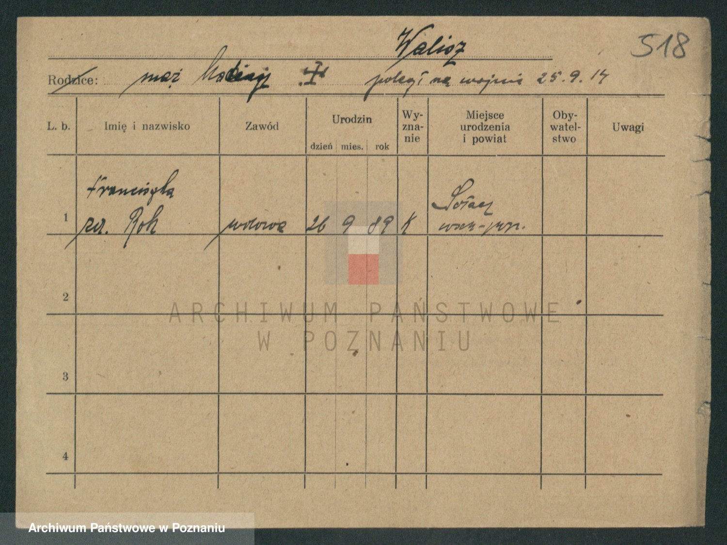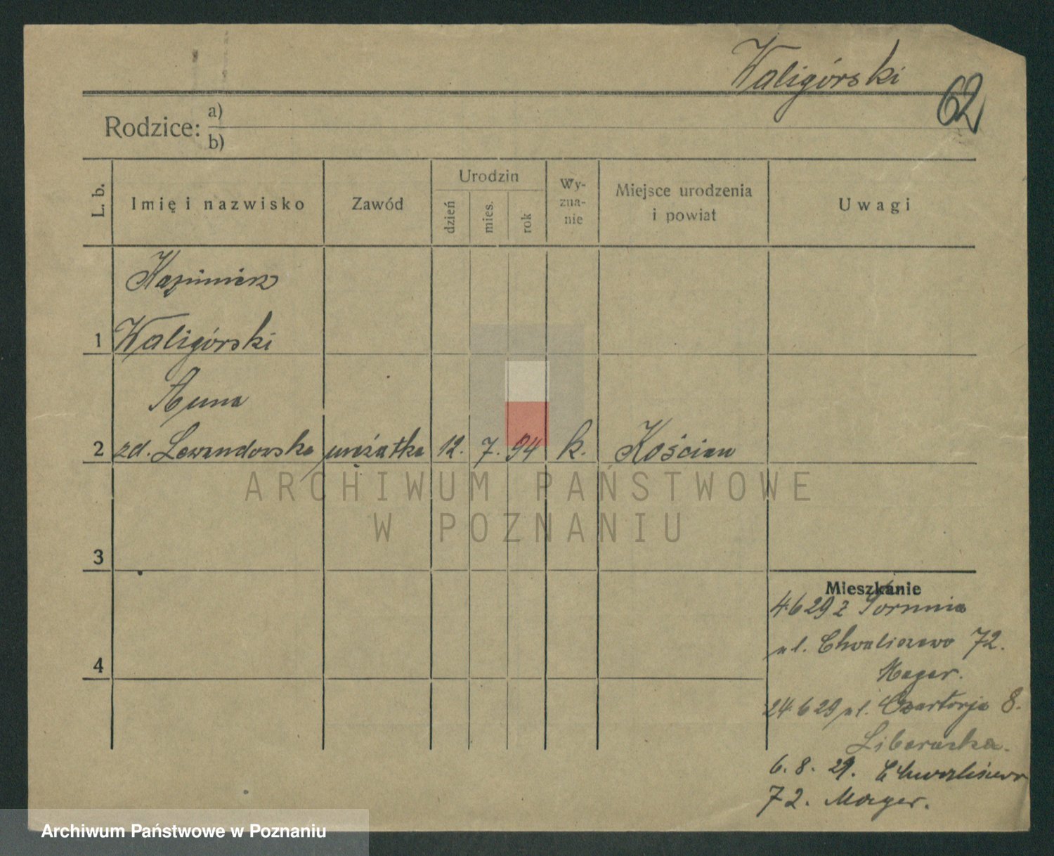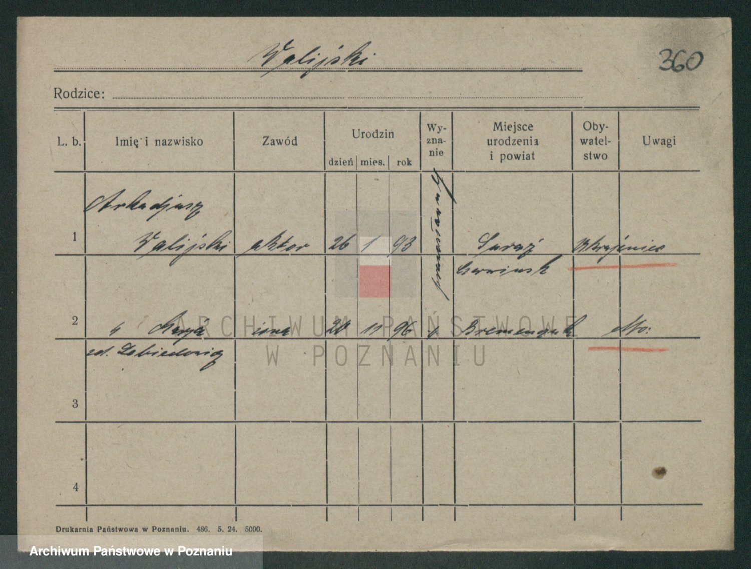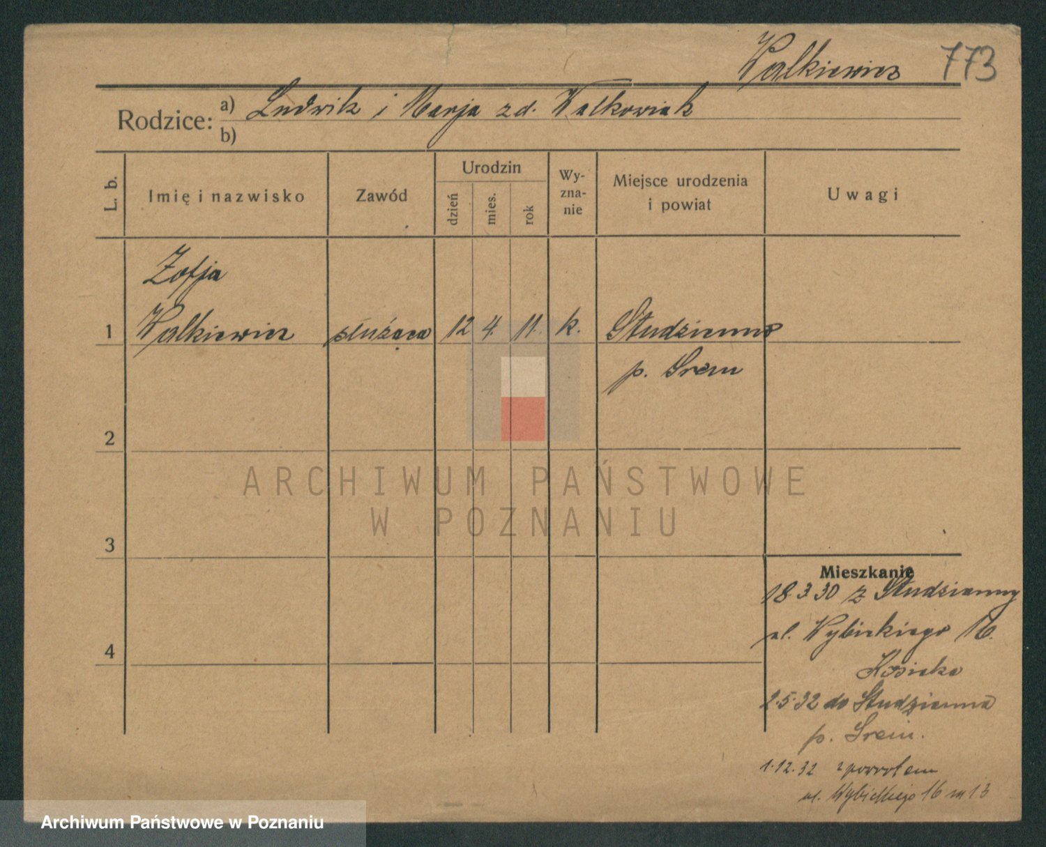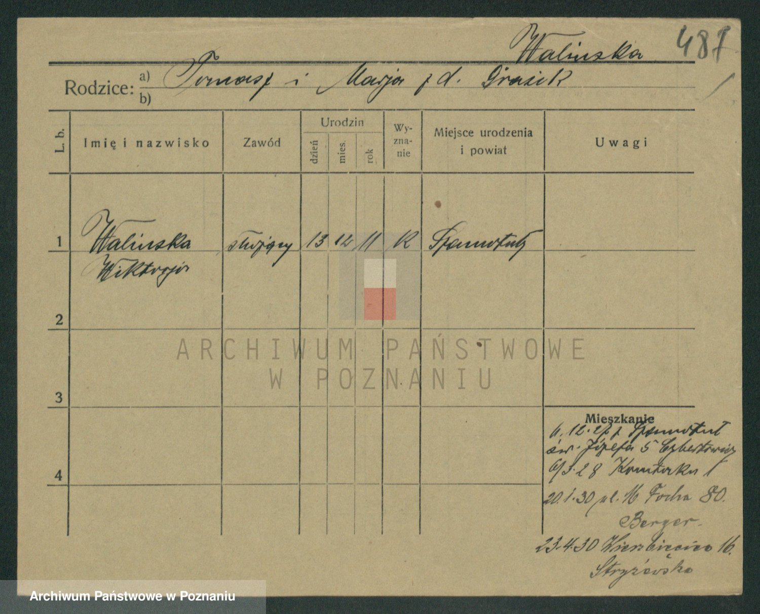 Podgląd karty osobowej dostępny jest po kliknięciu na nazwisko lub ikonkę karty. Można dokonywać powiększenia (ikony na górze) lub przechodzić między kolejnymi skanami (strzałki po bokach).