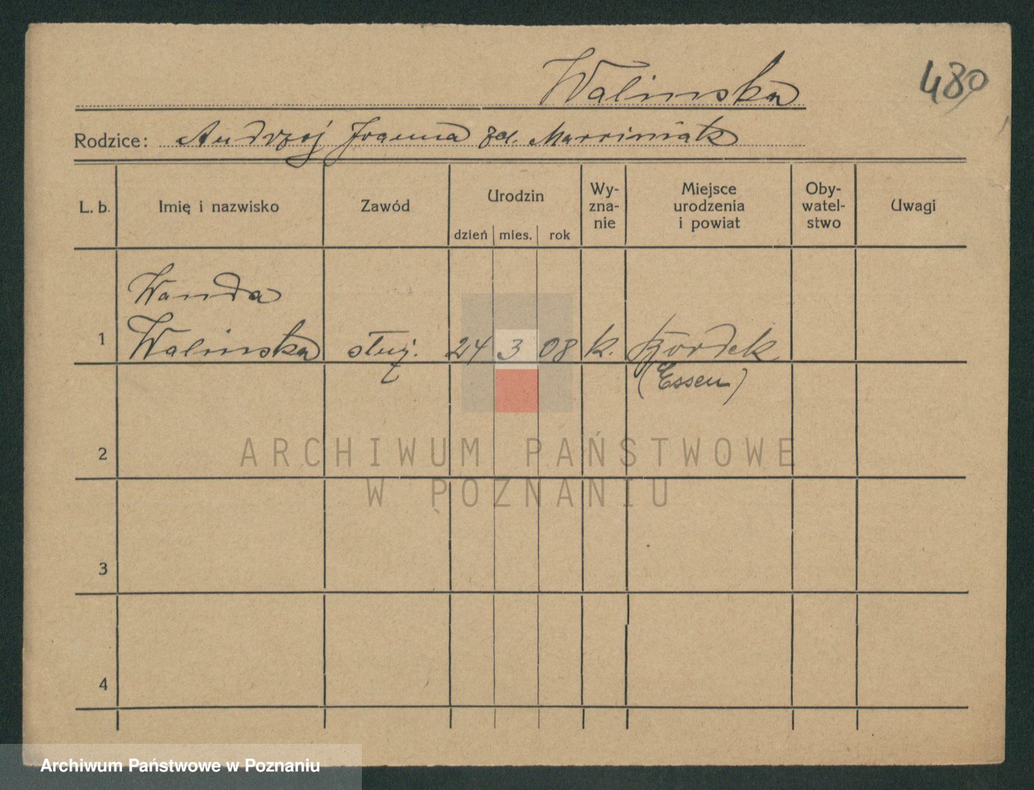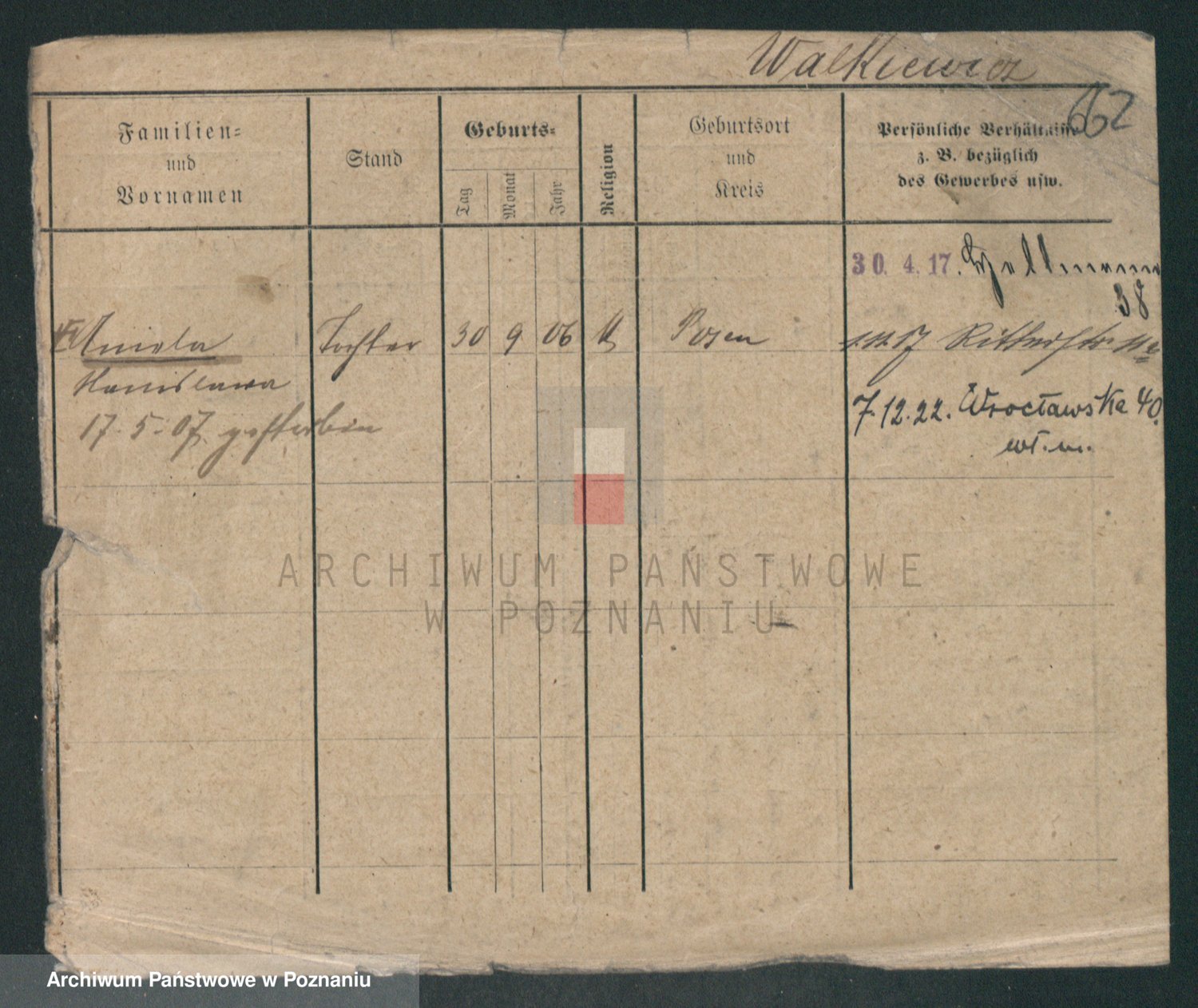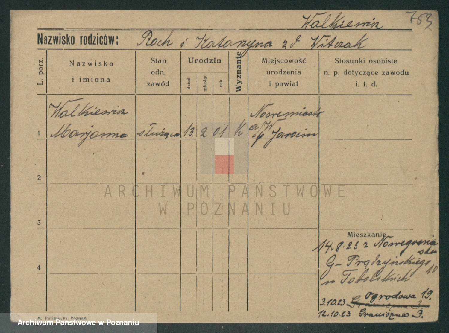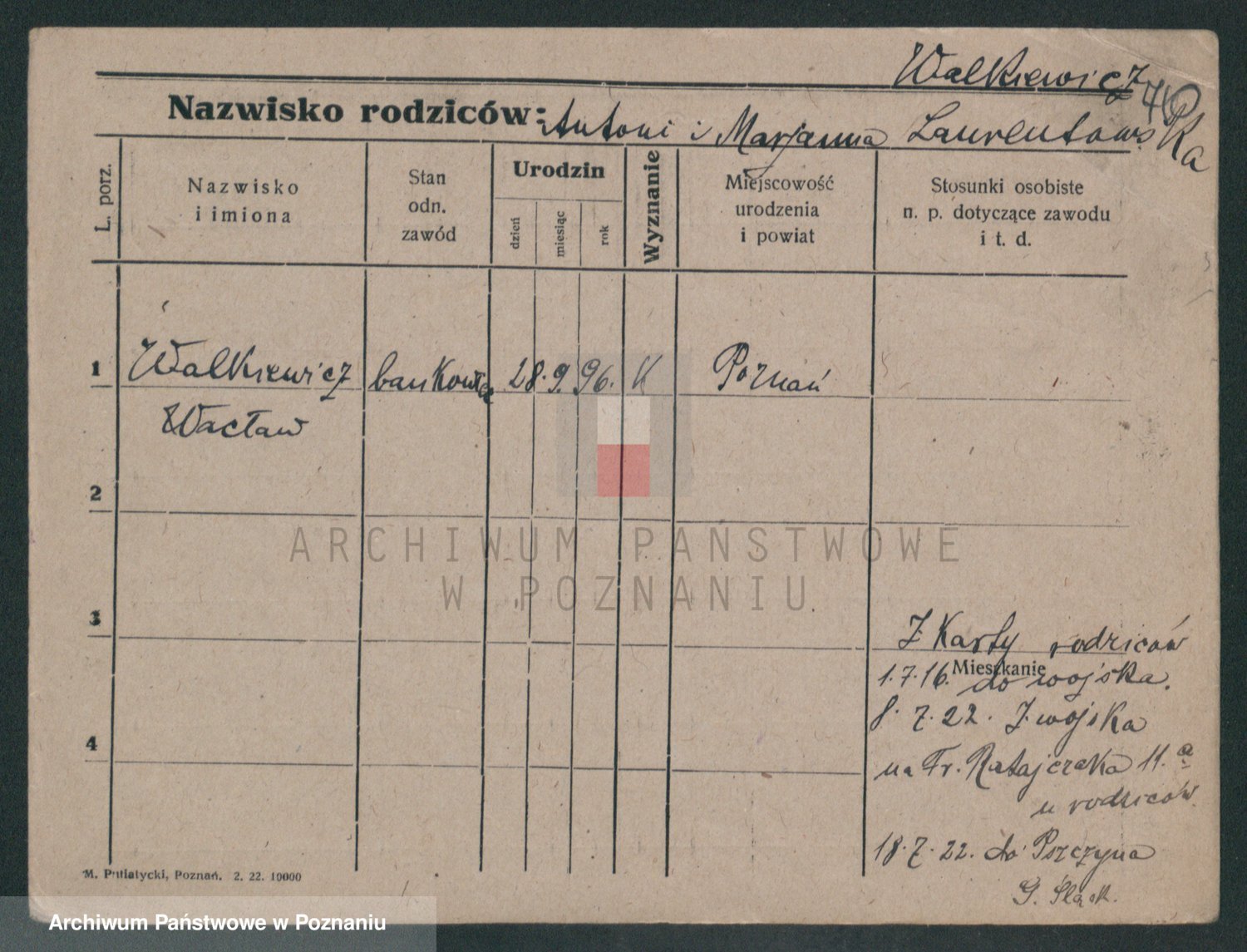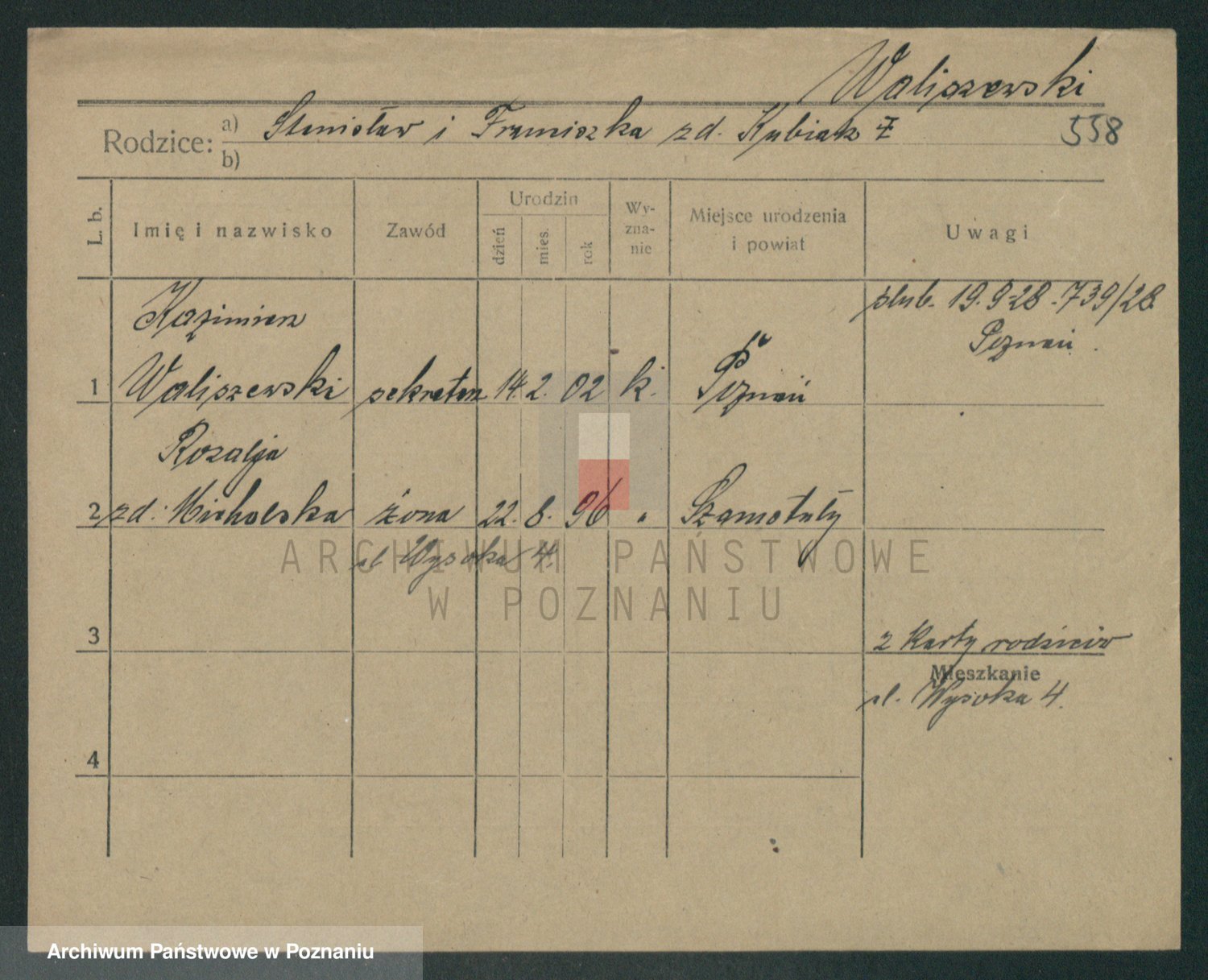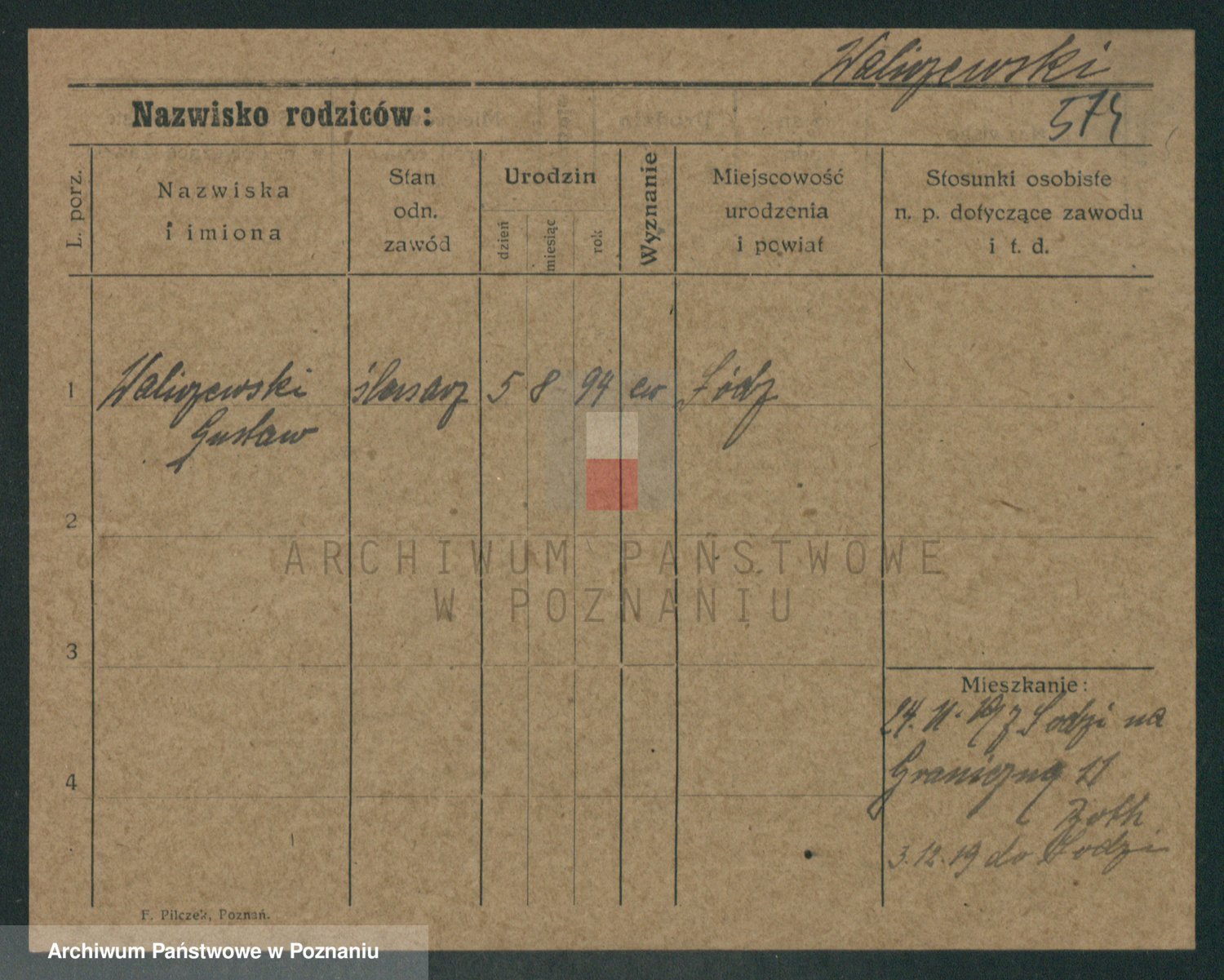 Podgląd karty osobowej dostępny jest po kliknięciu na nazwisko lub ikonkę karty. Można dokonywać powiększenia (ikony na górze) lub przechodzić między kolejnymi skanami (strzałki po bokach).