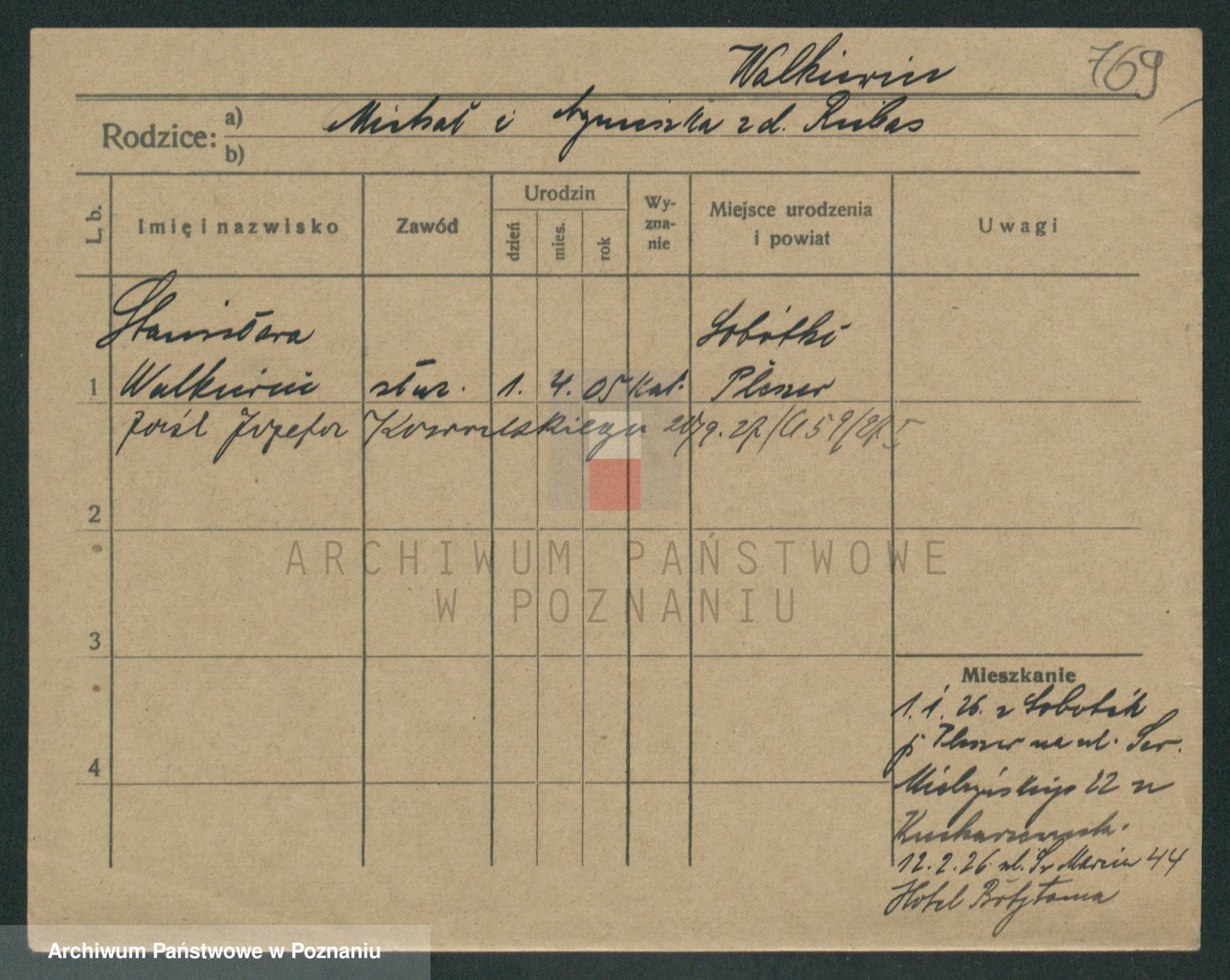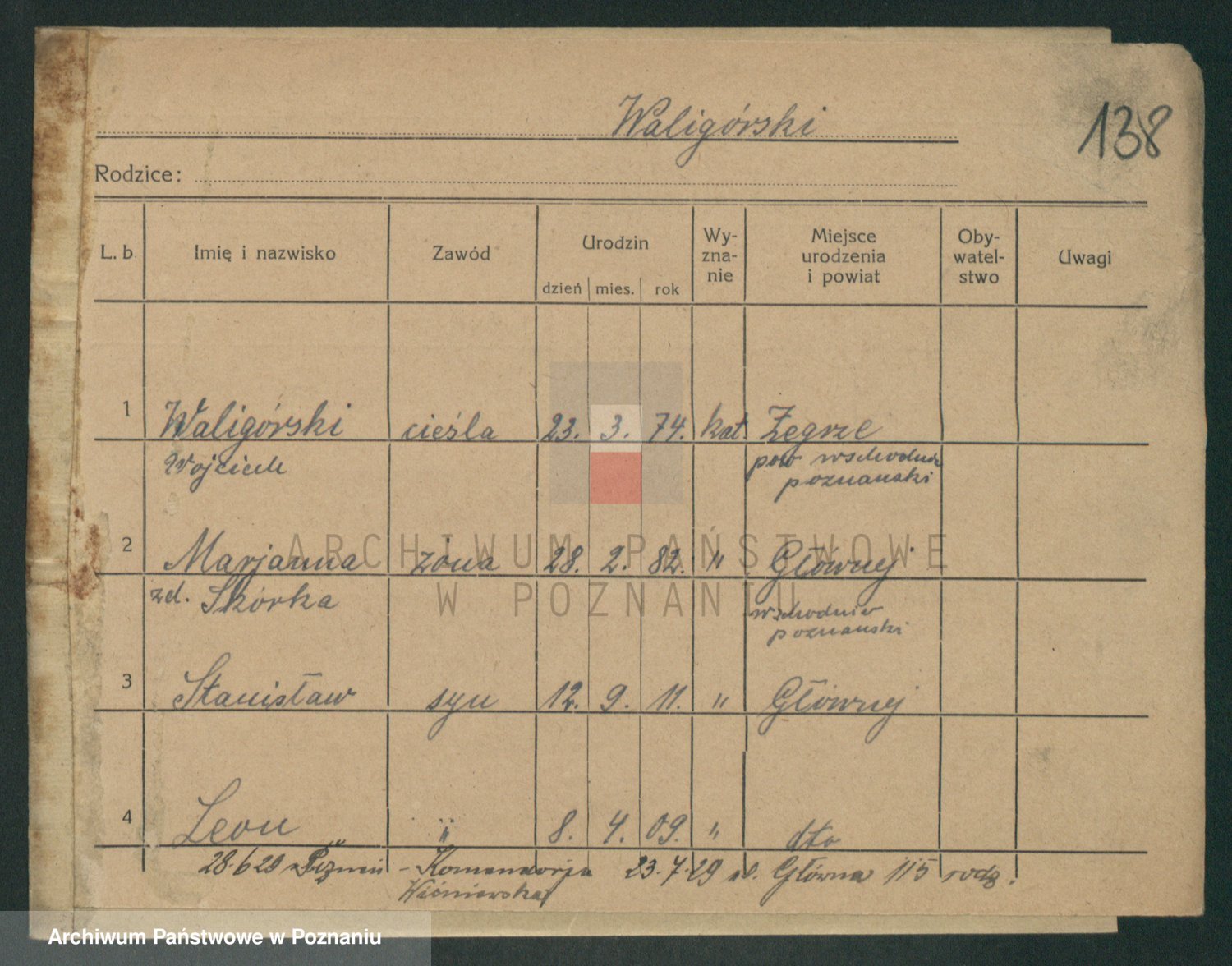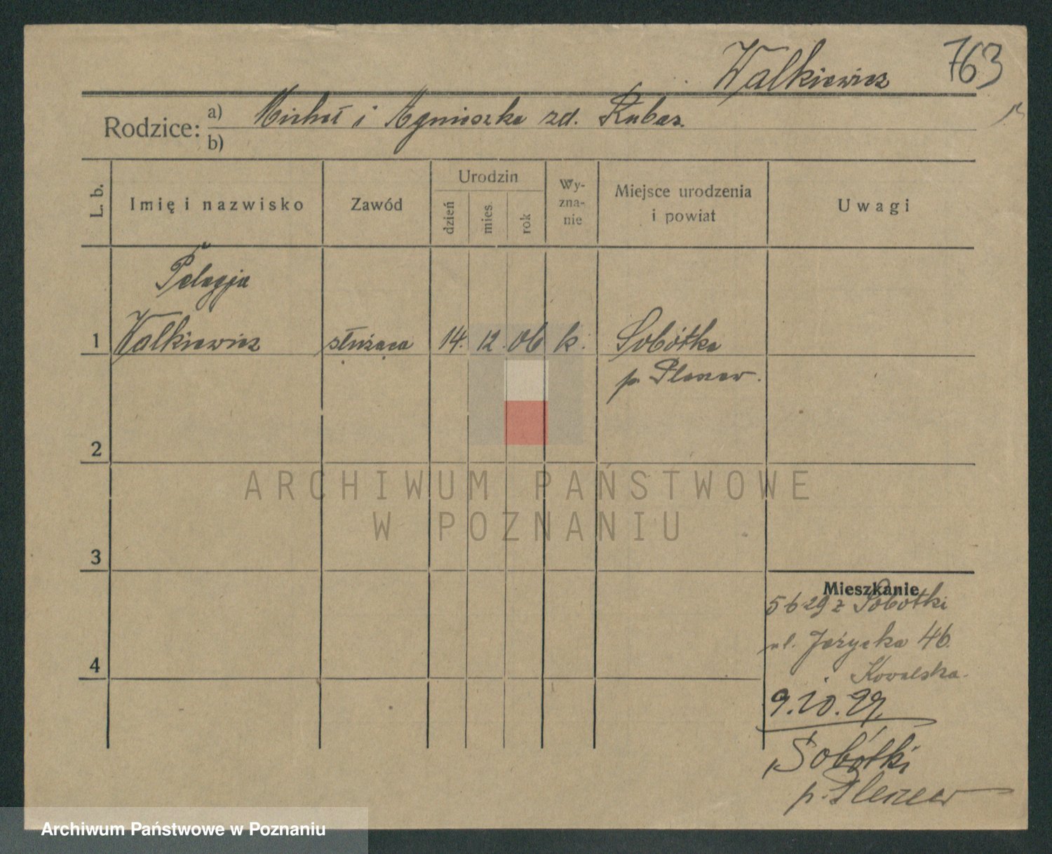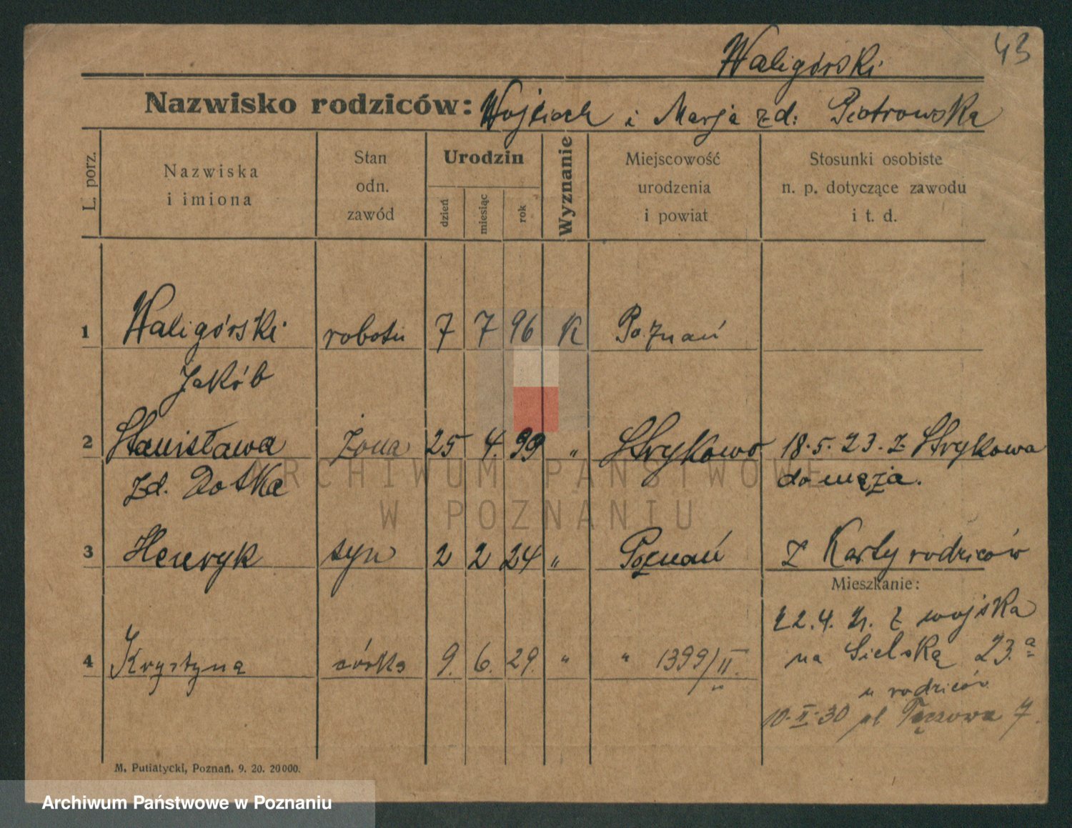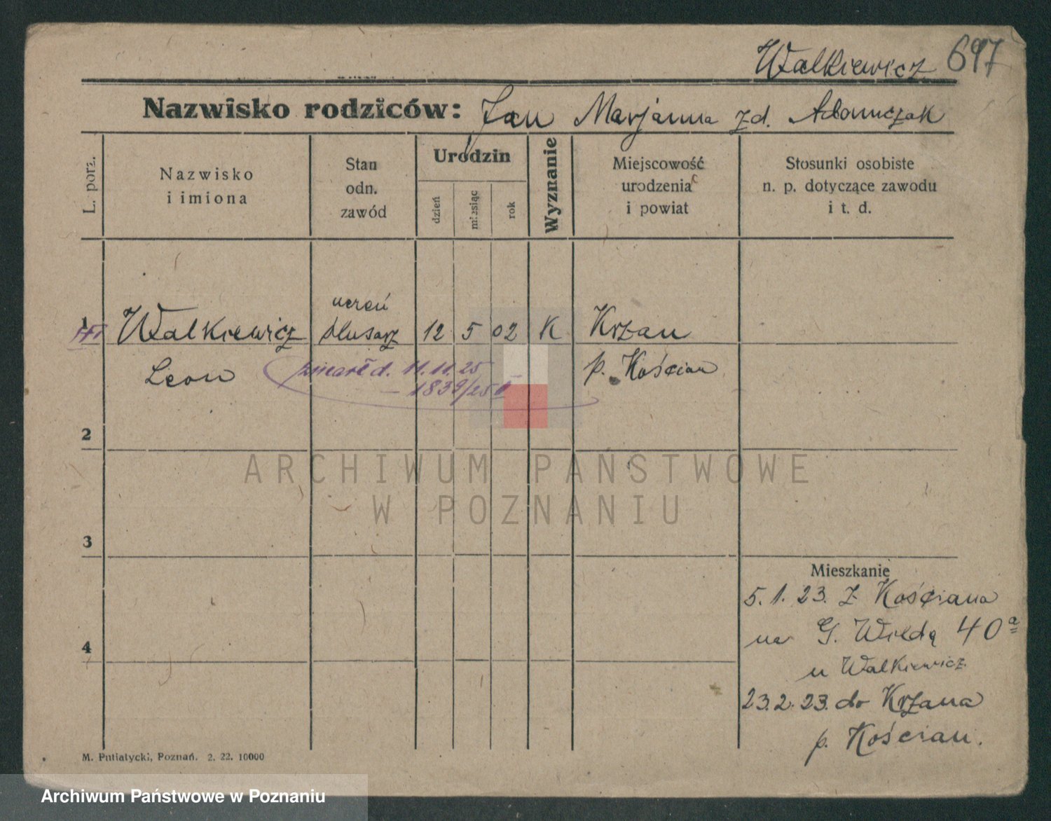 Podgląd karty osobowej dostępny jest po kliknięciu na nazwisko lub ikonkę karty. Można dokonywać powiększenia (ikony na górze) lub przechodzić między kolejnymi skanami (strzałki po bokach).