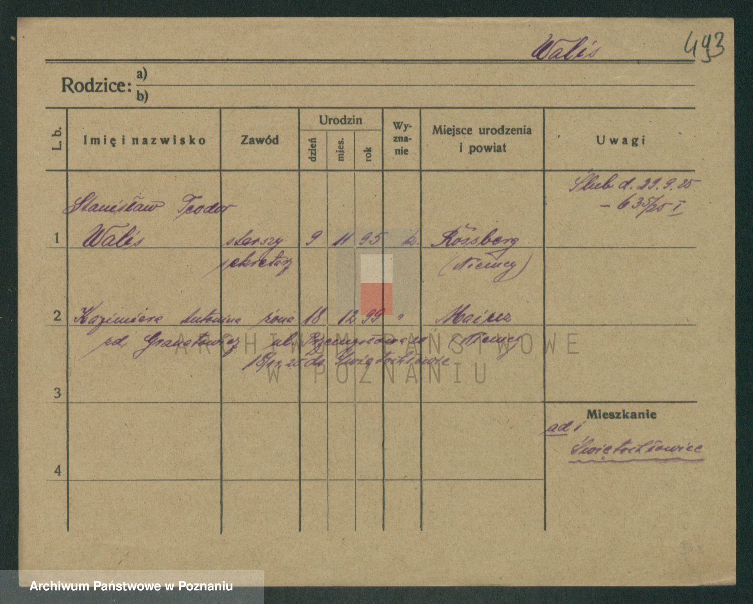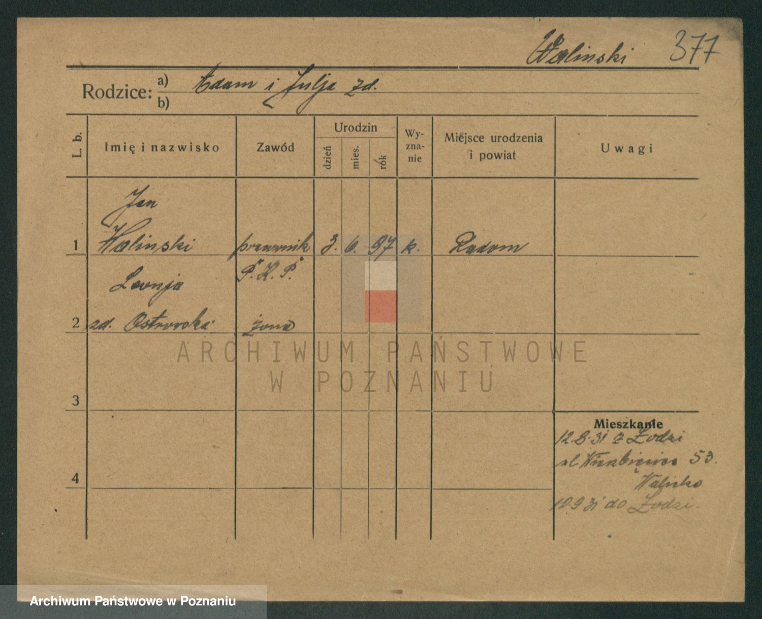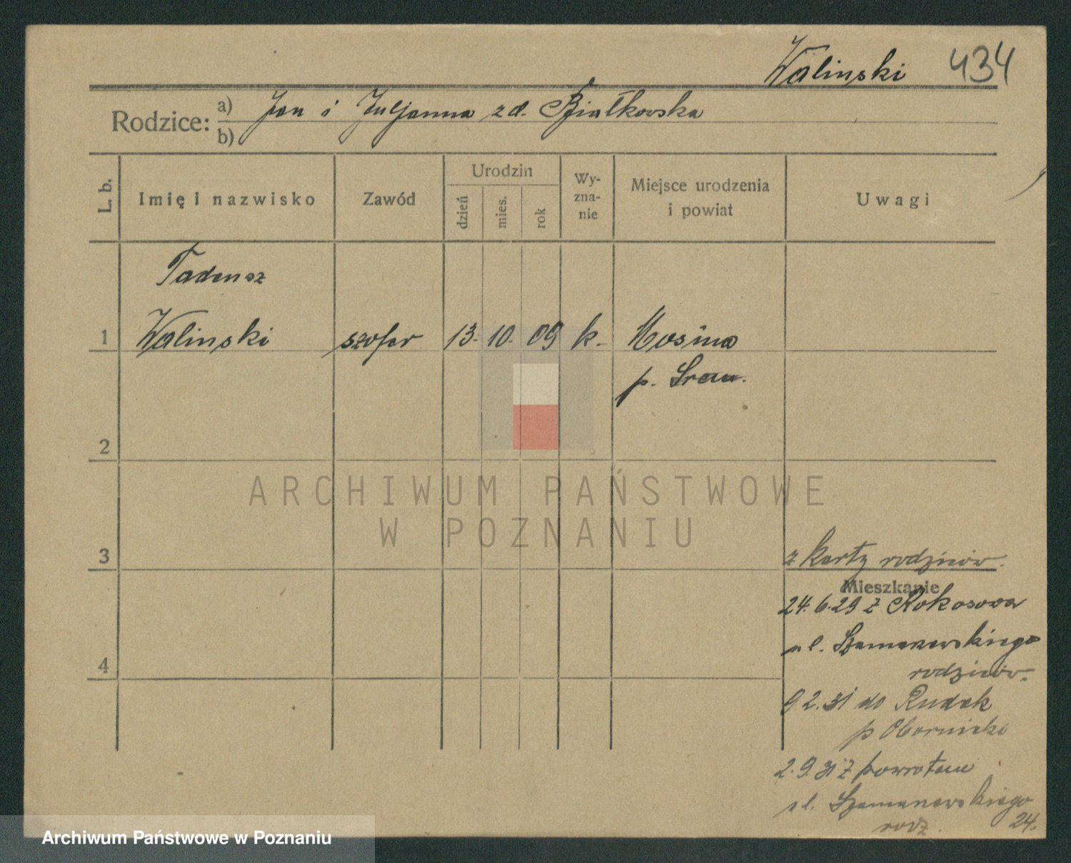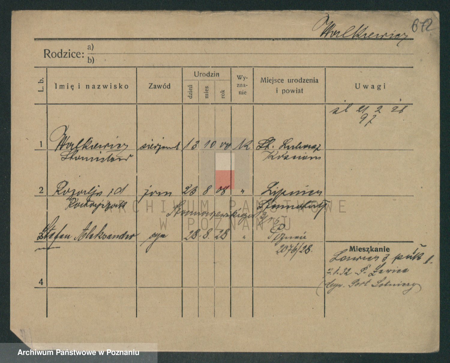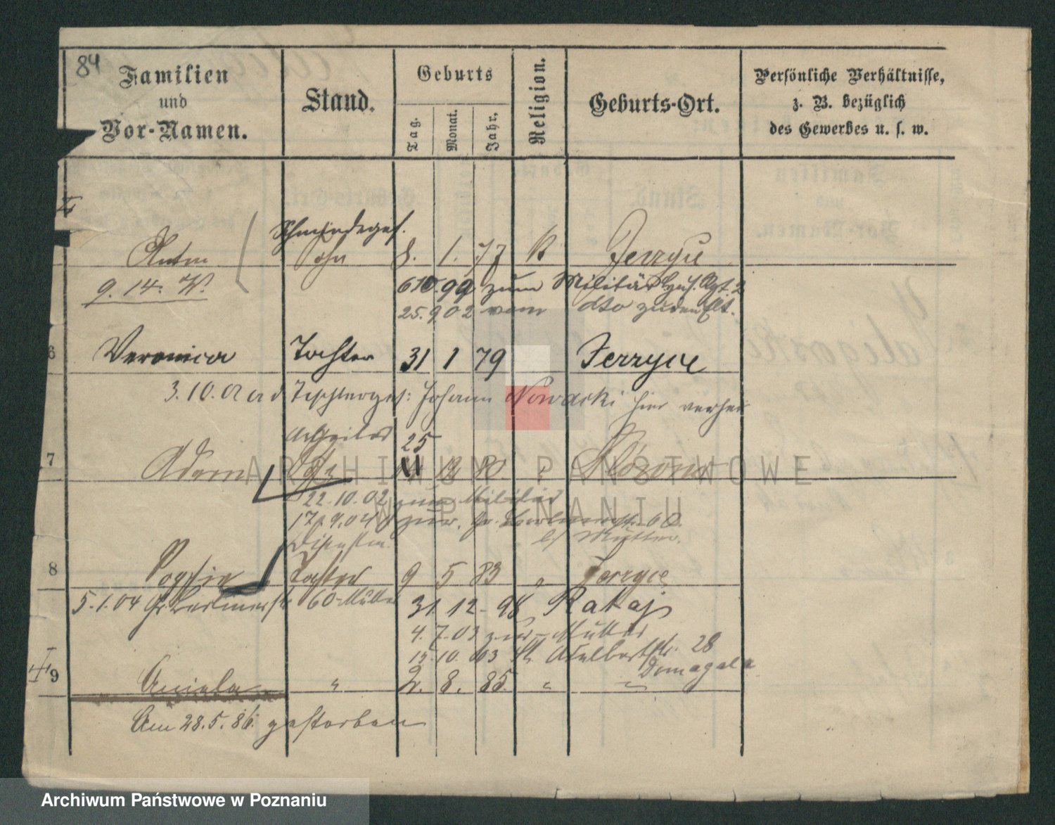 Podgląd karty osobowej dostępny jest po kliknięciu na nazwisko lub ikonkę karty. Można dokonywać powiększenia (ikony na górze) lub przechodzić między kolejnymi skanami (strzałki po bokach).
