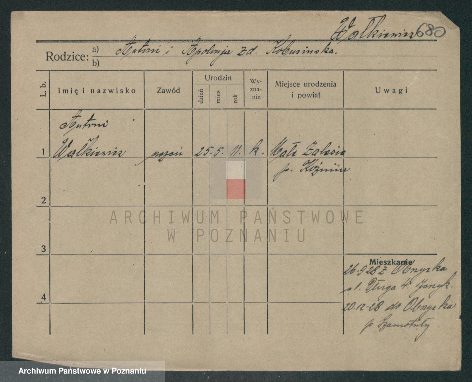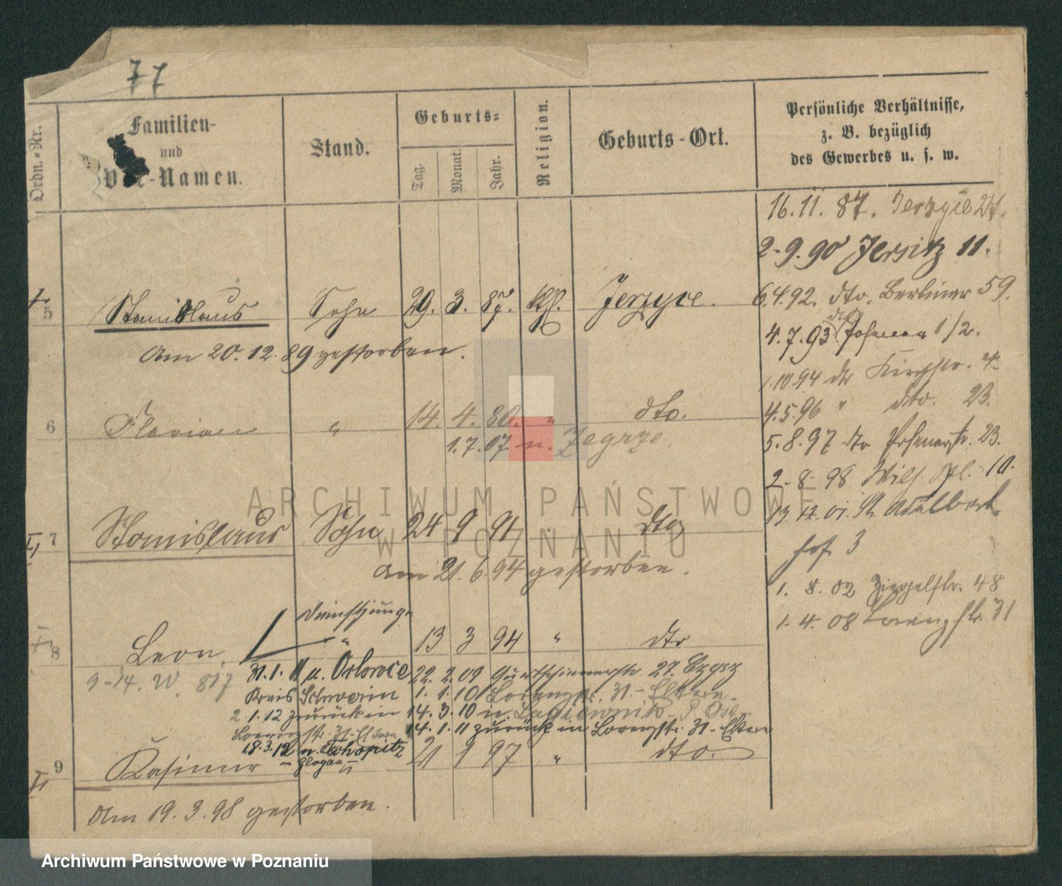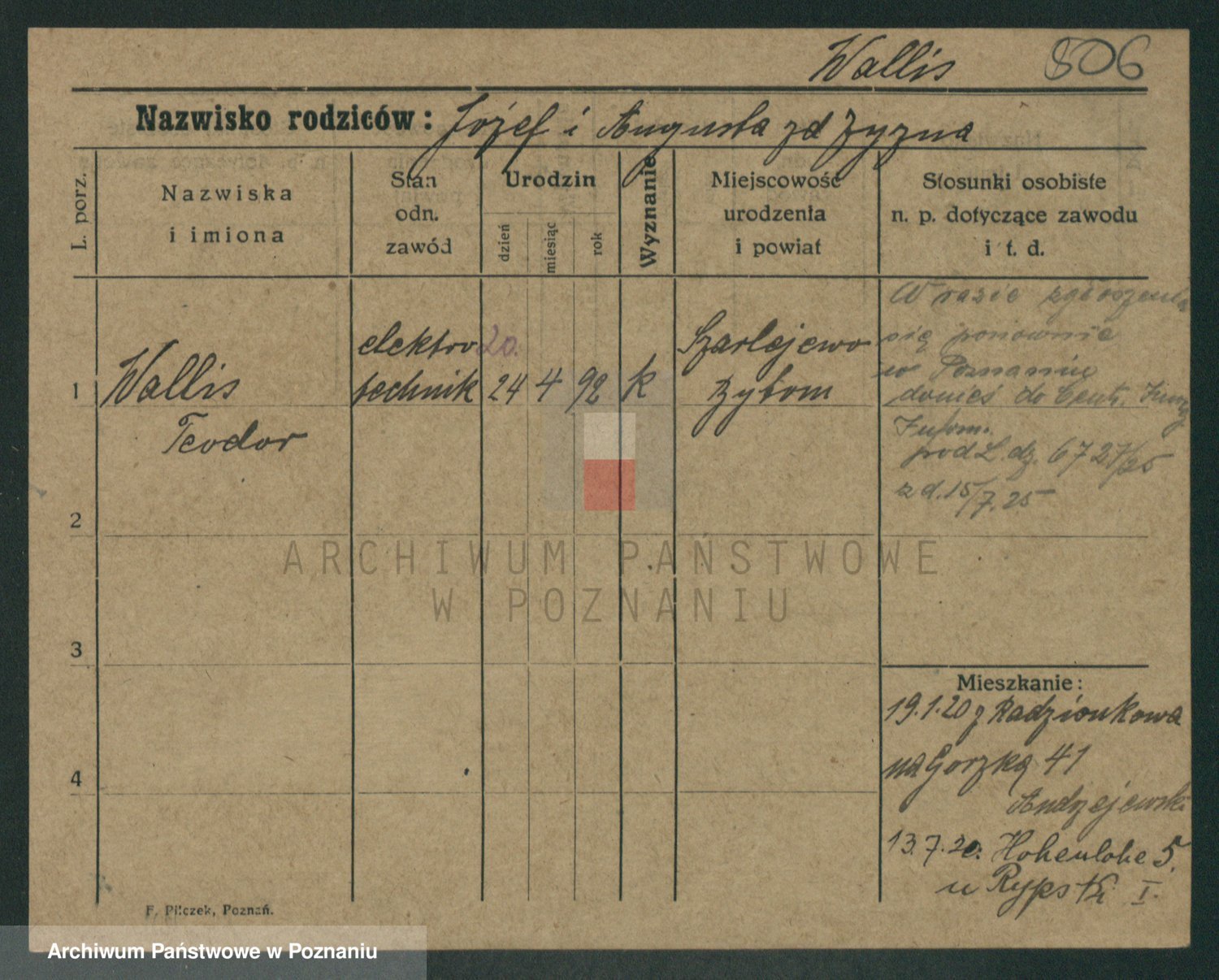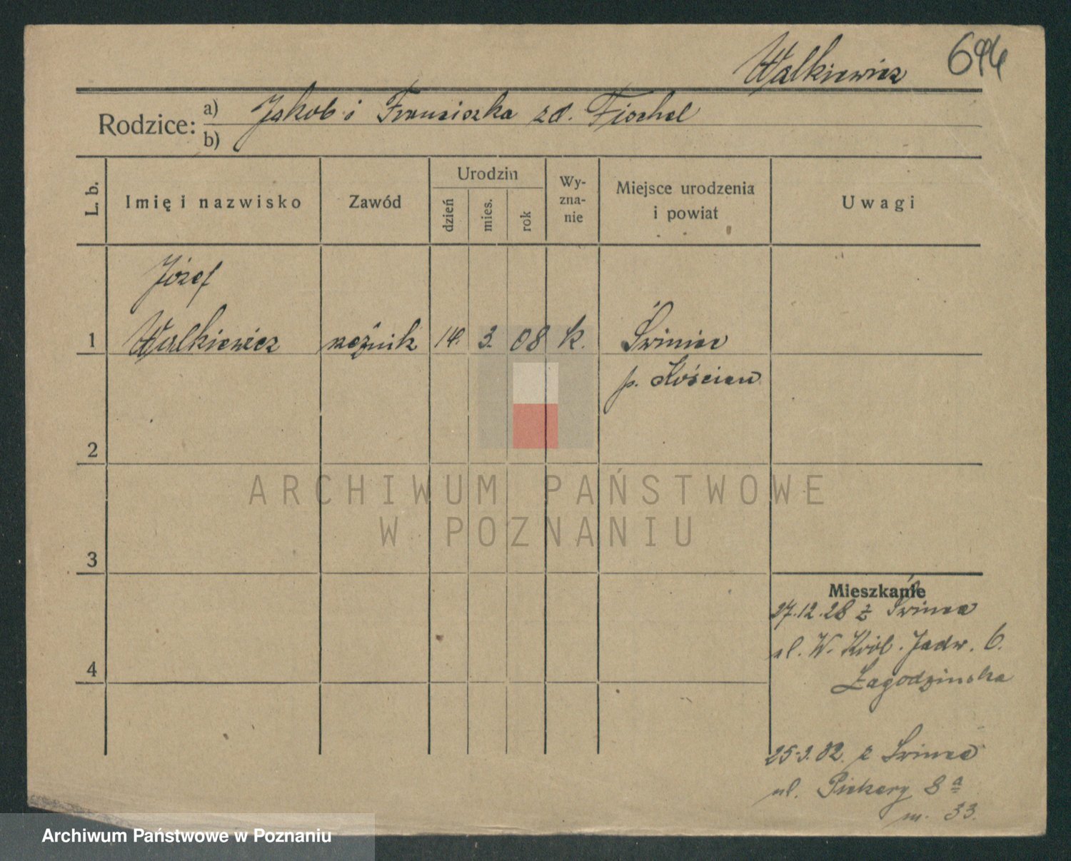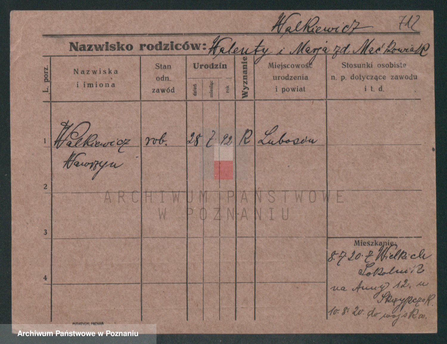 Podgląd karty osobowej dostępny jest po kliknięciu na nazwisko lub ikonkę karty. Można dokonywać powiększenia (ikony na górze) lub przechodzić między kolejnymi skanami (strzałki po bokach).