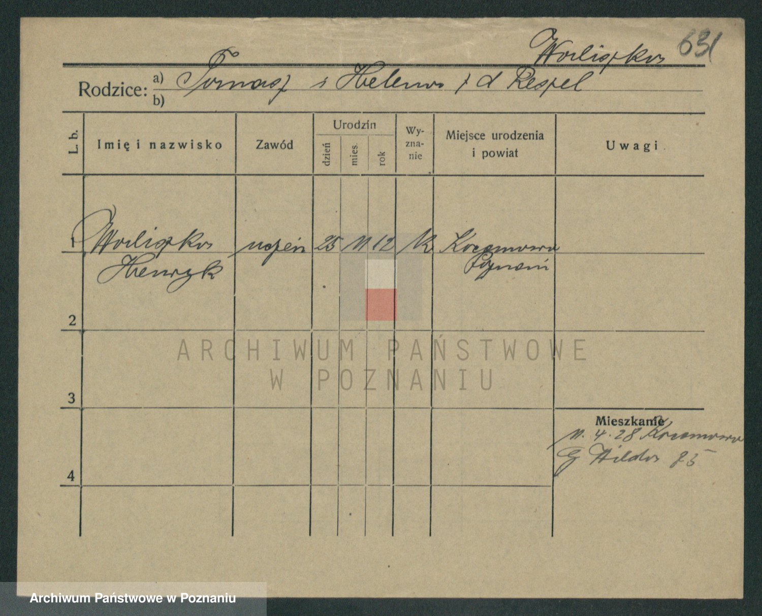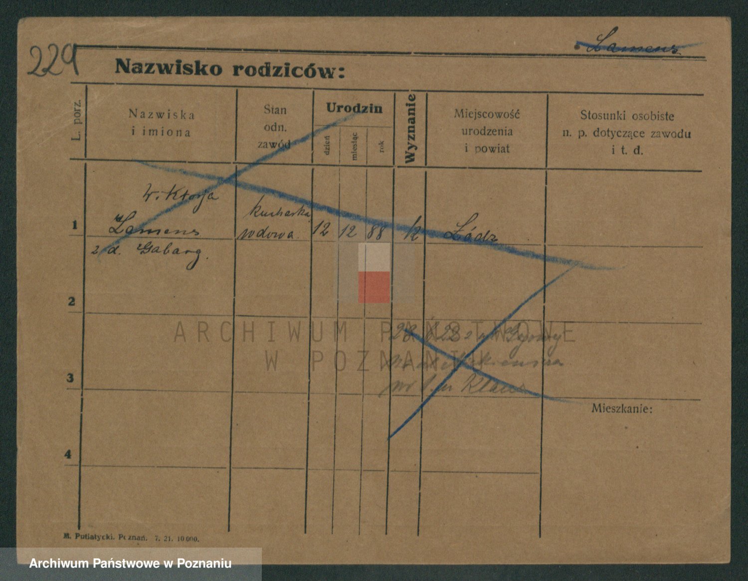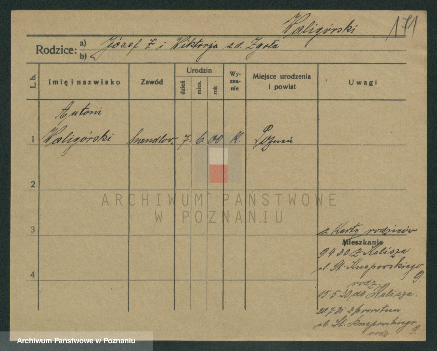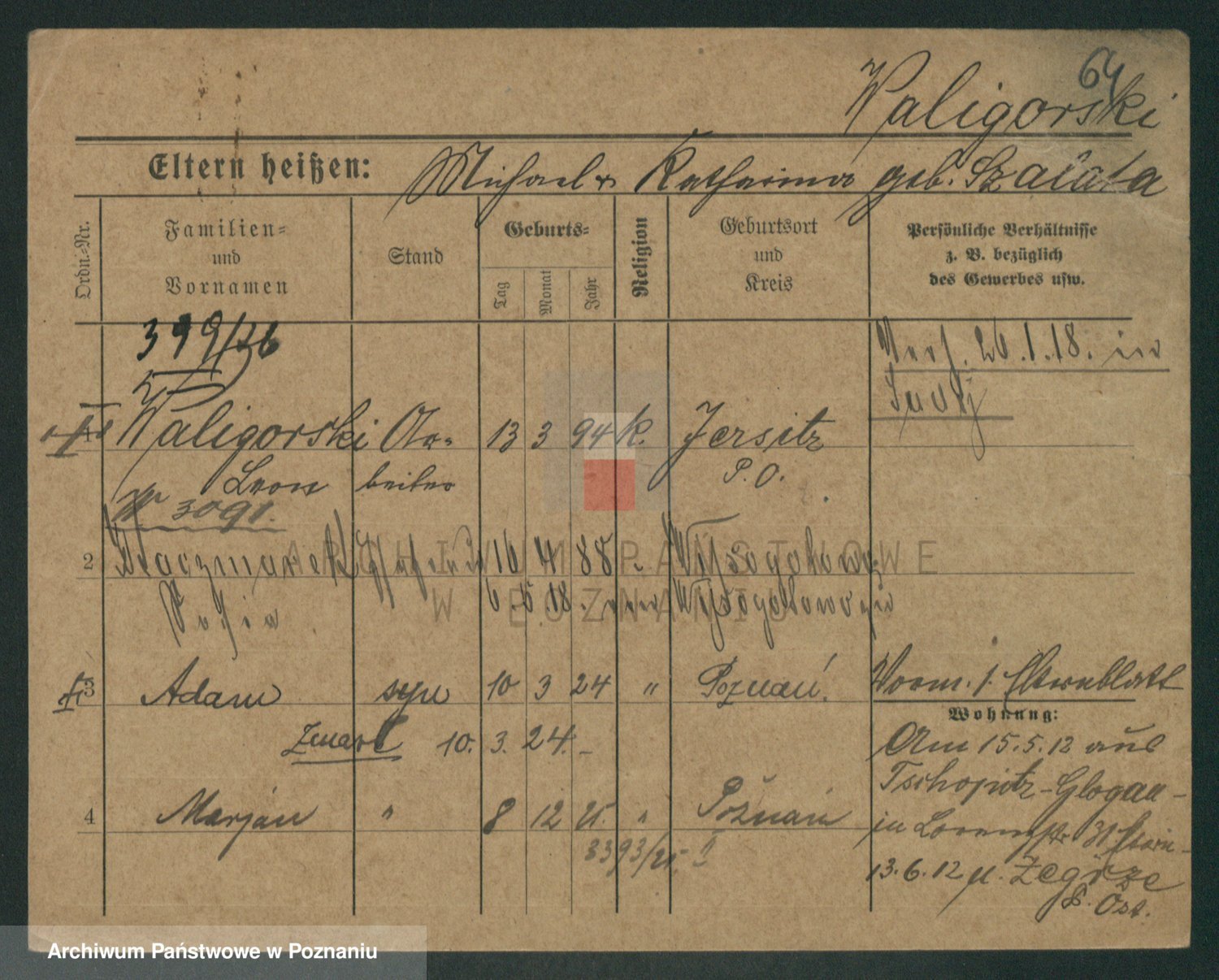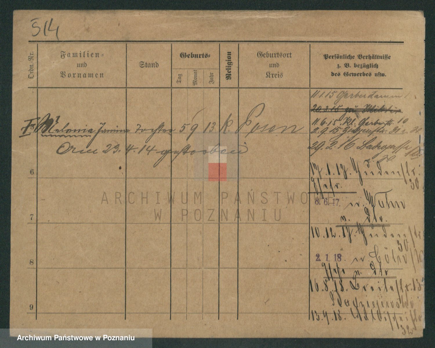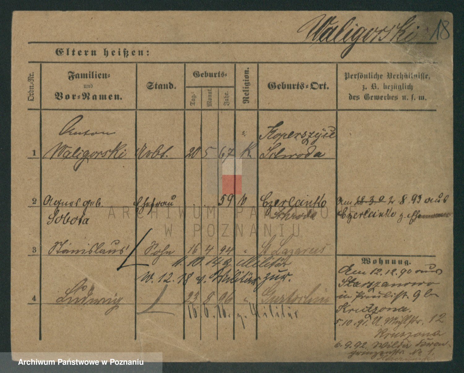 Podgląd karty osobowej dostępny jest po kliknięciu na nazwisko lub ikonkę karty. Można dokonywać powiększenia (ikony na górze) lub przechodzić między kolejnymi skanami (strzałki po bokach).