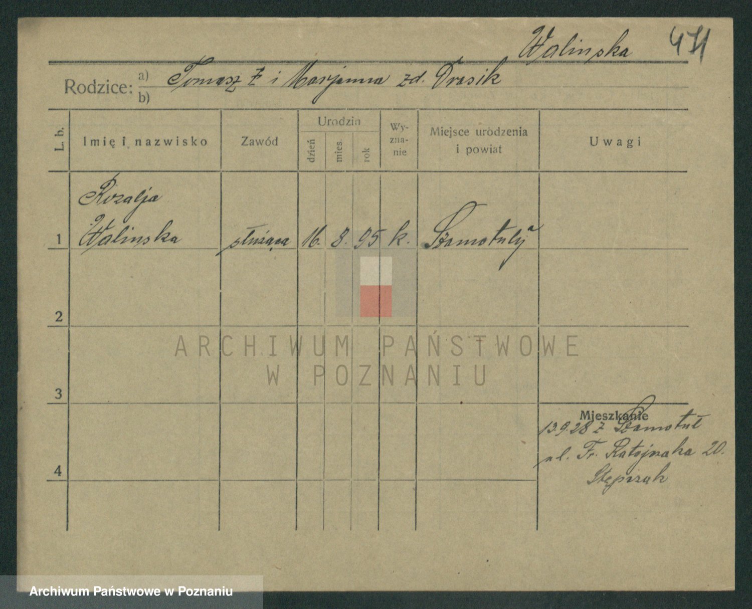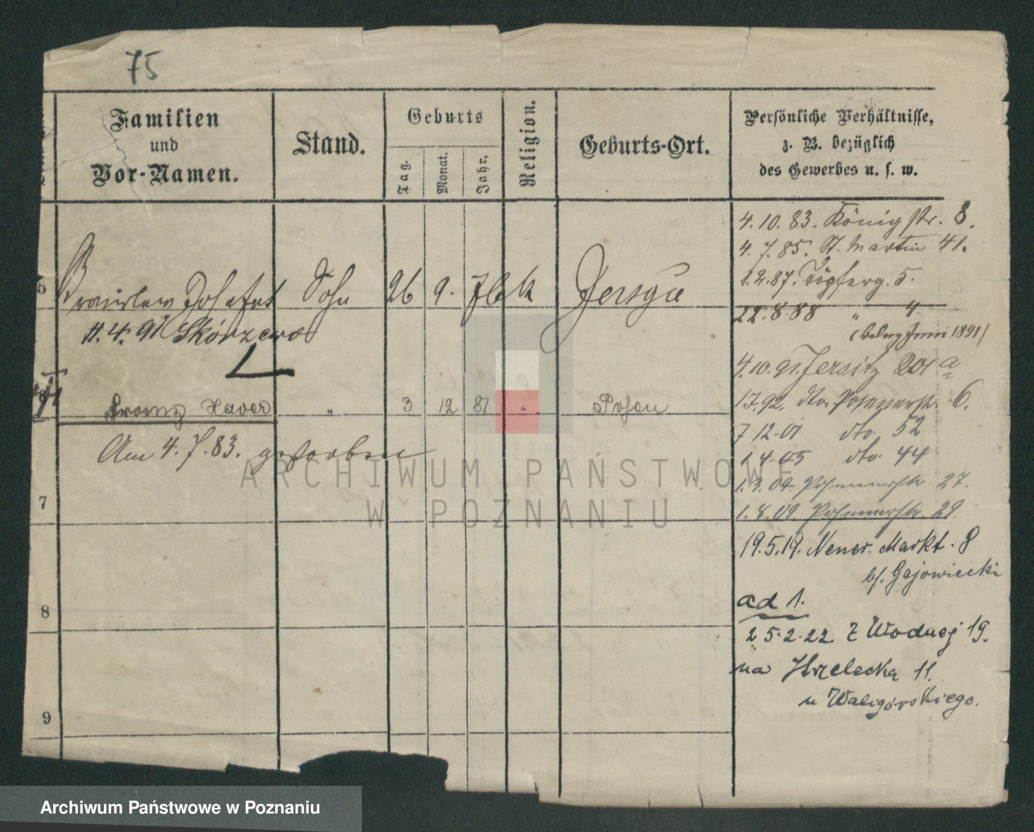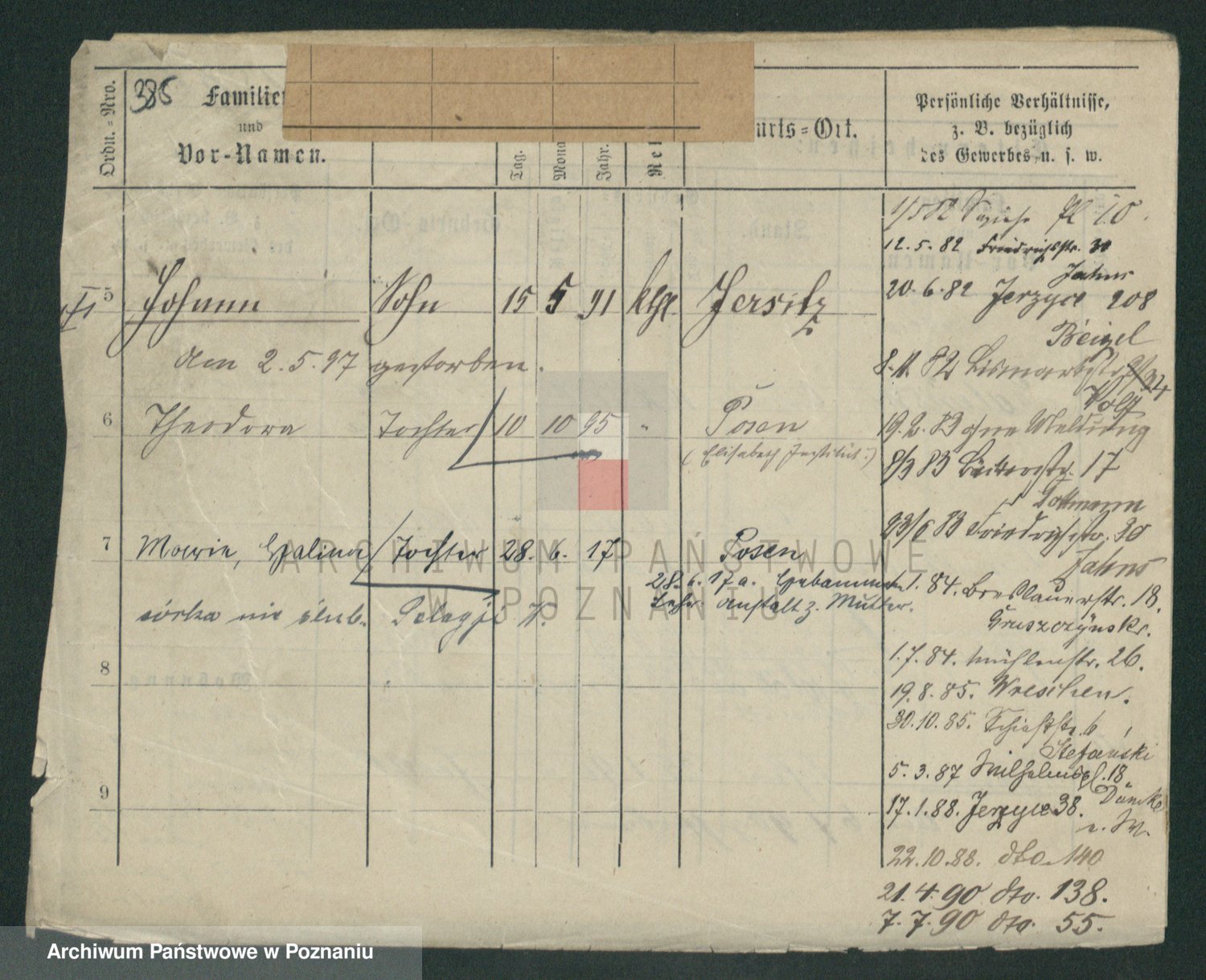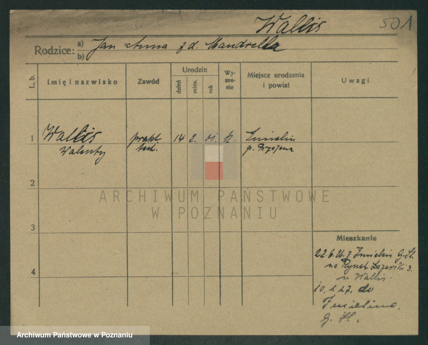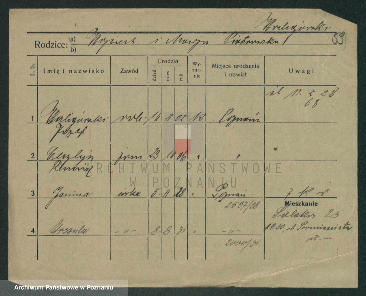 Podgląd karty osobowej dostępny jest po kliknięciu na nazwisko lub ikonkę karty. Można dokonywać powiększenia (ikony na górze) lub przechodzić między kolejnymi skanami (strzałki po bokach).
