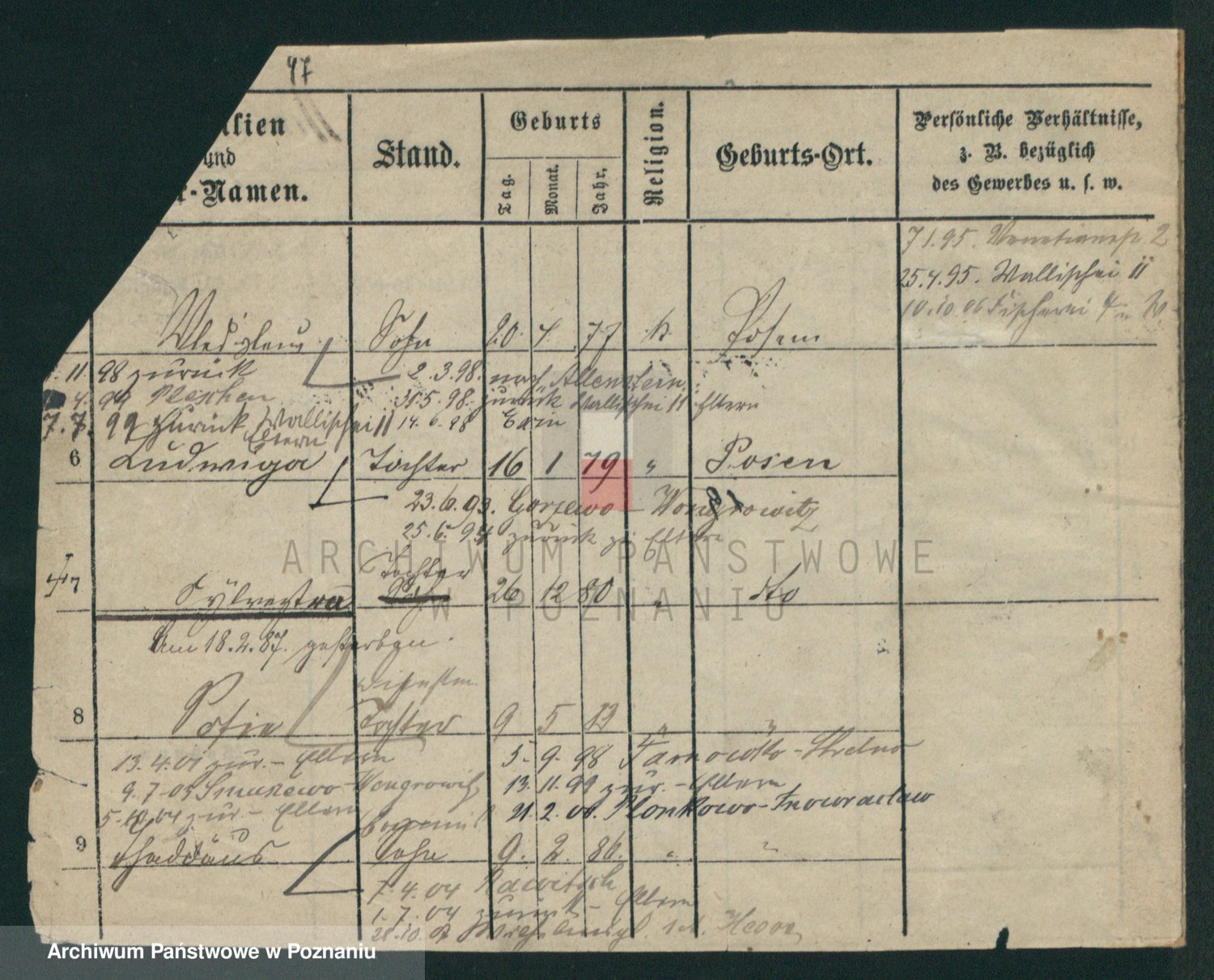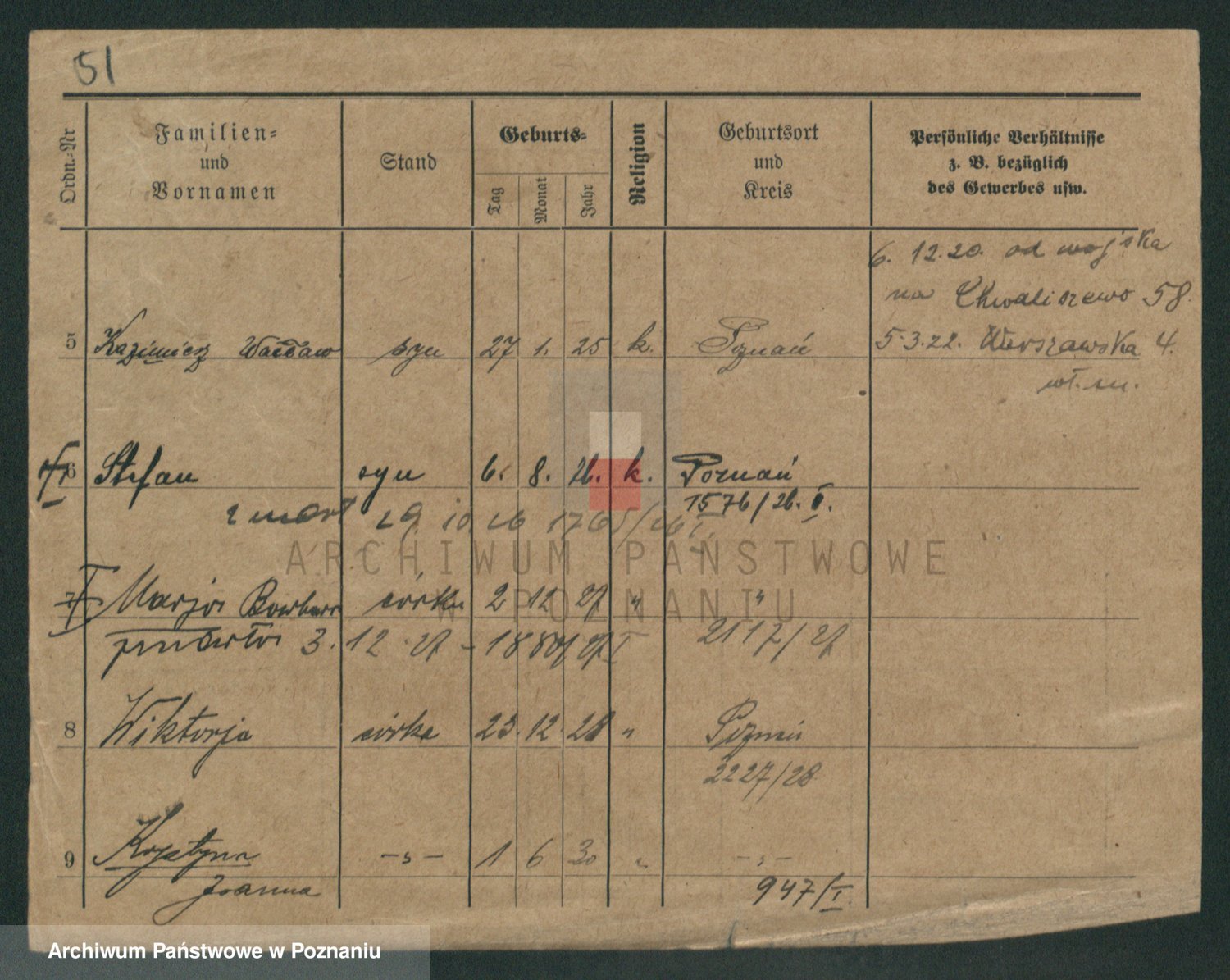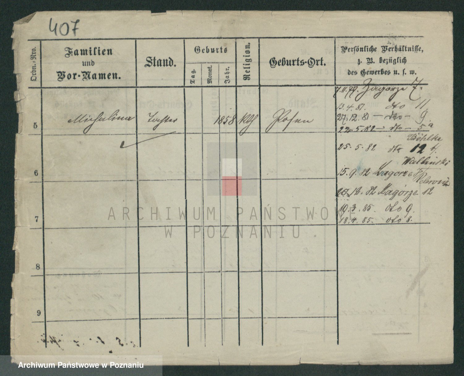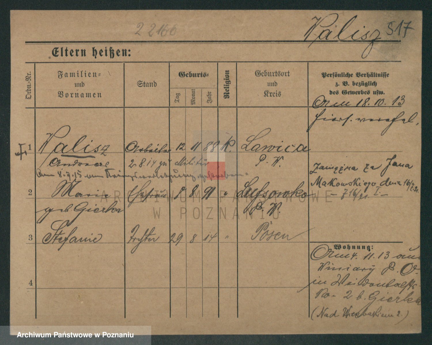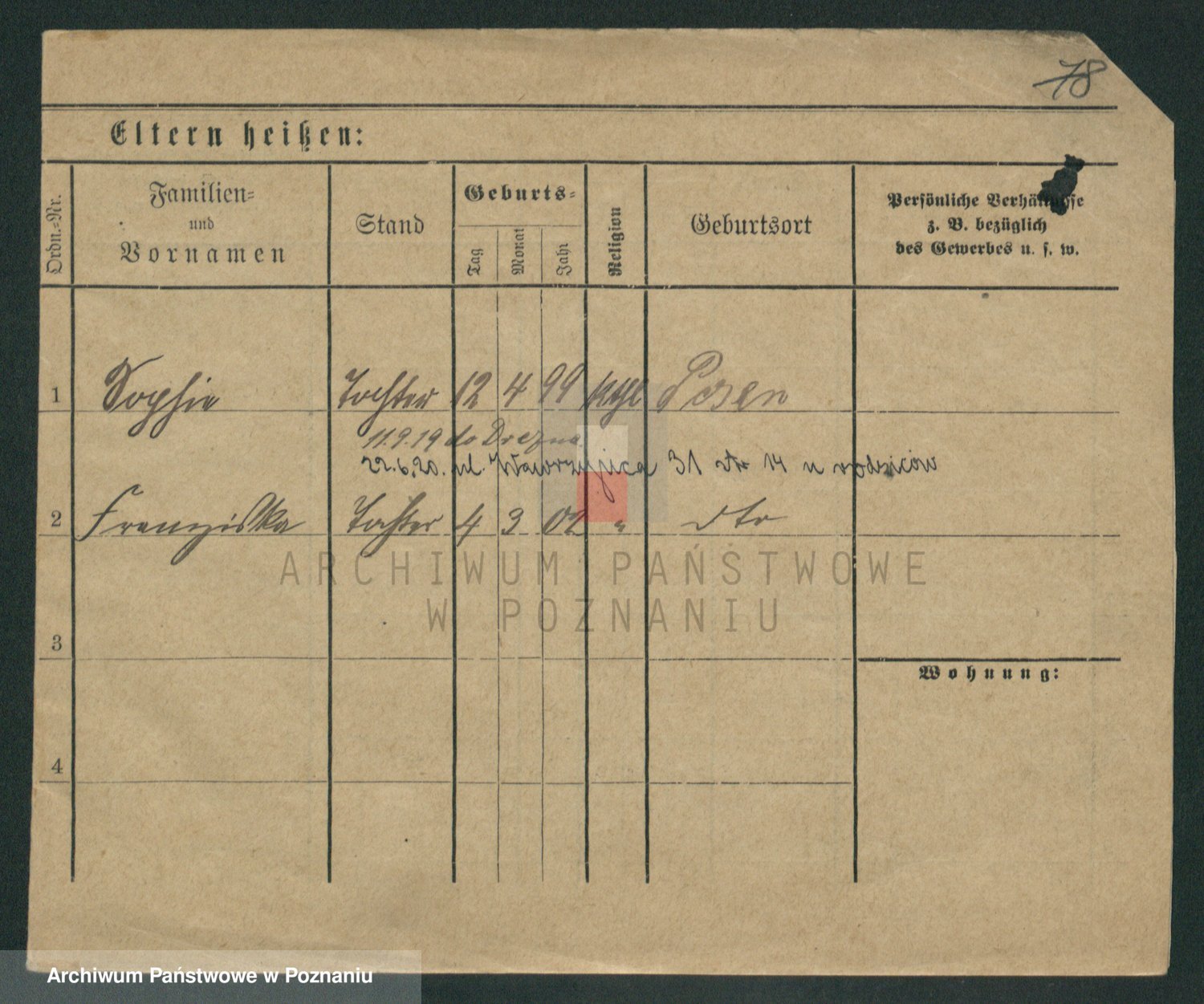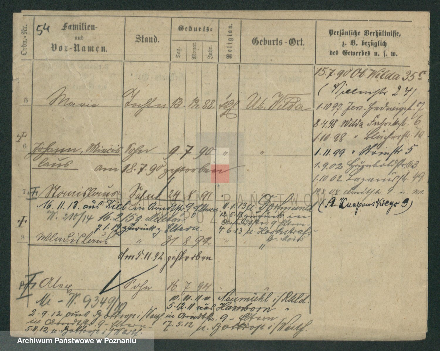 Podgląd karty osobowej dostępny jest po kliknięciu na nazwisko lub ikonkę karty. Można dokonywać powiększenia (ikony na górze) lub przechodzić między kolejnymi skanami (strzałki po bokach).