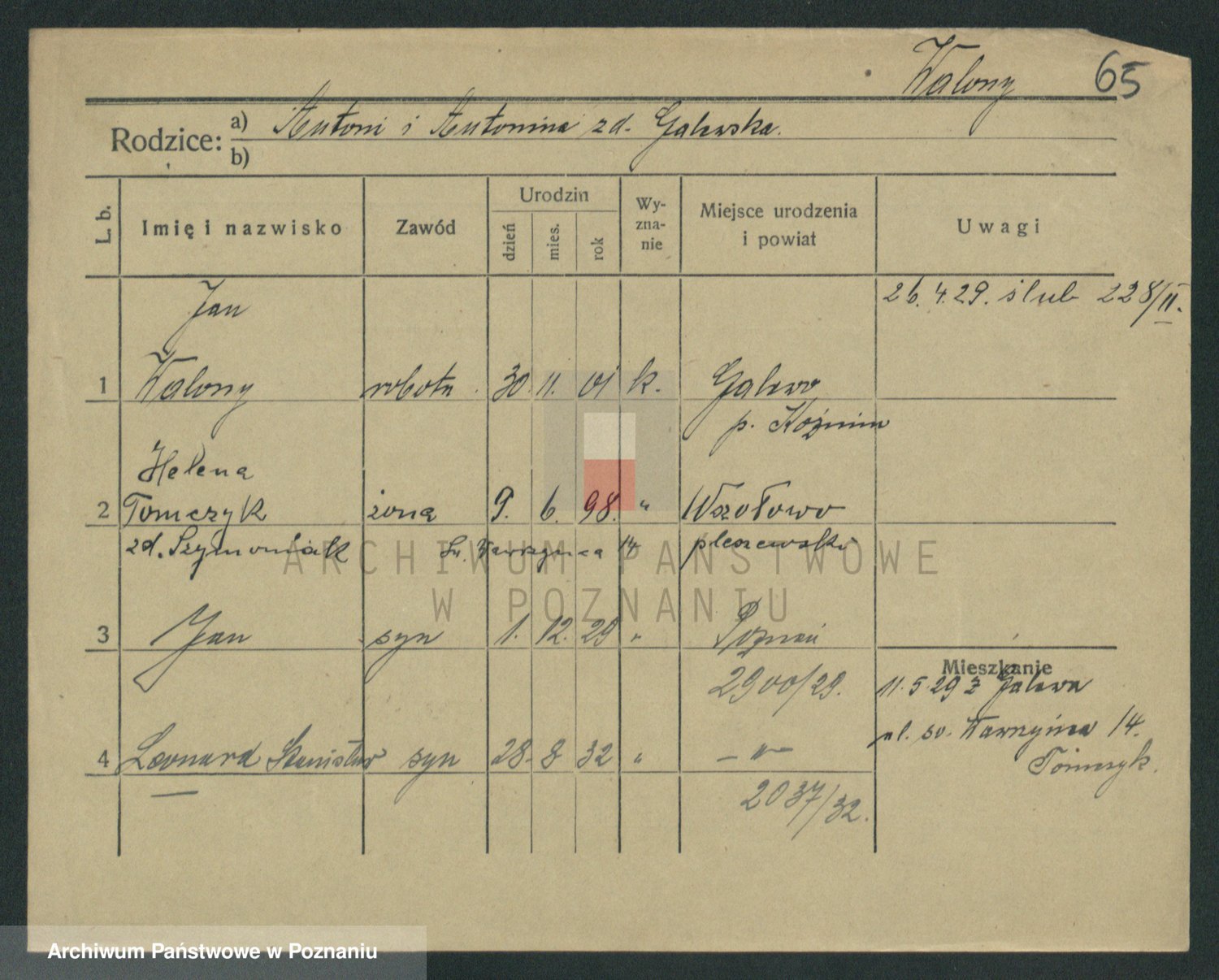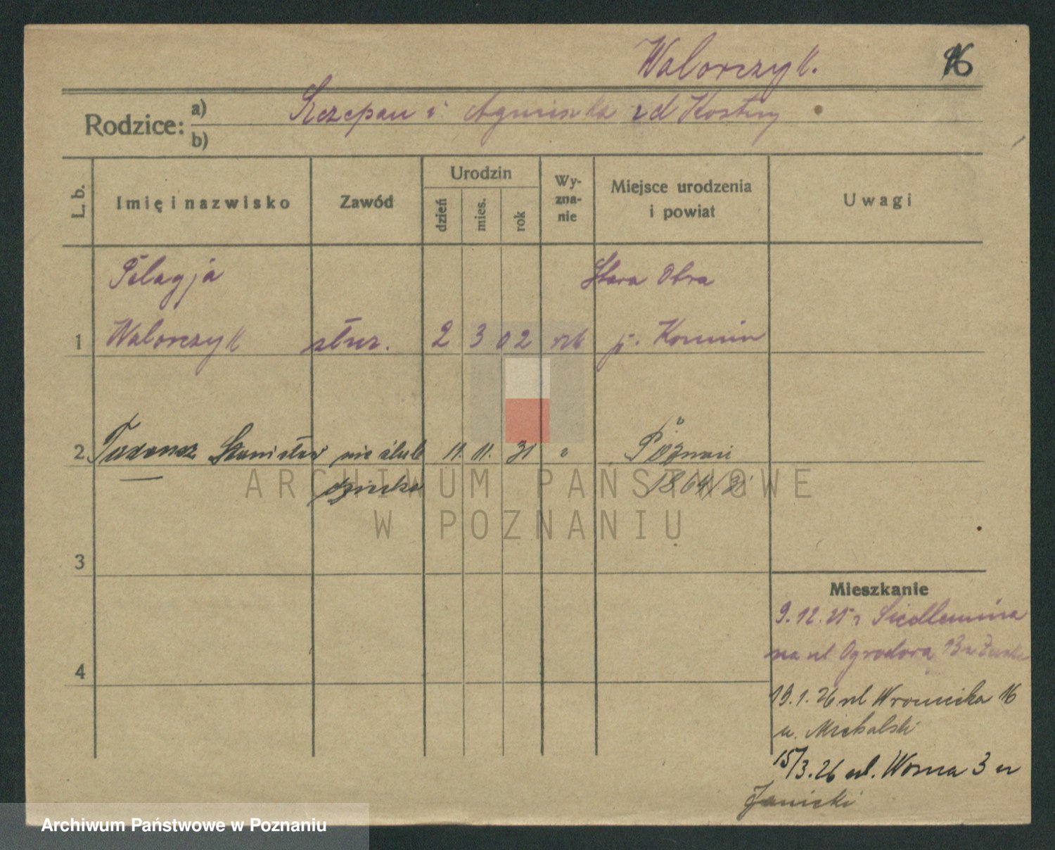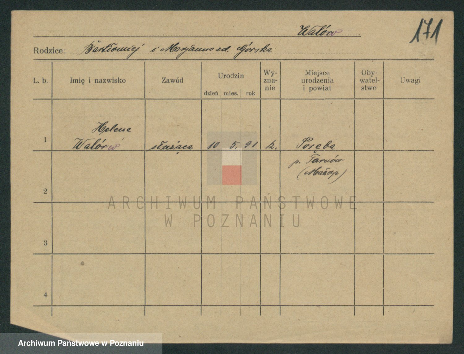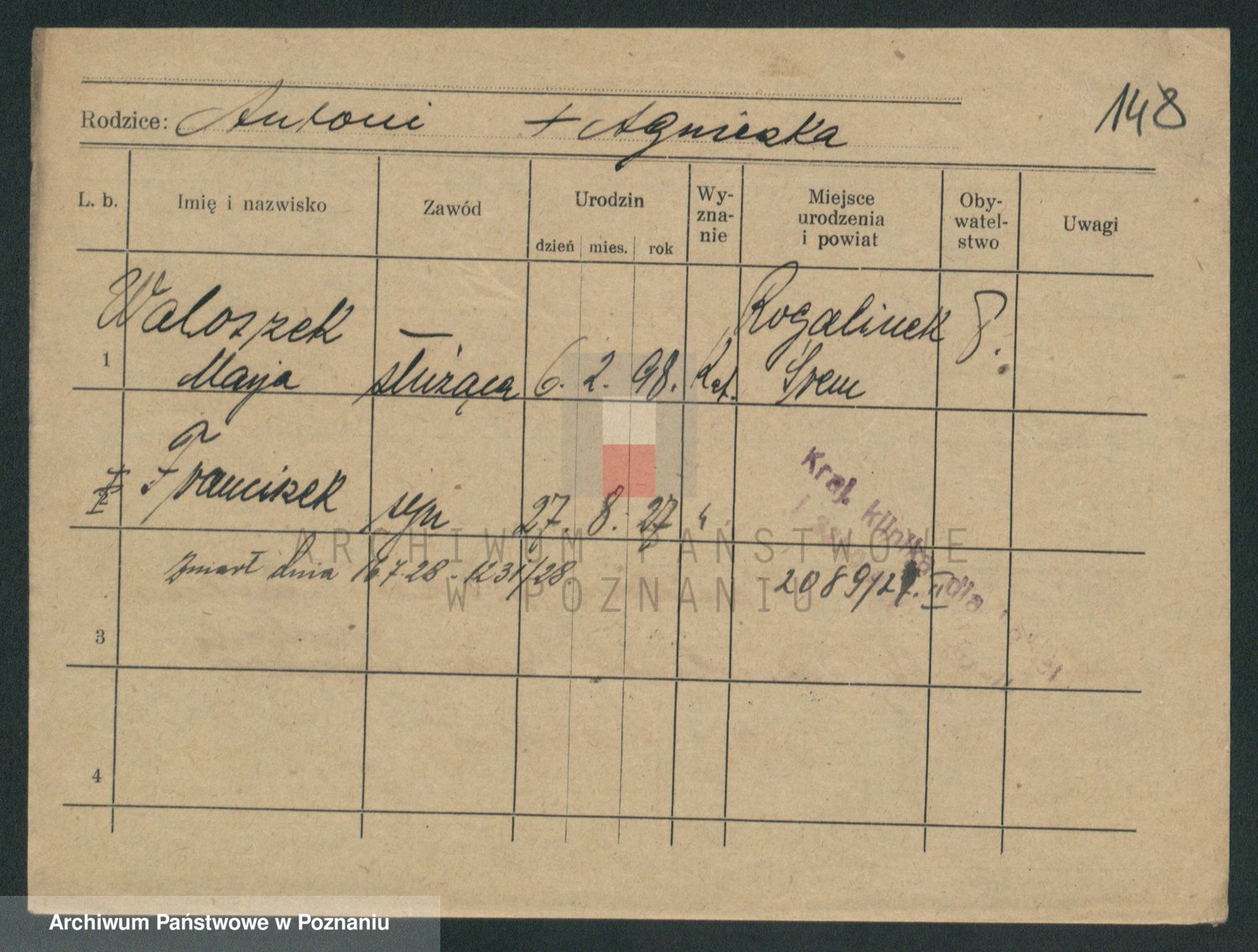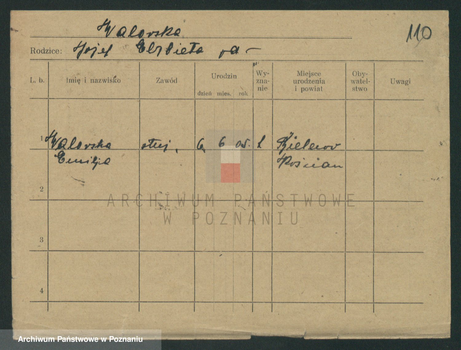 Podgląd karty osobowej dostępny jest po kliknięciu na nazwisko lub ikonkę karty. Można dokonywać powiększenia (ikony na górze) lub przechodzić między kolejnymi skanami (strzałki po bokach).