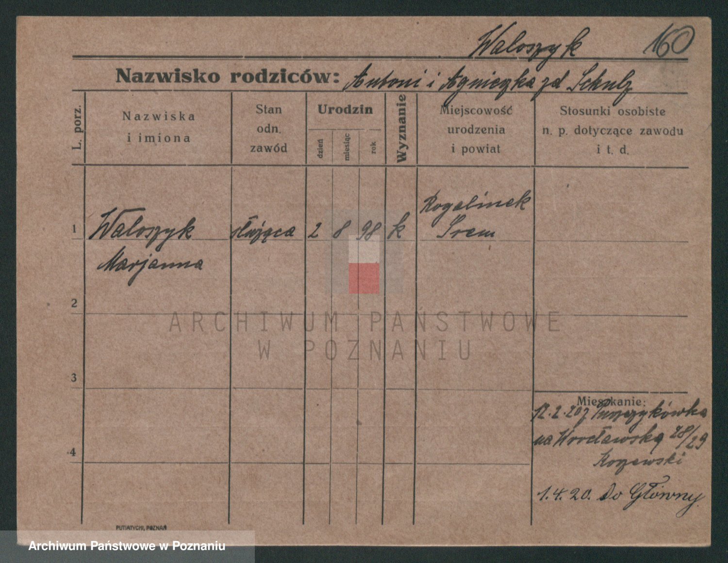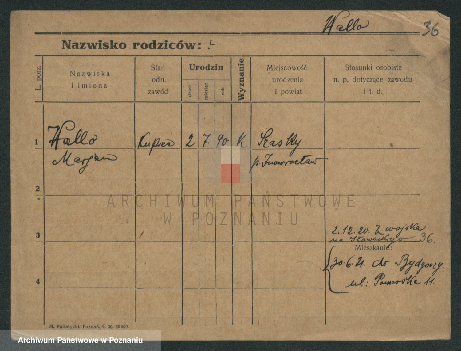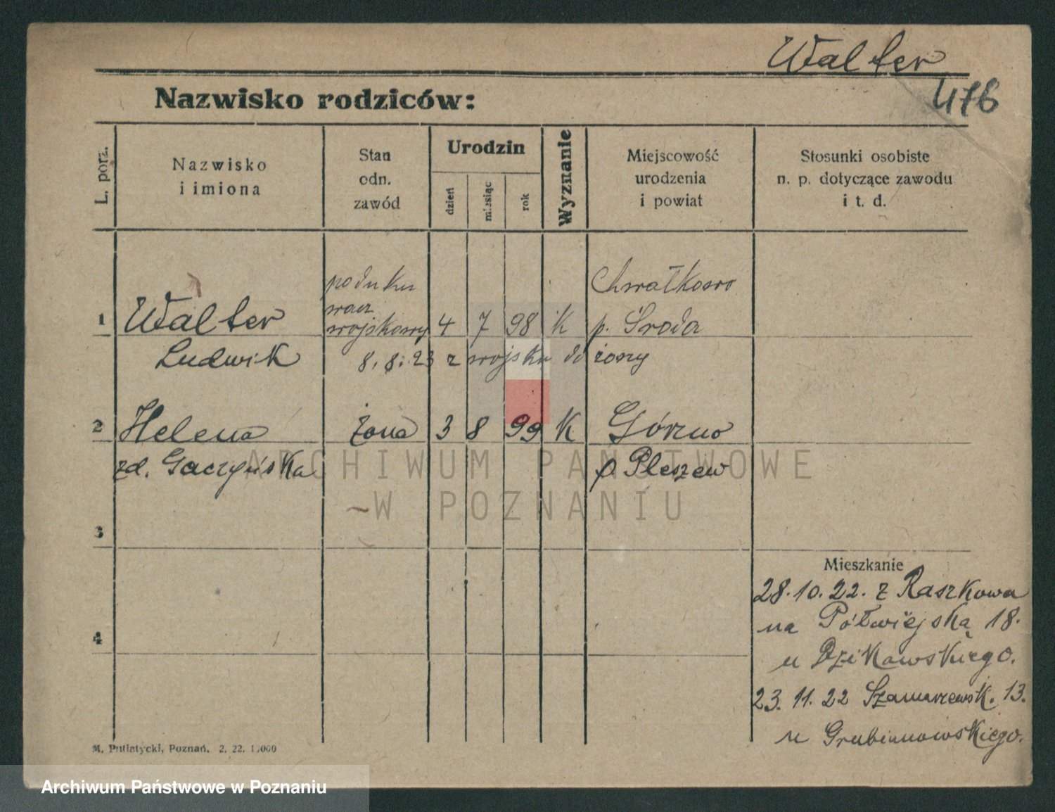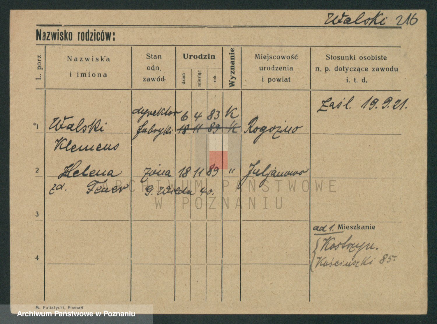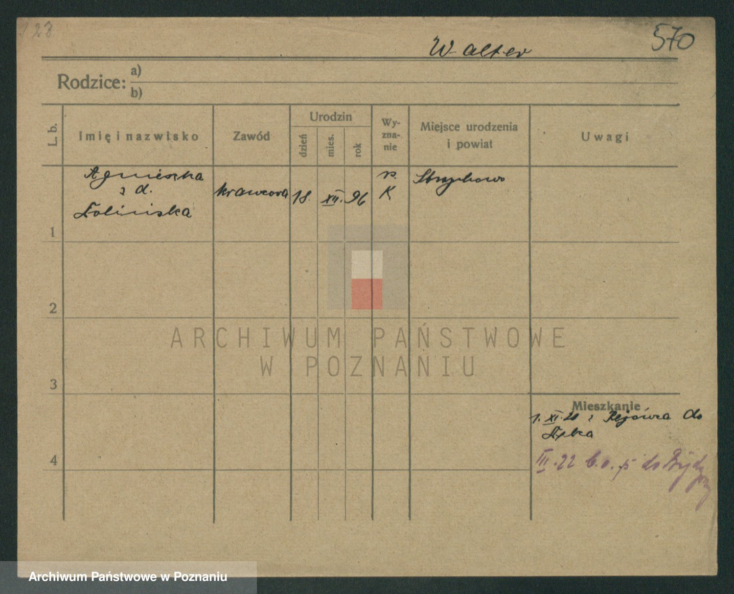 Podgląd karty osobowej dostępny jest po kliknięciu na nazwisko lub ikonkę karty. Można dokonywać powiększenia (ikony na górze) lub przechodzić między kolejnymi skanami (strzałki po bokach).