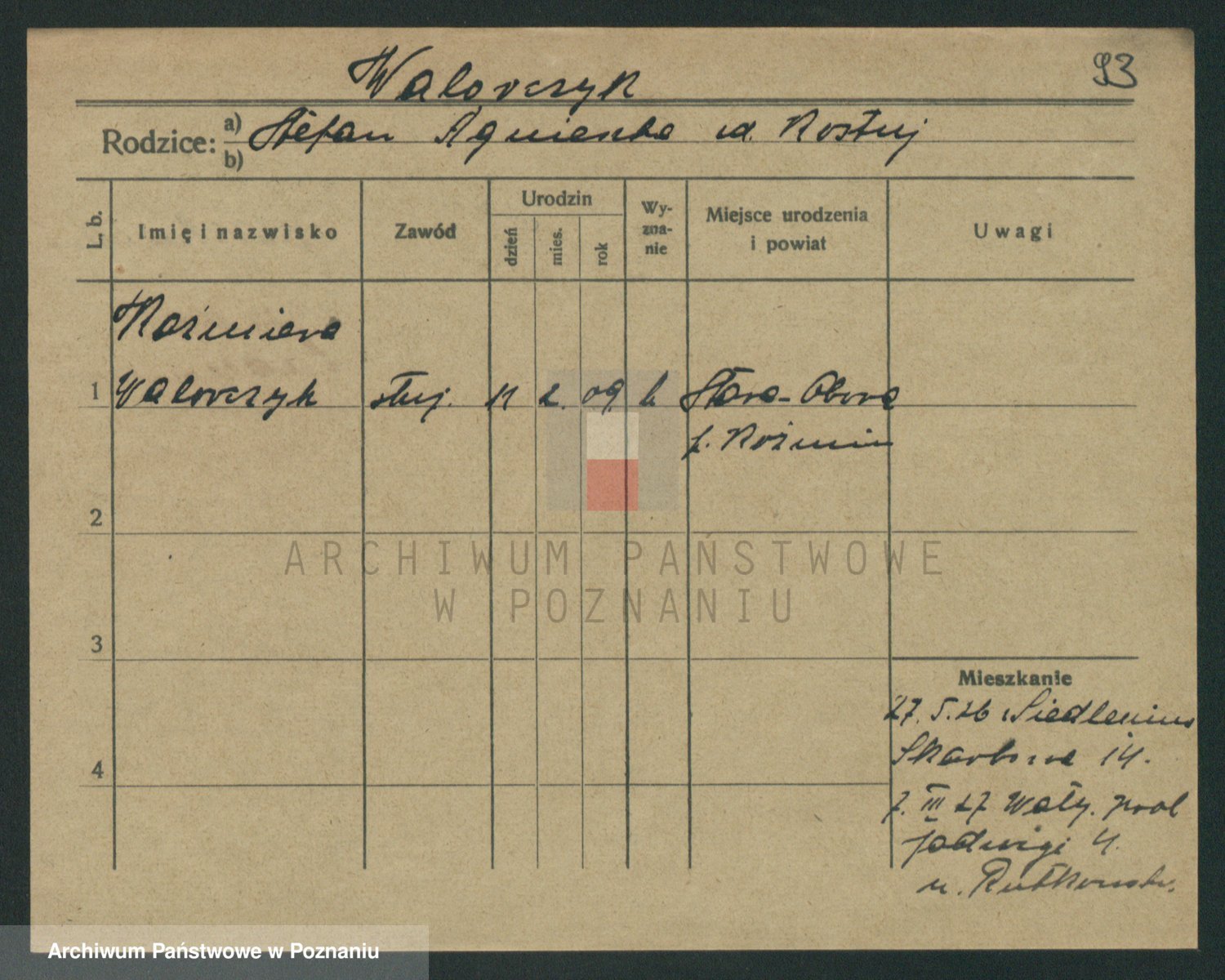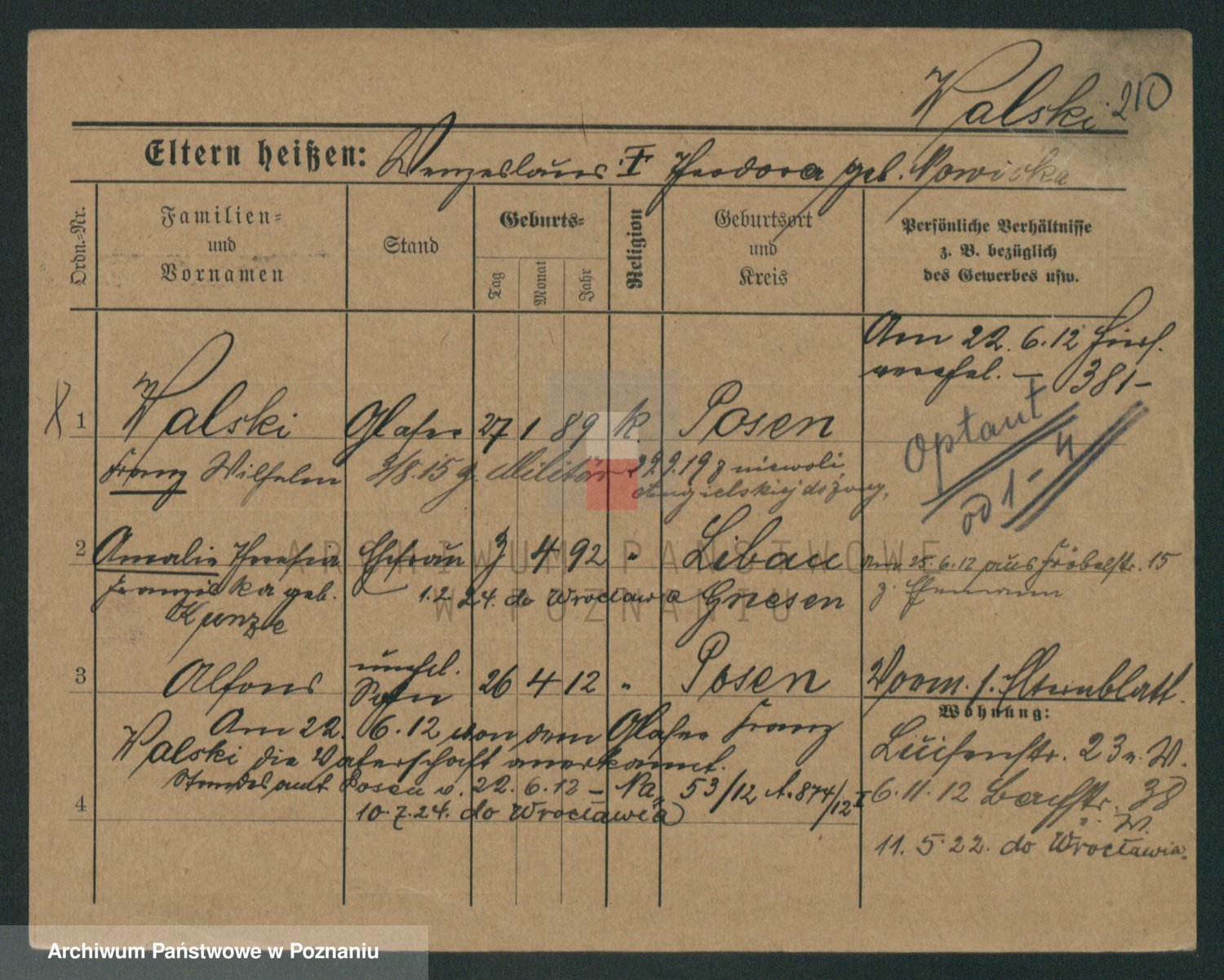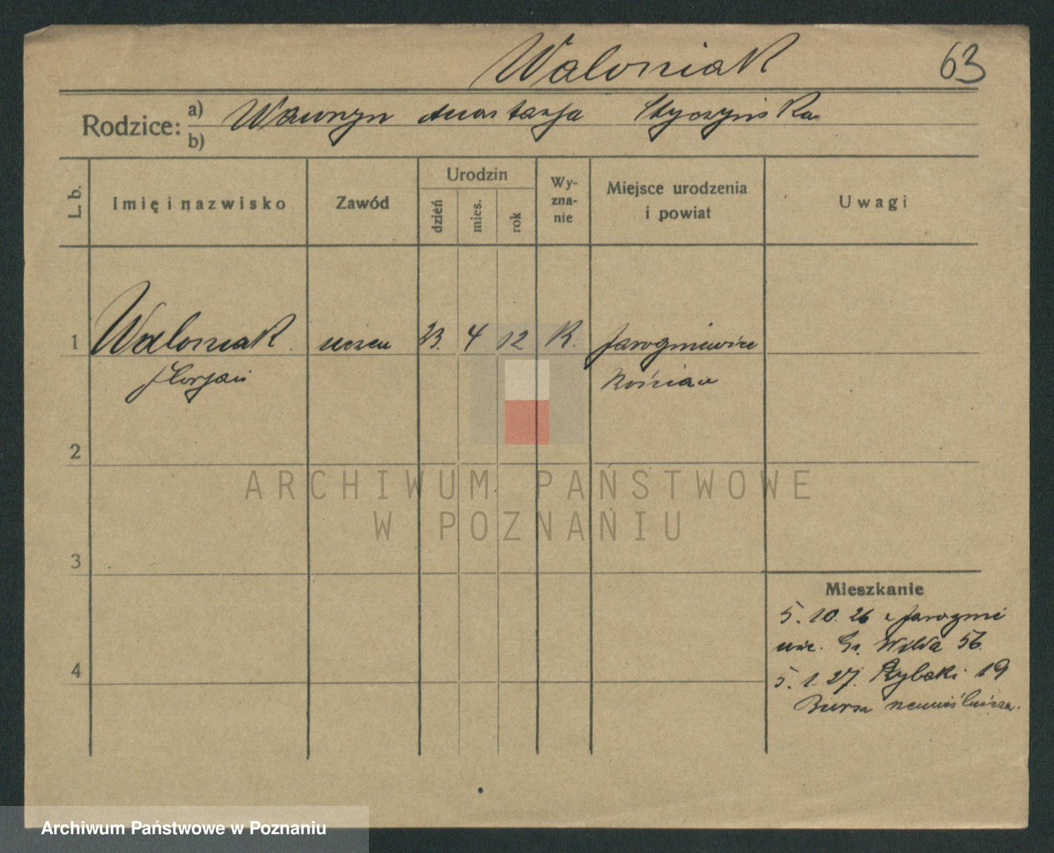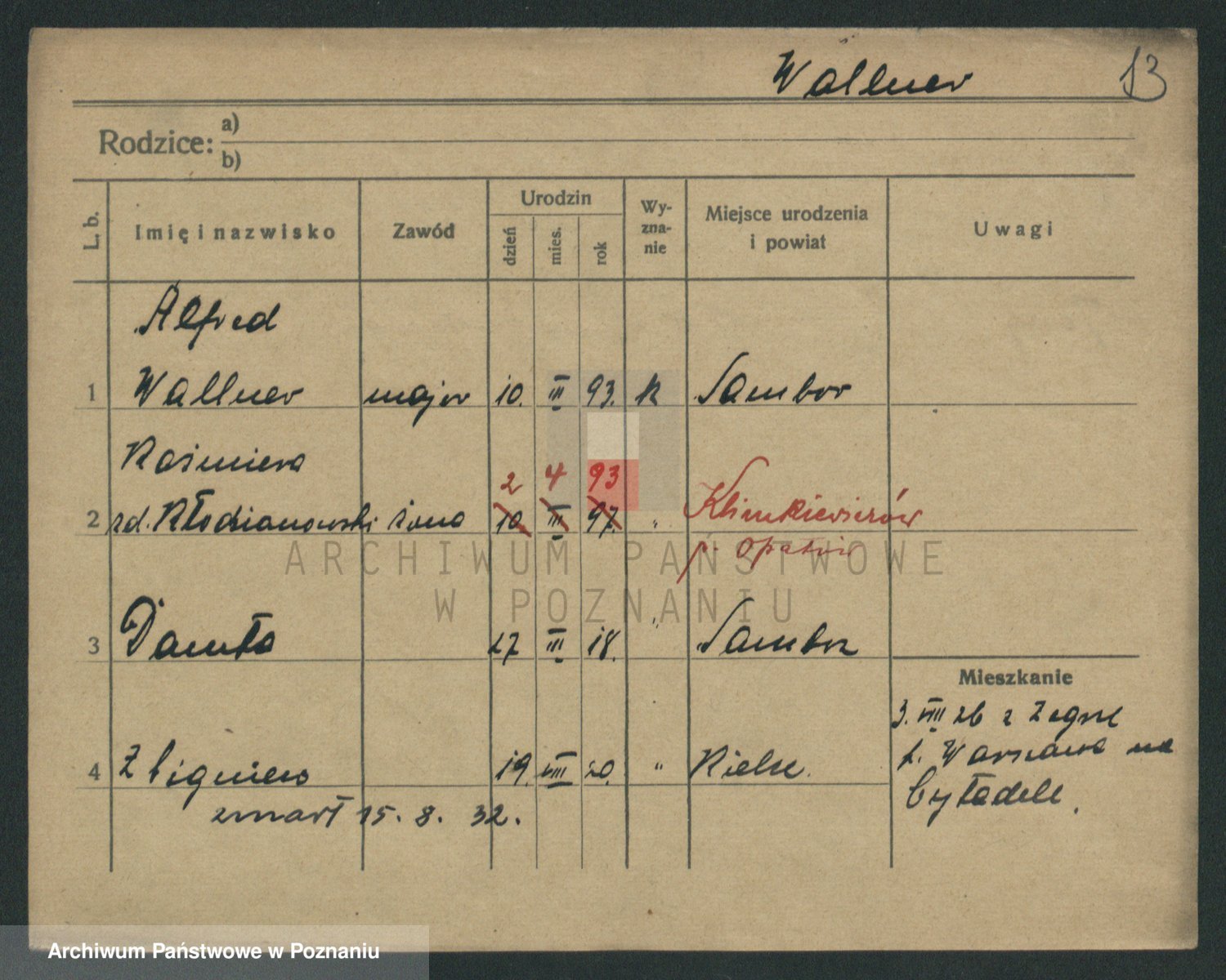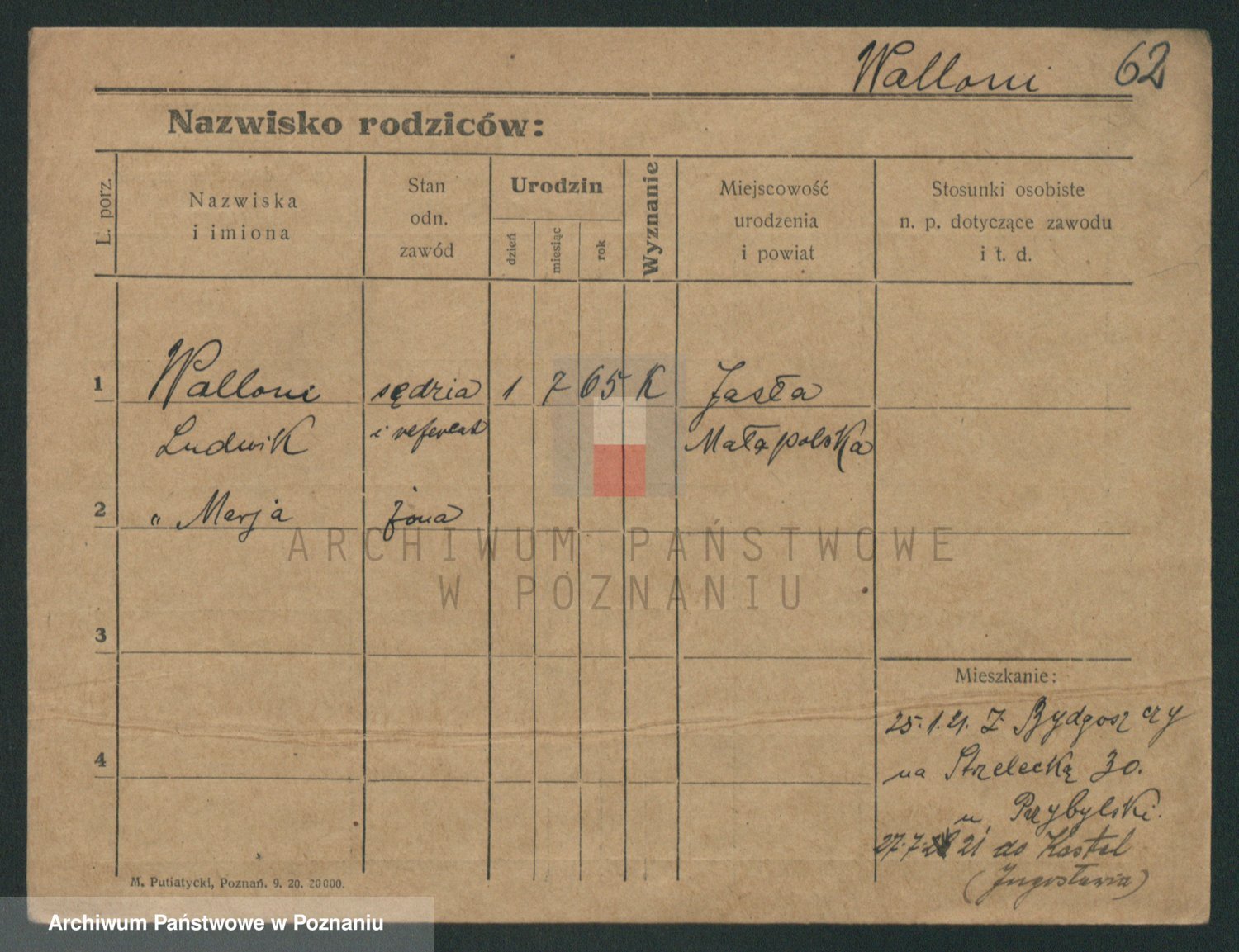 Podgląd karty osobowej dostępny jest po kliknięciu na nazwisko lub ikonkę karty. Można dokonywać powiększenia (ikony na górze) lub przechodzić między kolejnymi skanami (strzałki po bokach).