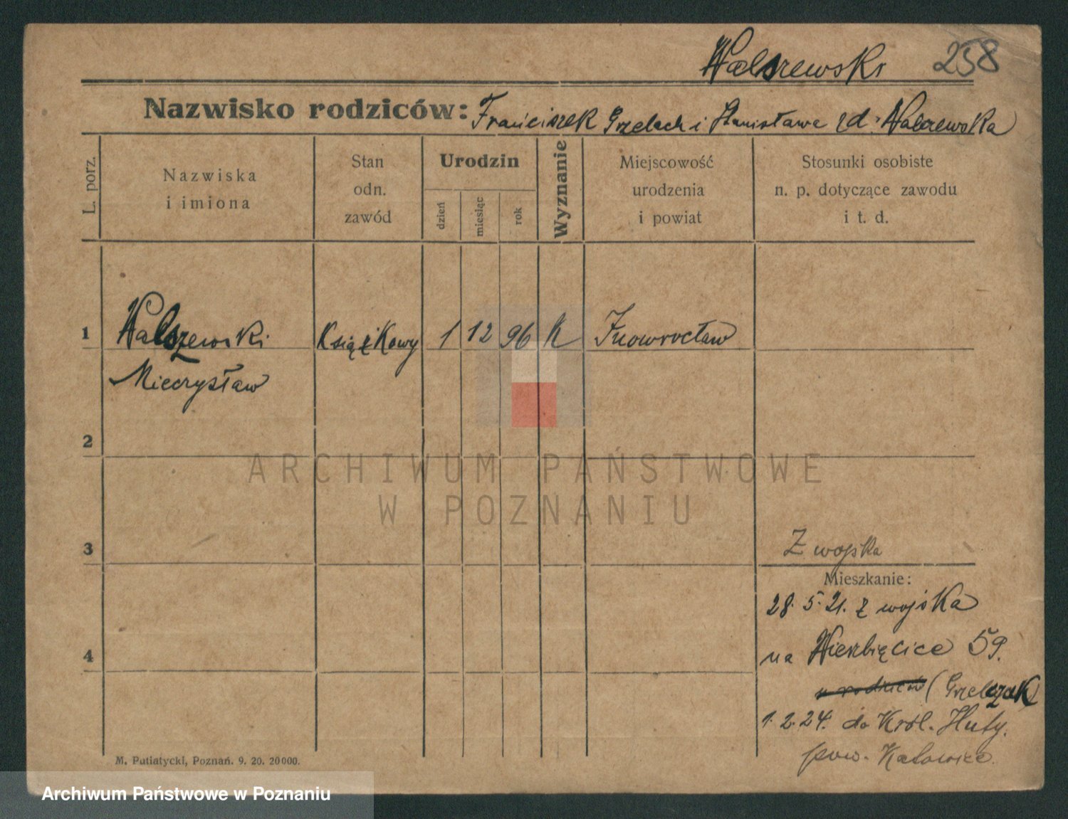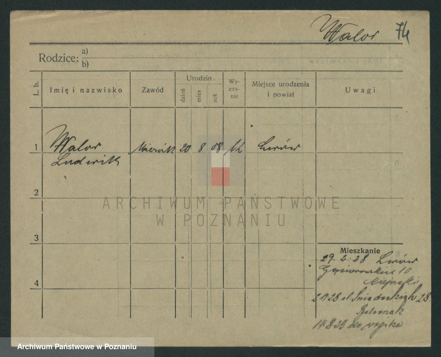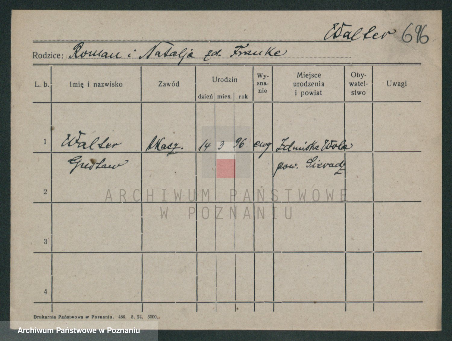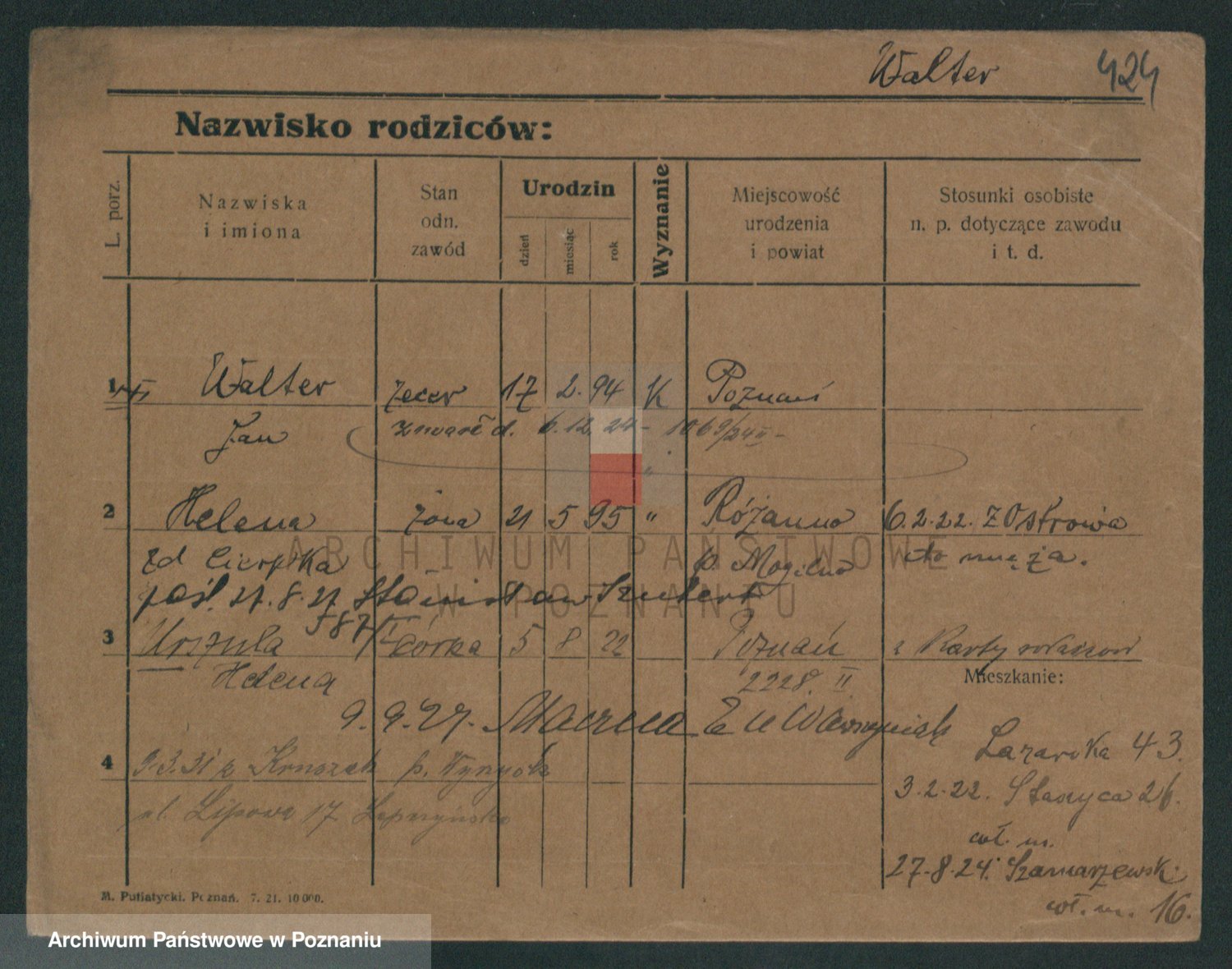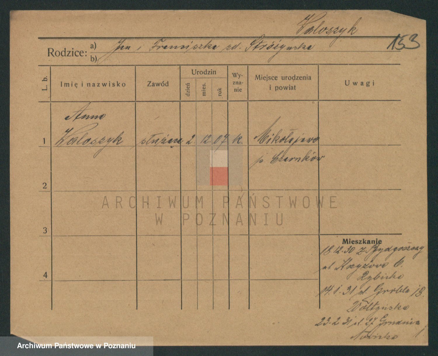 Podgląd karty osobowej dostępny jest po kliknięciu na nazwisko lub ikonkę karty. Można dokonywać powiększenia (ikony na górze) lub przechodzić między kolejnymi skanami (strzałki po bokach).