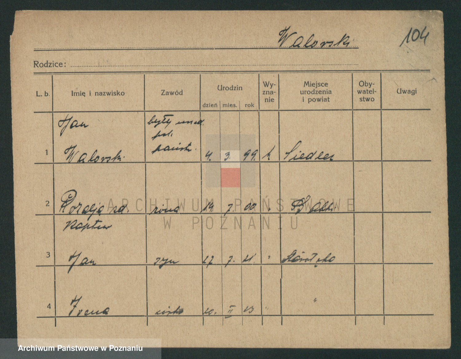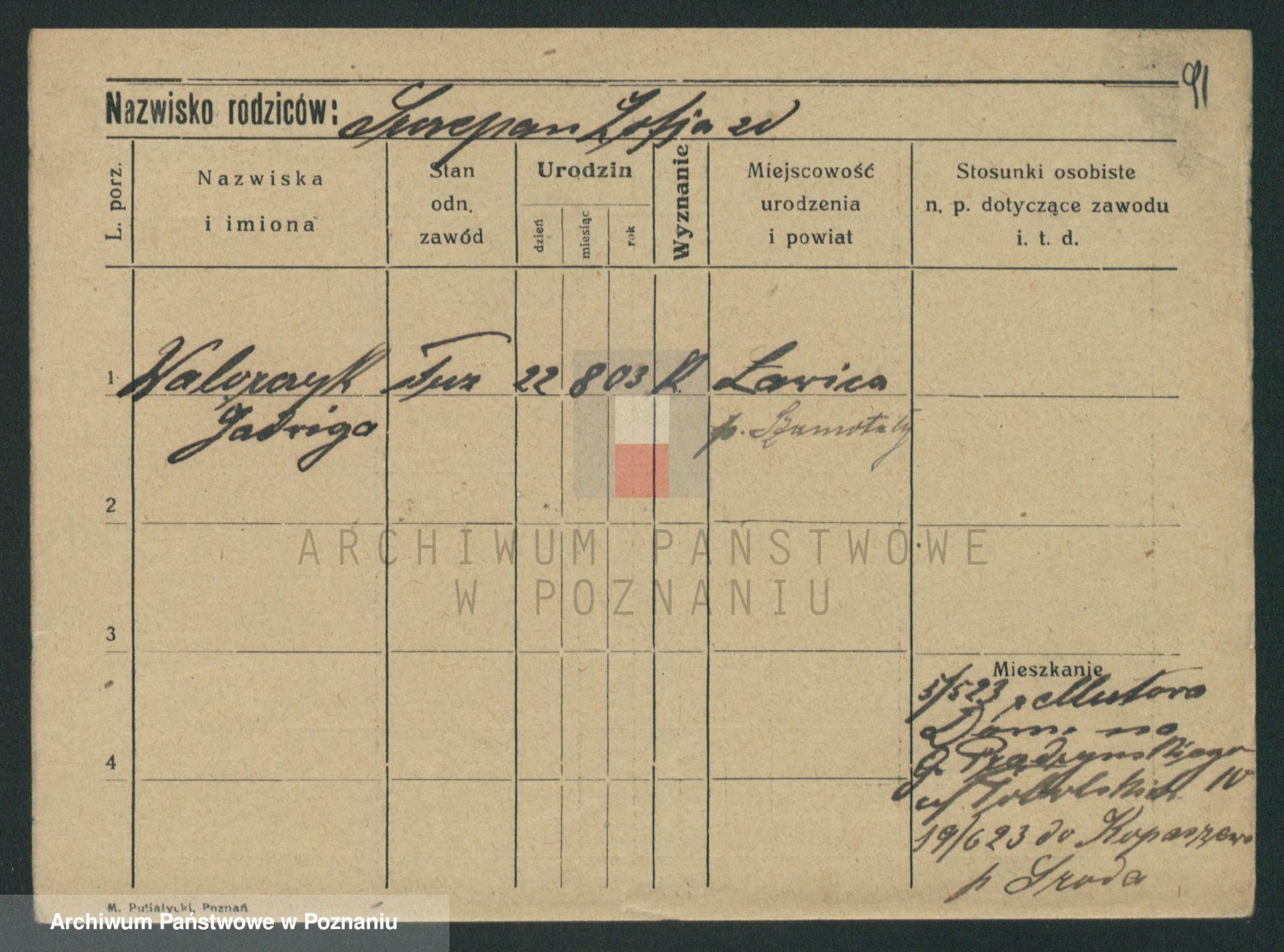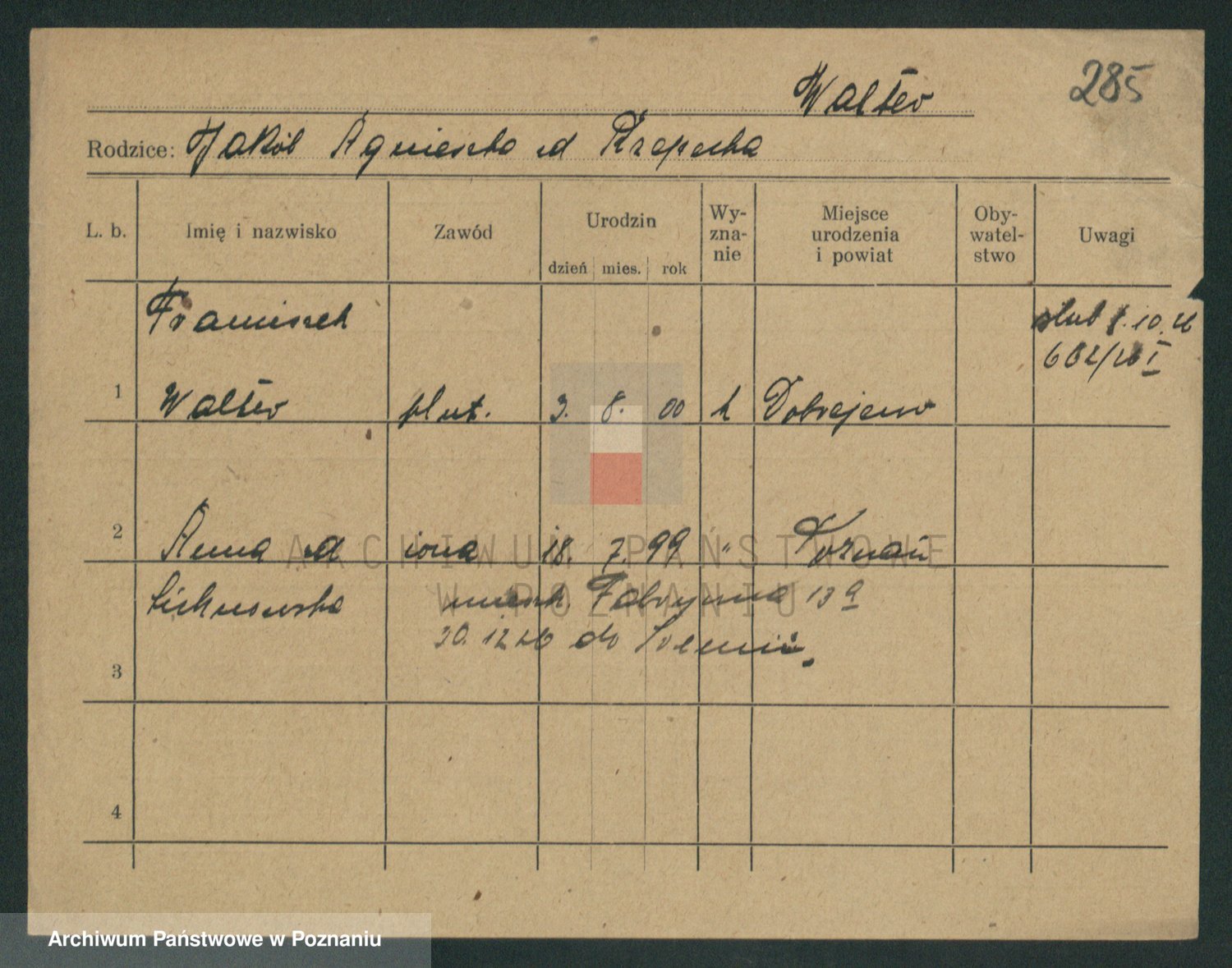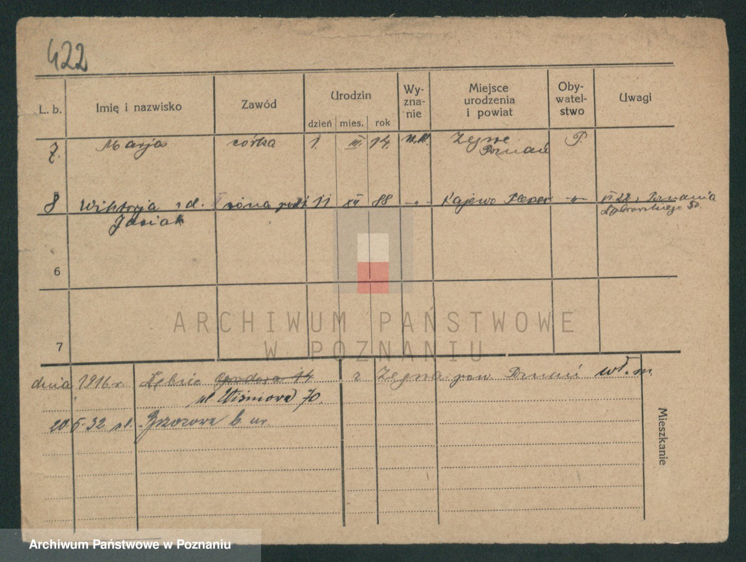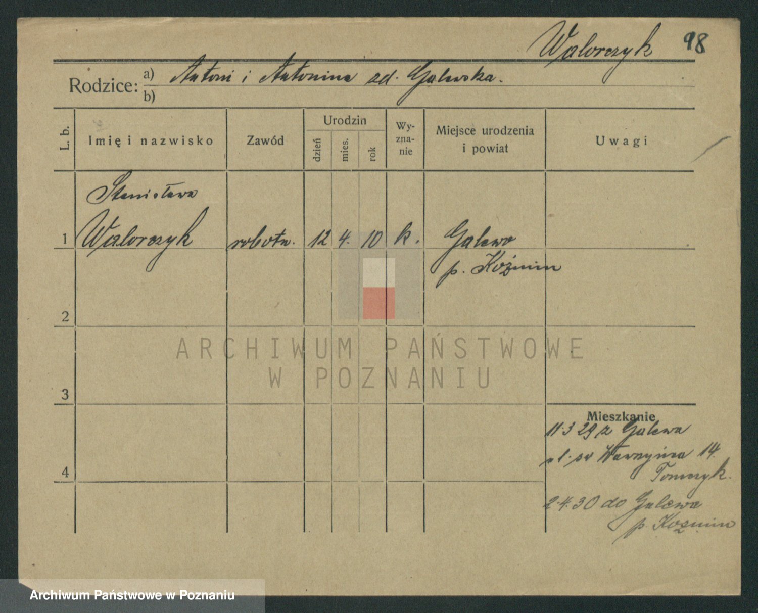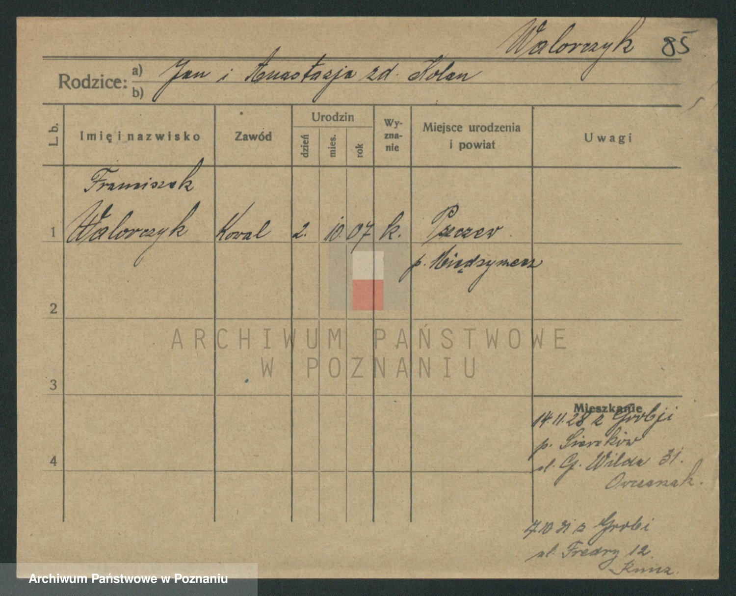Podgląd karty osobowej dostępny jest po kliknięciu na nazwisko lub ikonkę karty. Można dokonywać powiększenia (ikony na górze) lub przechodzić między kolejnymi skanami (strzałki po bokach).