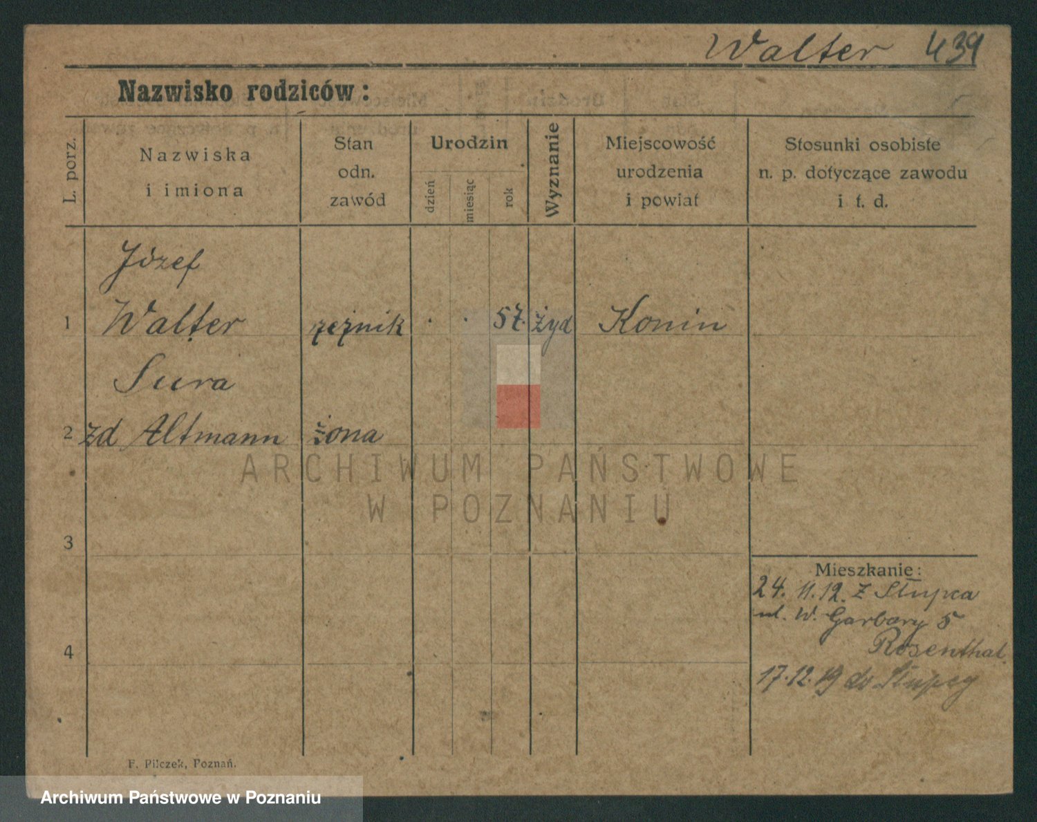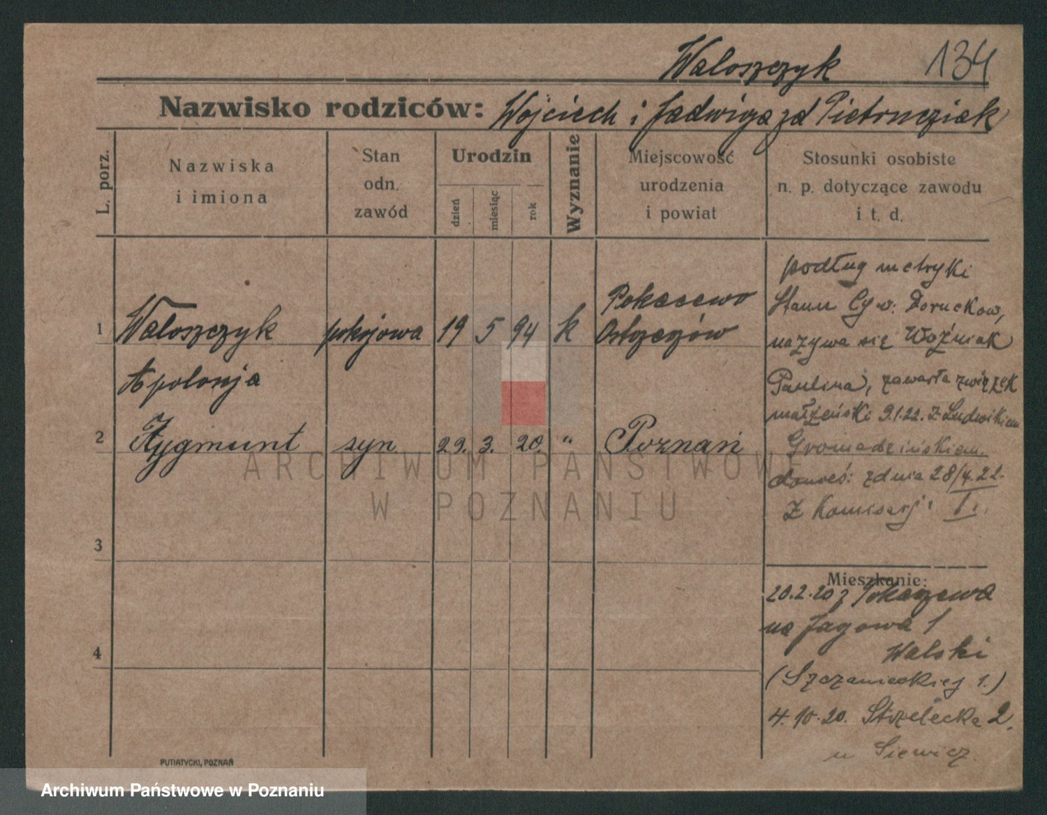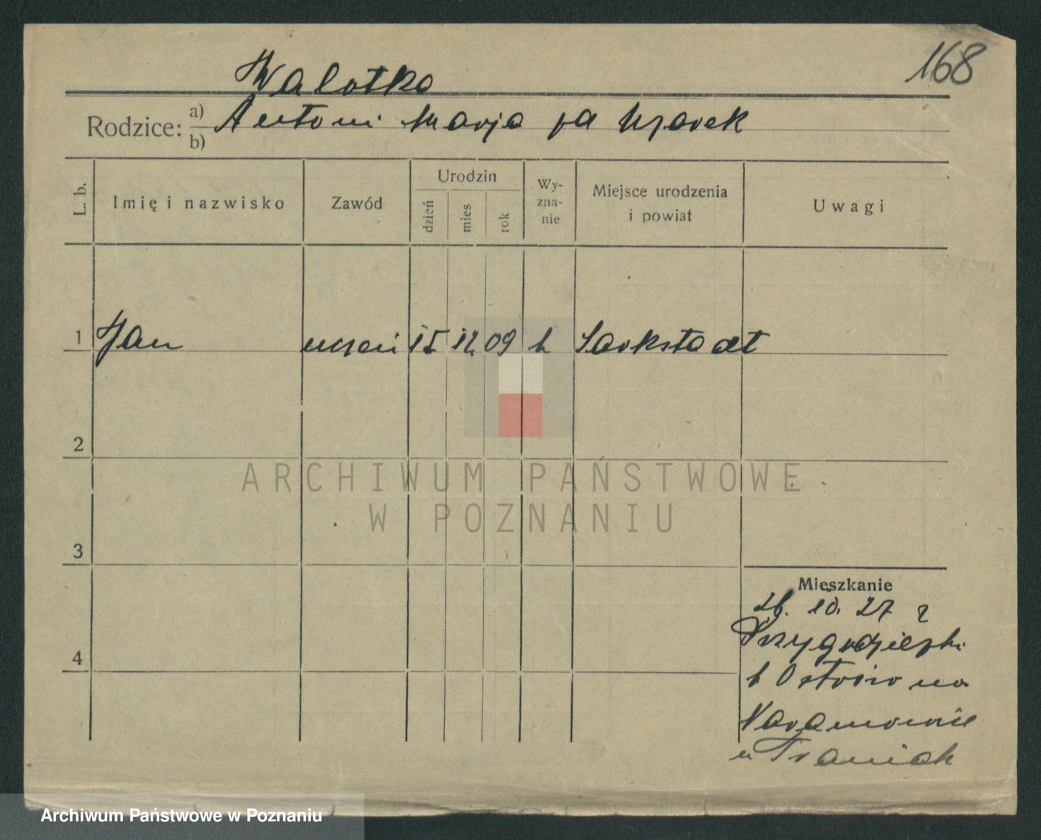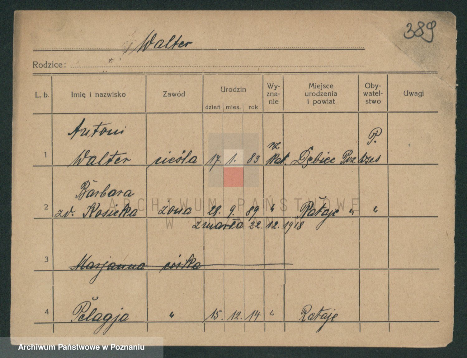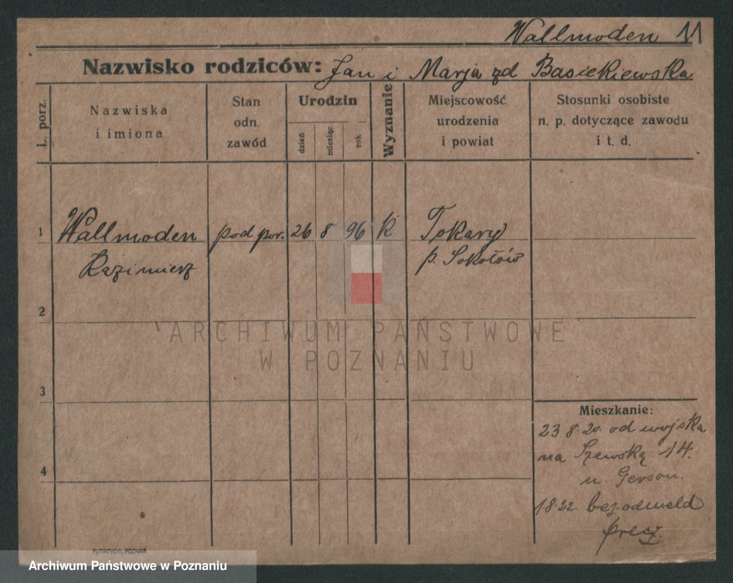 Podgląd karty osobowej dostępny jest po kliknięciu na nazwisko lub ikonkę karty. Można dokonywać powiększenia (ikony na górze) lub przechodzić między kolejnymi skanami (strzałki po bokach).