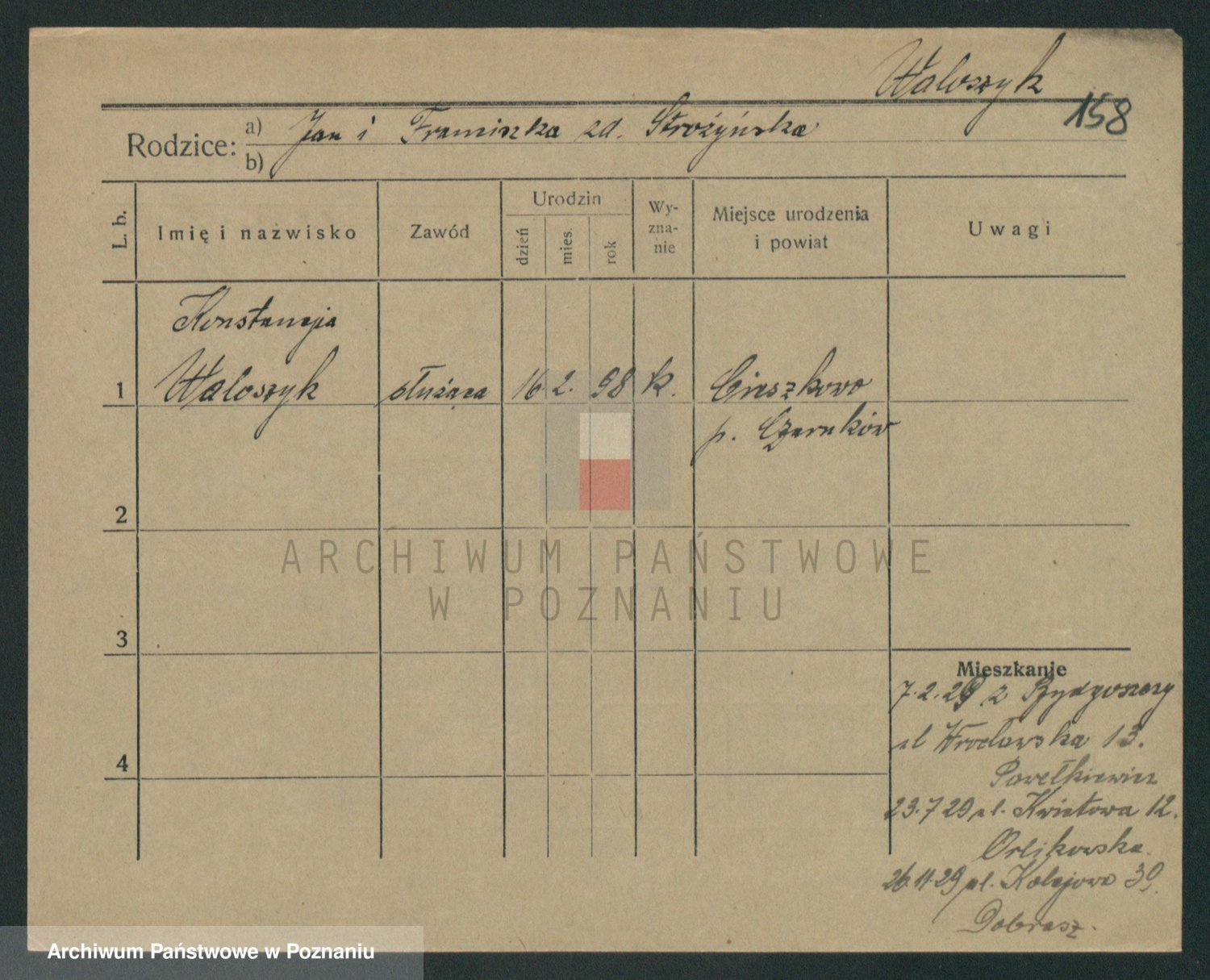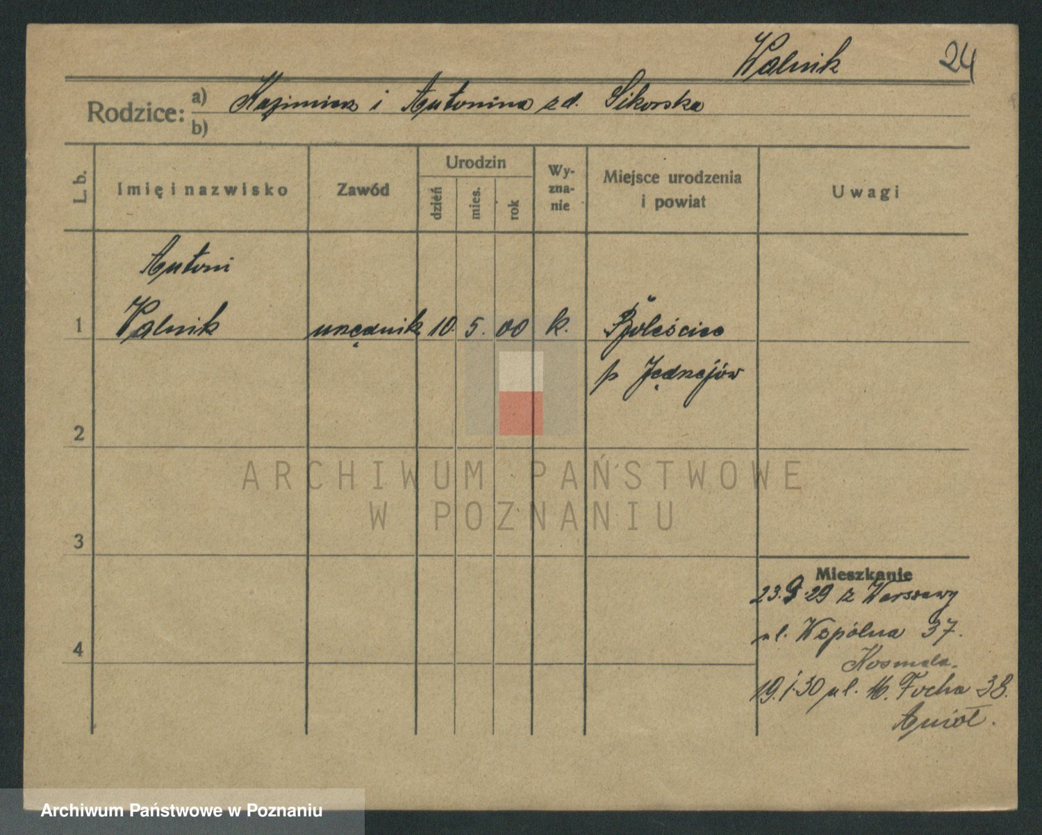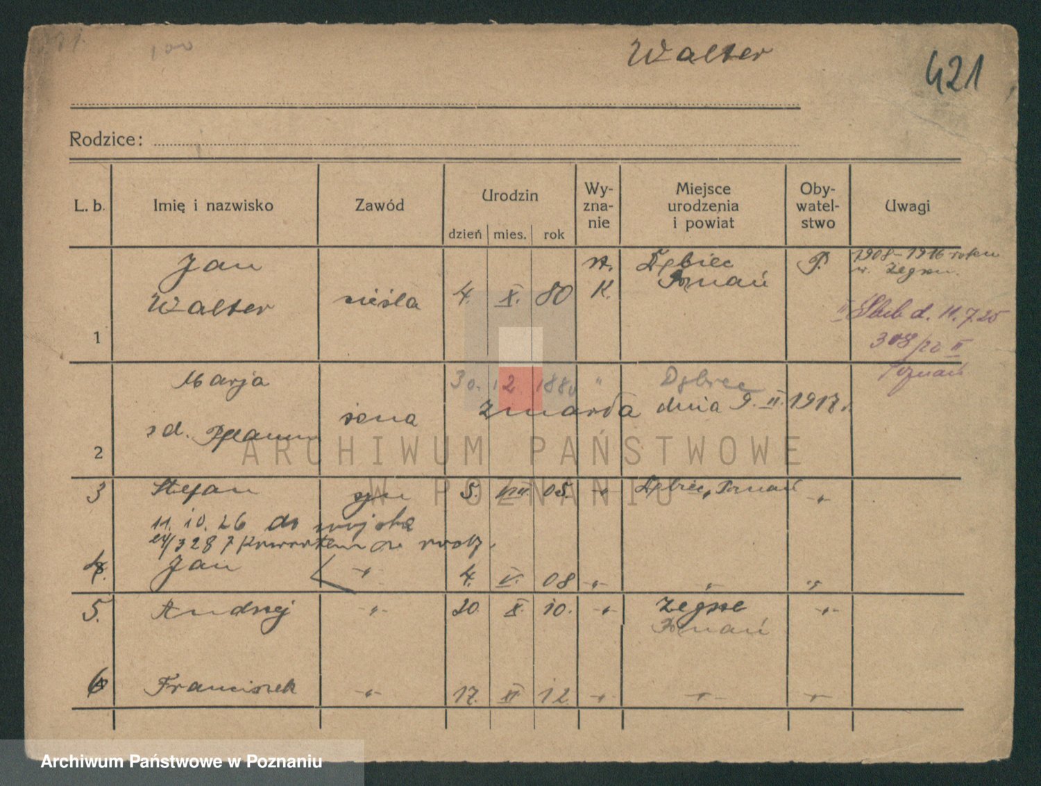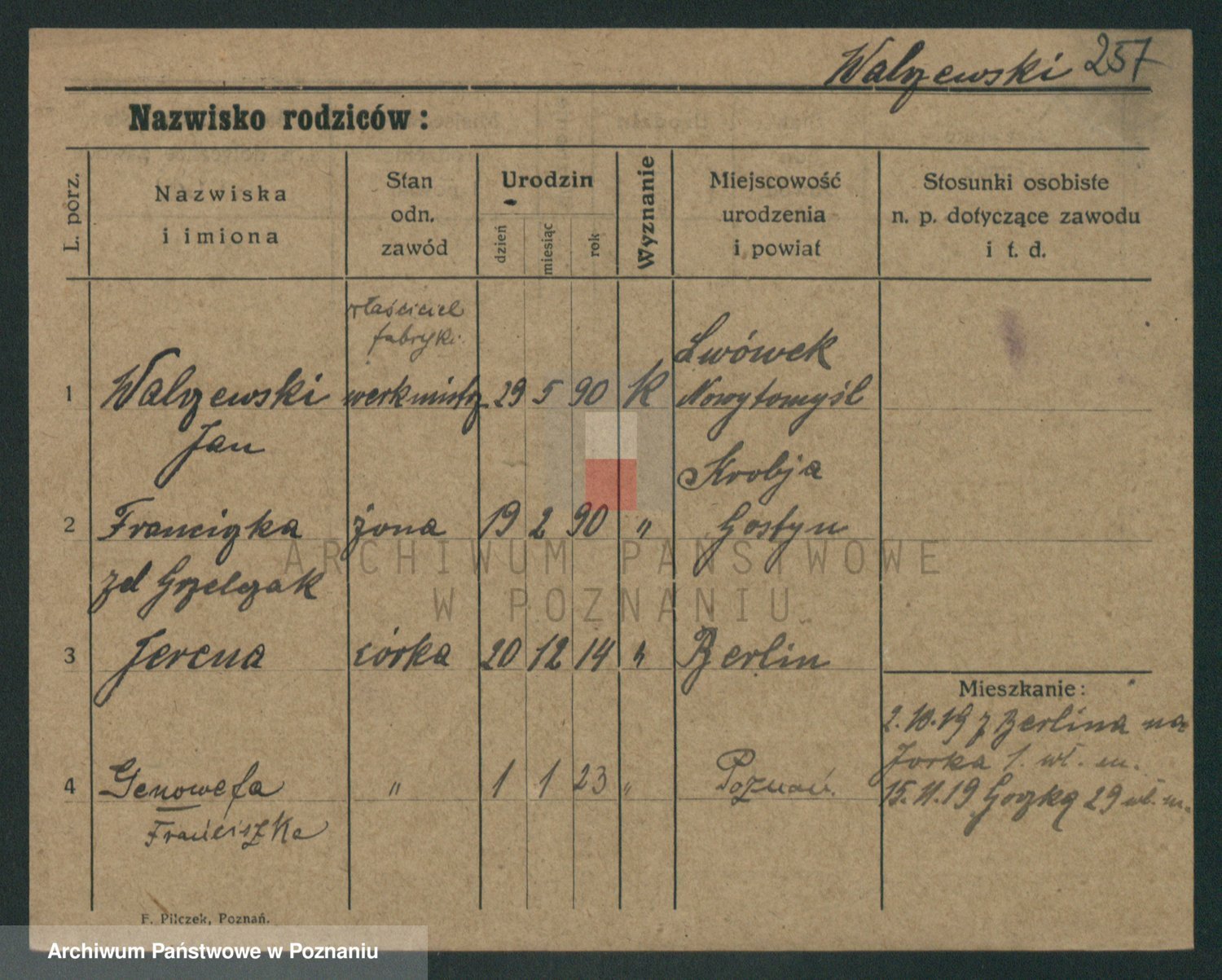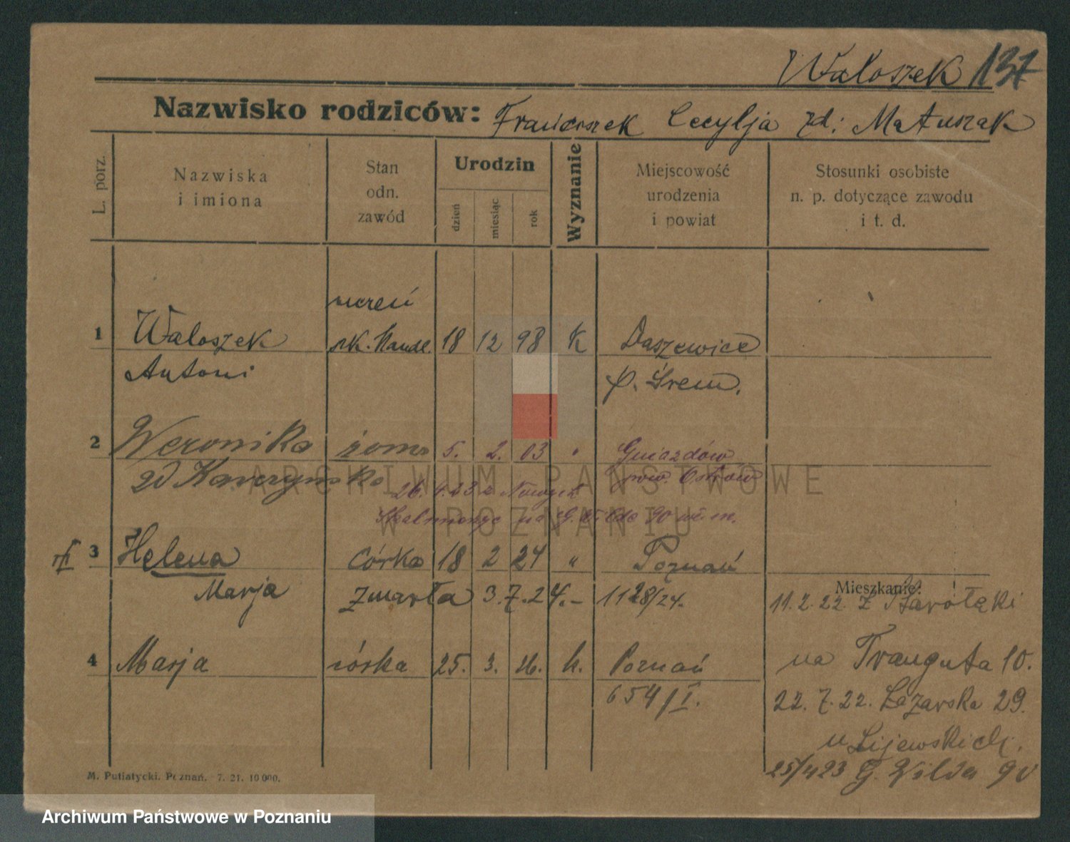 Podgląd karty osobowej dostępny jest po kliknięciu na nazwisko lub ikonkę karty. Można dokonywać powiększenia (ikony na górze) lub przechodzić między kolejnymi skanami (strzałki po bokach).