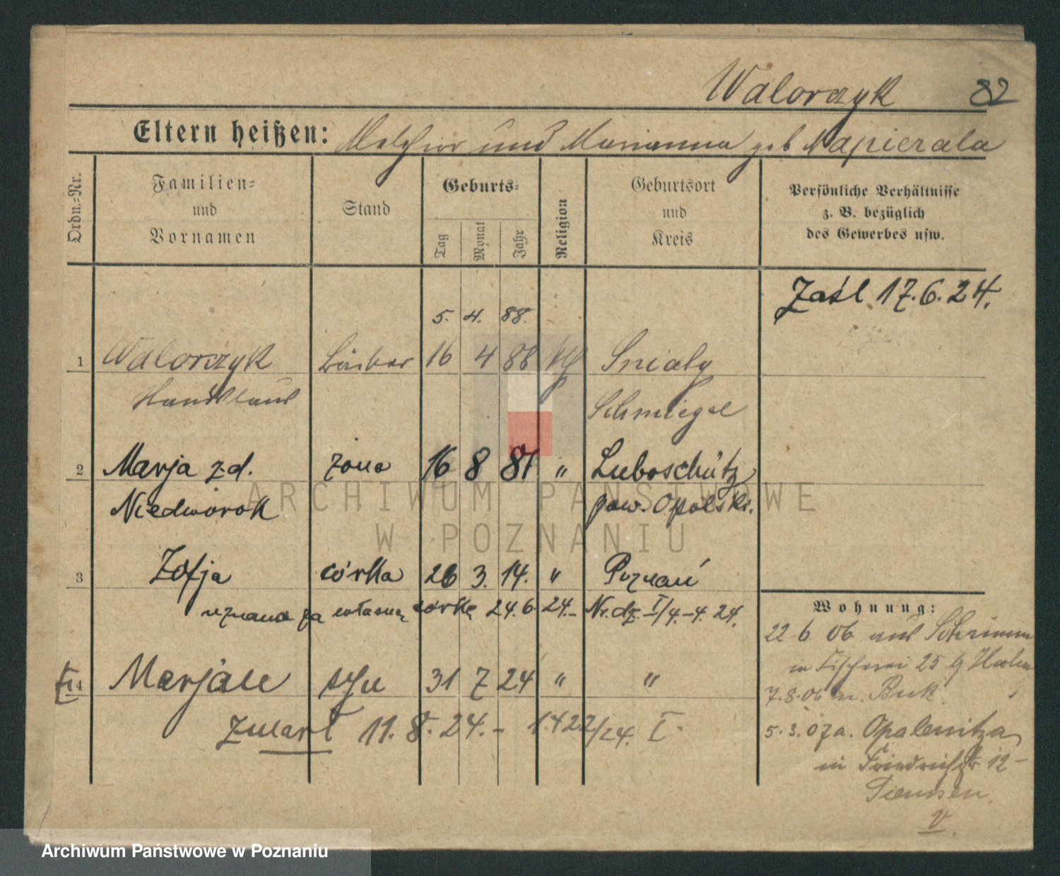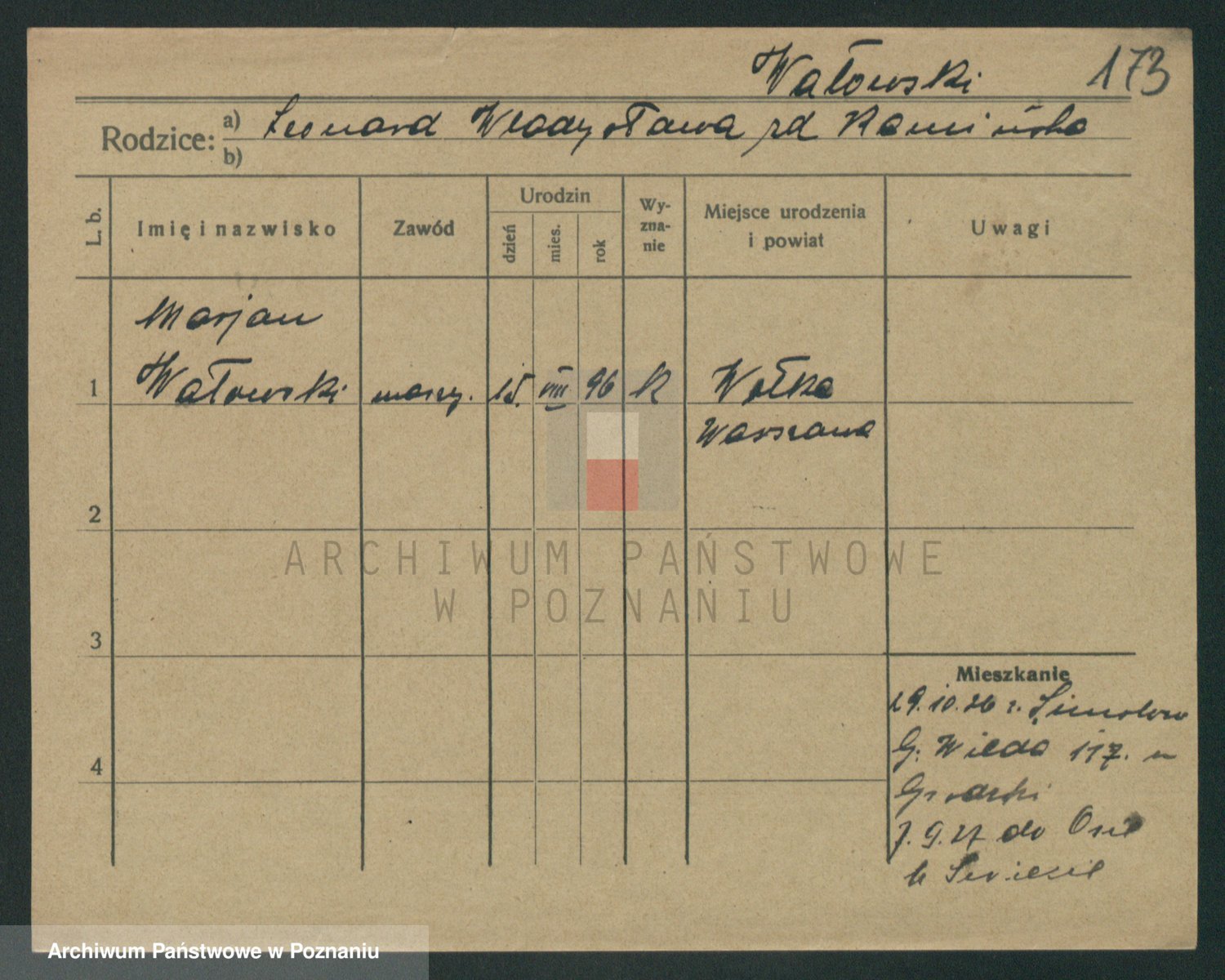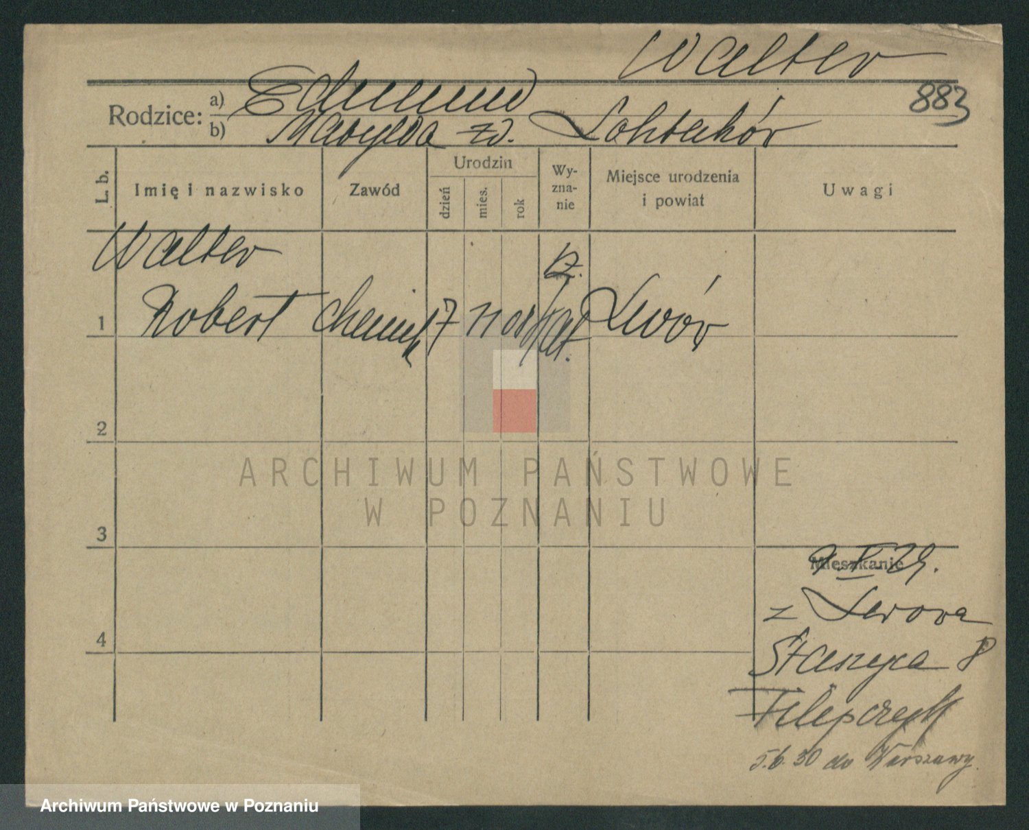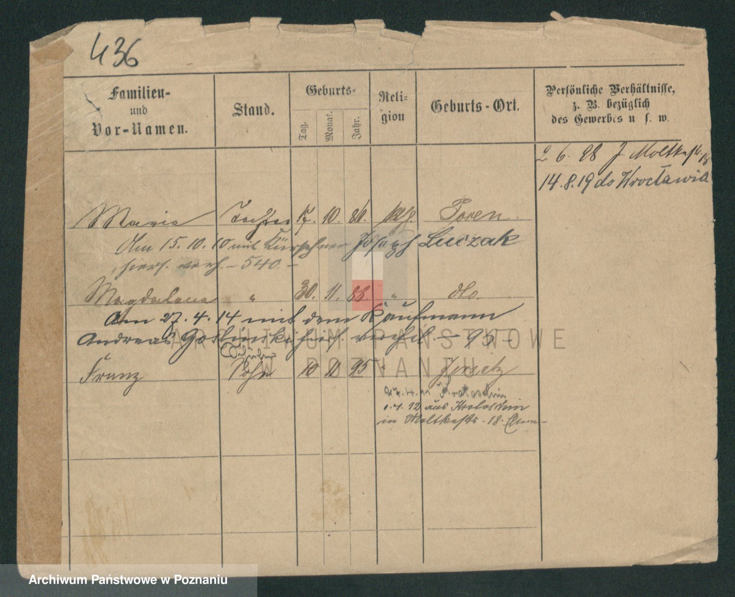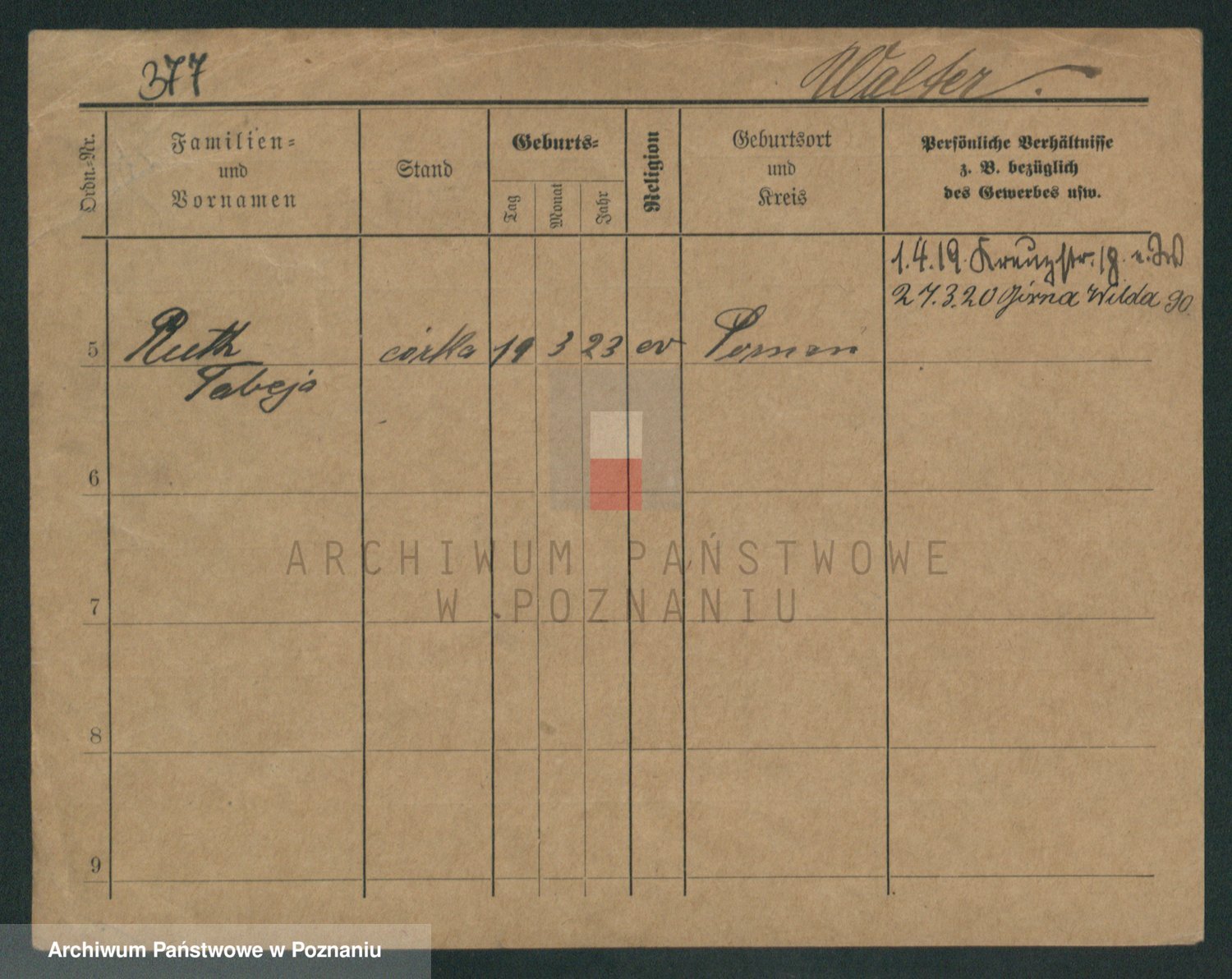 Podgląd karty osobowej dostępny jest po kliknięciu na nazwisko lub ikonkę karty. Można dokonywać powiększenia (ikony na górze) lub przechodzić między kolejnymi skanami (strzałki po bokach).