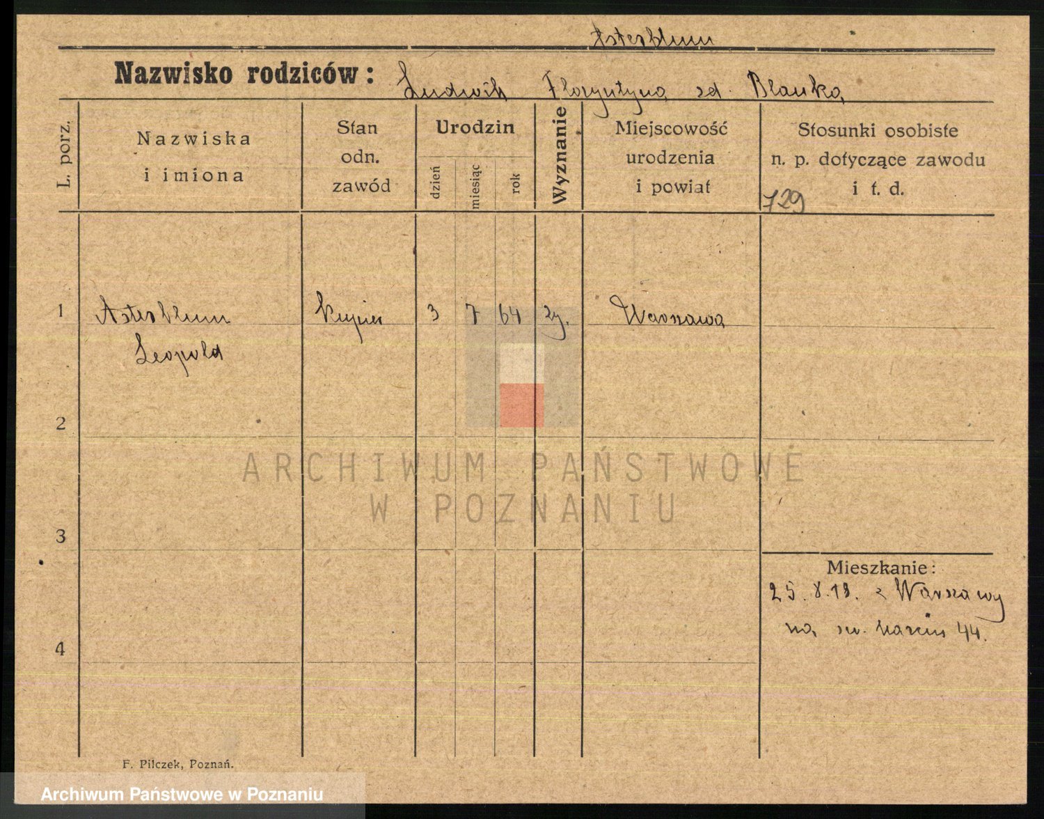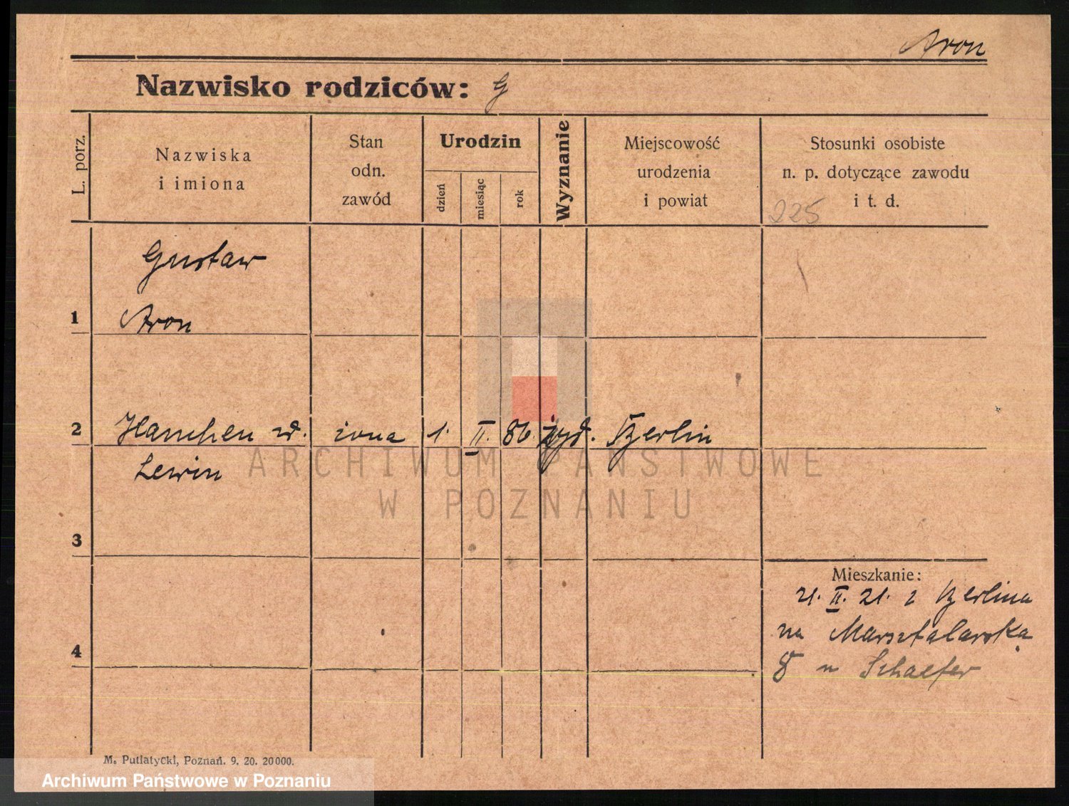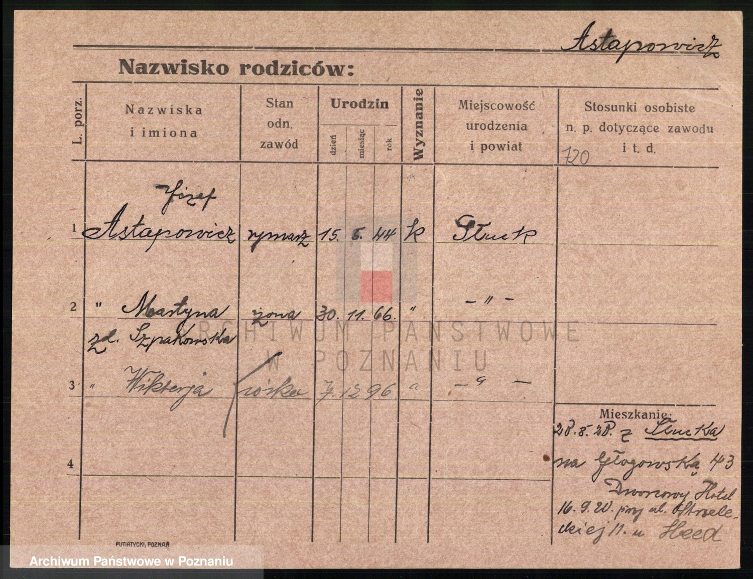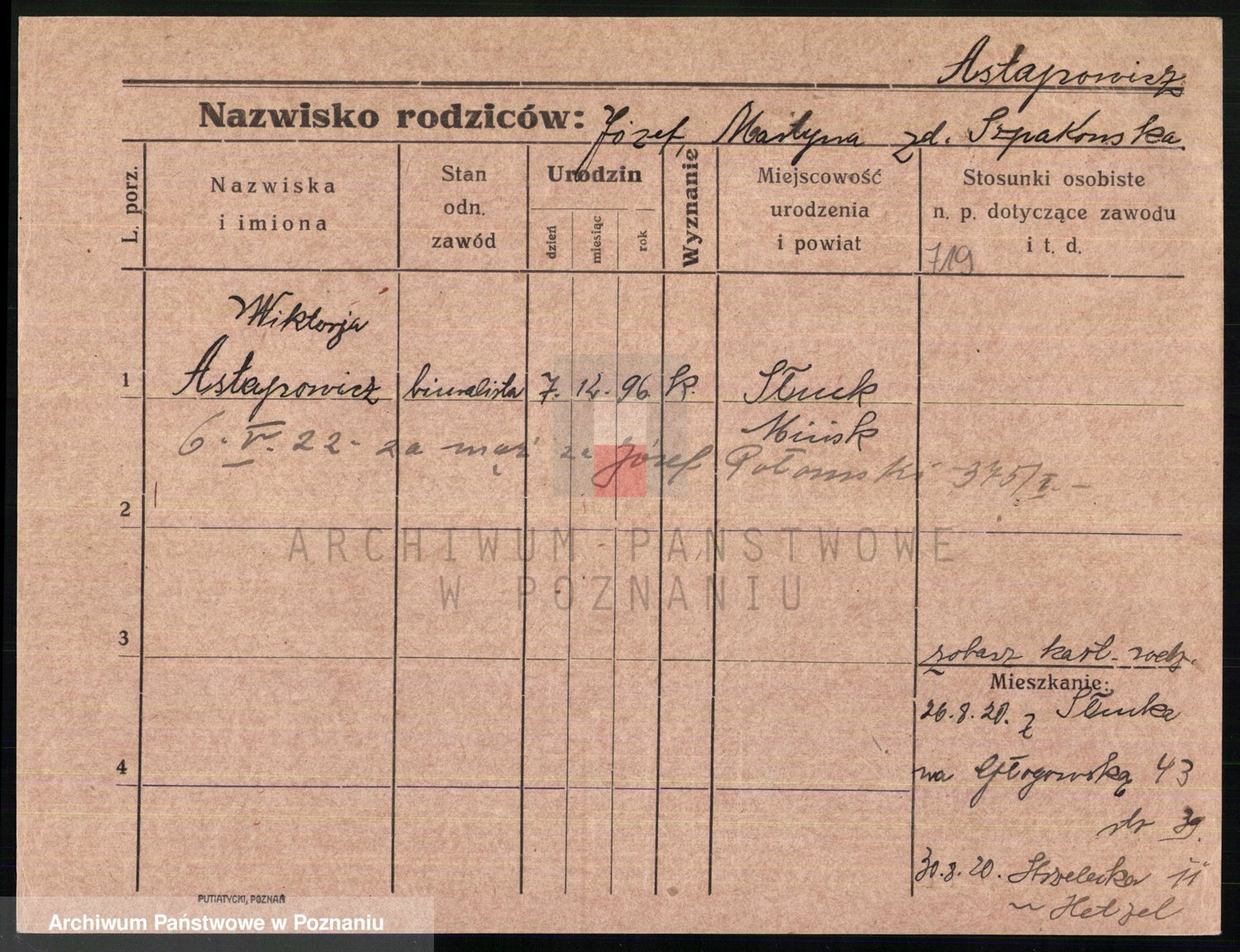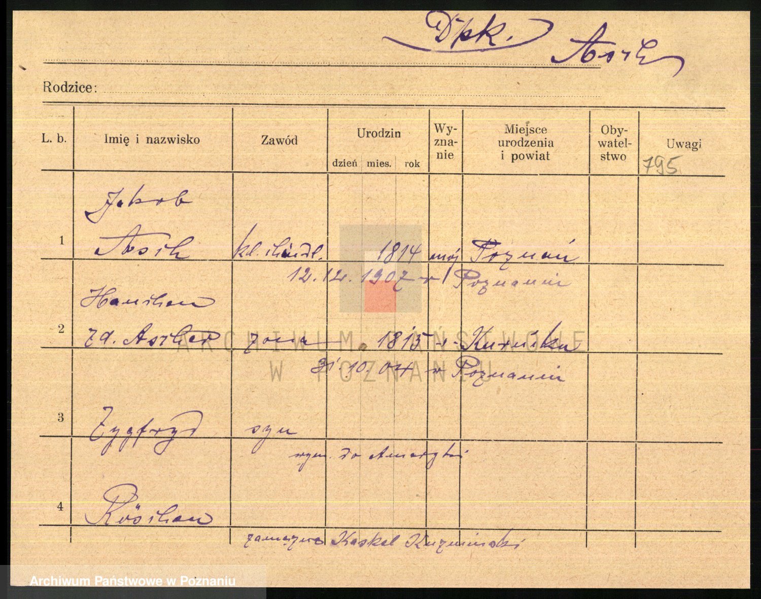 Podgląd karty osobowej dostępny jest po kliknięciu na nazwisko lub ikonkę karty. Można dokonywać powiększenia (ikony na górze) lub przechodzić między kolejnymi skanami (strzałki po bokach).