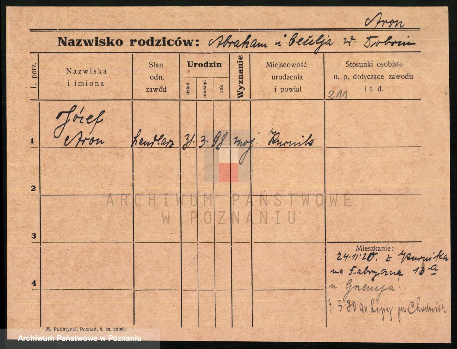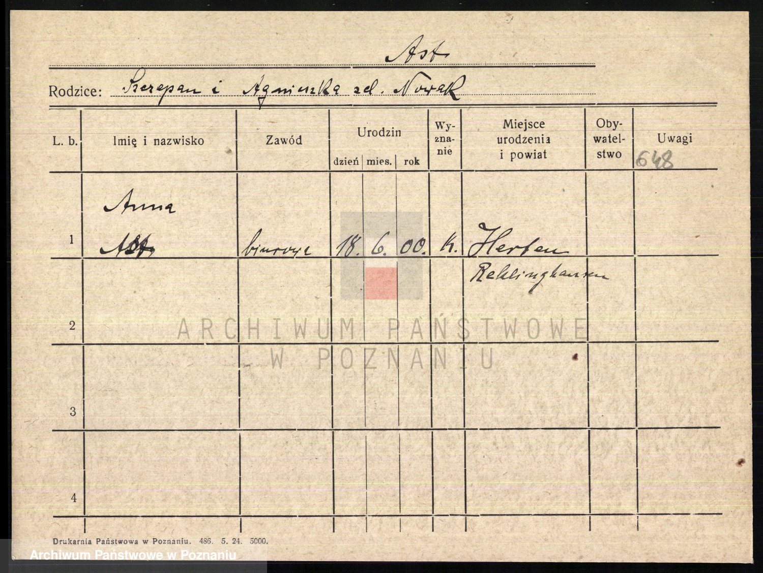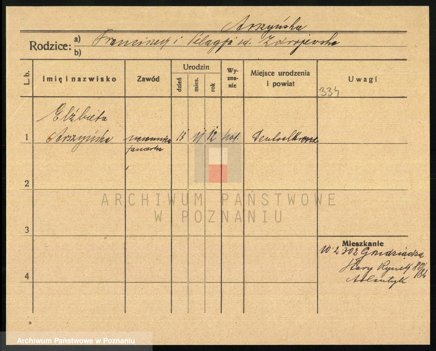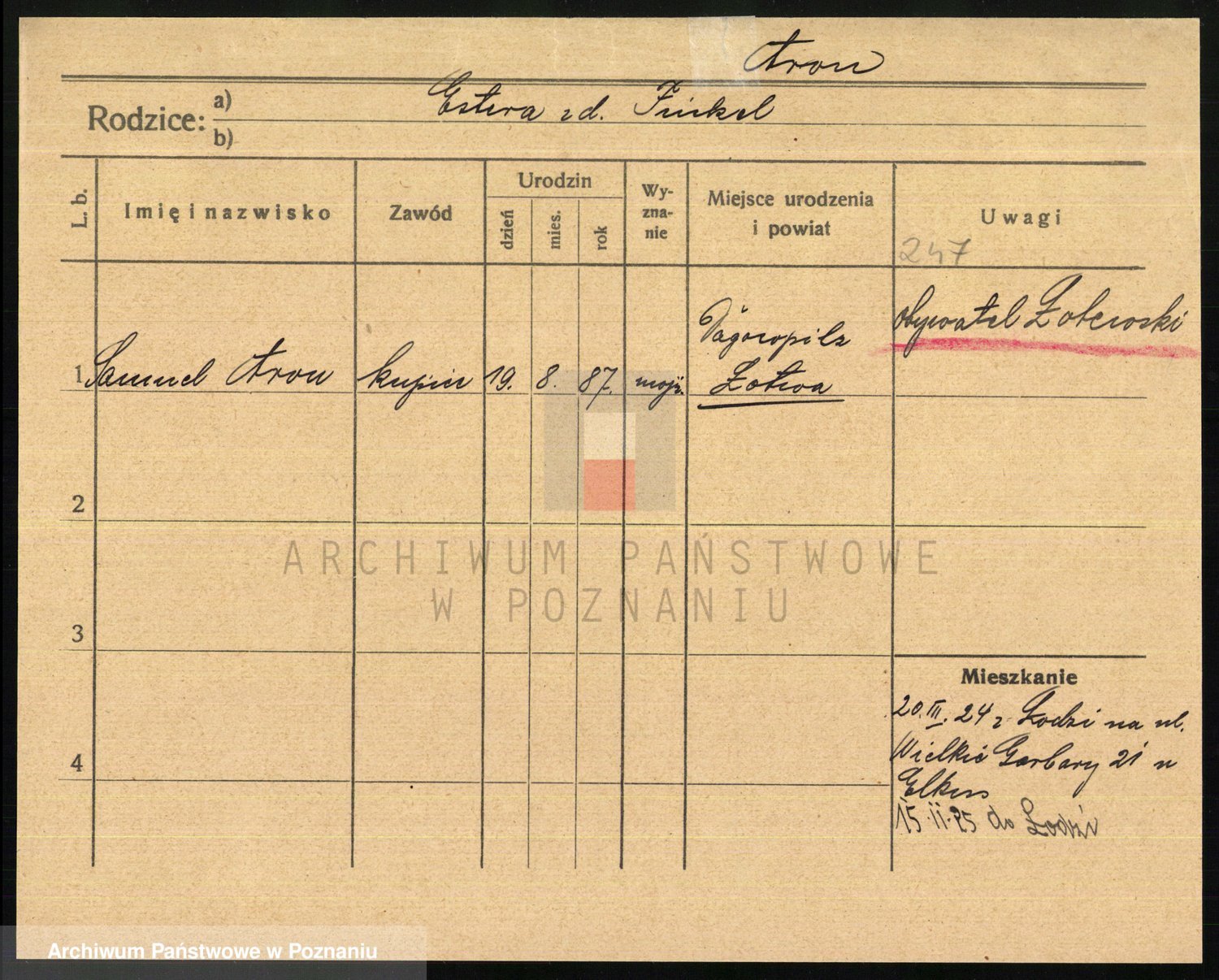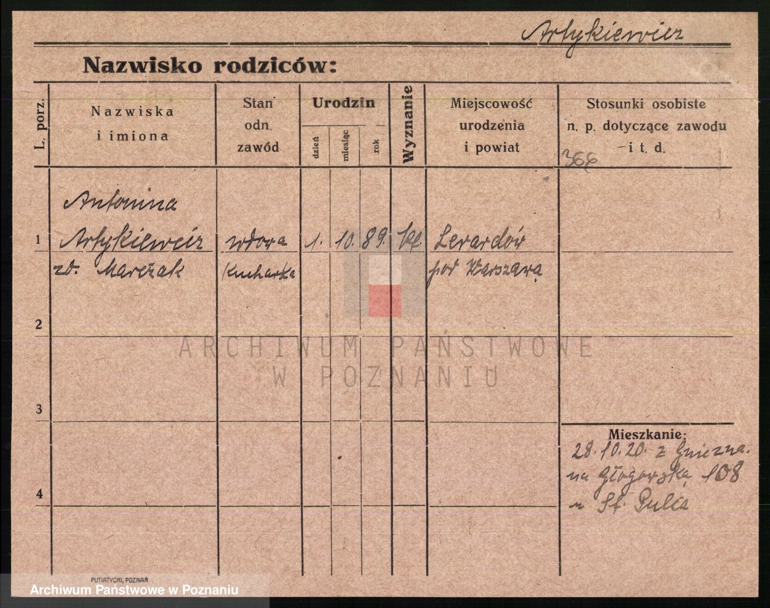 Podgląd karty osobowej dostępny jest po kliknięciu na nazwisko lub ikonkę karty. Można dokonywać powiększenia (ikony na górze) lub przechodzić między kolejnymi skanami (strzałki po bokach).