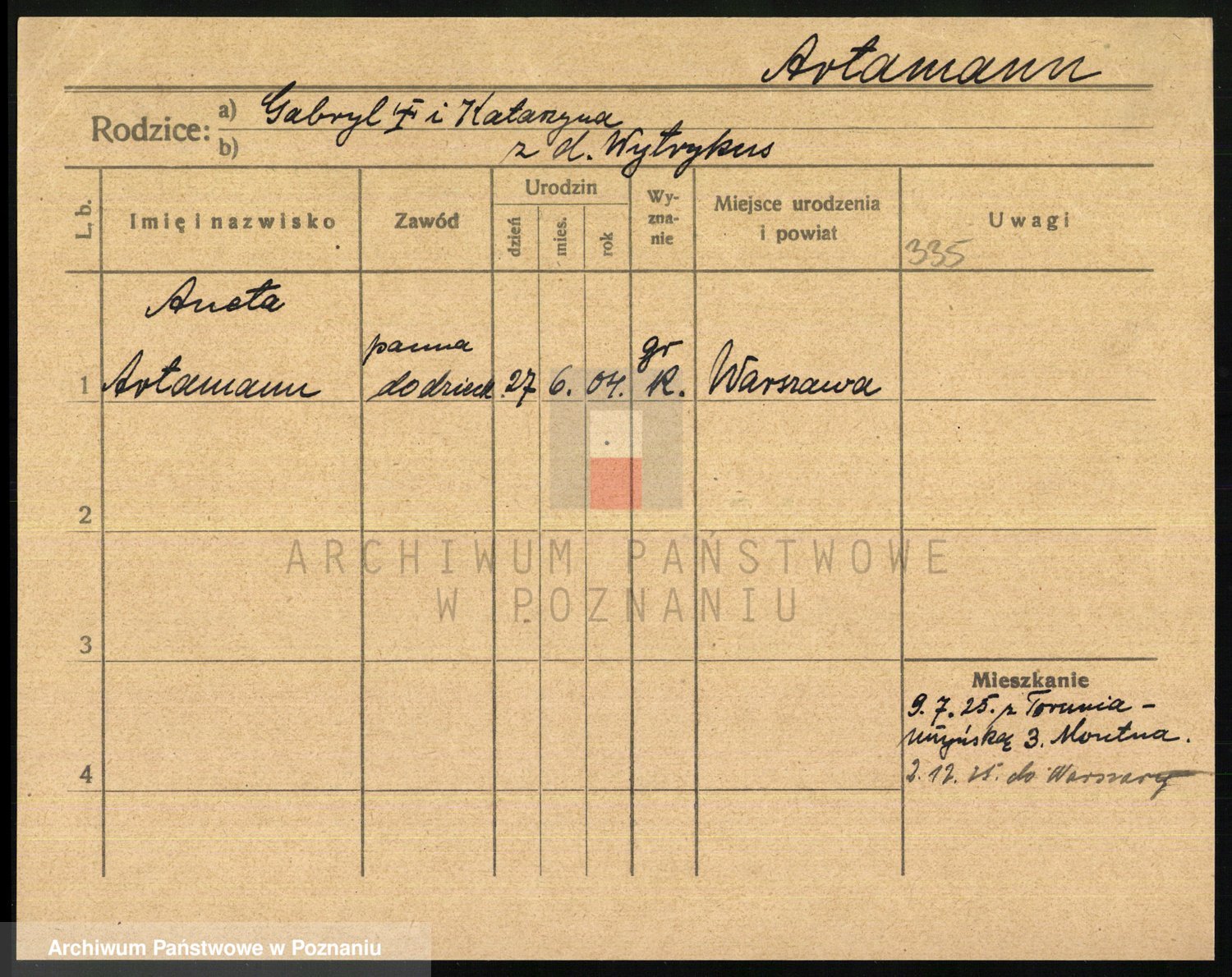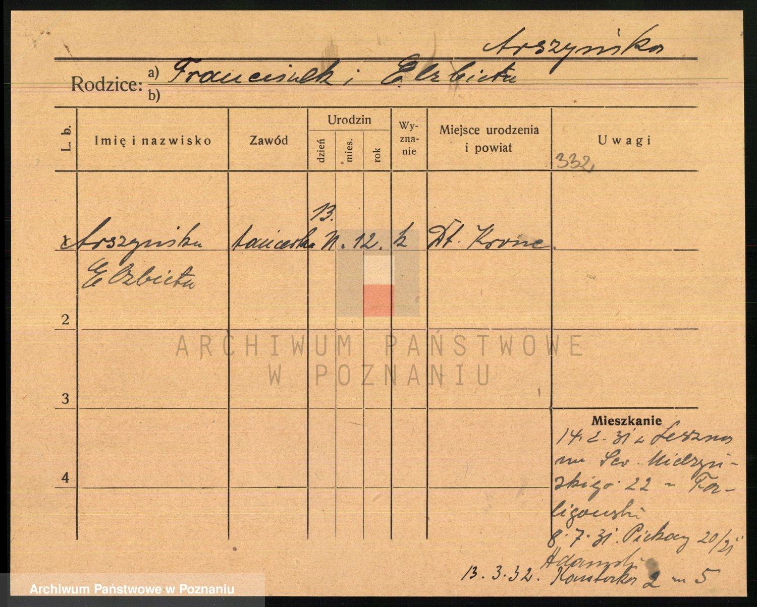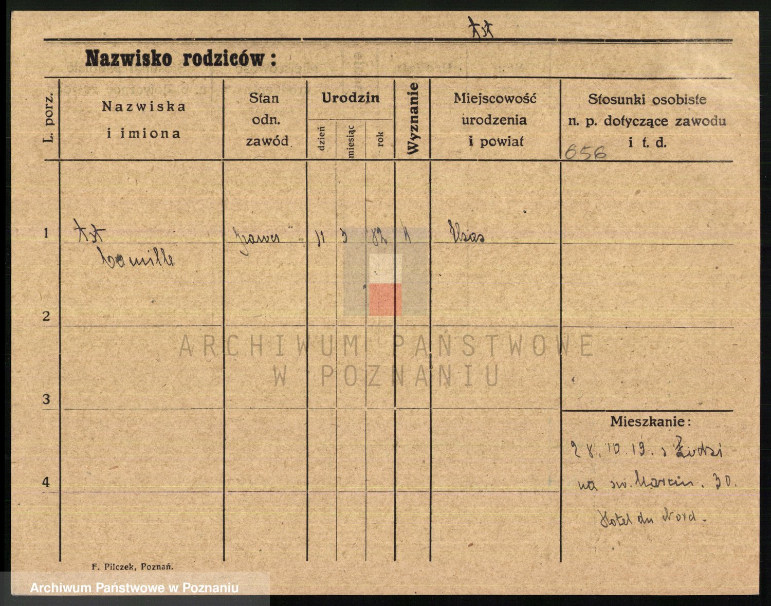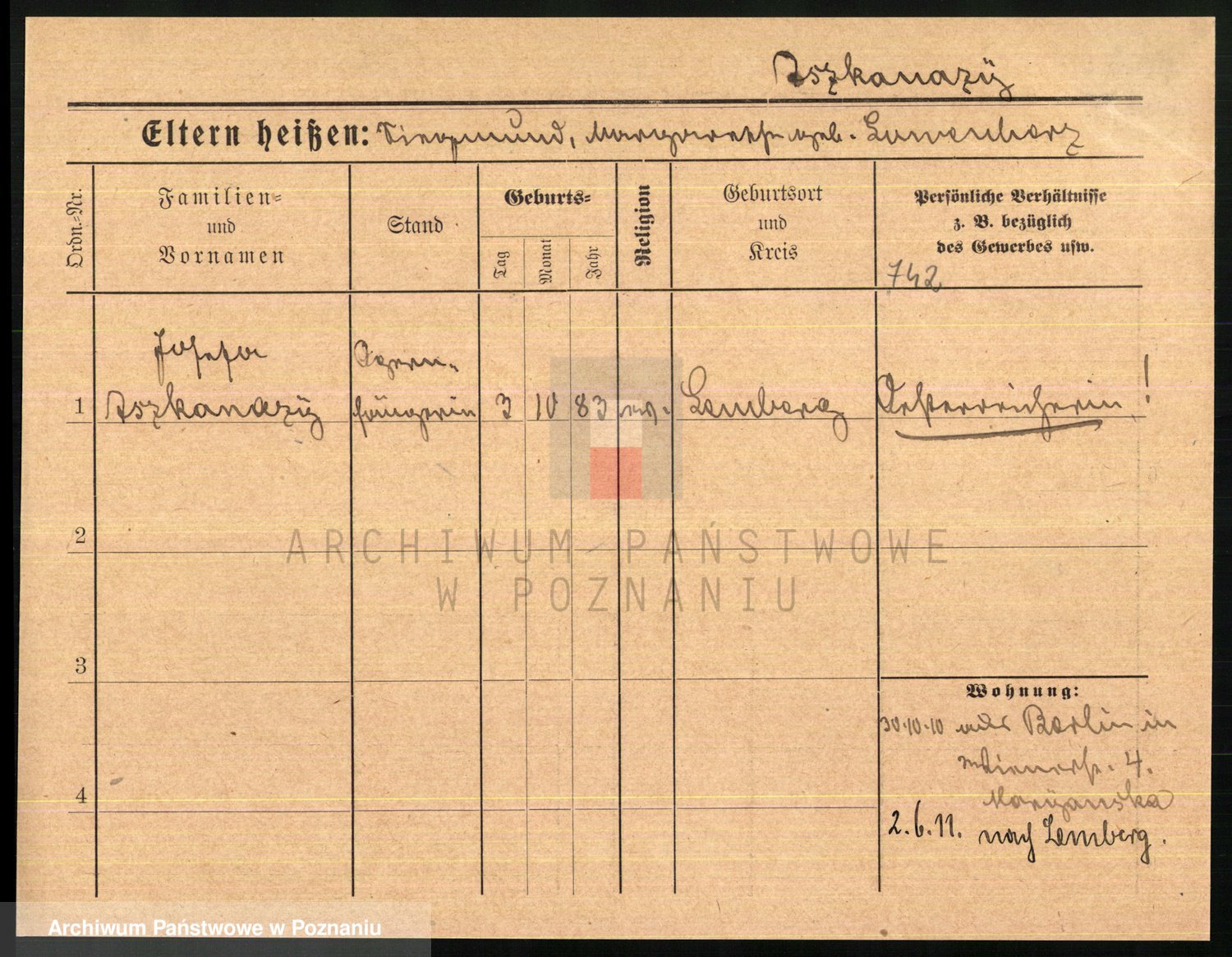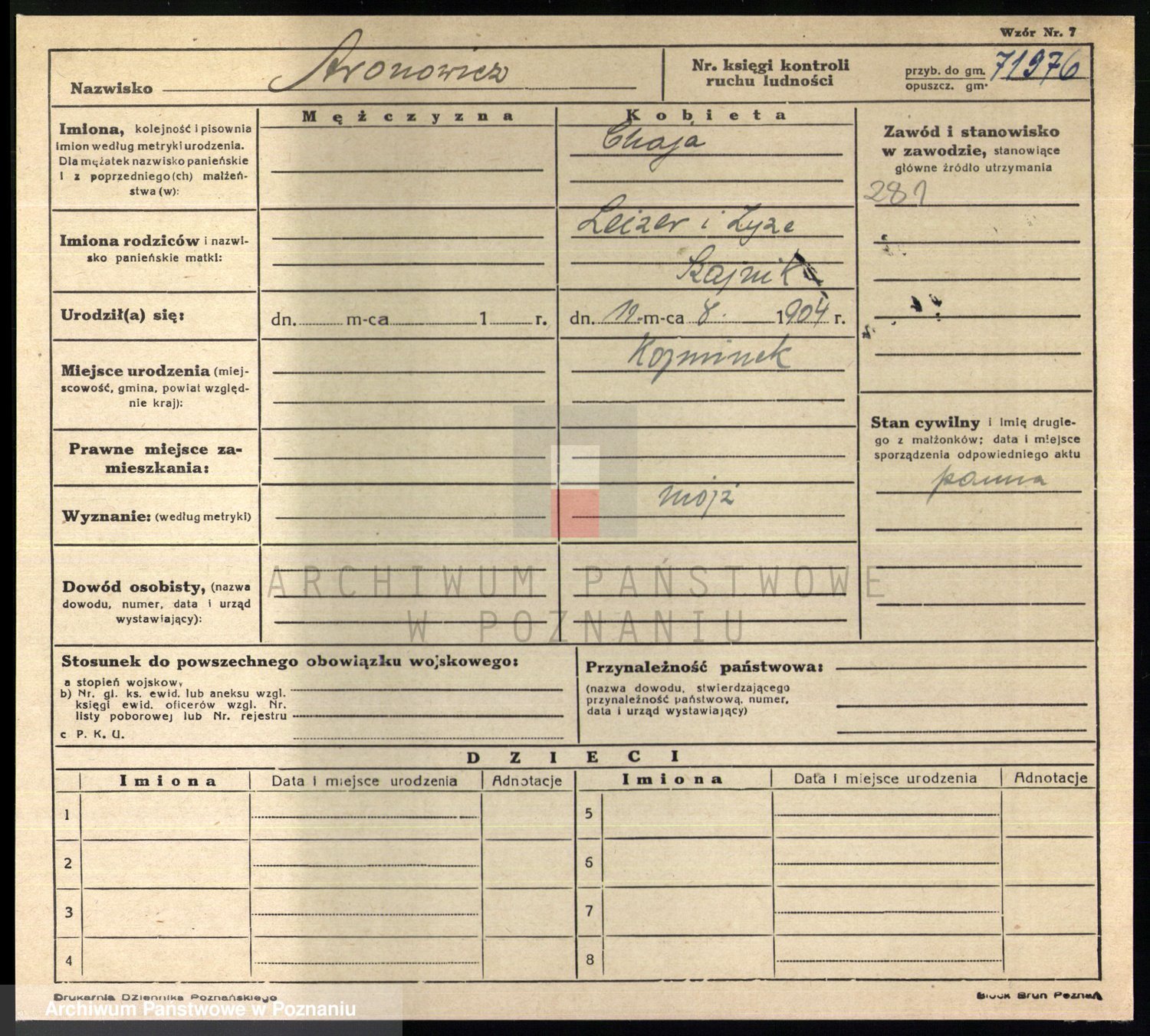 Podgląd karty osobowej dostępny jest po kliknięciu na nazwisko lub ikonkę karty. Można dokonywać powiększenia (ikony na górze) lub przechodzić między kolejnymi skanami (strzałki po bokach).