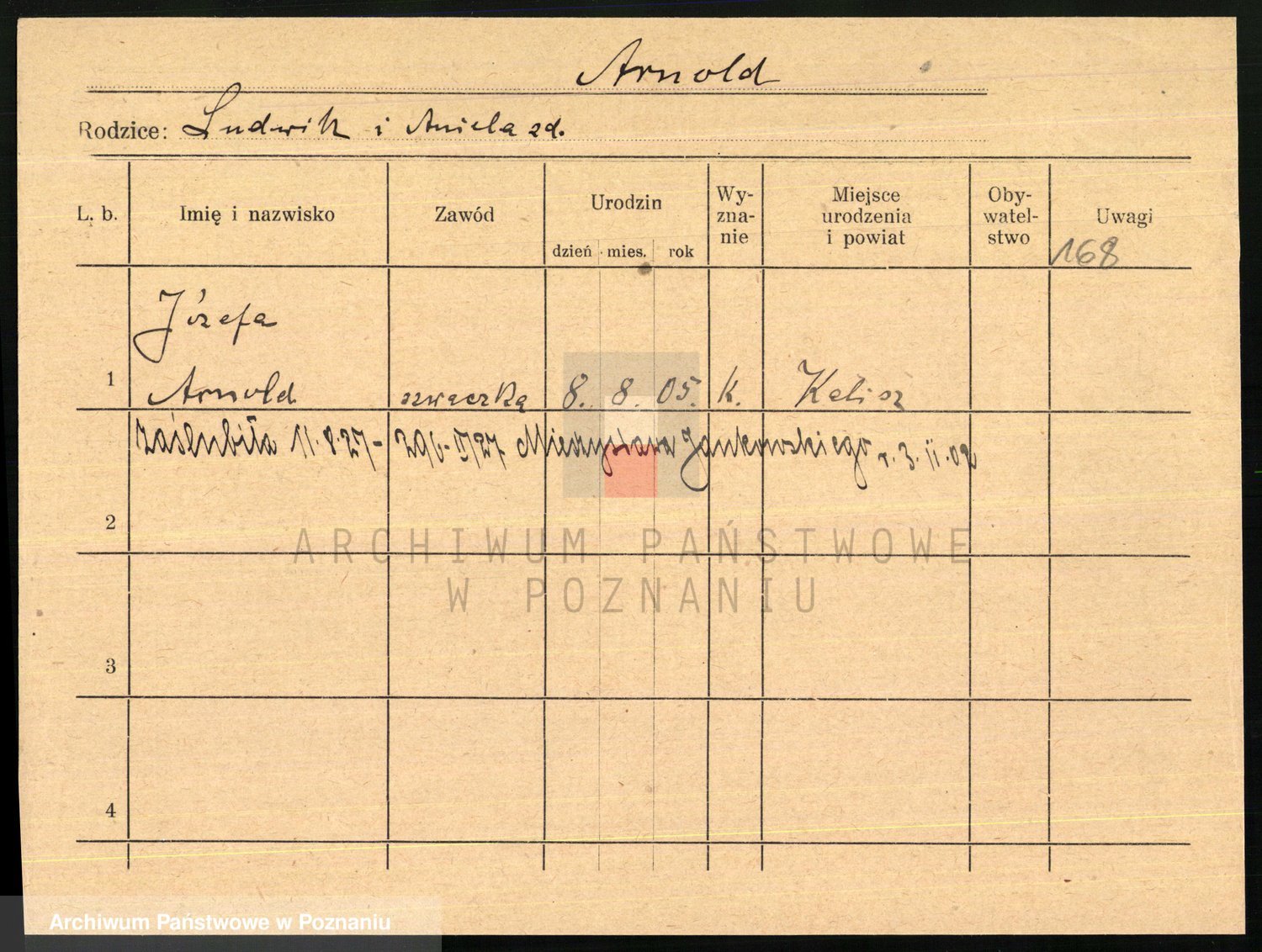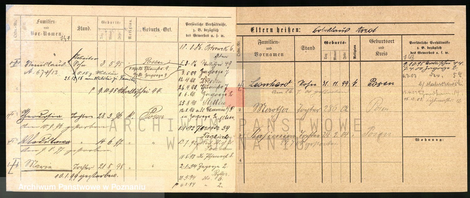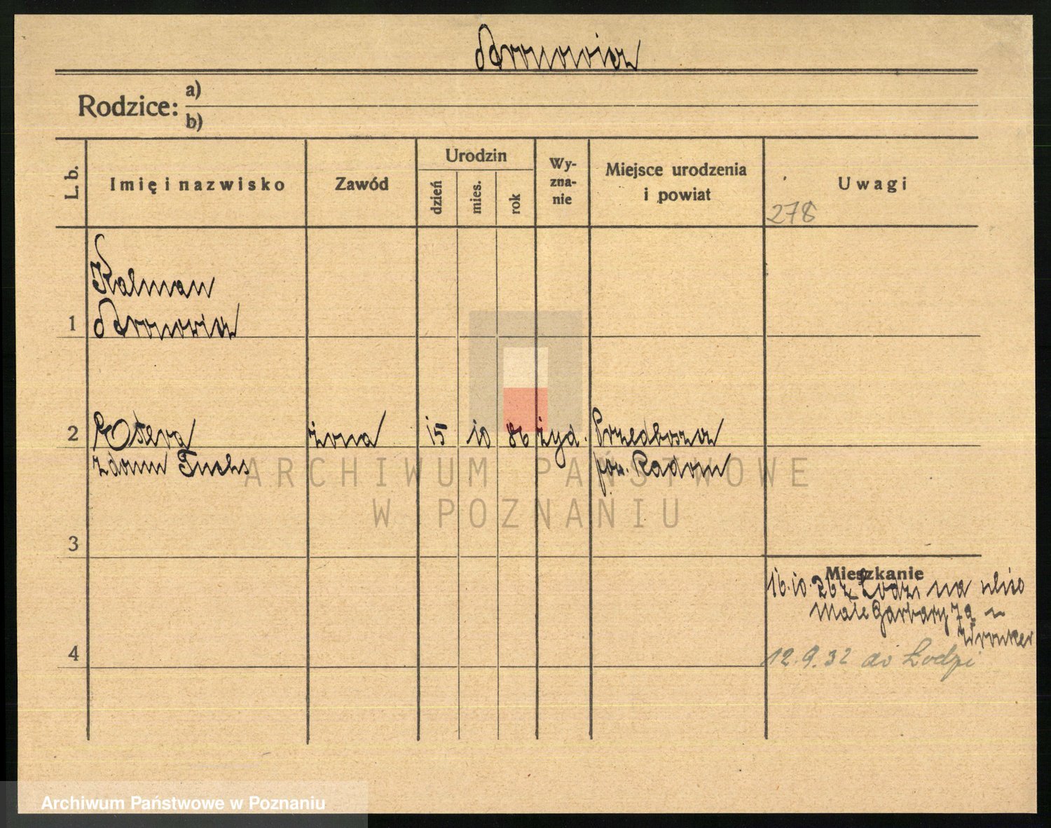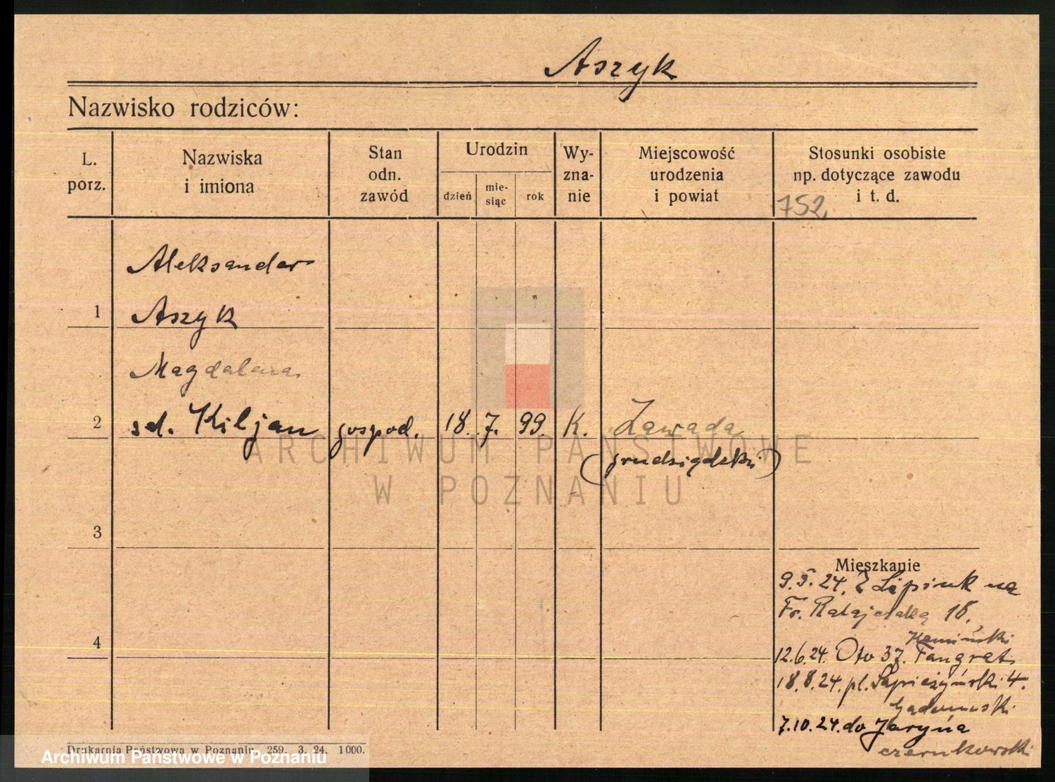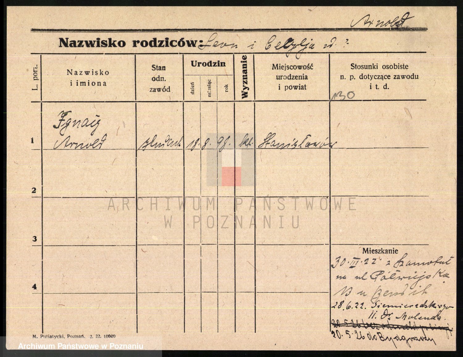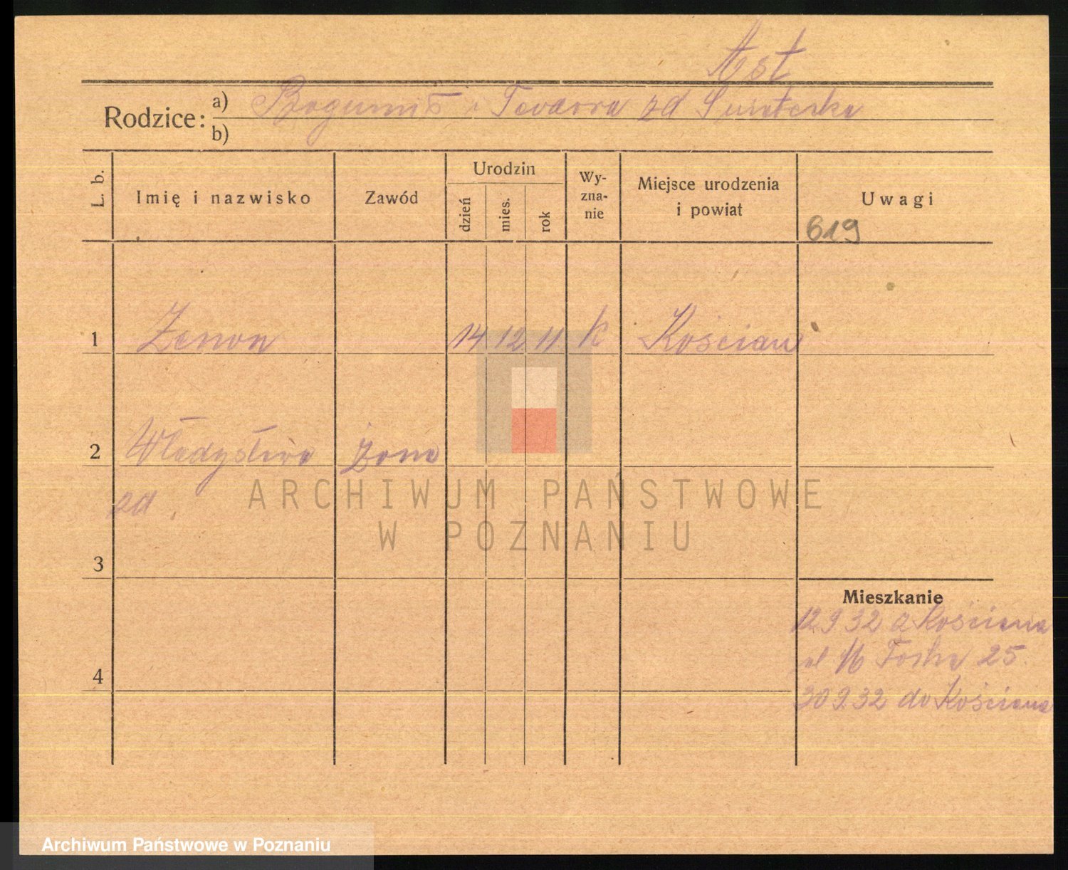 Podgląd karty osobowej dostępny jest po kliknięciu na nazwisko lub ikonkę karty. Można dokonywać powiększenia (ikony na górze) lub przechodzić między kolejnymi skanami (strzałki po bokach).