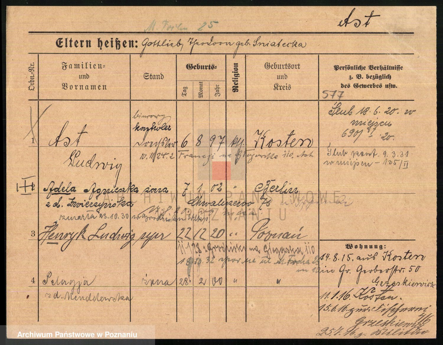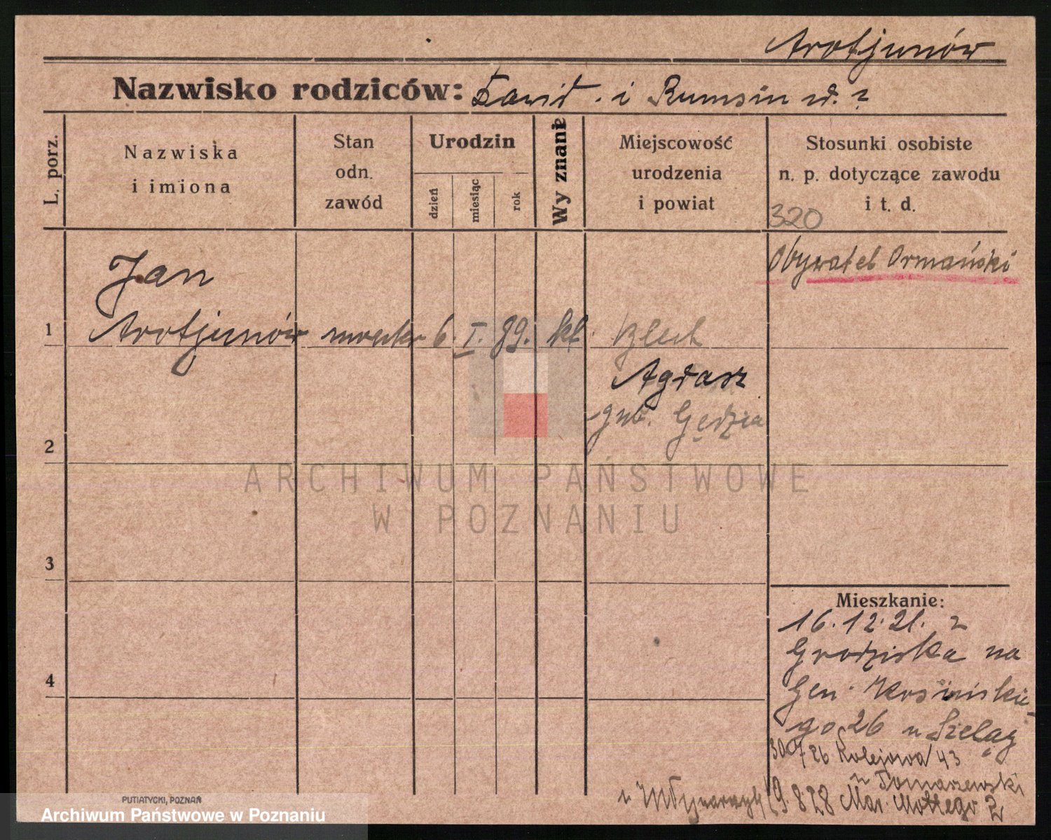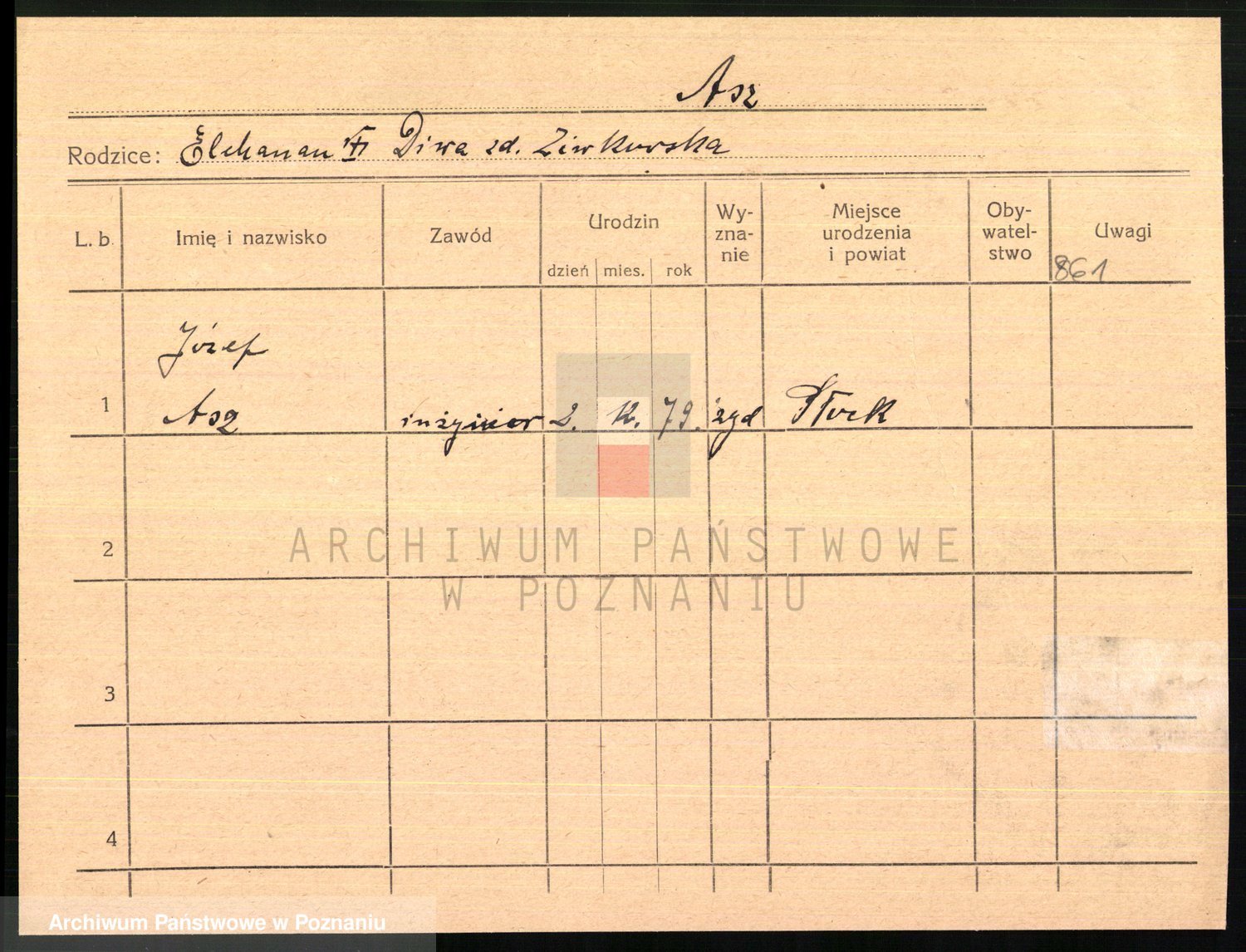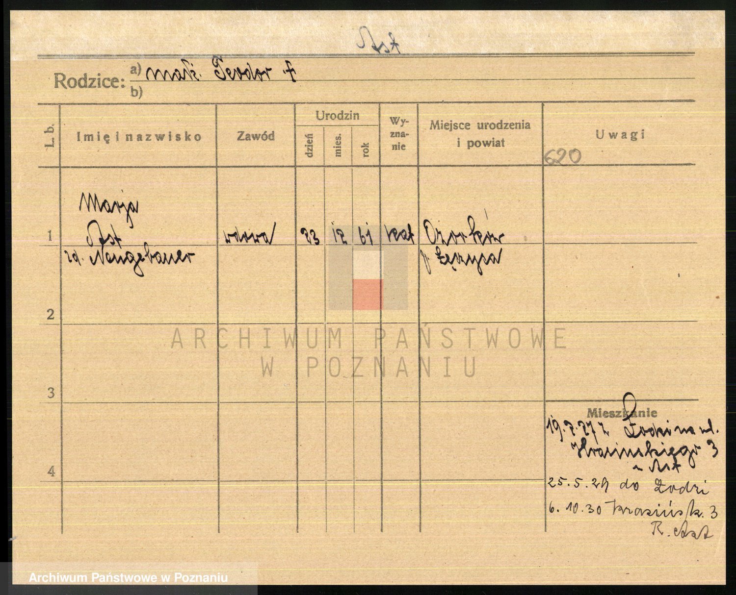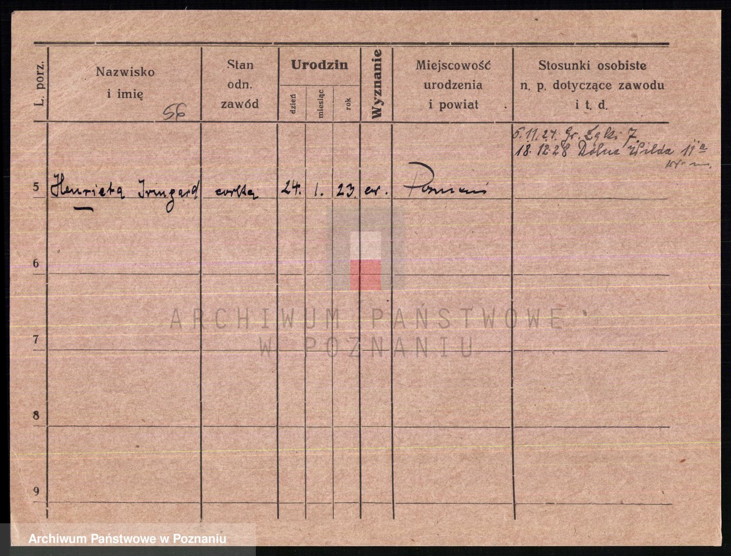 Podgląd karty osobowej dostępny jest po kliknięciu na nazwisko lub ikonkę karty. Można dokonywać powiększenia (ikony na górze) lub przechodzić między kolejnymi skanami (strzałki po bokach).