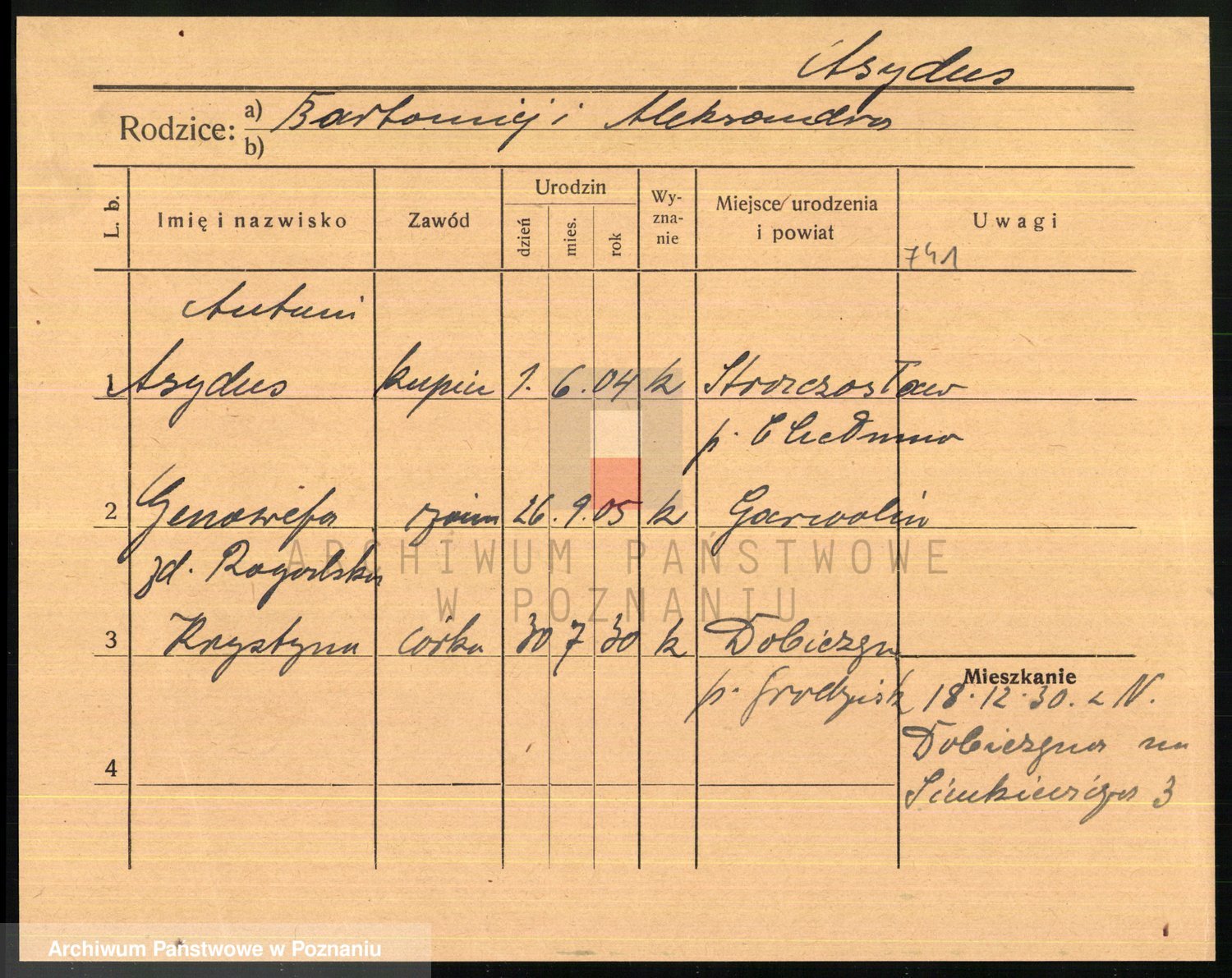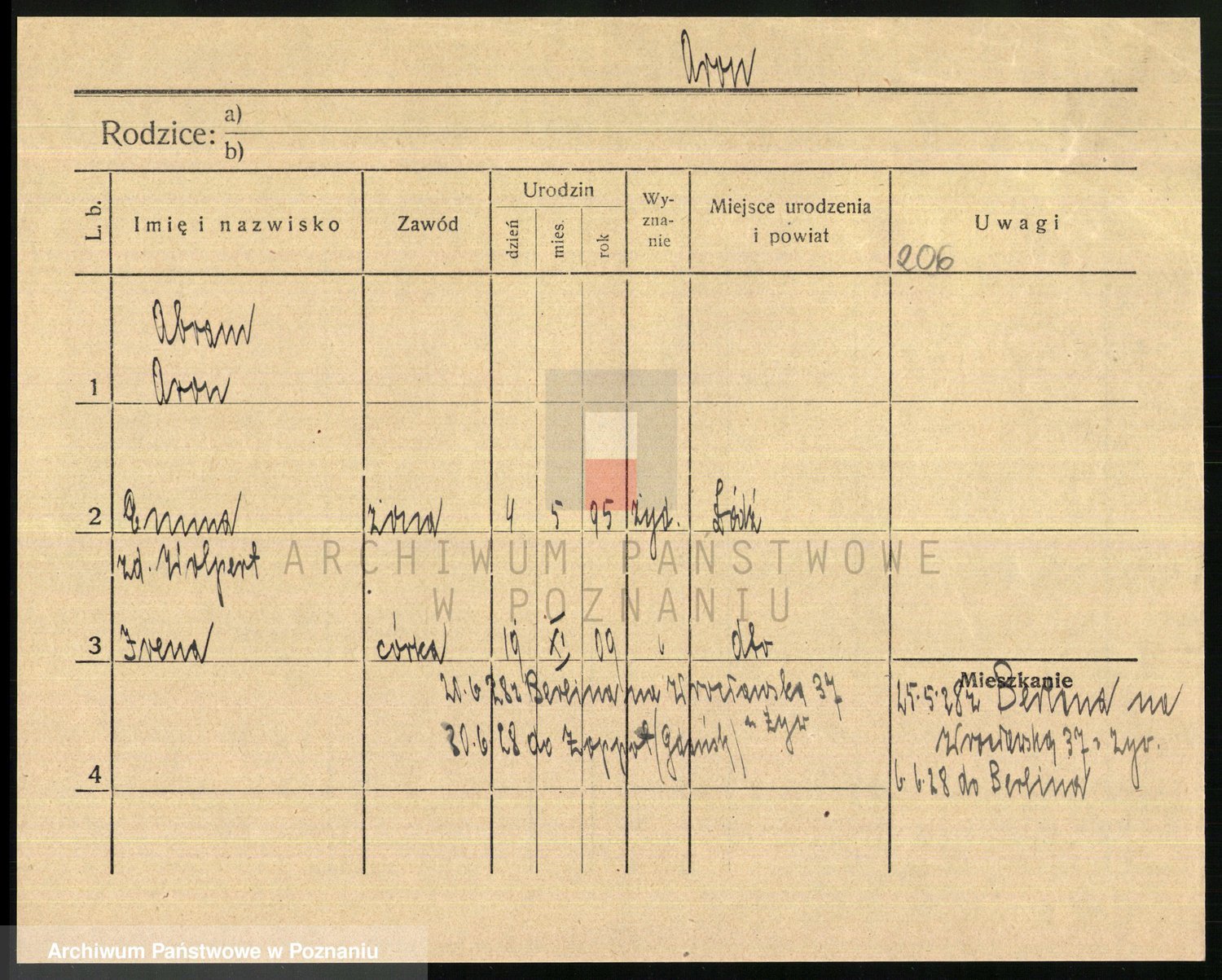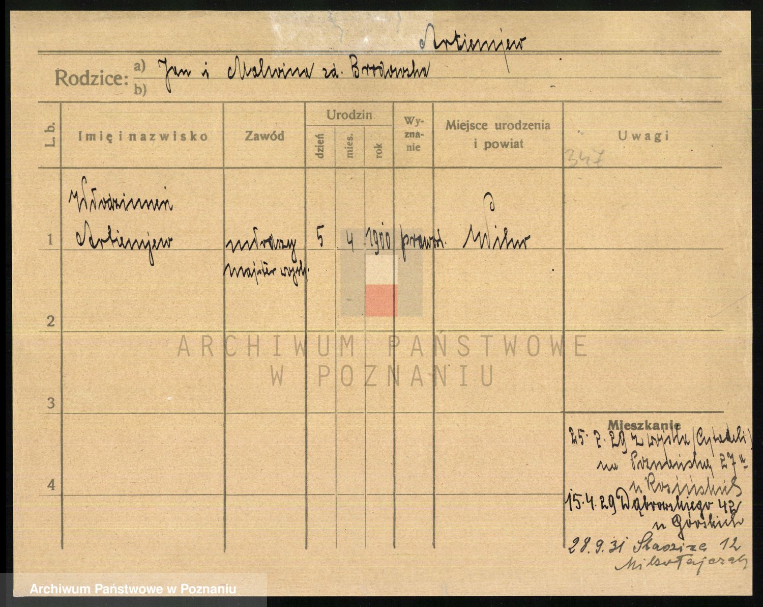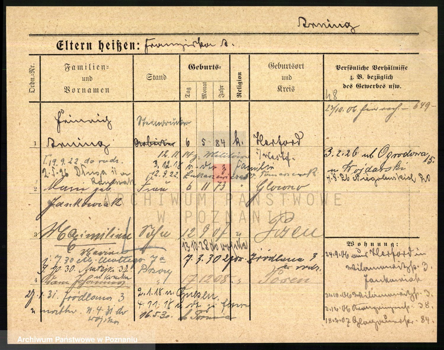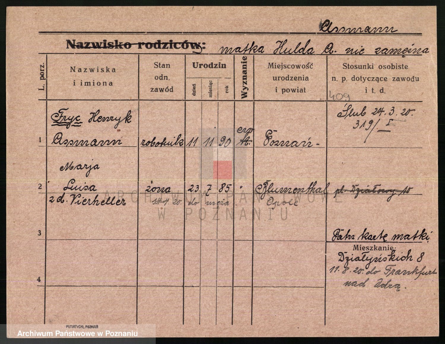 Podgląd karty osobowej dostępny jest po kliknięciu na nazwisko lub ikonkę karty. Można dokonywać powiększenia (ikony na górze) lub przechodzić między kolejnymi skanami (strzałki po bokach).