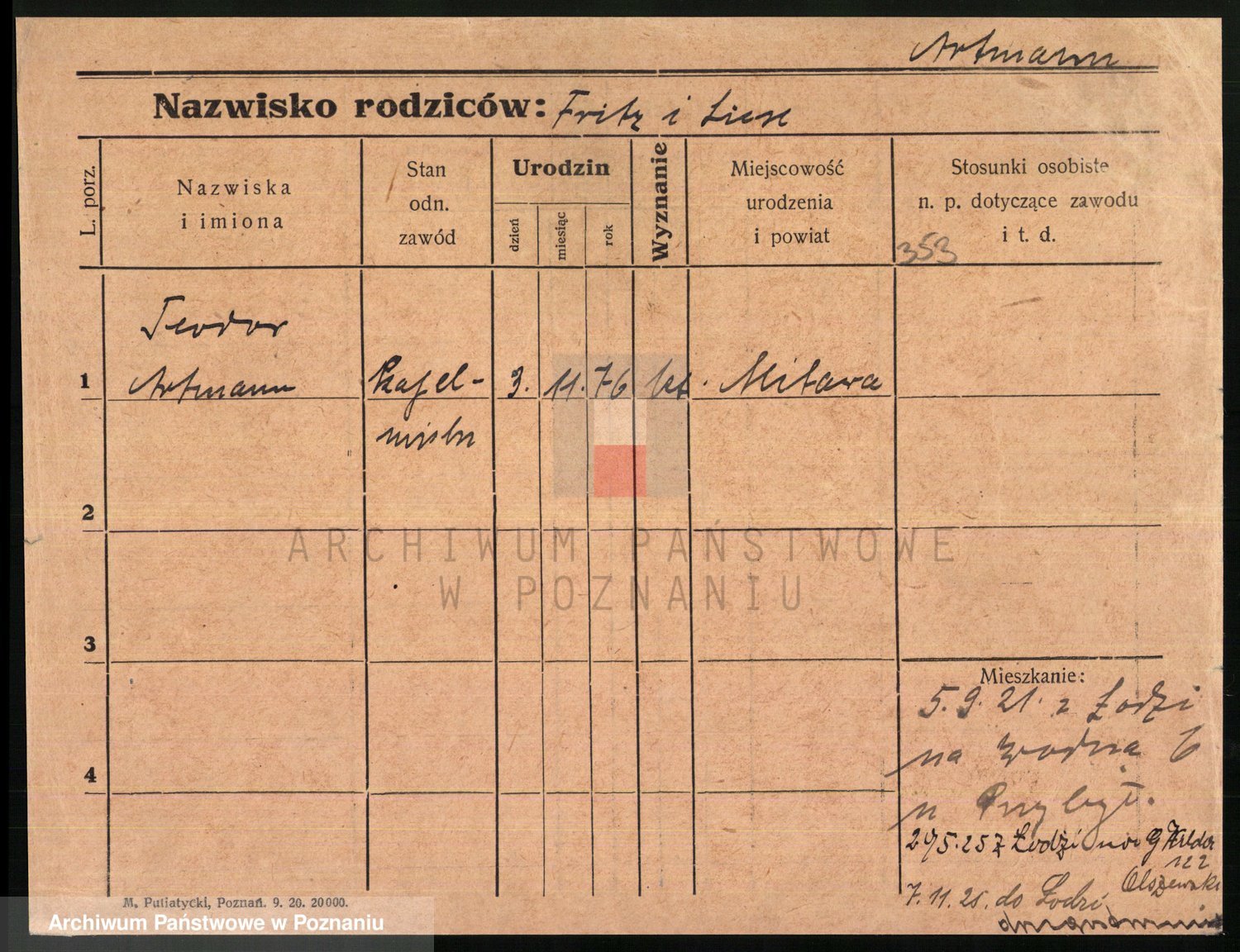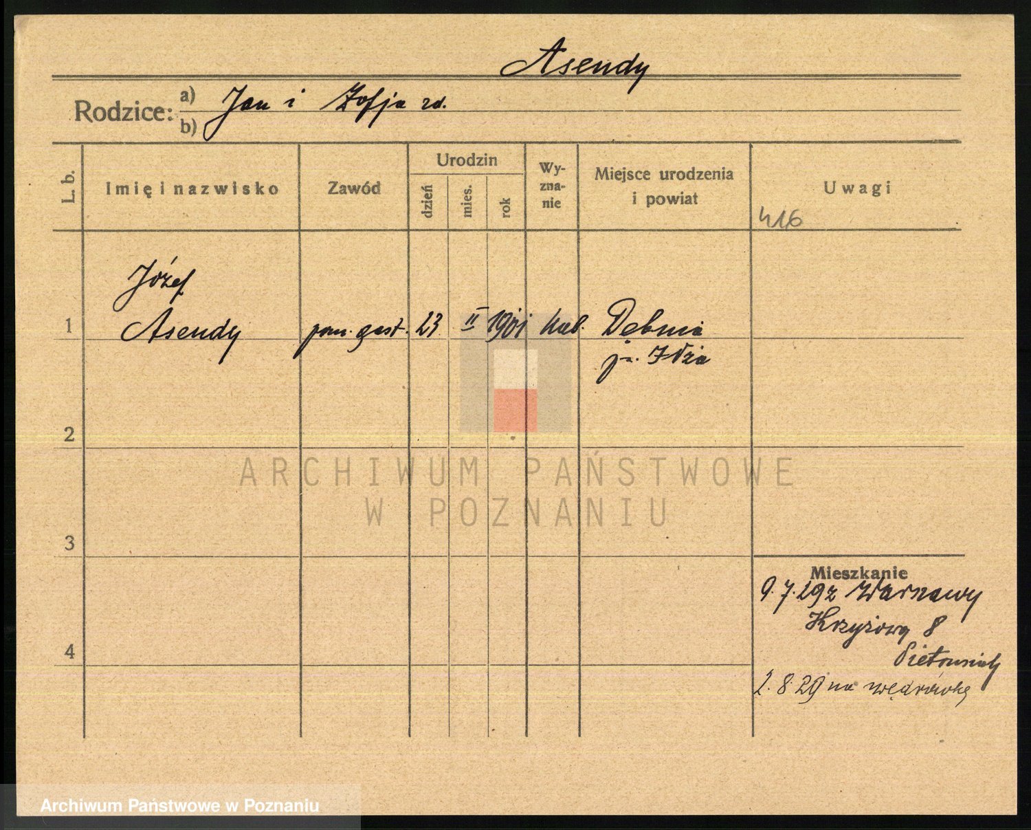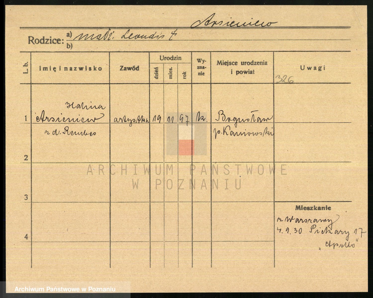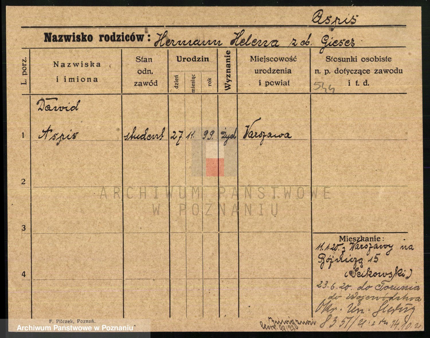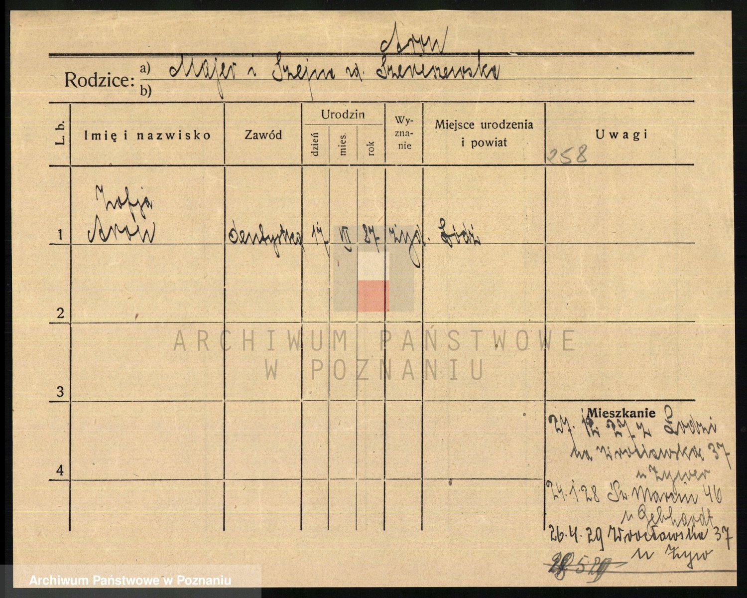 Podgląd karty osobowej dostępny jest po kliknięciu na nazwisko lub ikonkę karty. Można dokonywać powiększenia (ikony na górze) lub przechodzić między kolejnymi skanami (strzałki po bokach).
