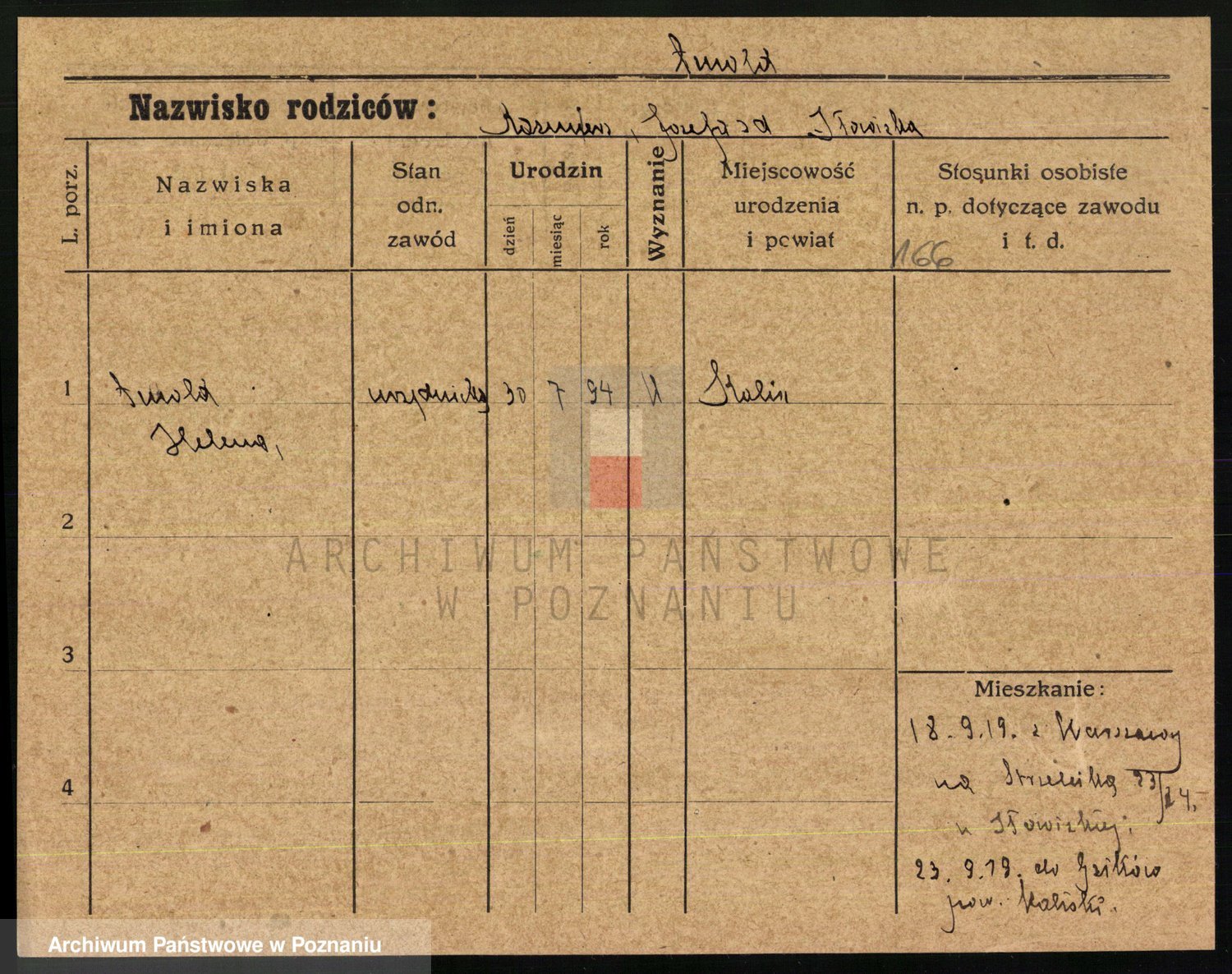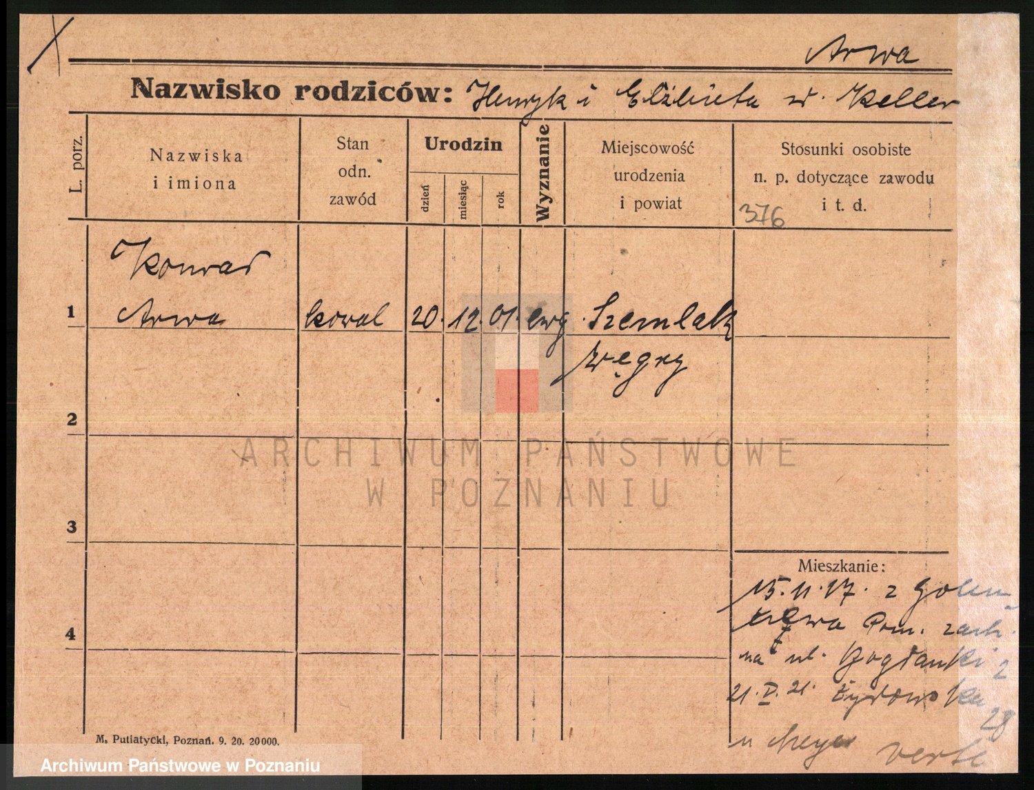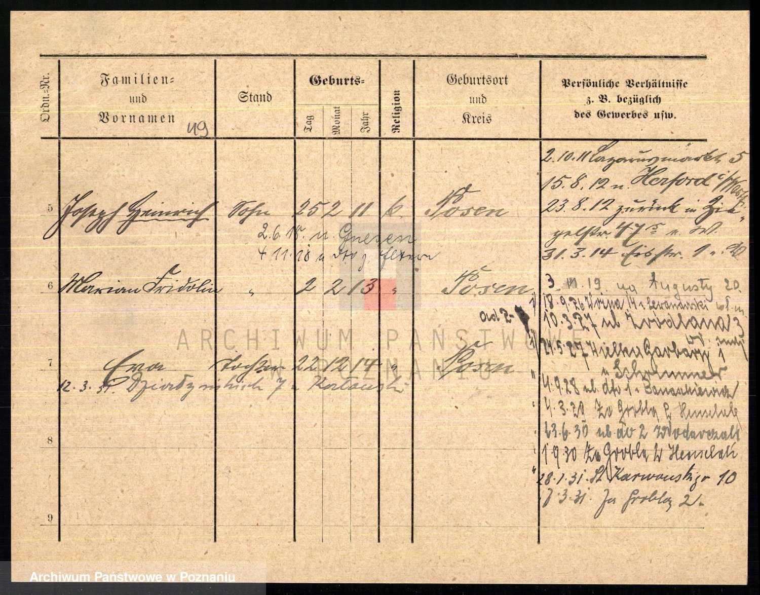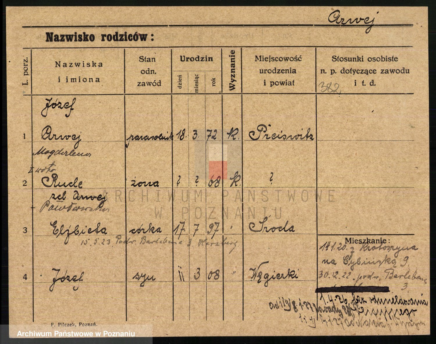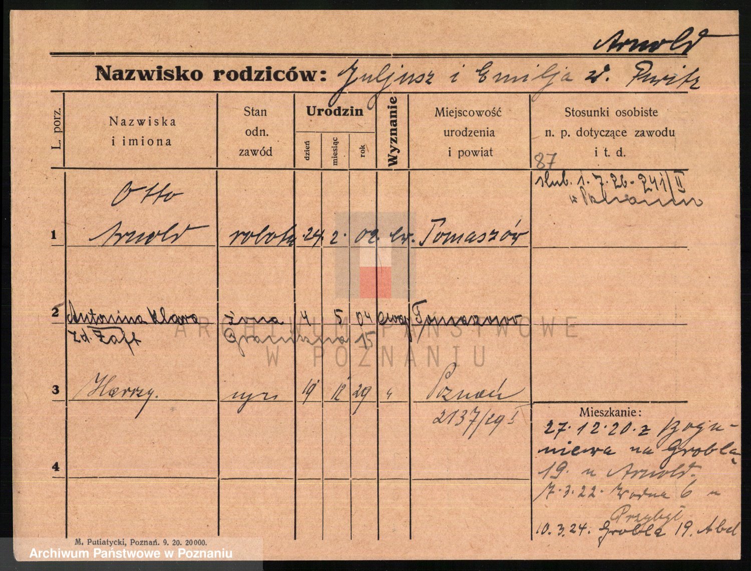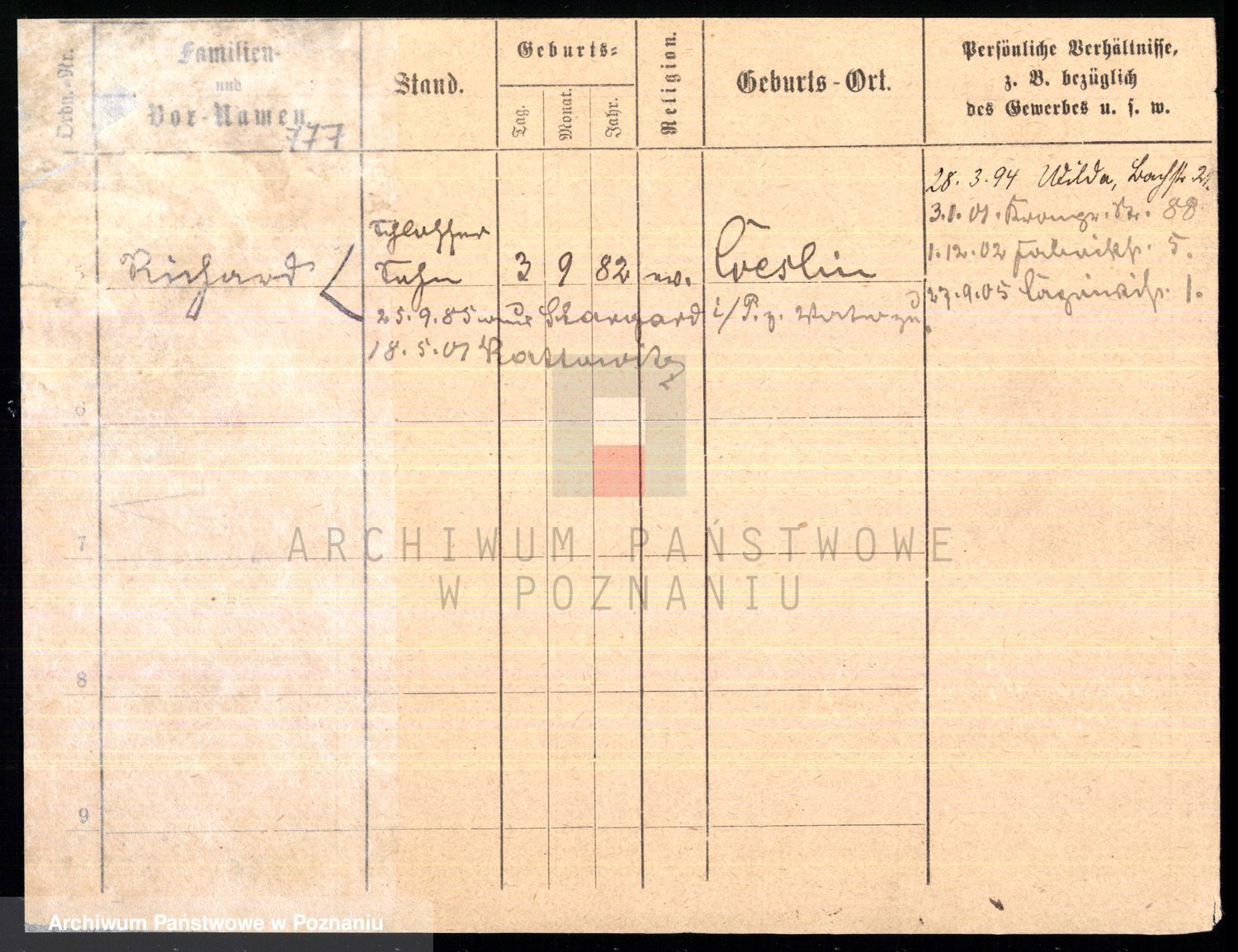 Podgląd karty osobowej dostępny jest po kliknięciu na nazwisko lub ikonkę karty. Można dokonywać powiększenia (ikony na górze) lub przechodzić między kolejnymi skanami (strzałki po bokach).
