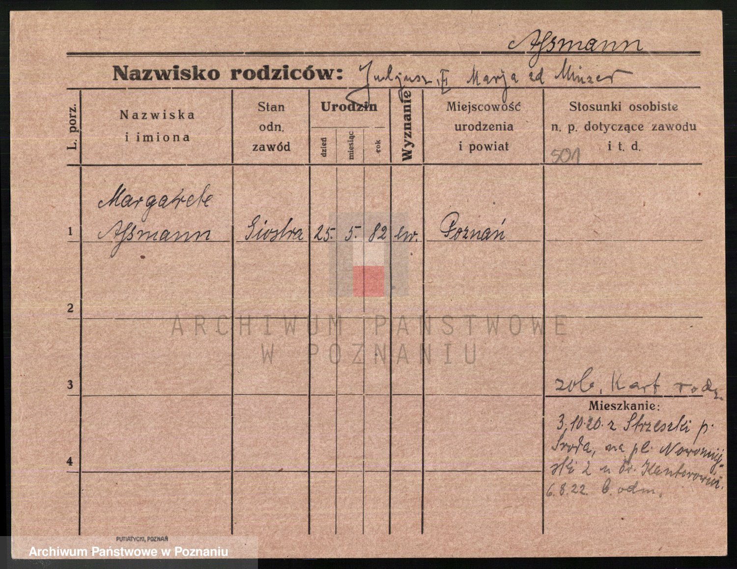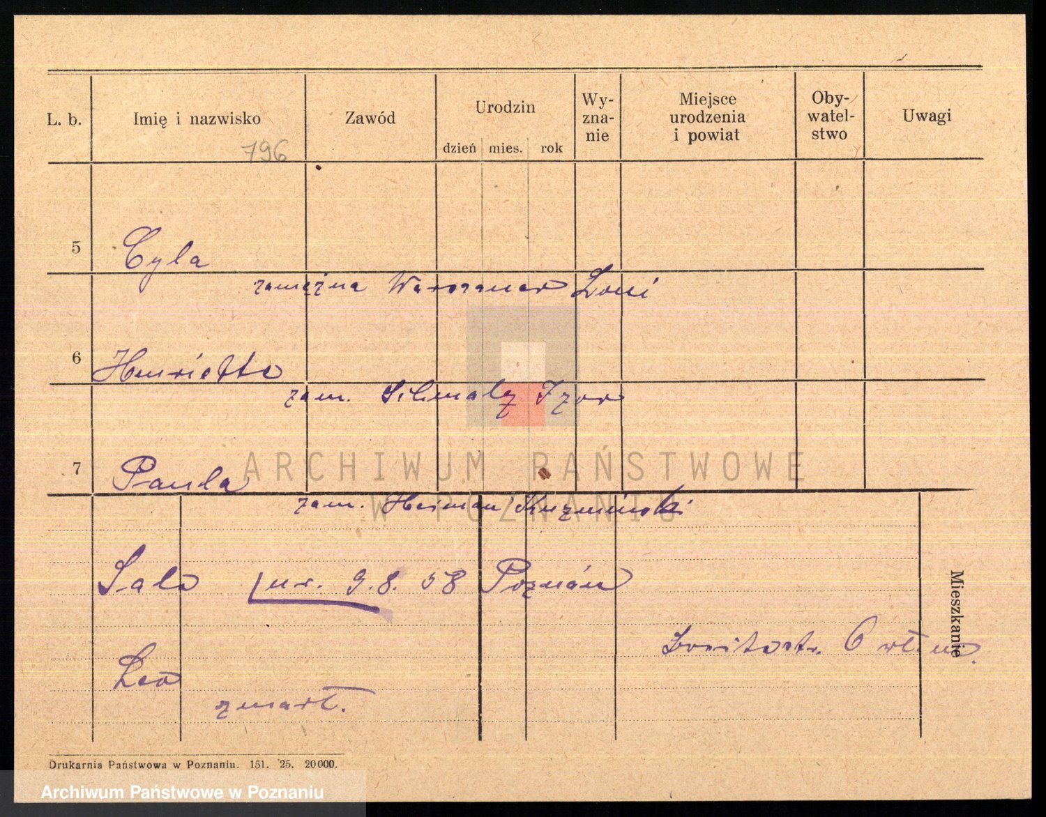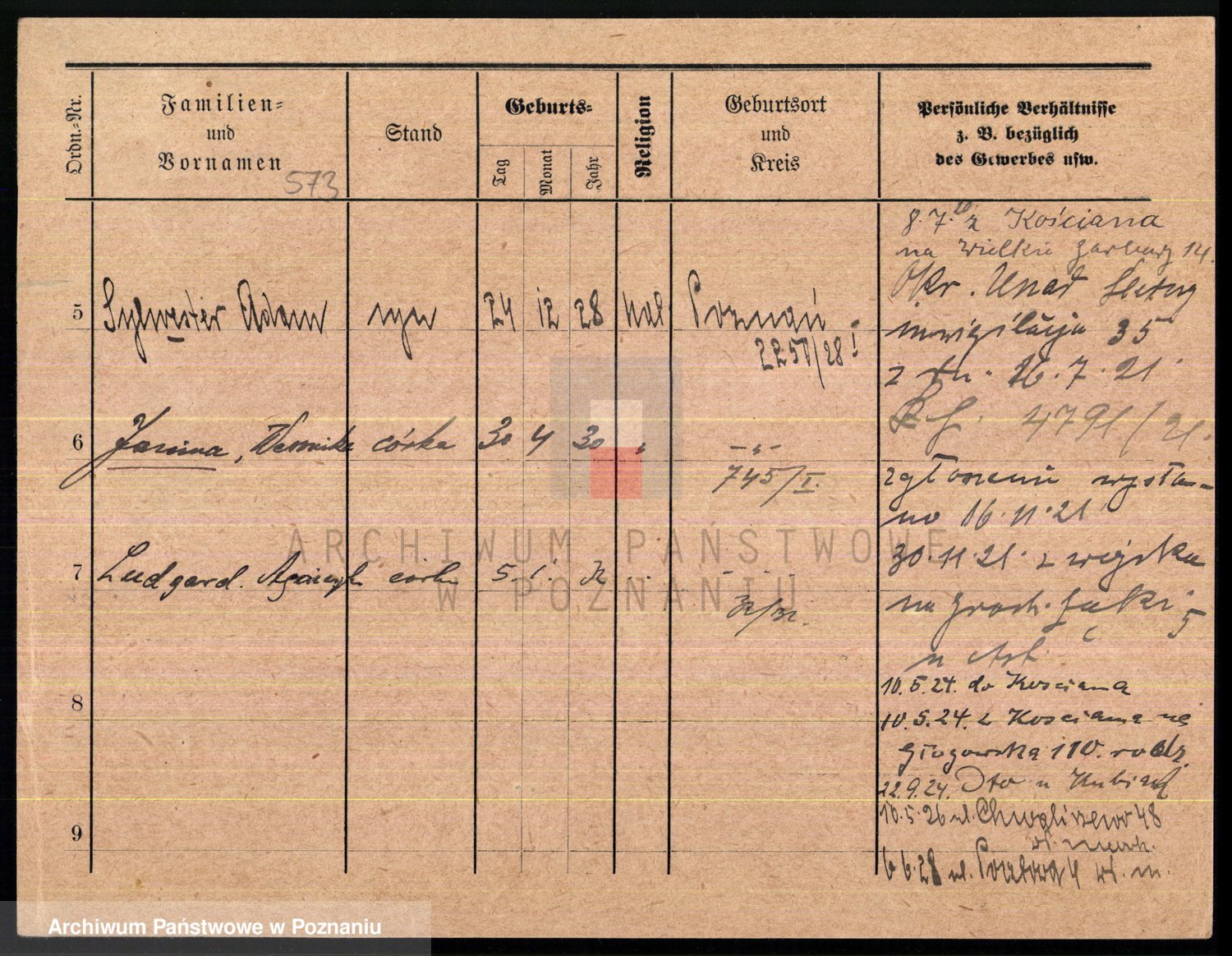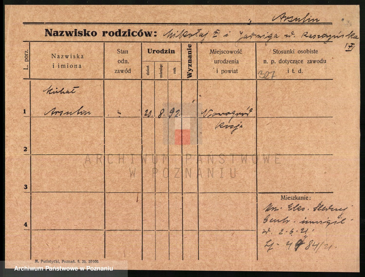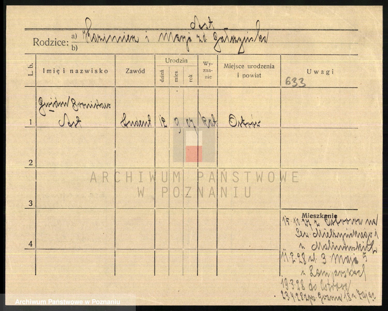 Podgląd karty osobowej dostępny jest po kliknięciu na nazwisko lub ikonkę karty. Można dokonywać powiększenia (ikony na górze) lub przechodzić między kolejnymi skanami (strzałki po bokach).