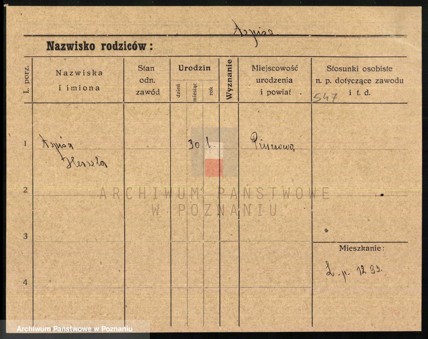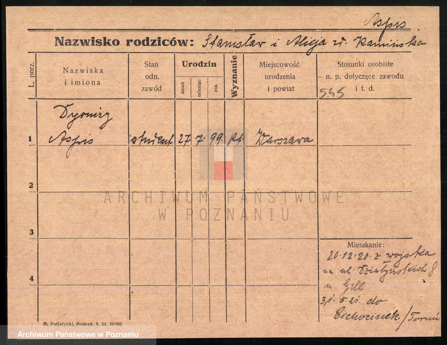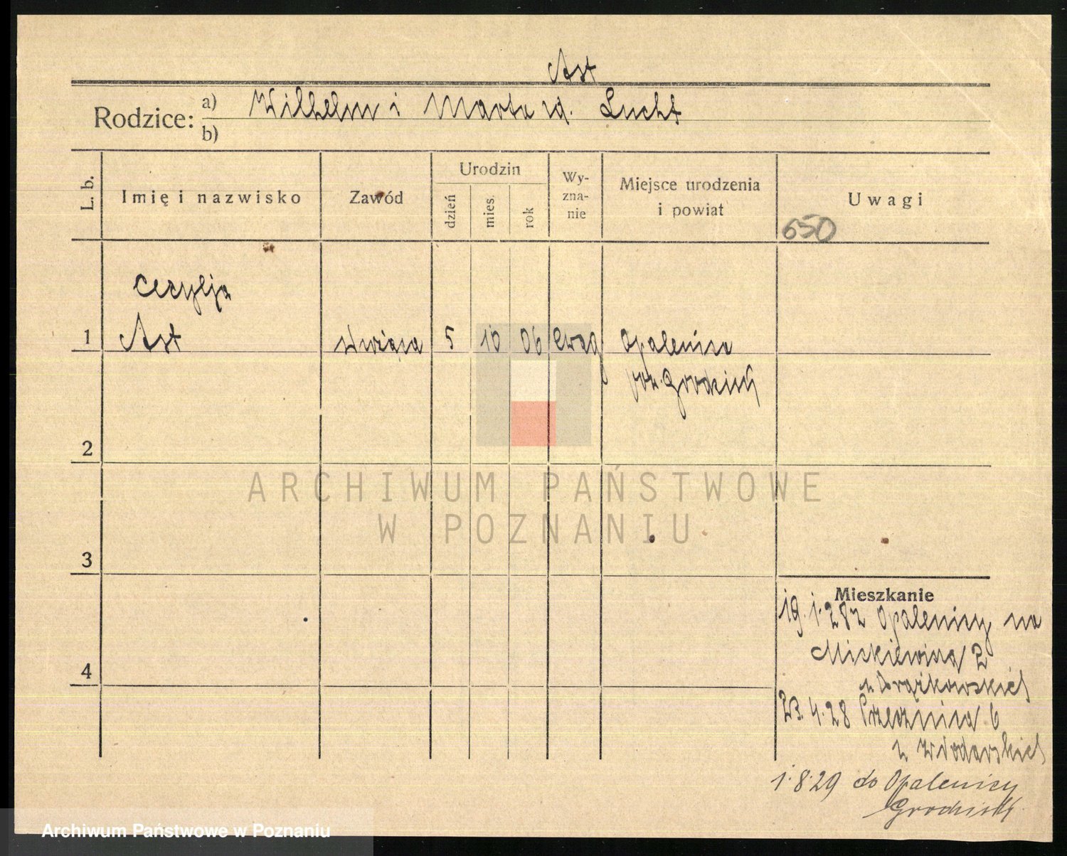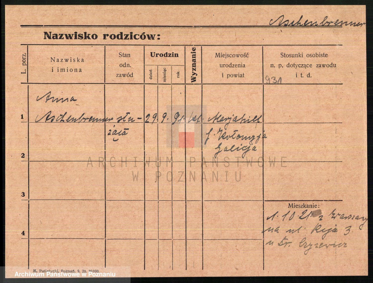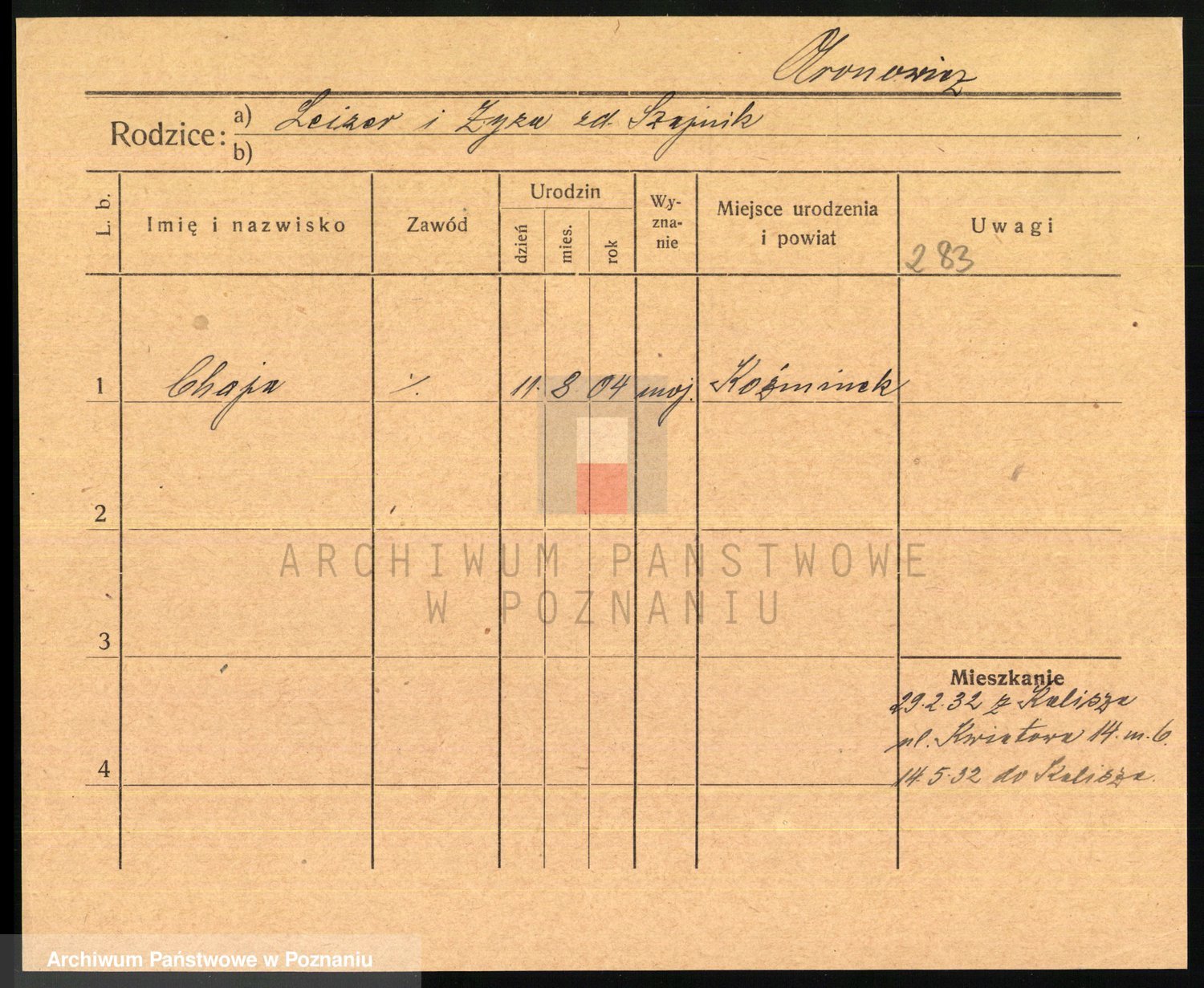 Podgląd karty osobowej dostępny jest po kliknięciu na nazwisko lub ikonkę karty. Można dokonywać powiększenia (ikony na górze) lub przechodzić między kolejnymi skanami (strzałki po bokach).