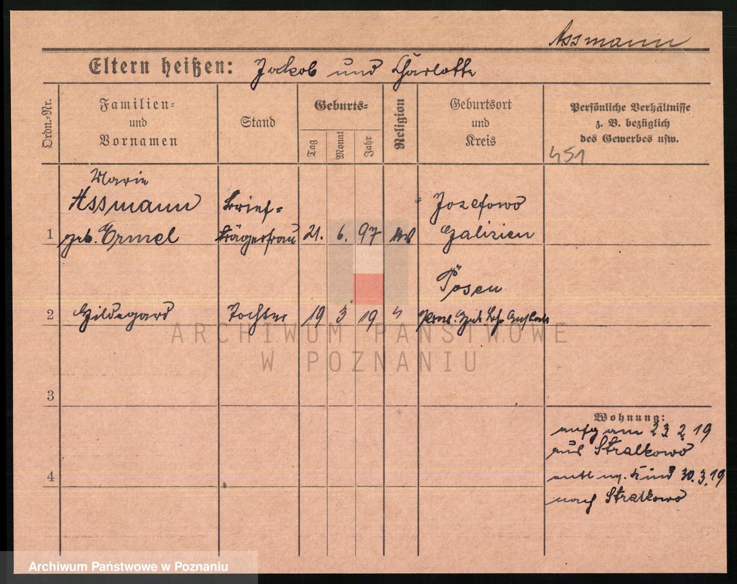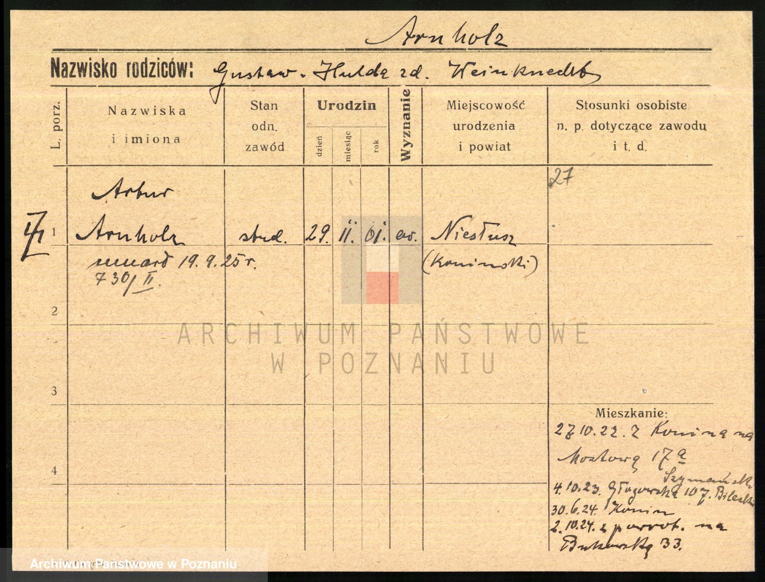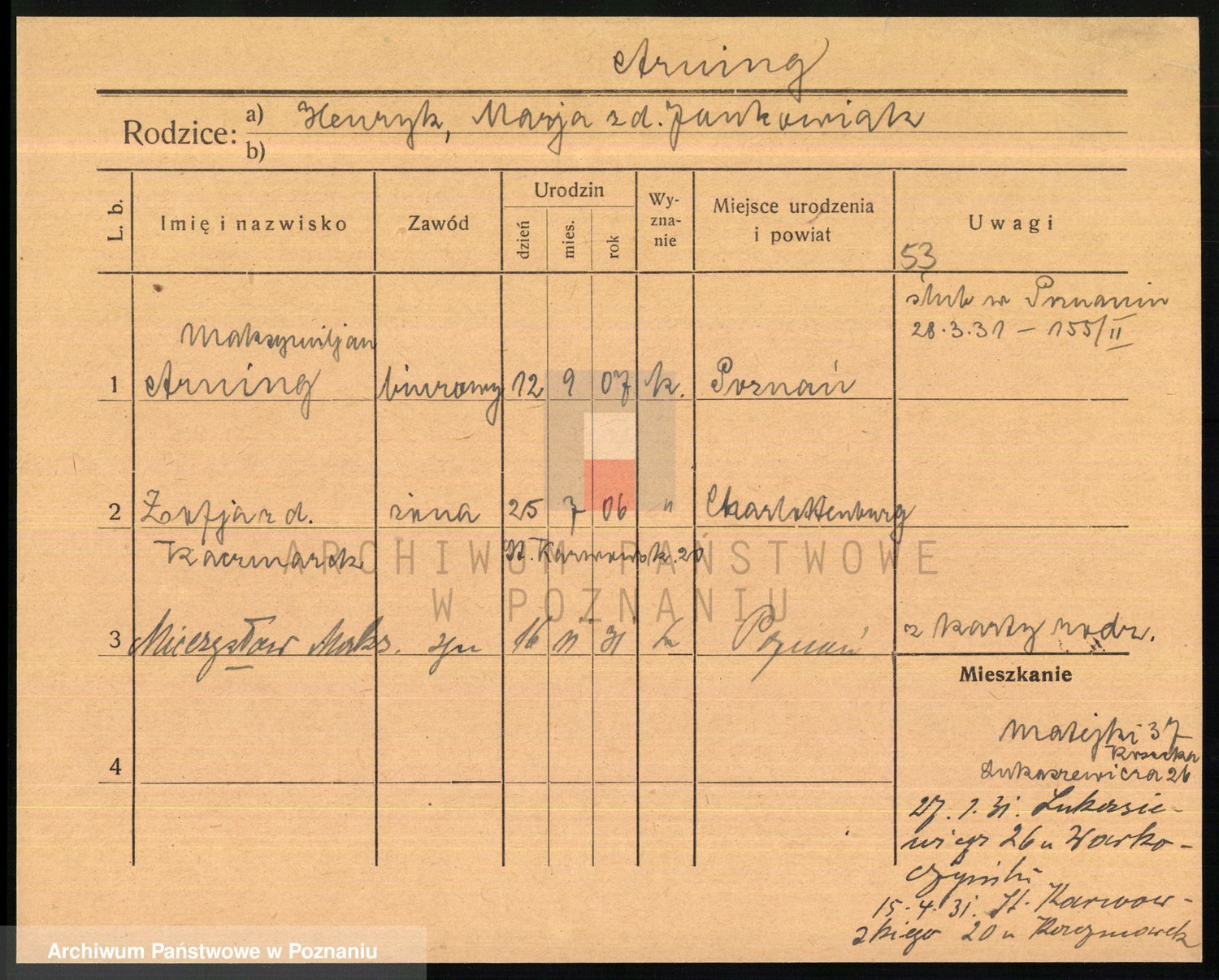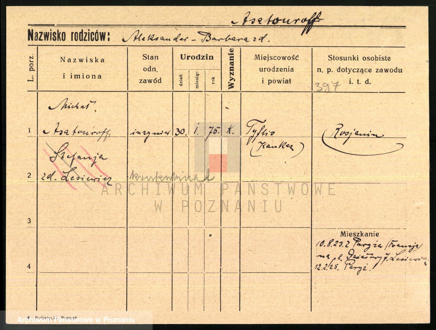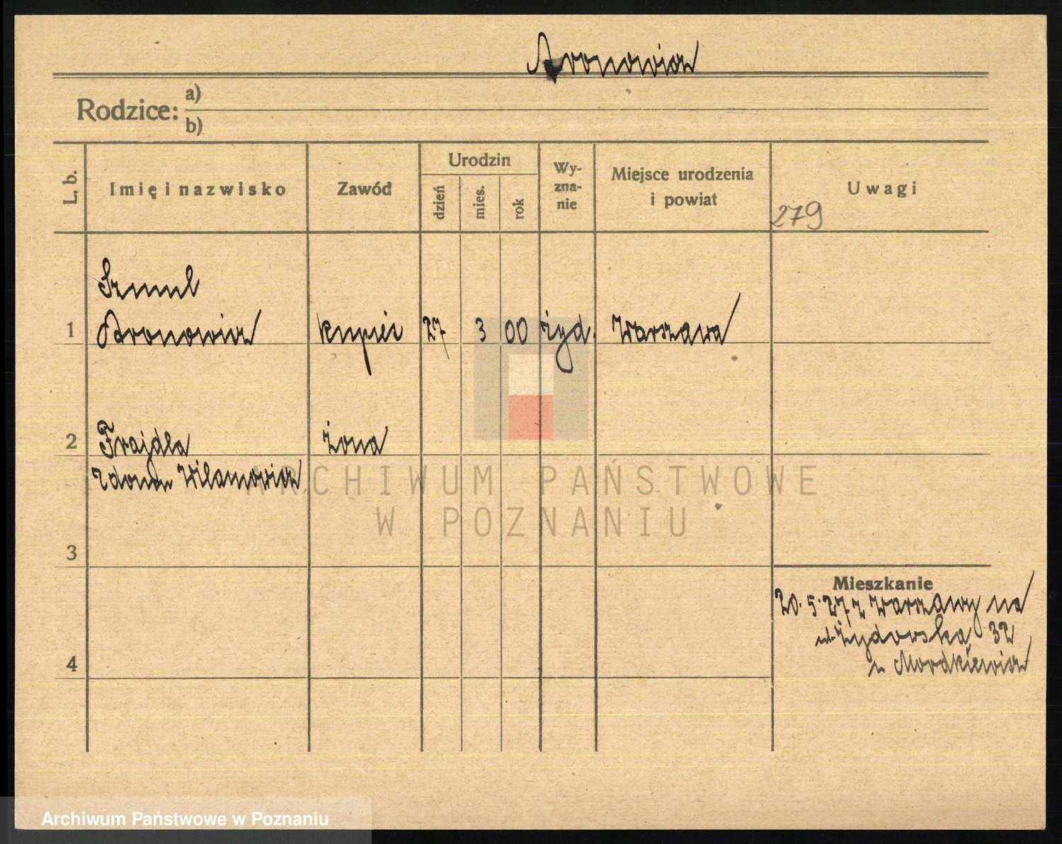 Podgląd karty osobowej dostępny jest po kliknięciu na nazwisko lub ikonkę karty. Można dokonywać powiększenia (ikony na górze) lub przechodzić między kolejnymi skanami (strzałki po bokach).