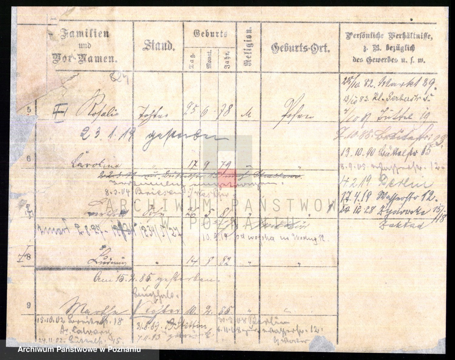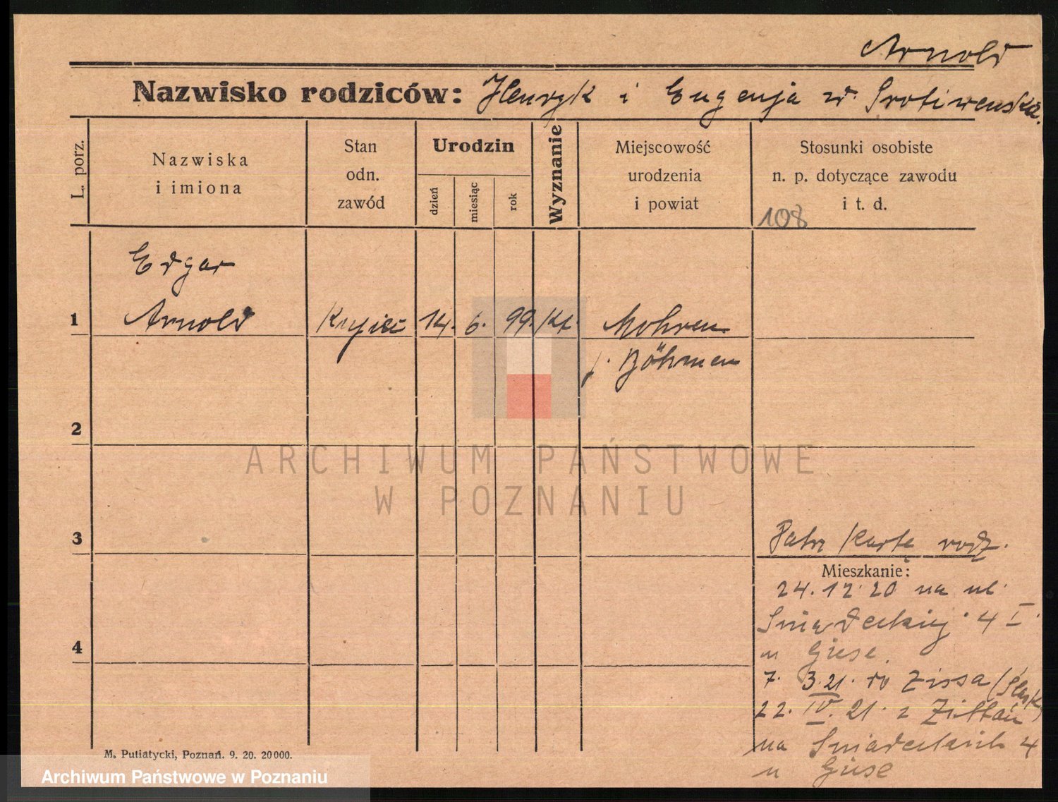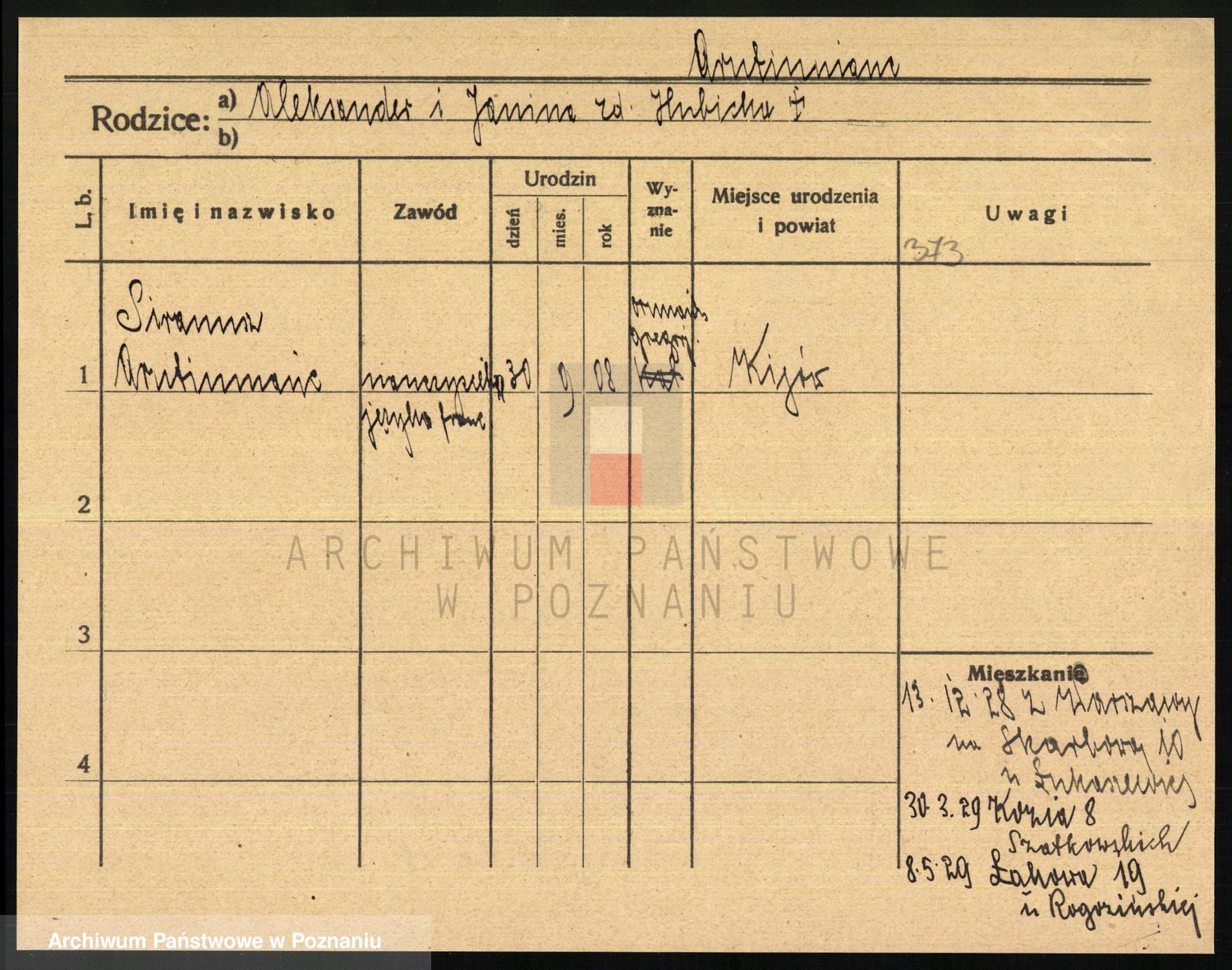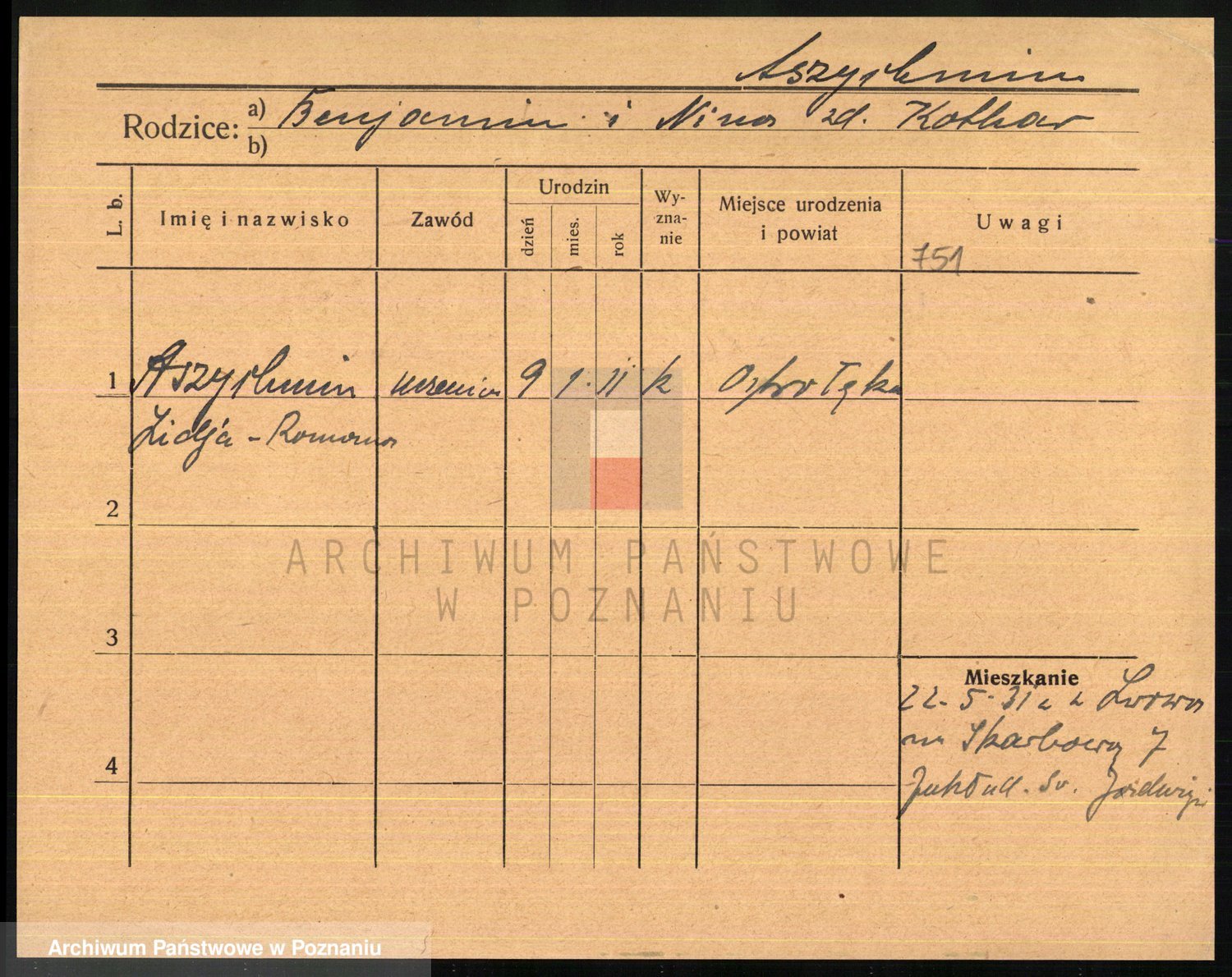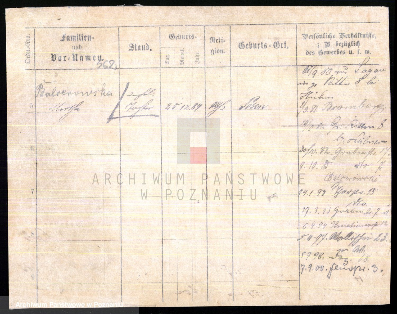 Podgląd karty osobowej dostępny jest po kliknięciu na nazwisko lub ikonkę karty. Można dokonywać powiększenia (ikony na górze) lub przechodzić między kolejnymi skanami (strzałki po bokach).