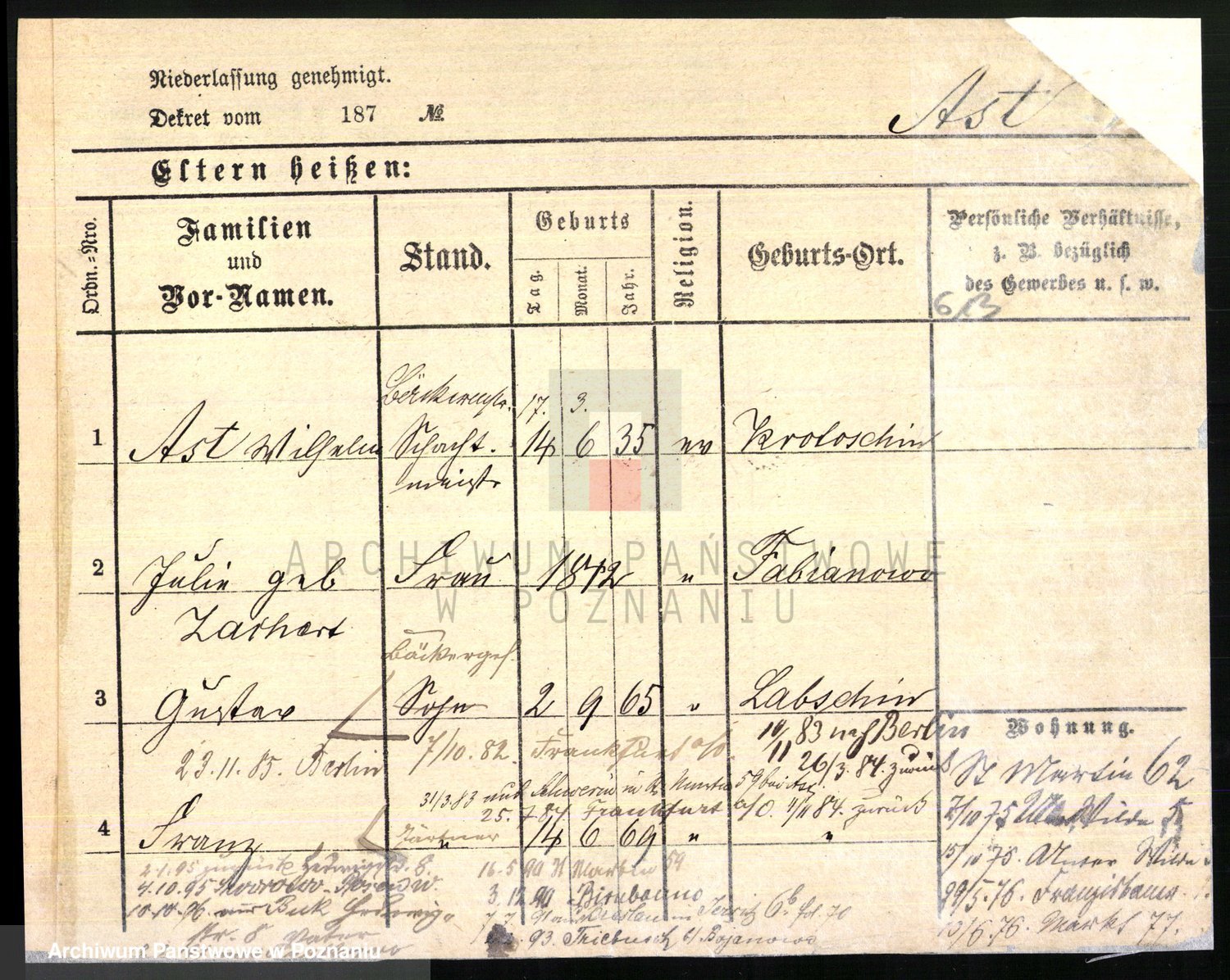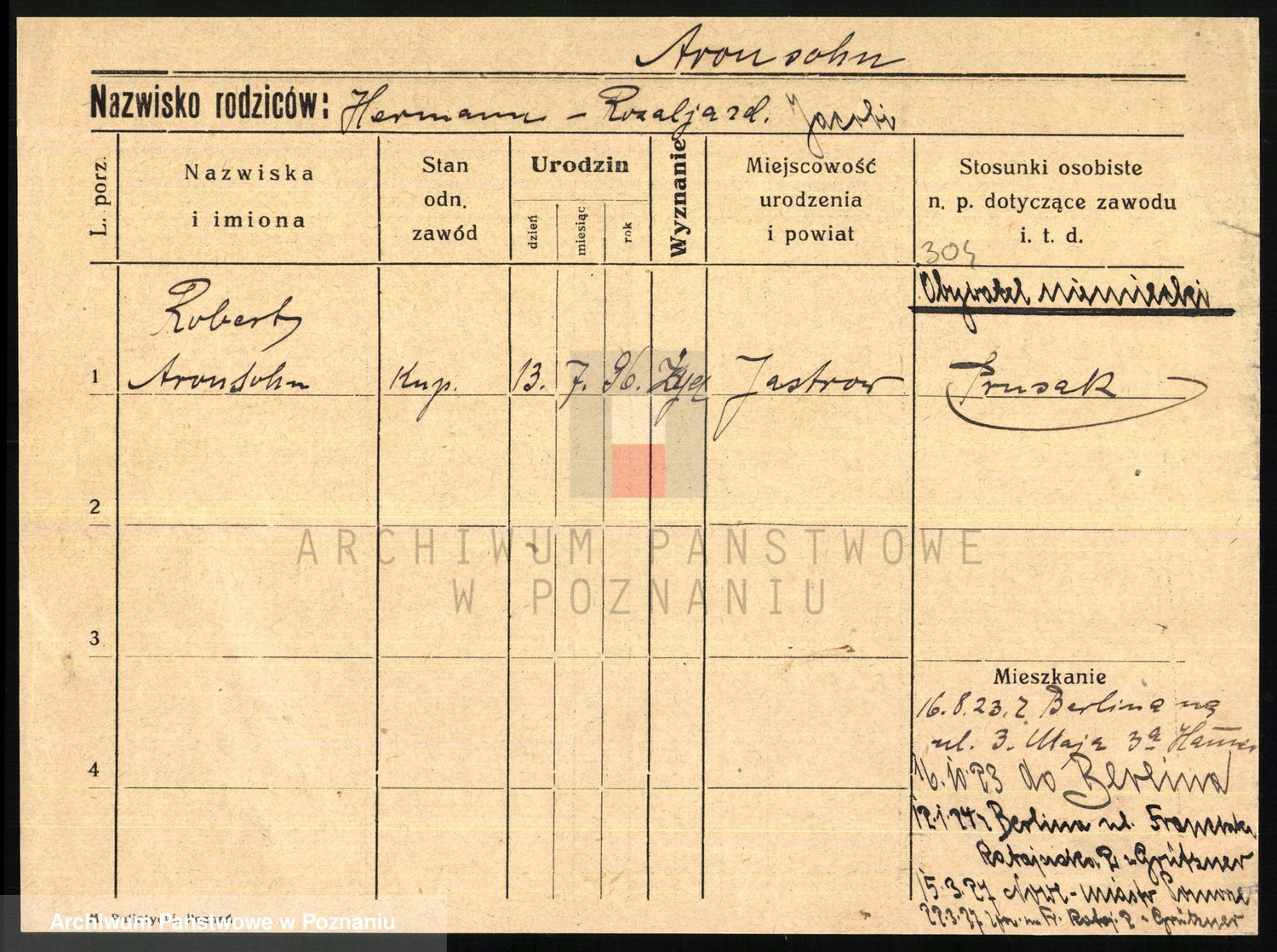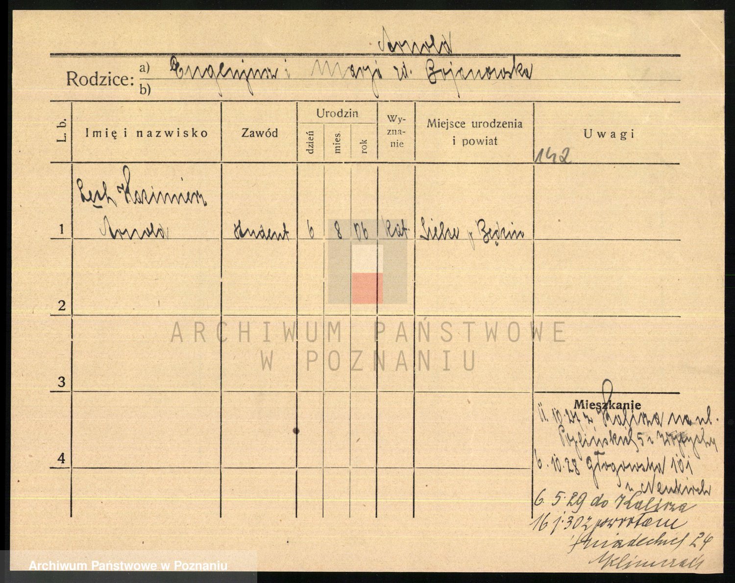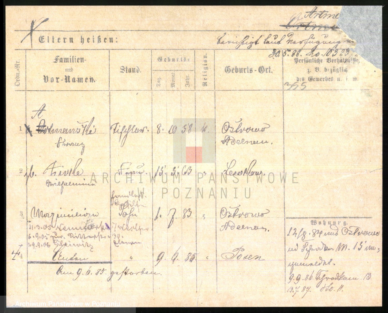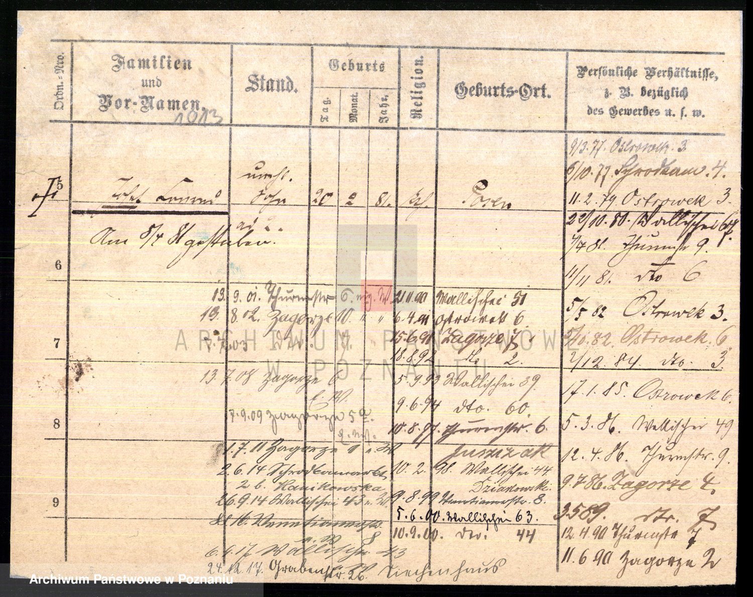 Podgląd karty osobowej dostępny jest po kliknięciu na nazwisko lub ikonkę karty. Można dokonywać powiększenia (ikony na górze) lub przechodzić między kolejnymi skanami (strzałki po bokach).