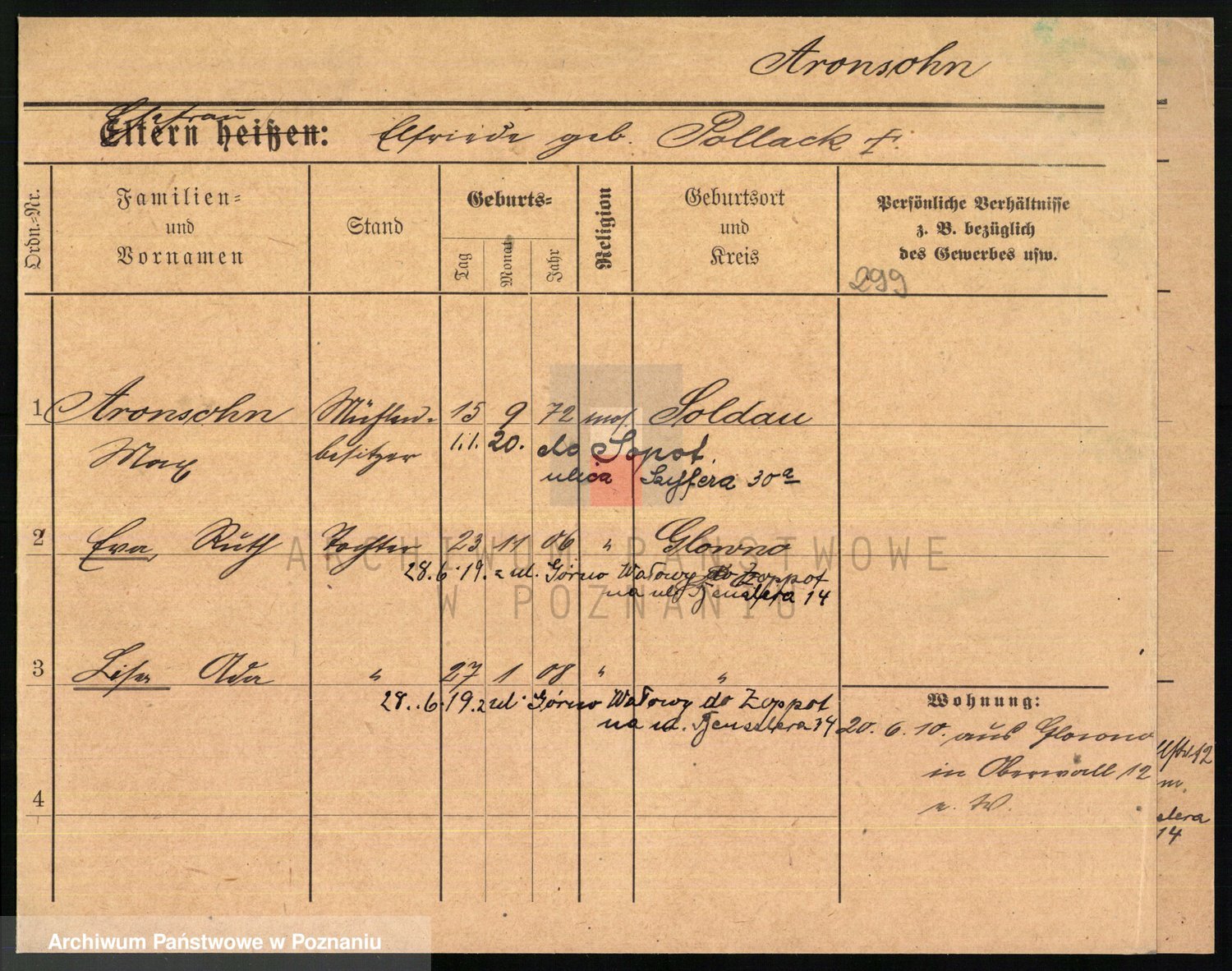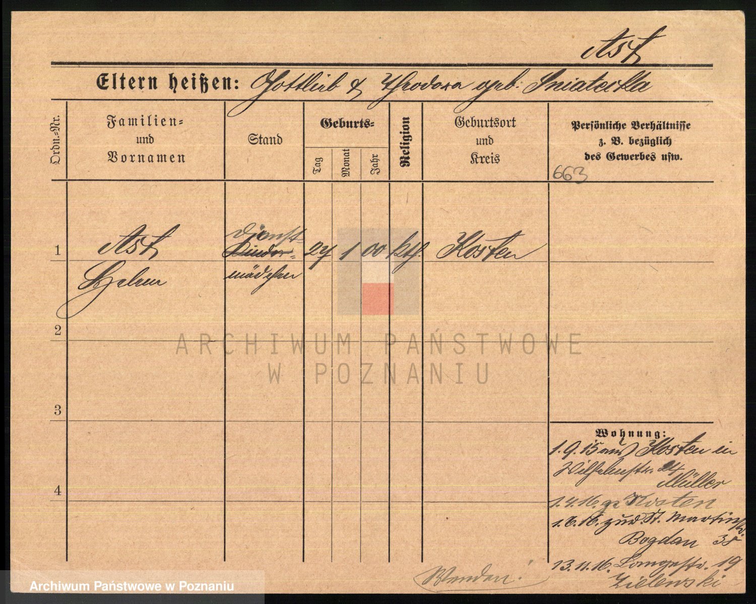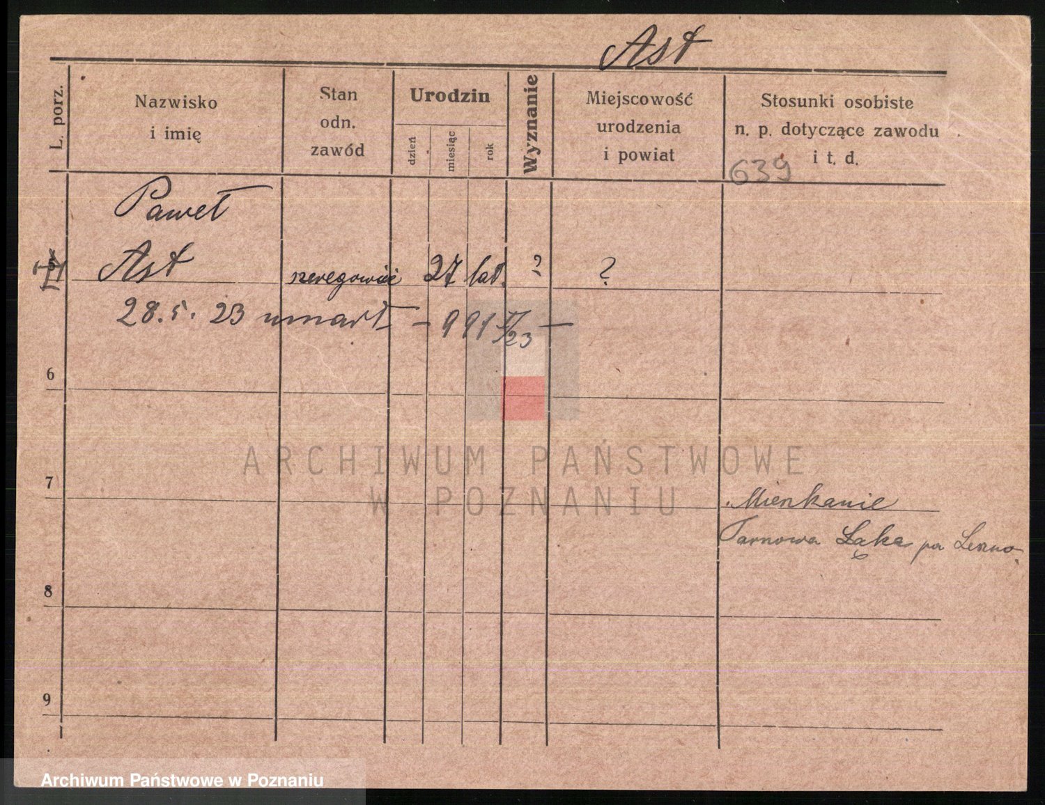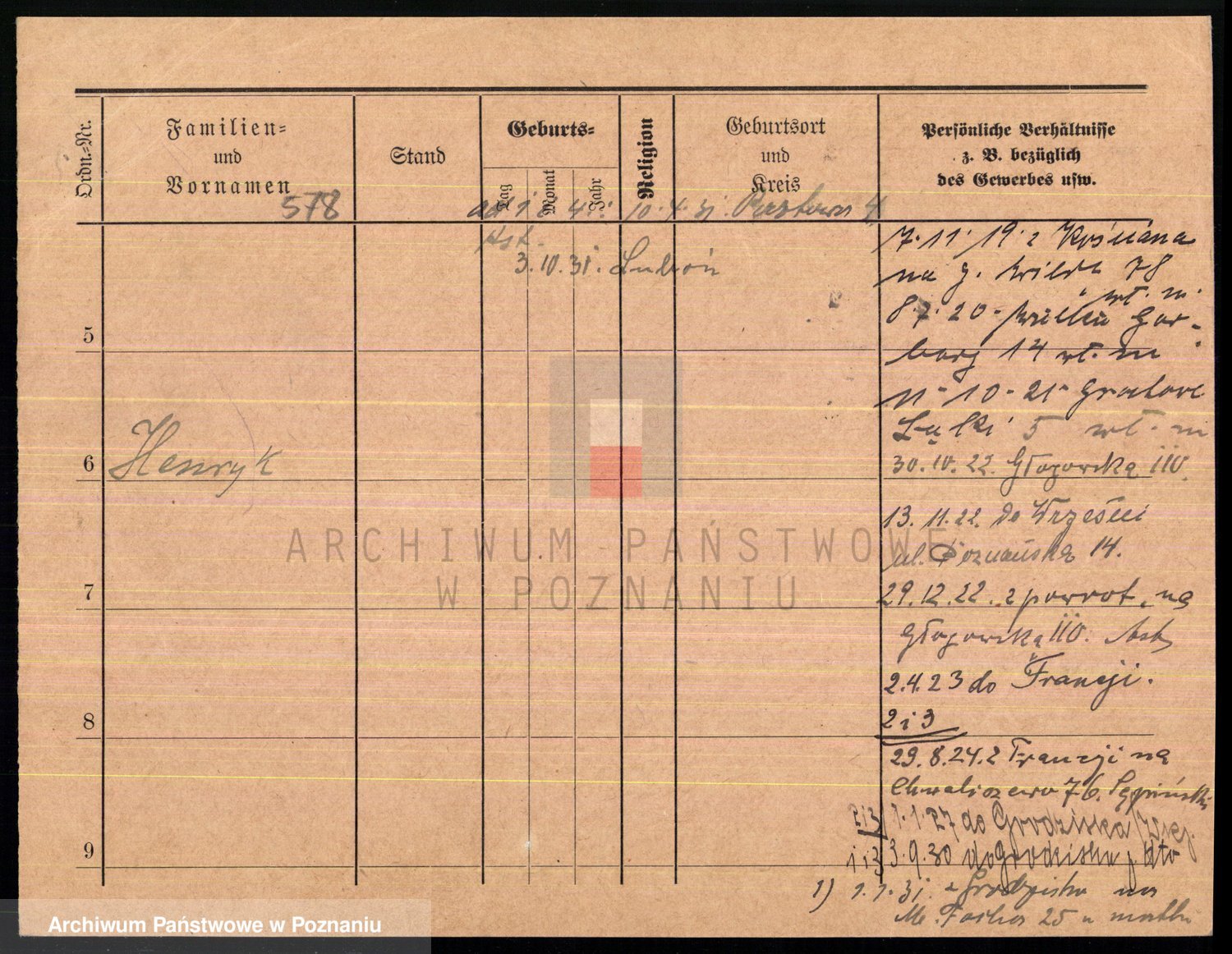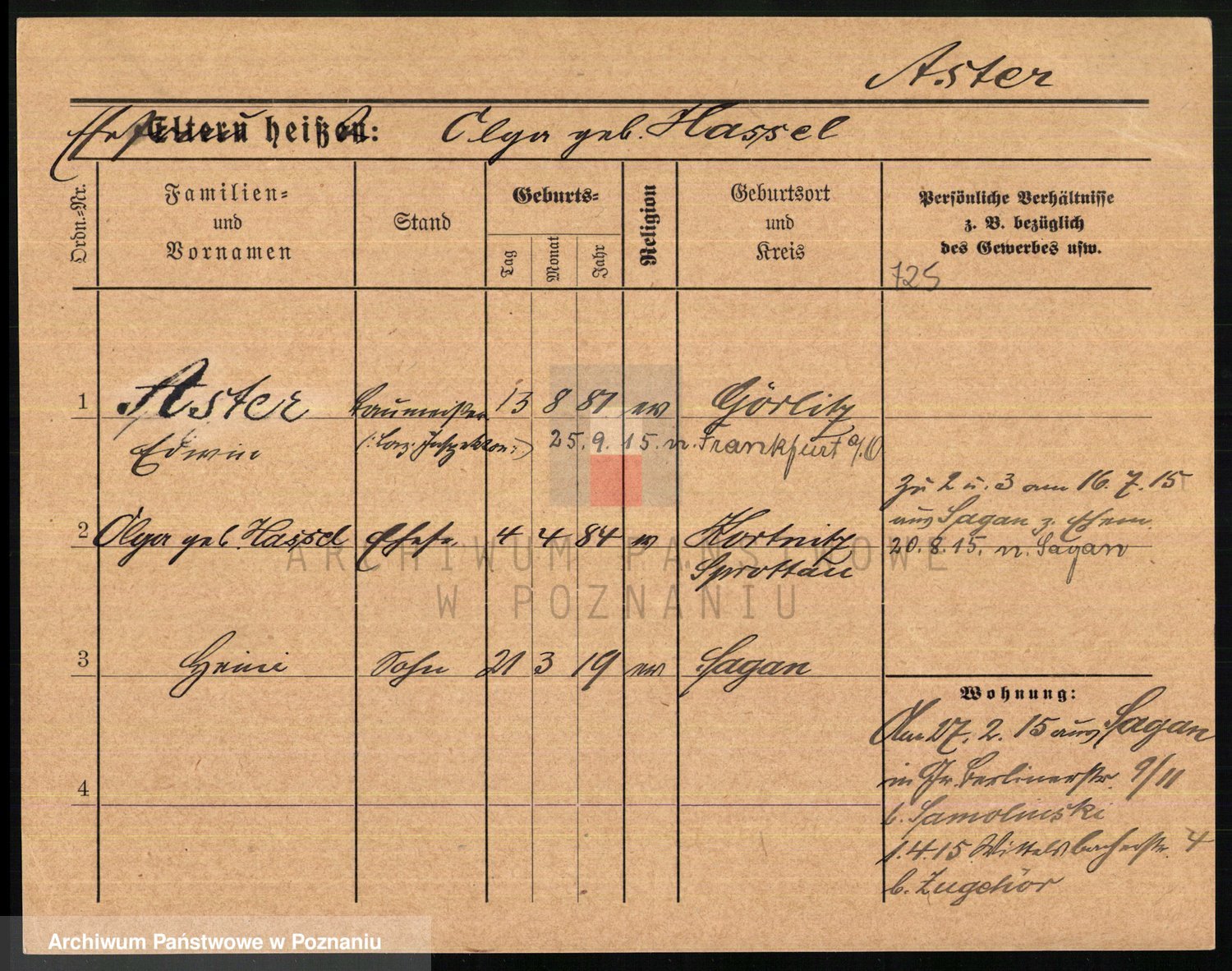 Podgląd karty osobowej dostępny jest po kliknięciu na nazwisko lub ikonkę karty. Można dokonywać powiększenia (ikony na górze) lub przechodzić między kolejnymi skanami (strzałki po bokach).