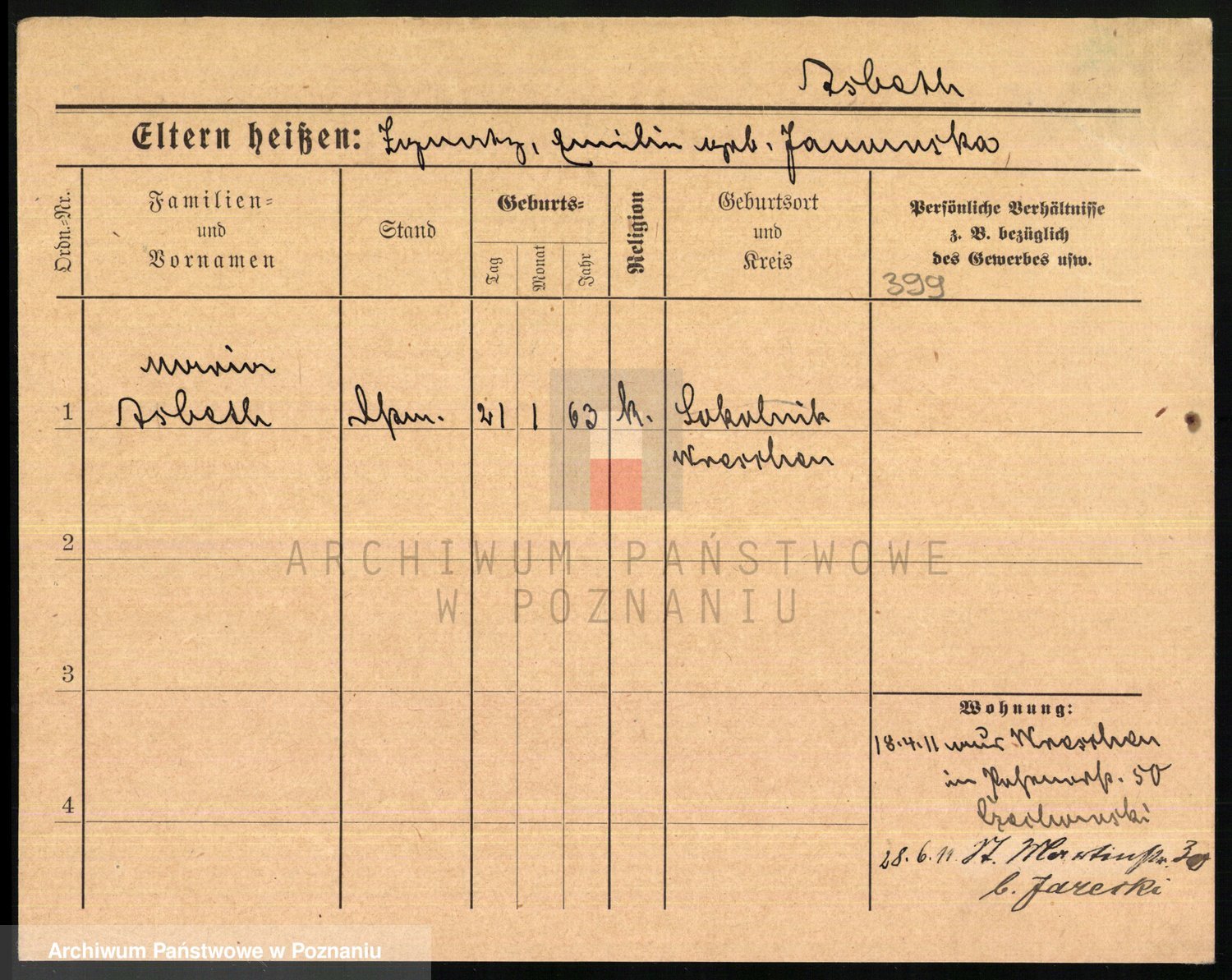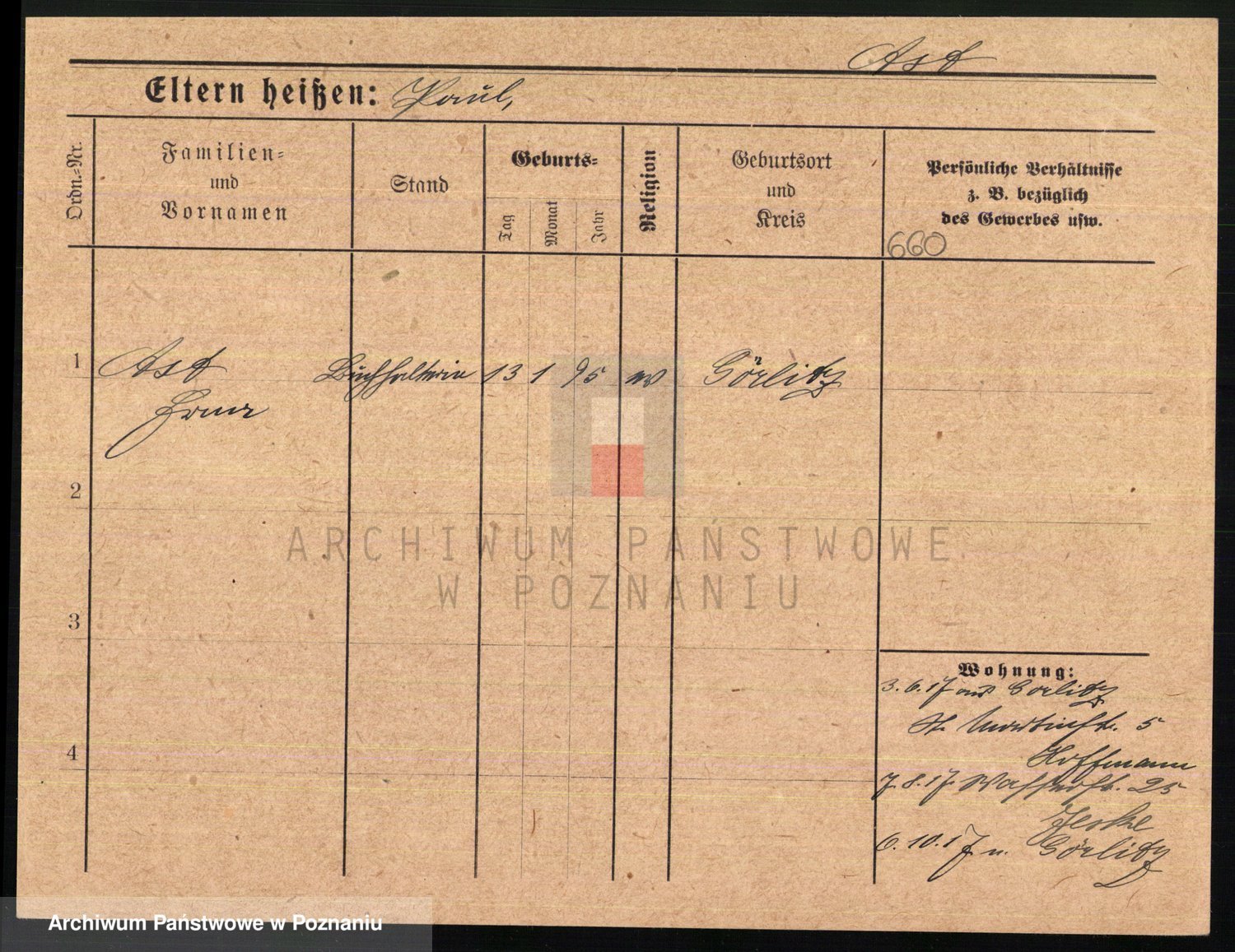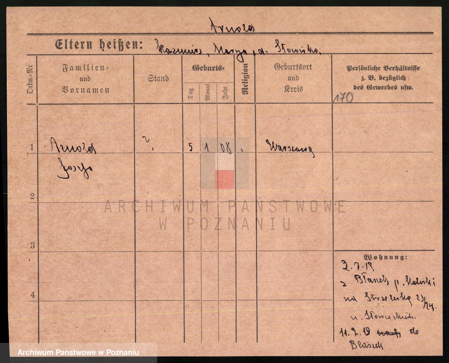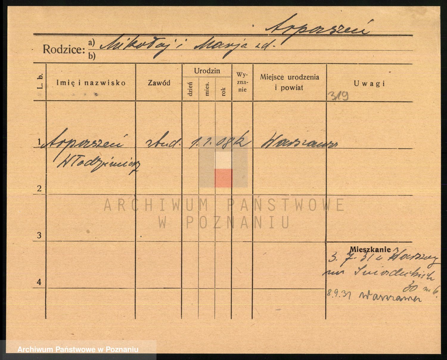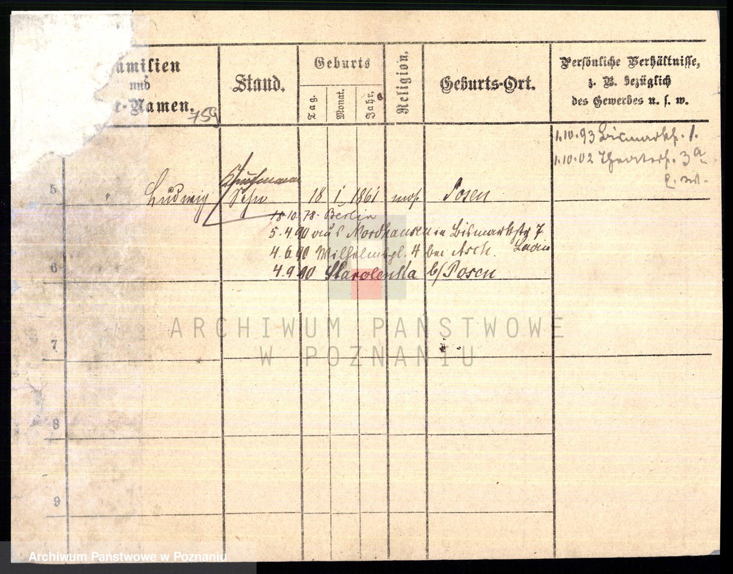 Podgląd karty osobowej dostępny jest po kliknięciu na nazwisko lub ikonkę karty. Można dokonywać powiększenia (ikony na górze) lub przechodzić między kolejnymi skanami (strzałki po bokach).