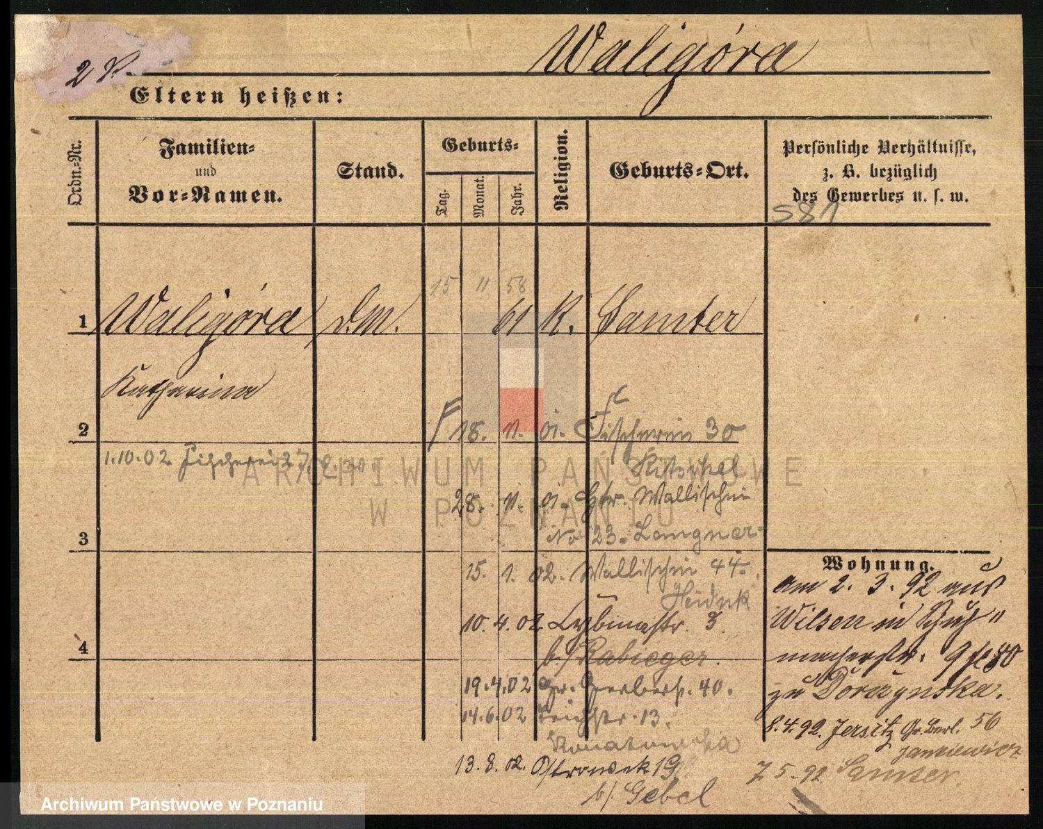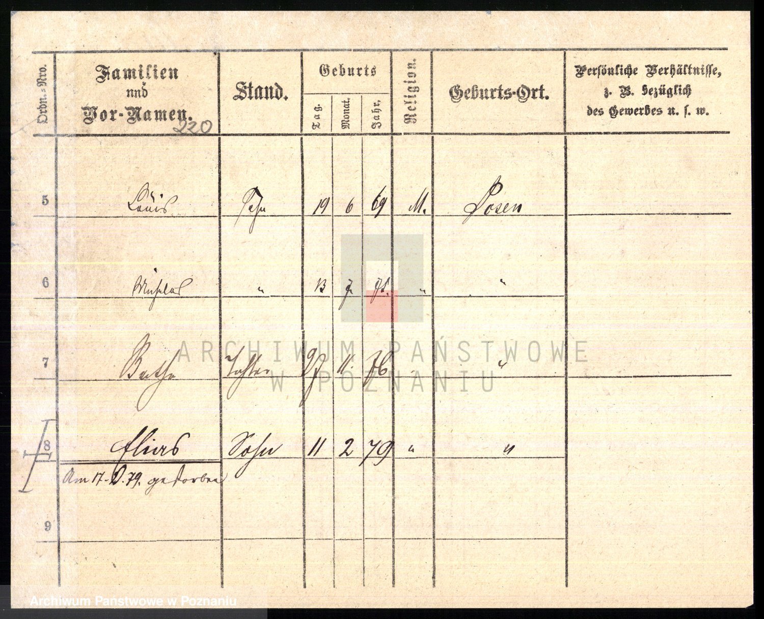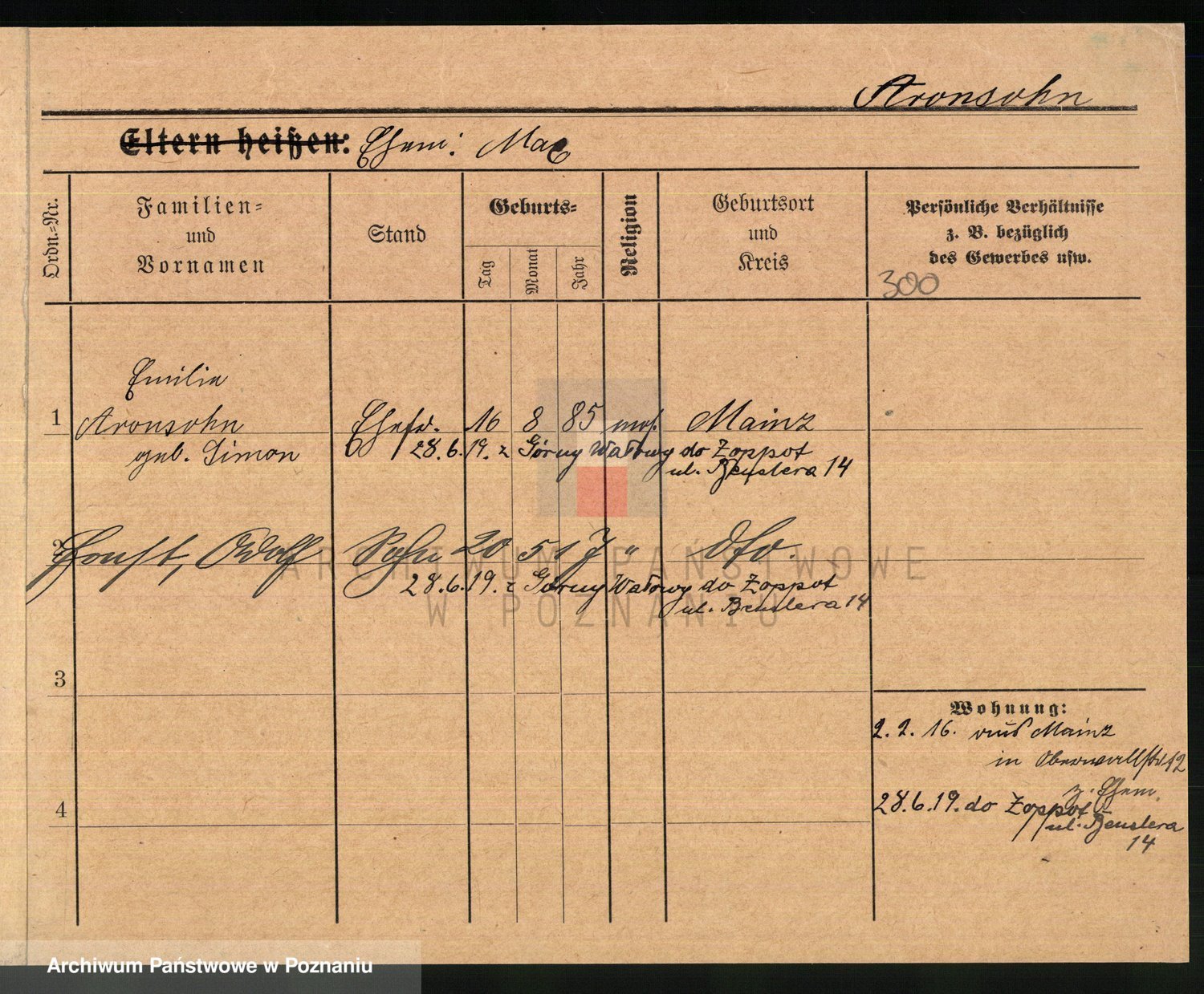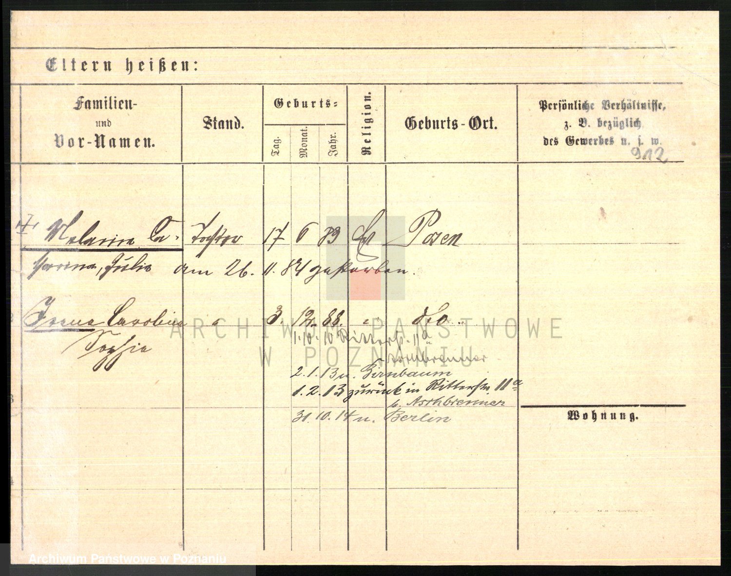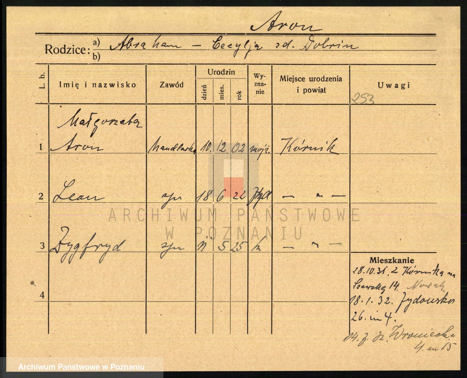 Podgląd karty osobowej dostępny jest po kliknięciu na nazwisko lub ikonkę karty. Można dokonywać powiększenia (ikony na górze) lub przechodzić między kolejnymi skanami (strzałki po bokach).