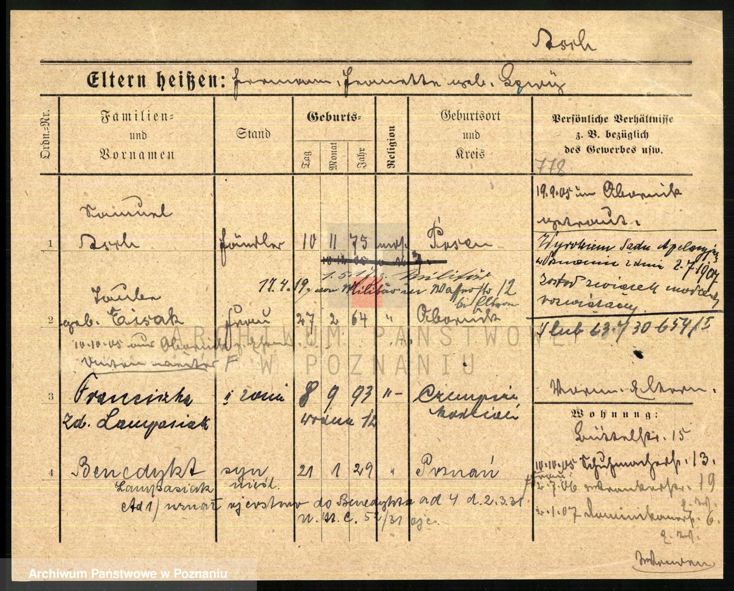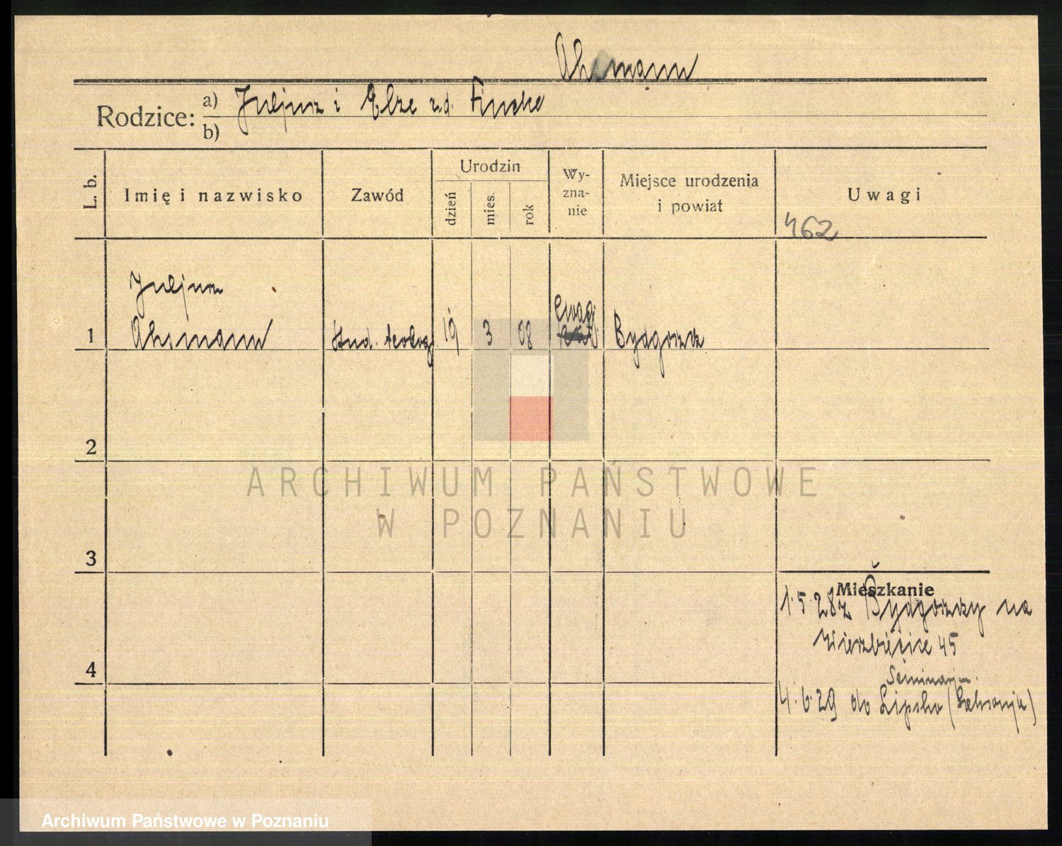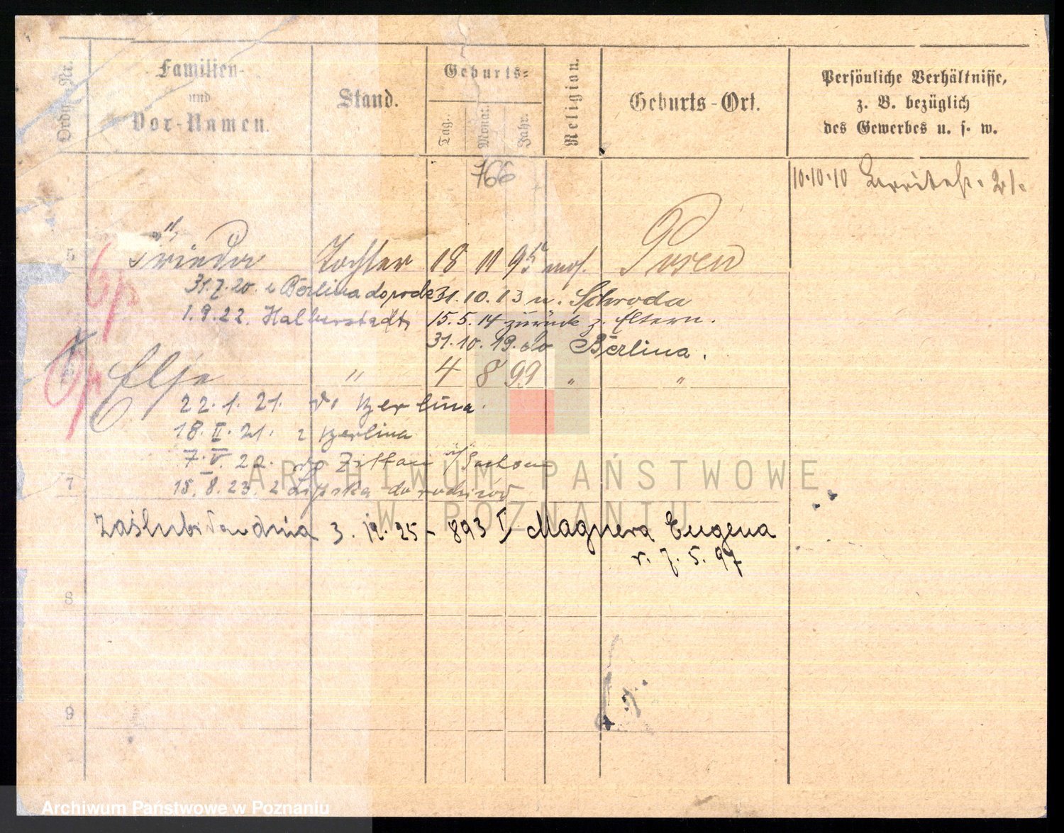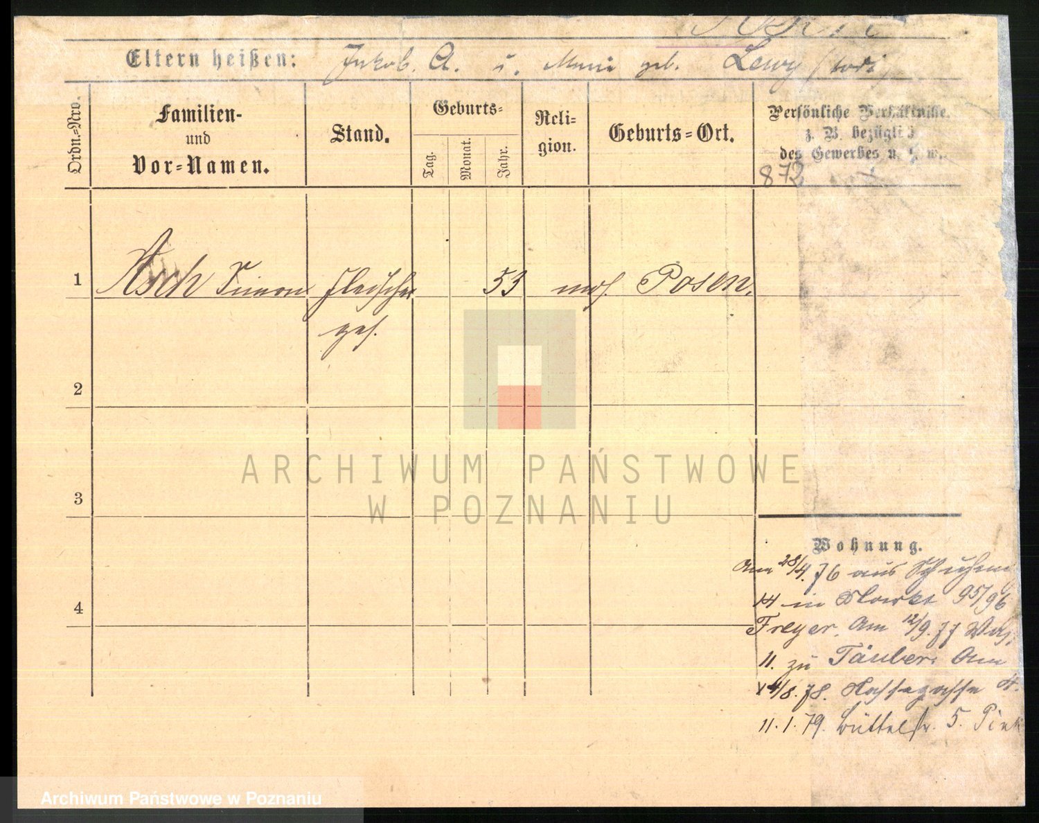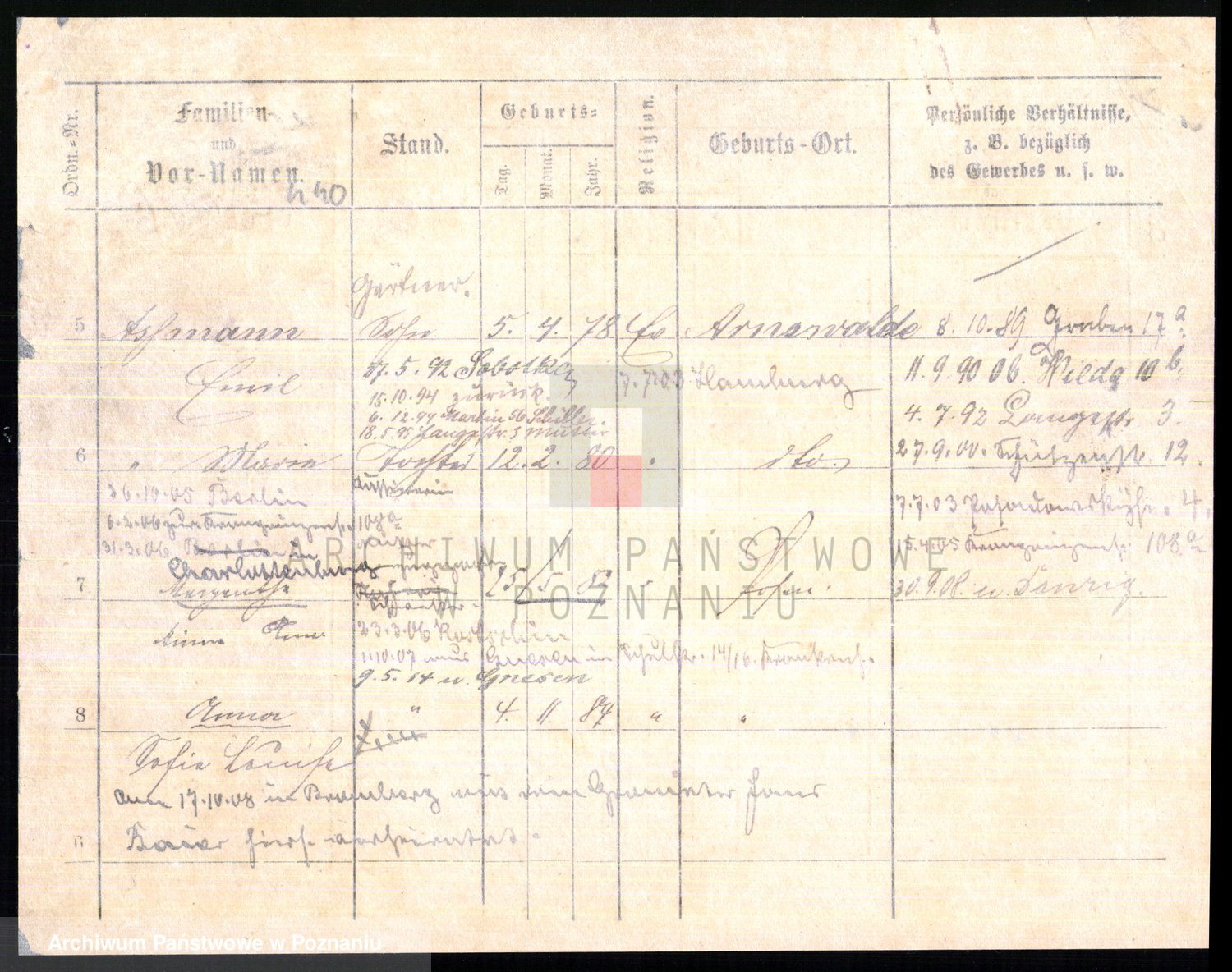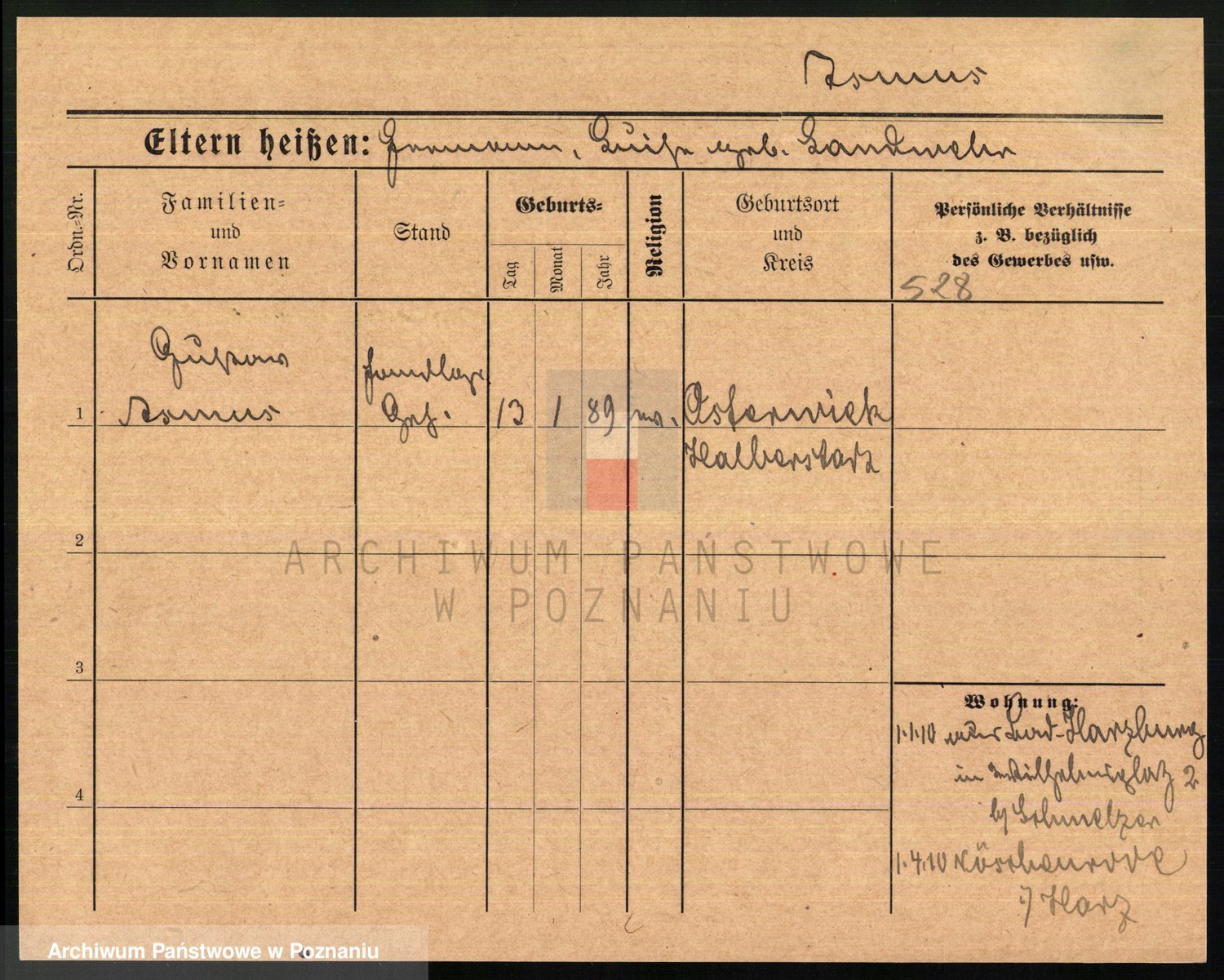 Podgląd karty osobowej dostępny jest po kliknięciu na nazwisko lub ikonkę karty. Można dokonywać powiększenia (ikony na górze) lub przechodzić między kolejnymi skanami (strzałki po bokach).