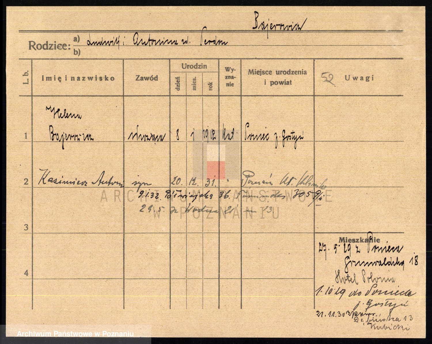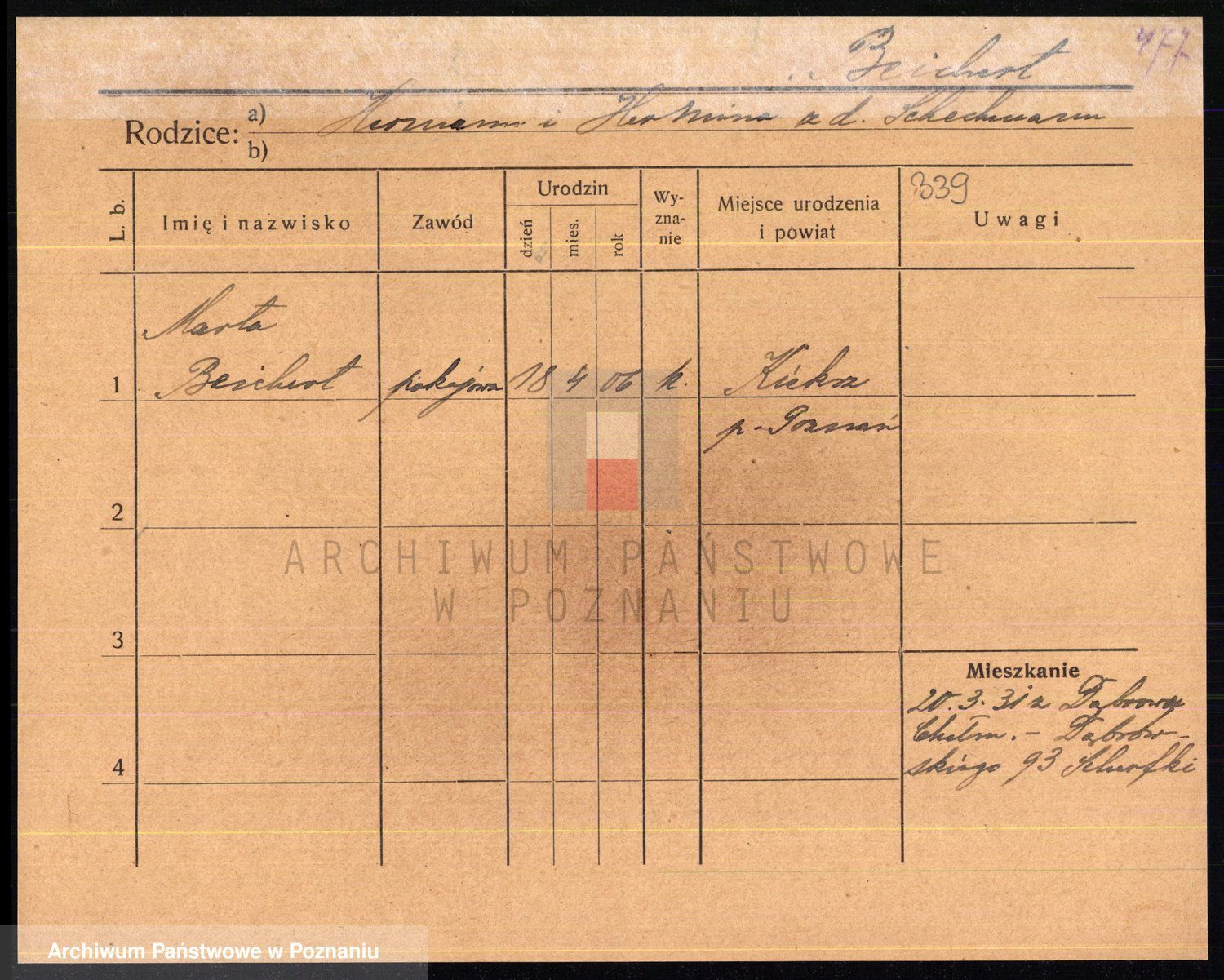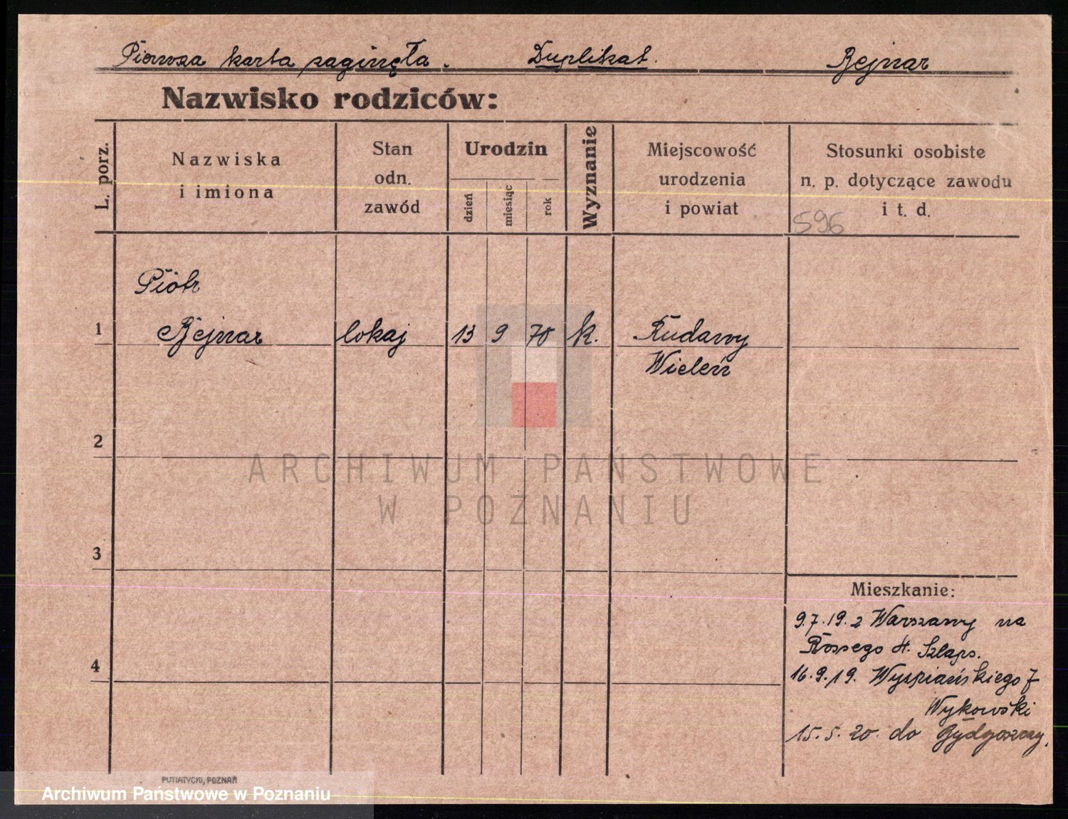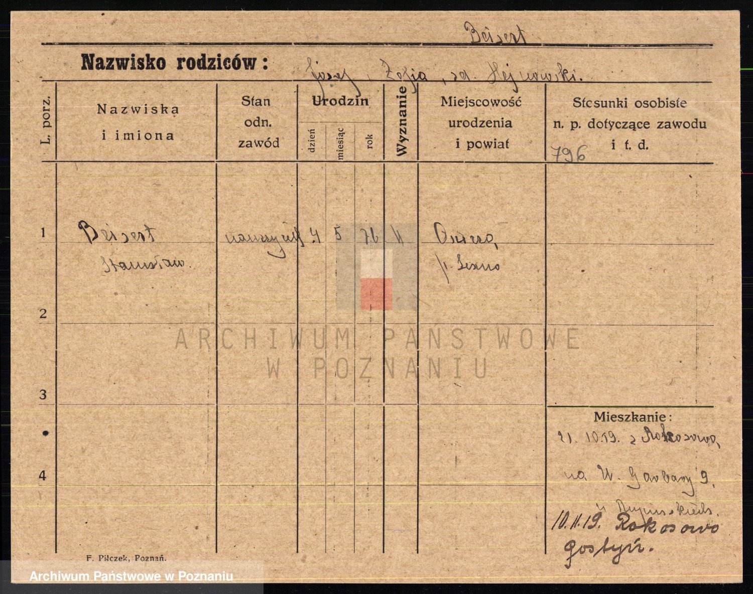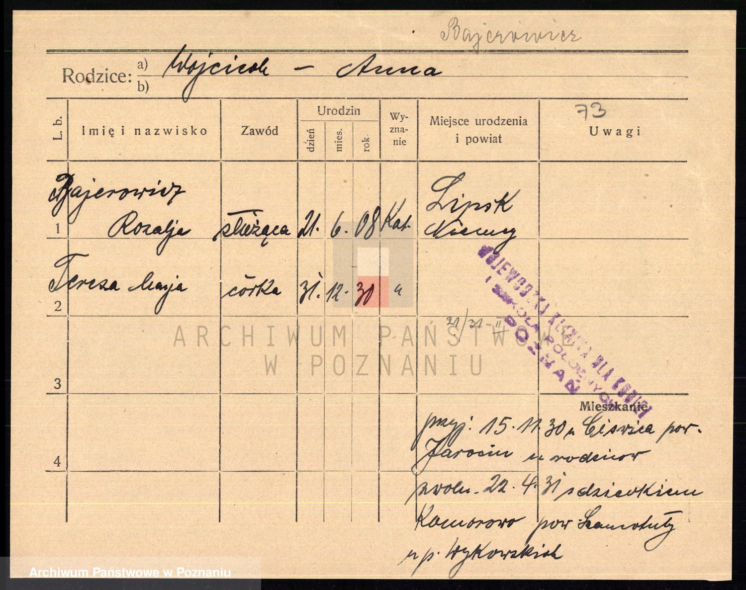 Podgląd karty osobowej dostępny jest po kliknięciu na nazwisko lub ikonkę karty. Można dokonywać powiększenia (ikony na górze) lub przechodzić między kolejnymi skanami (strzałki po bokach).