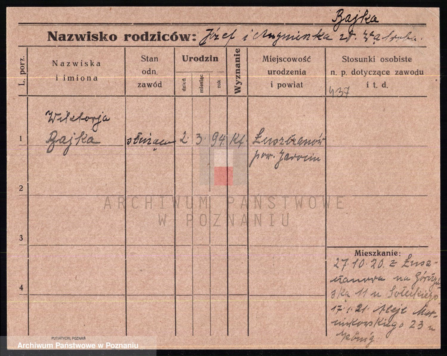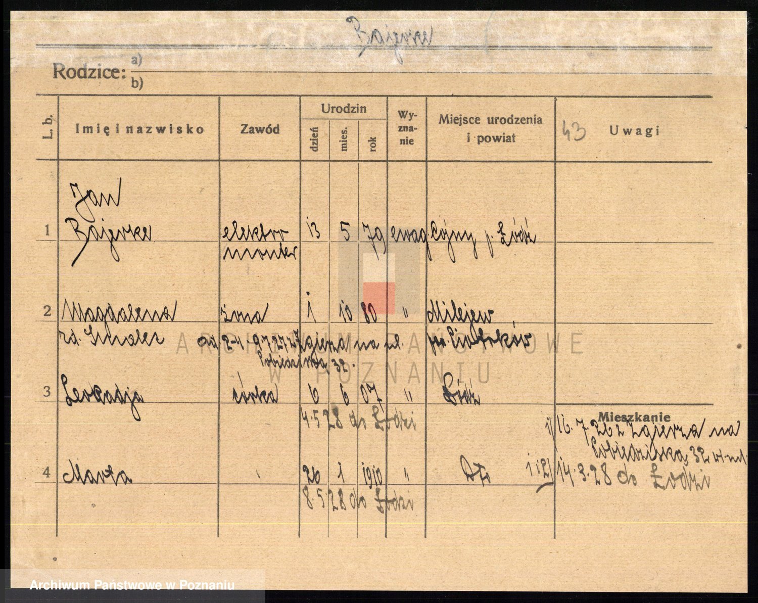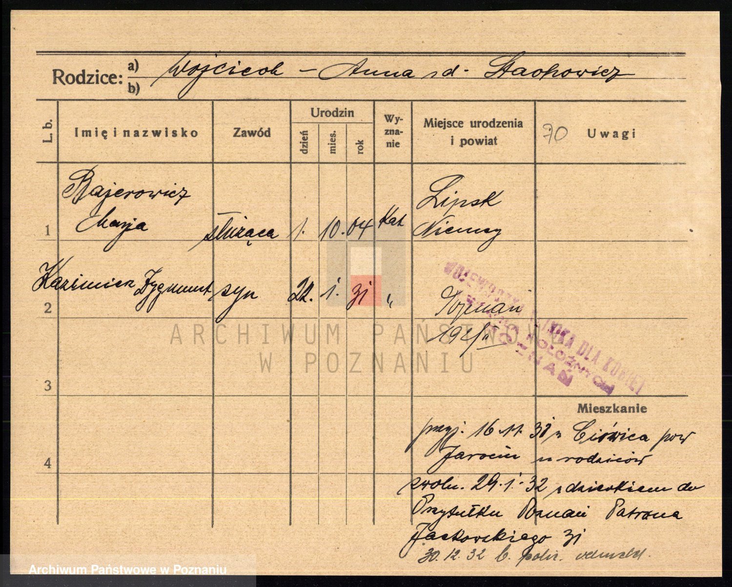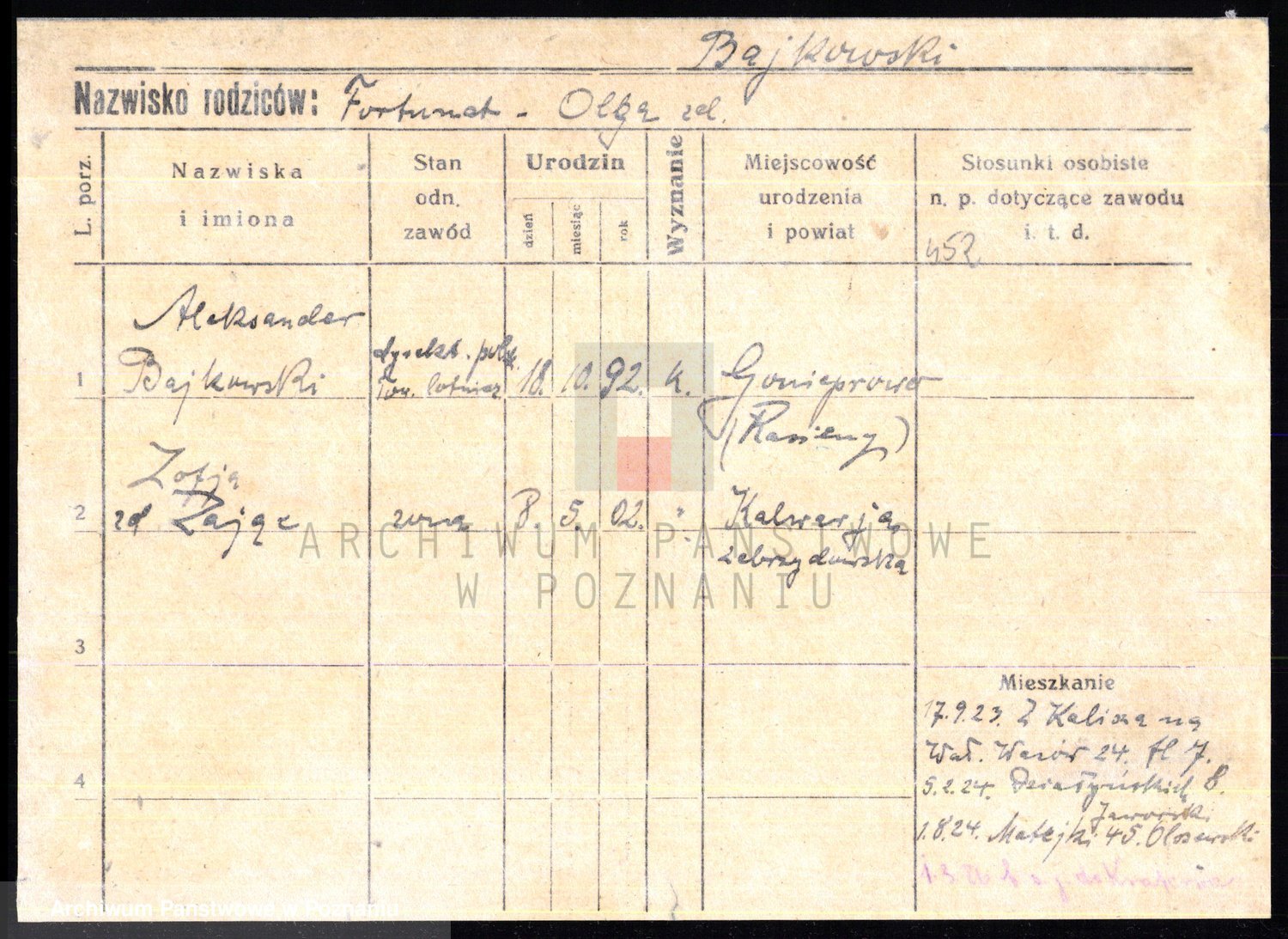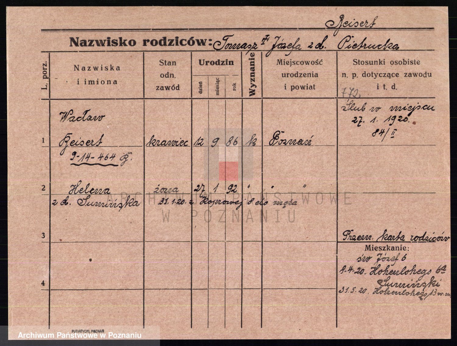 Podgląd karty osobowej dostępny jest po kliknięciu na nazwisko lub ikonkę karty. Można dokonywać powiększenia (ikony na górze) lub przechodzić między kolejnymi skanami (strzałki po bokach).