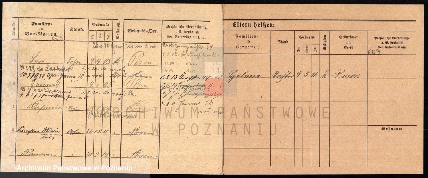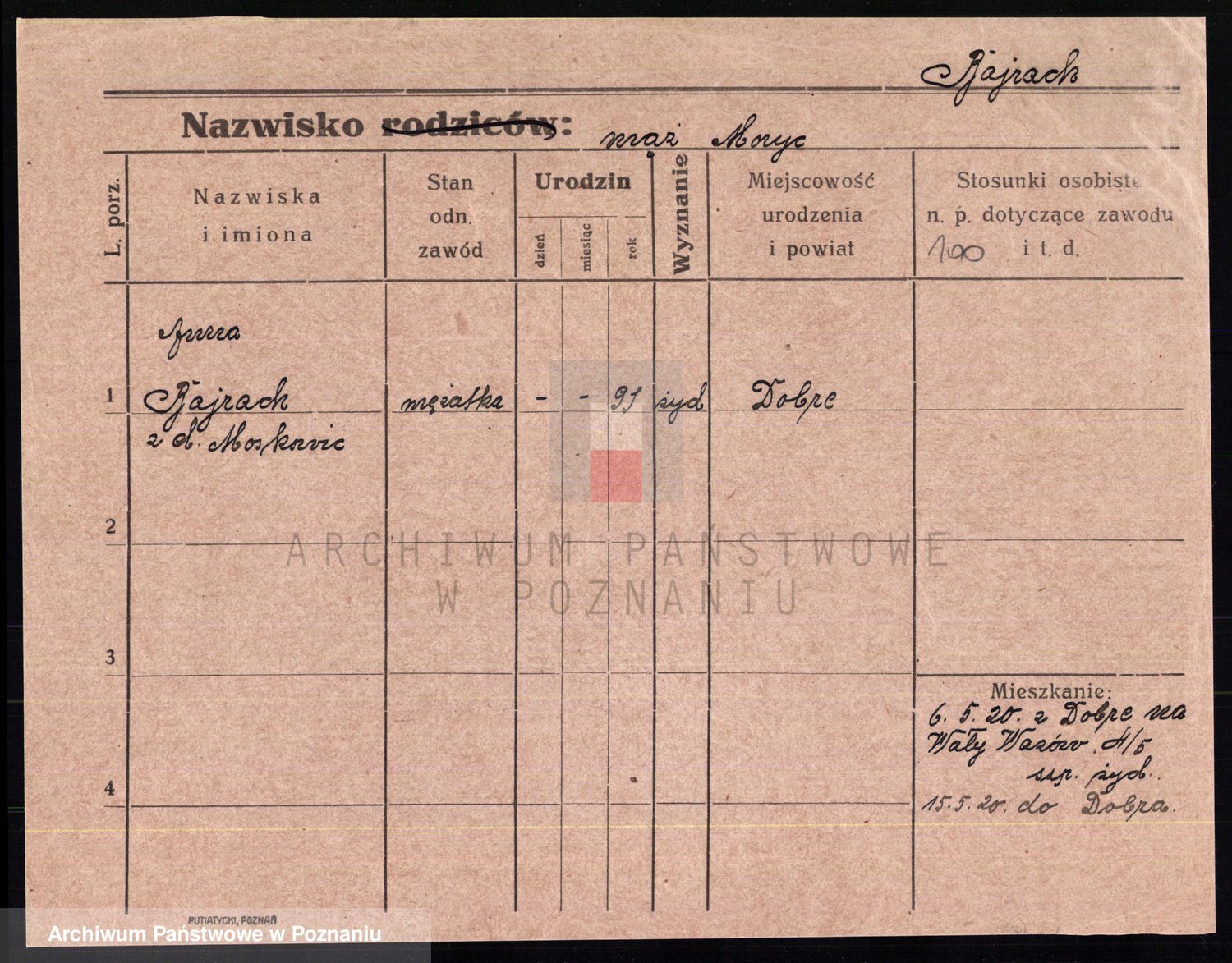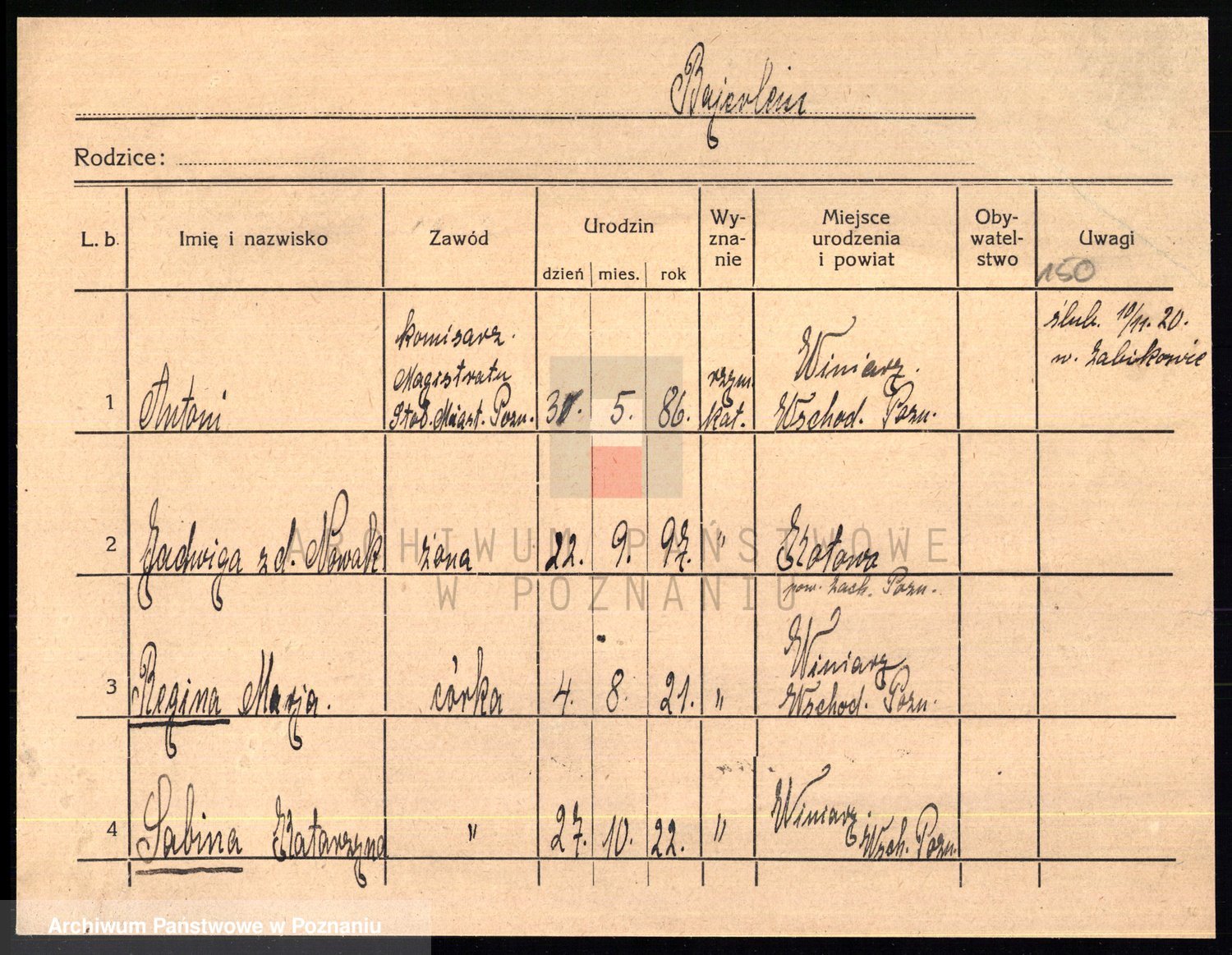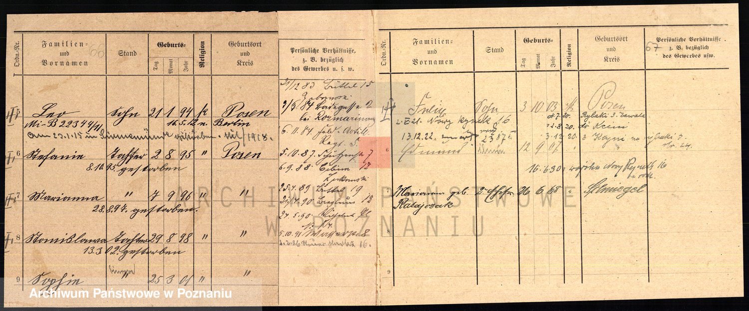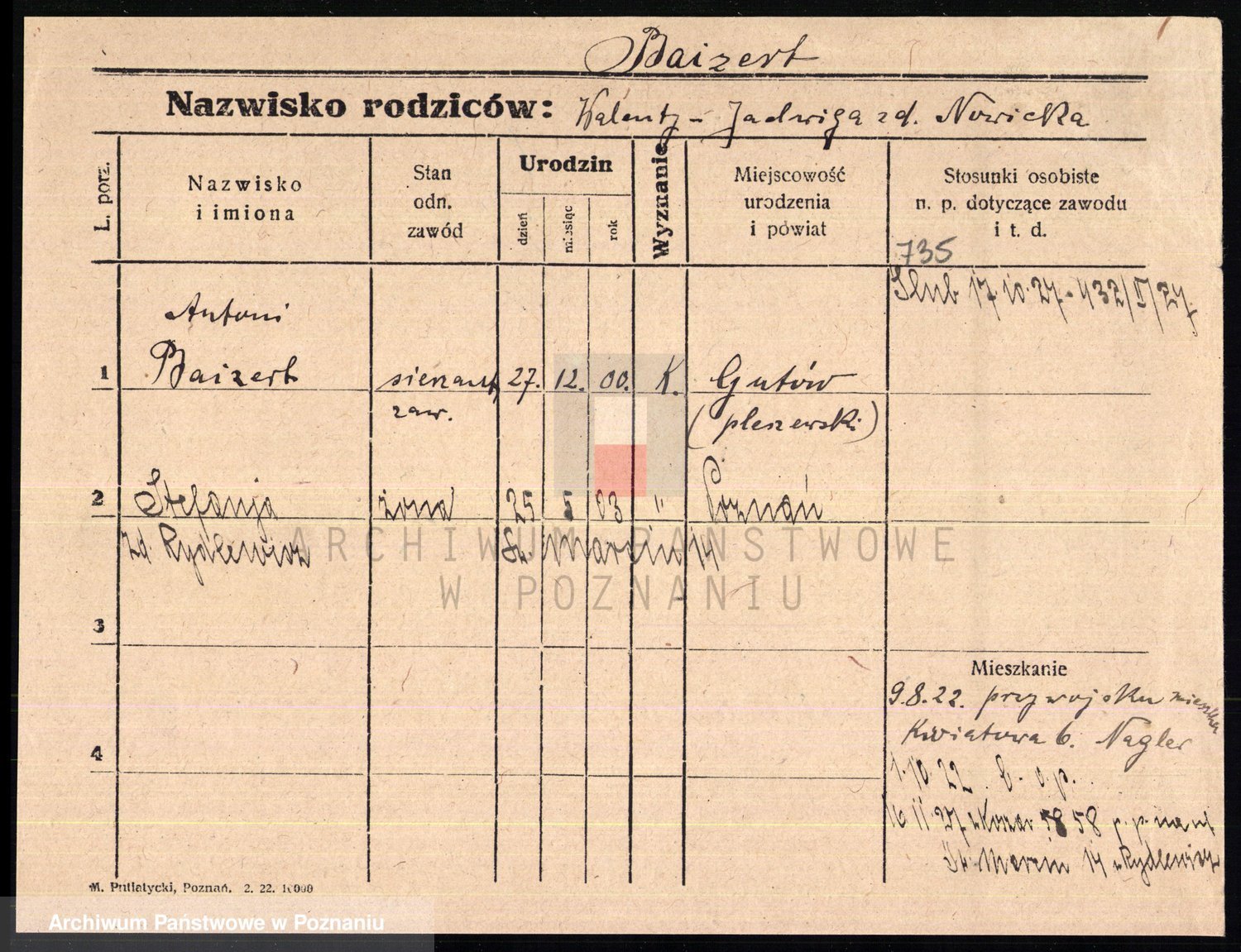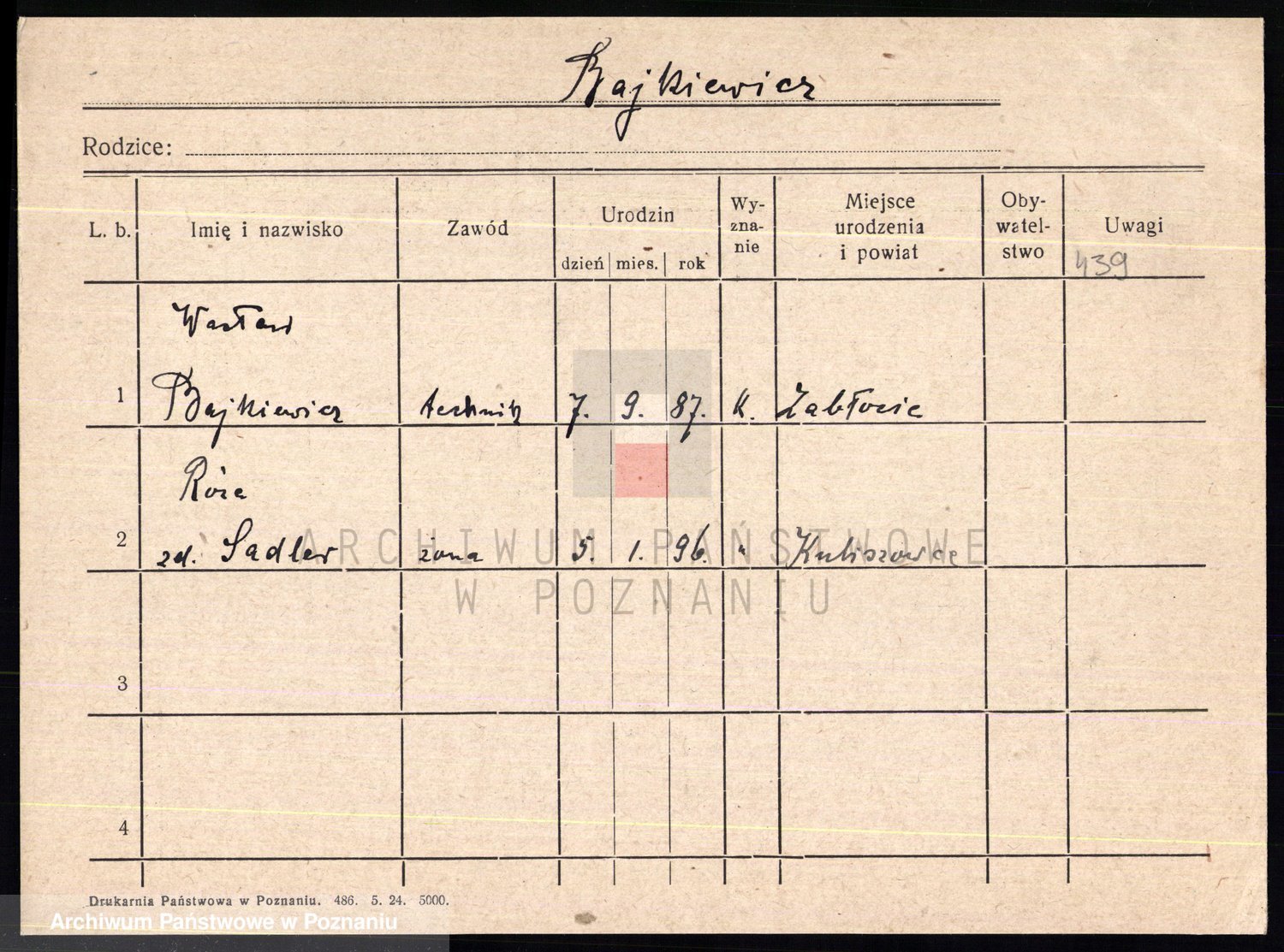 Podgląd karty osobowej dostępny jest po kliknięciu na nazwisko lub ikonkę karty. Można dokonywać powiększenia (ikony na górze) lub przechodzić między kolejnymi skanami (strzałki po bokach).