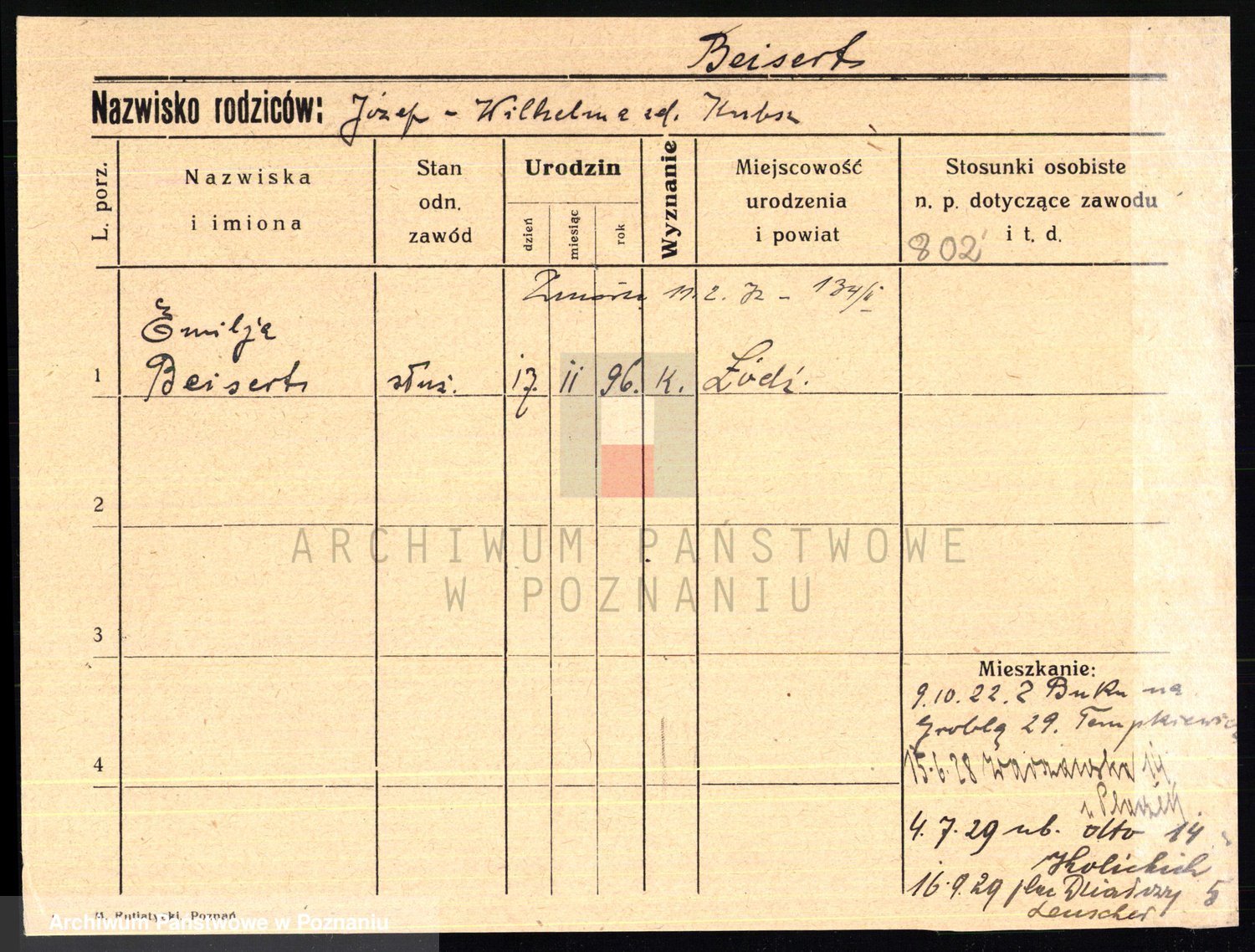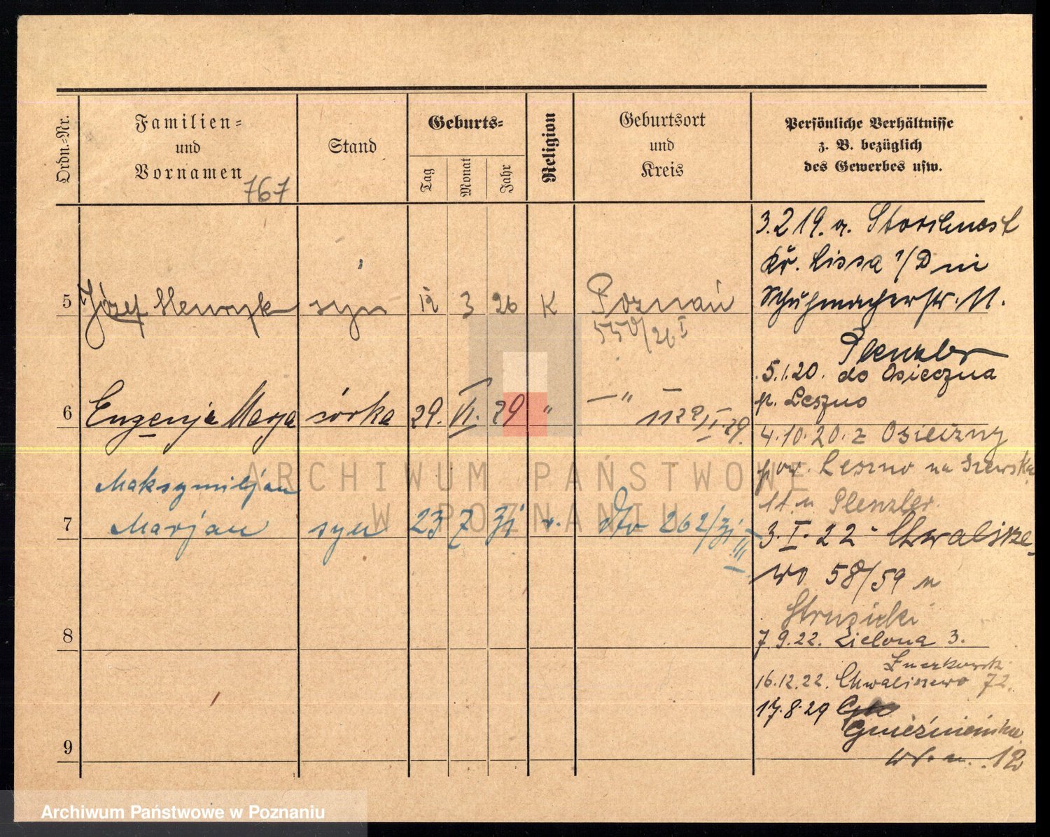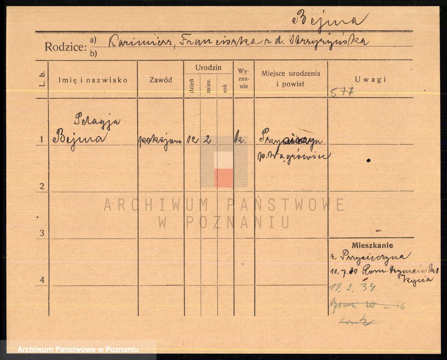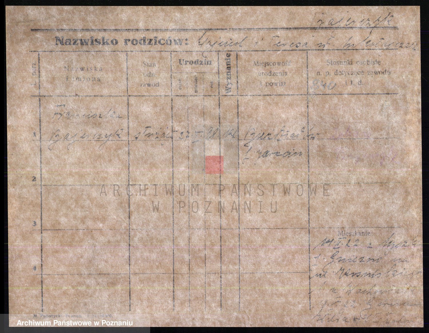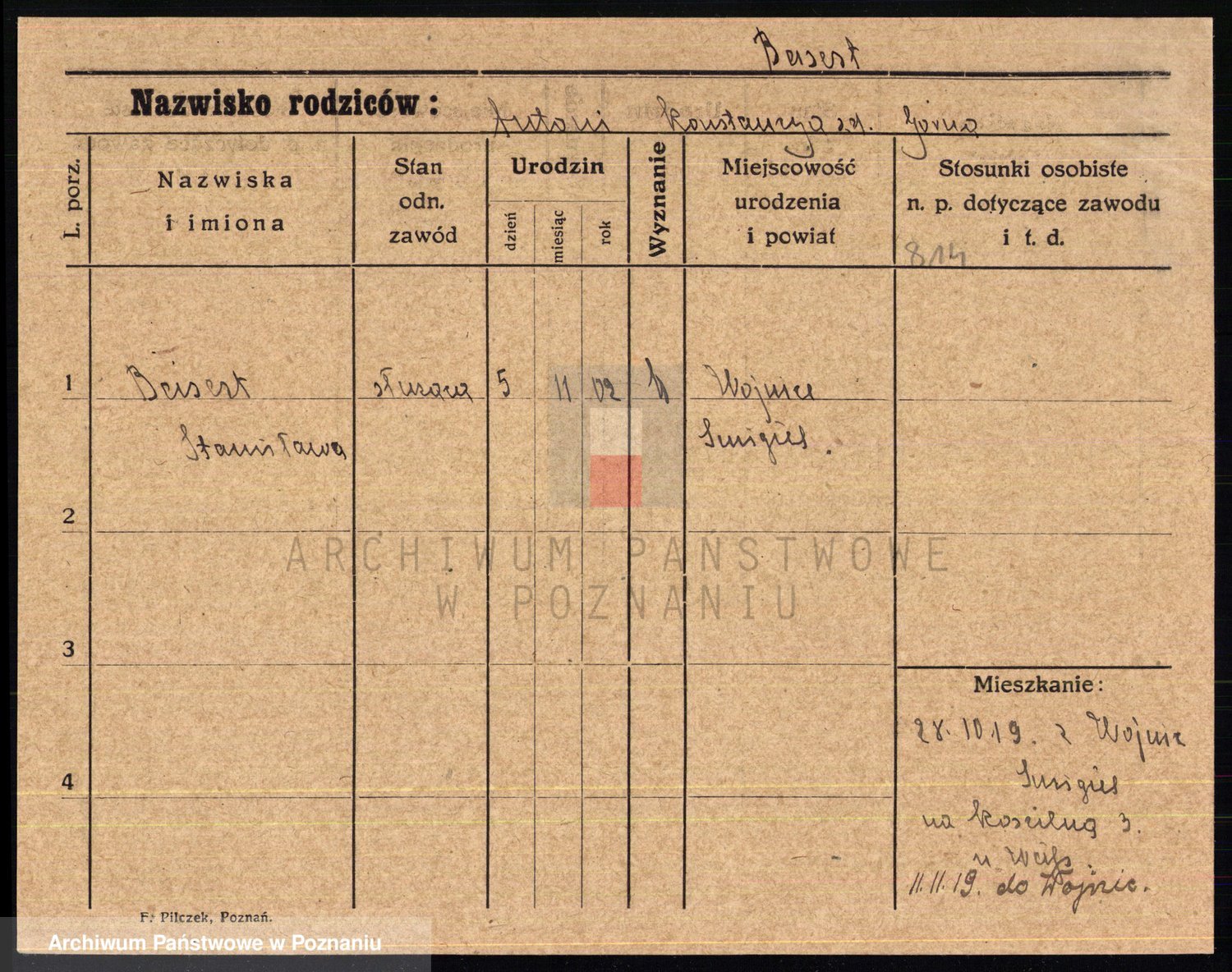 Podgląd karty osobowej dostępny jest po kliknięciu na nazwisko lub ikonkę karty. Można dokonywać powiększenia (ikony na górze) lub przechodzić między kolejnymi skanami (strzałki po bokach).