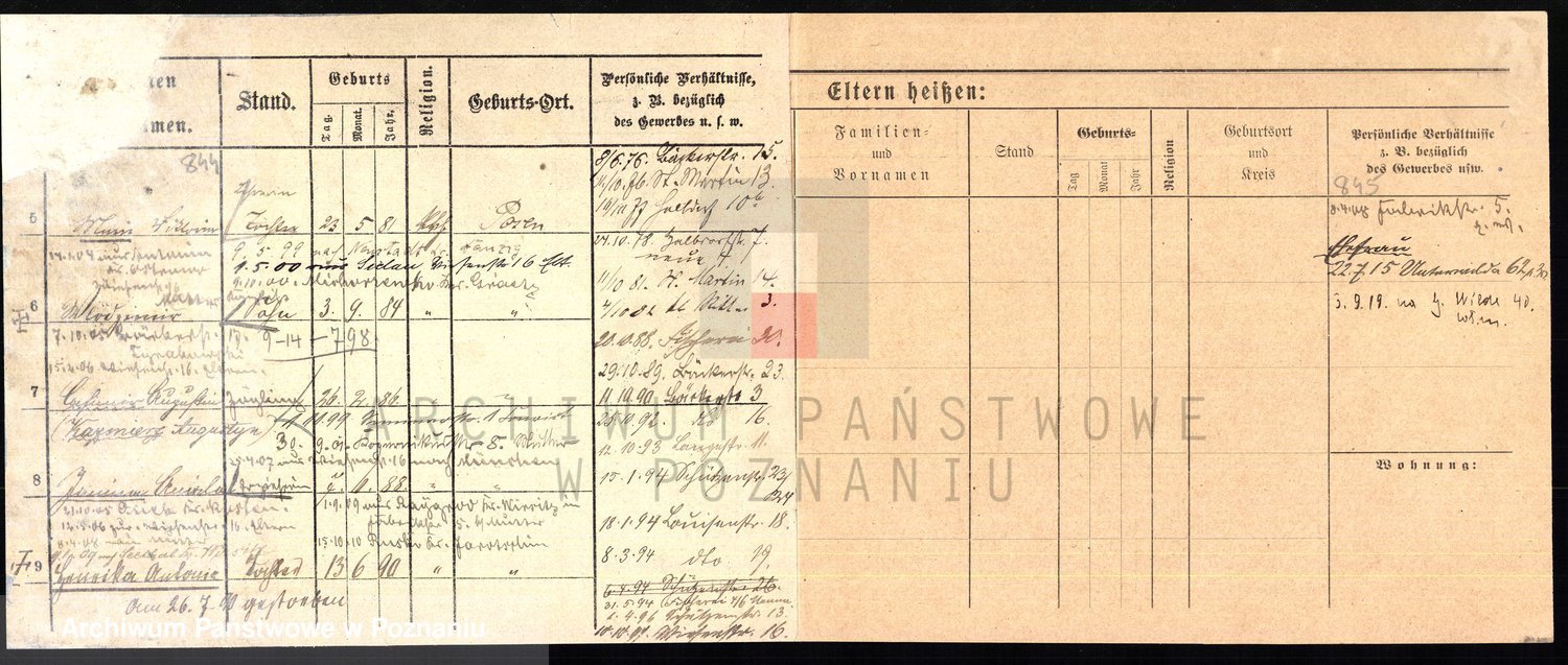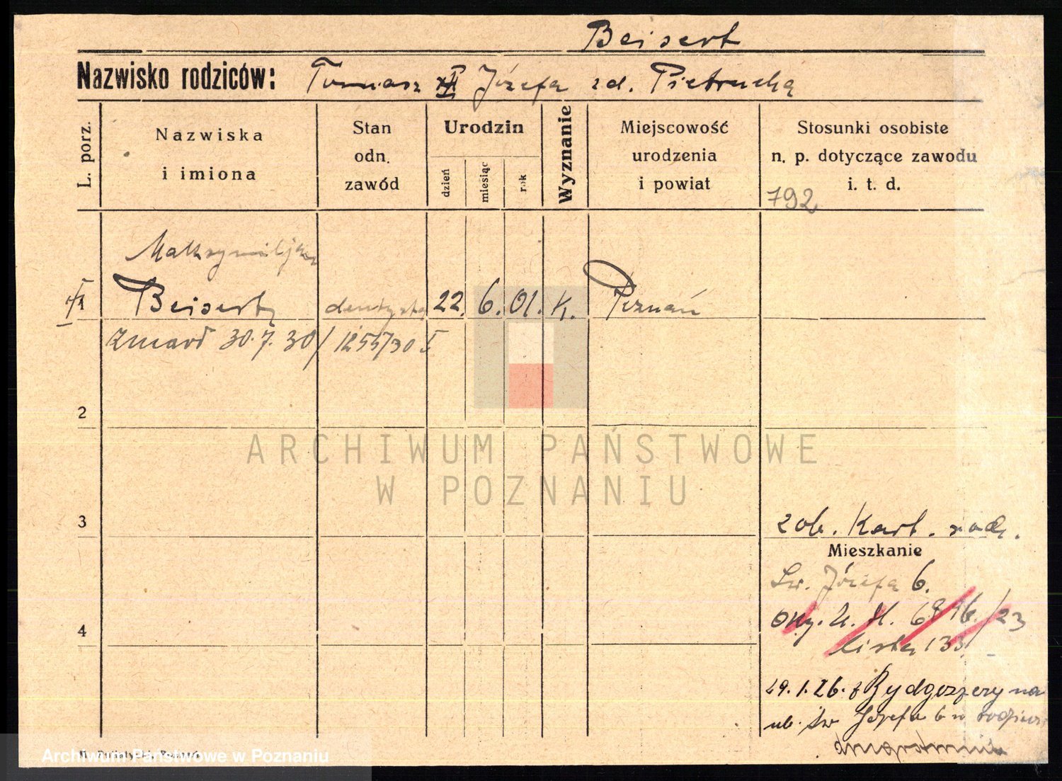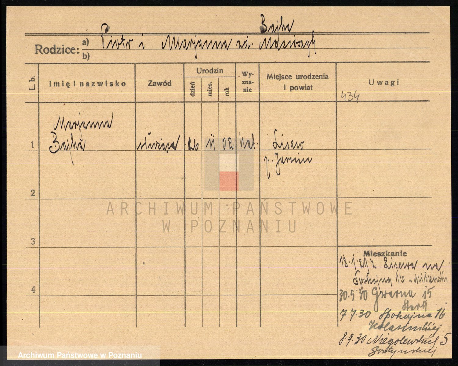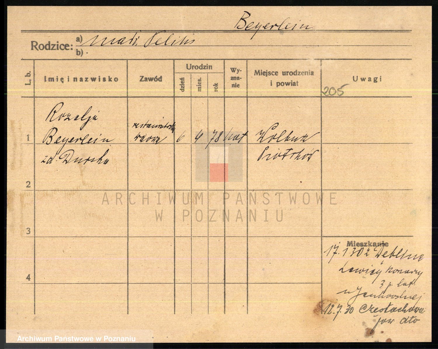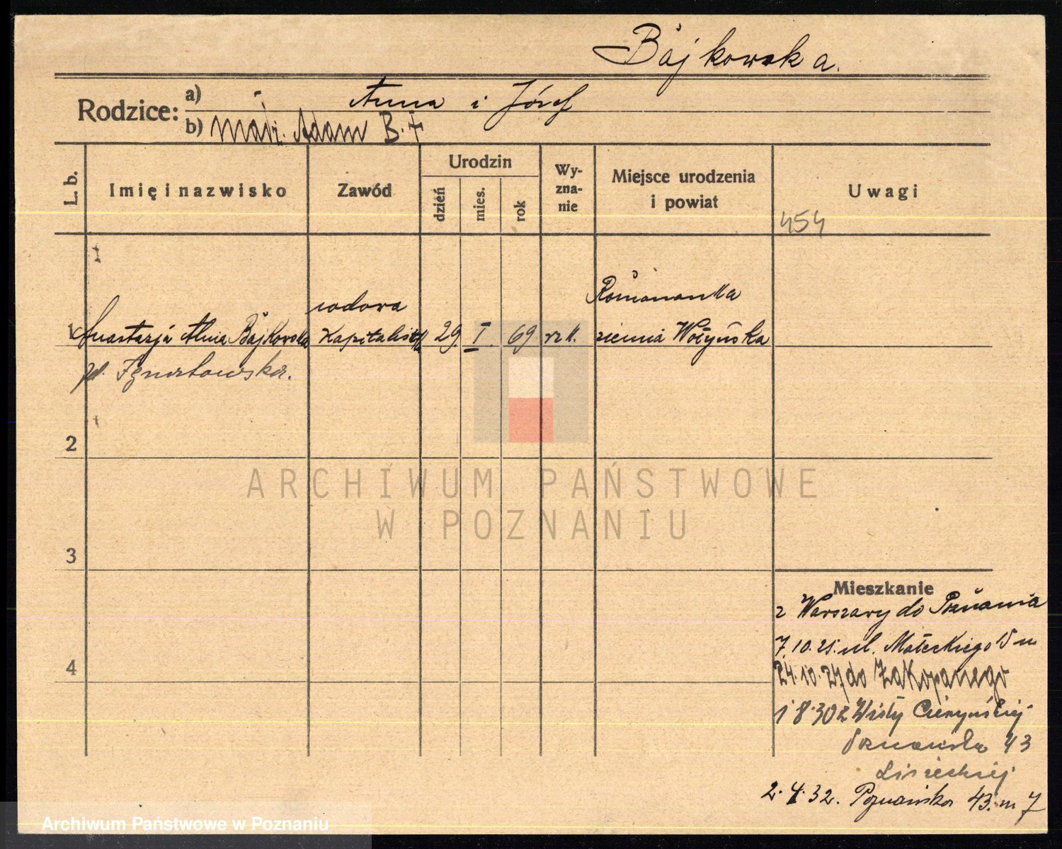 Podgląd karty osobowej dostępny jest po kliknięciu na nazwisko lub ikonkę karty. Można dokonywać powiększenia (ikony na górze) lub przechodzić między kolejnymi skanami (strzałki po bokach).